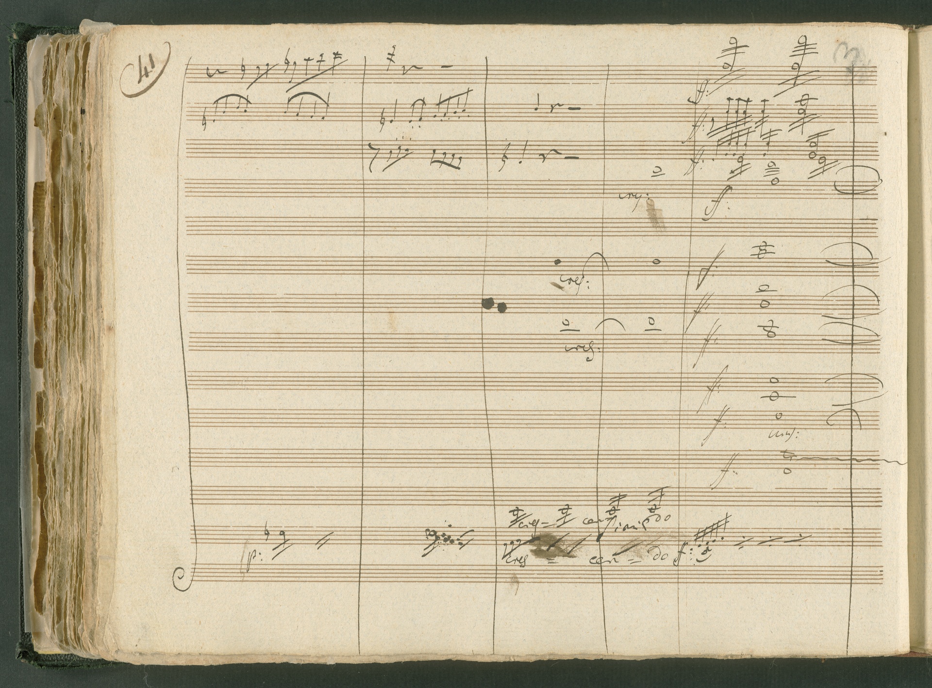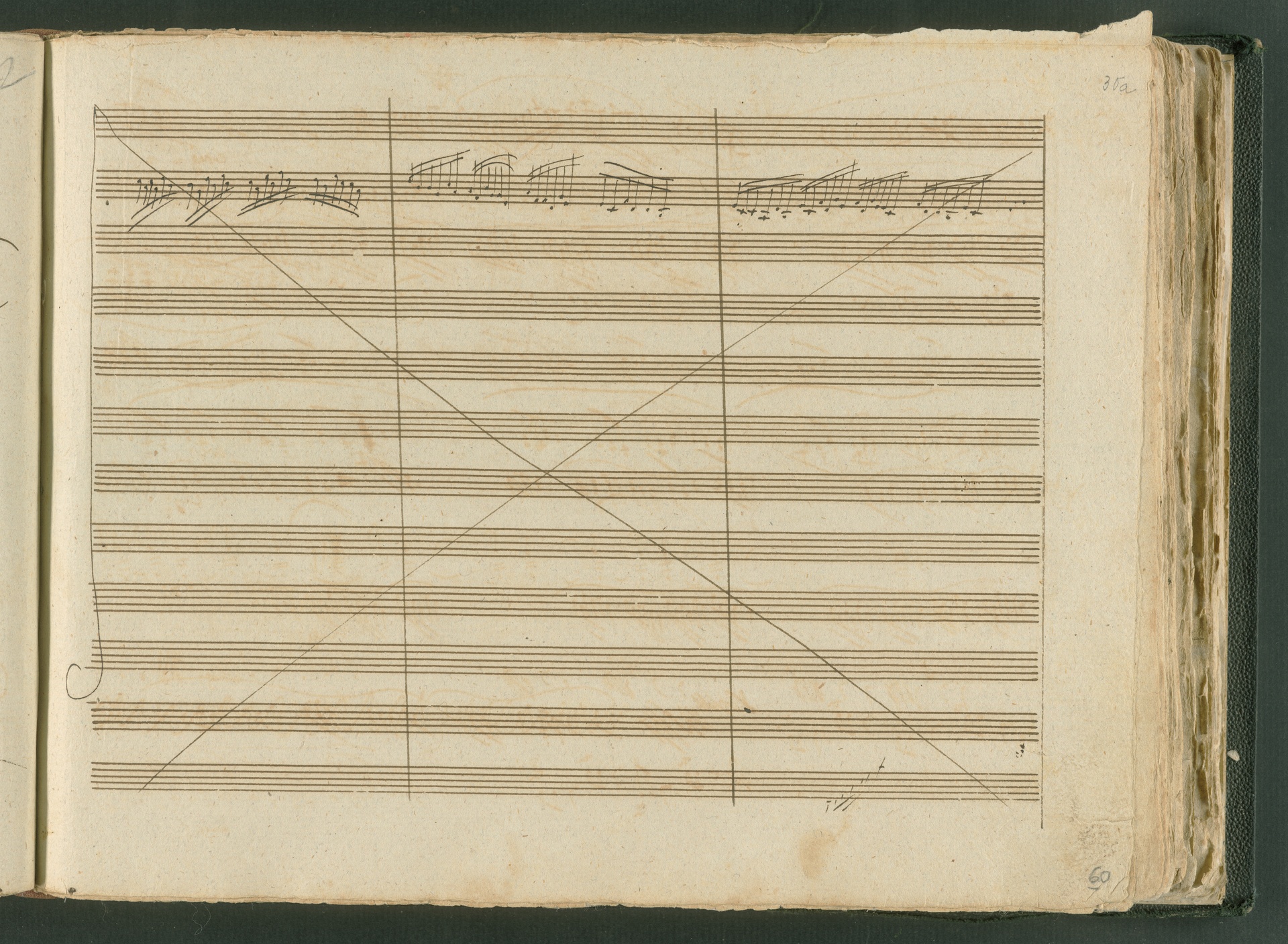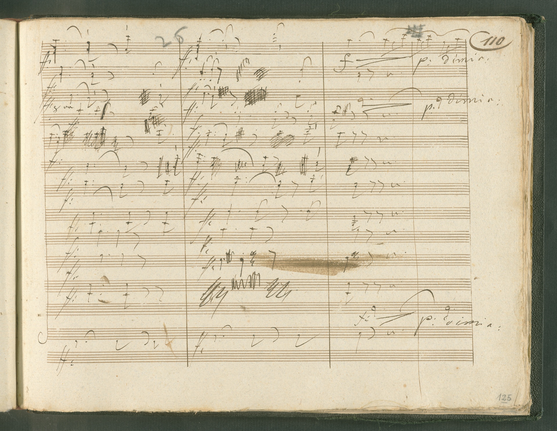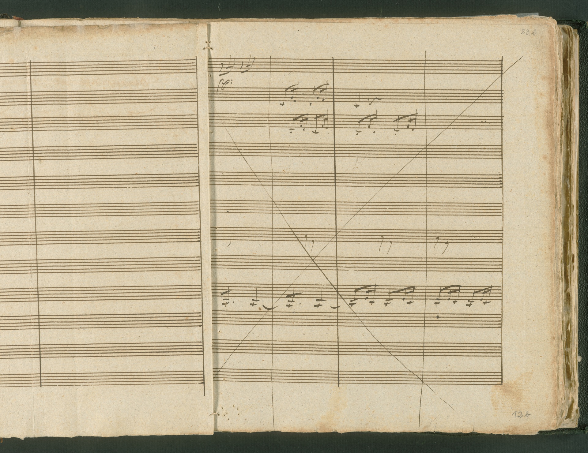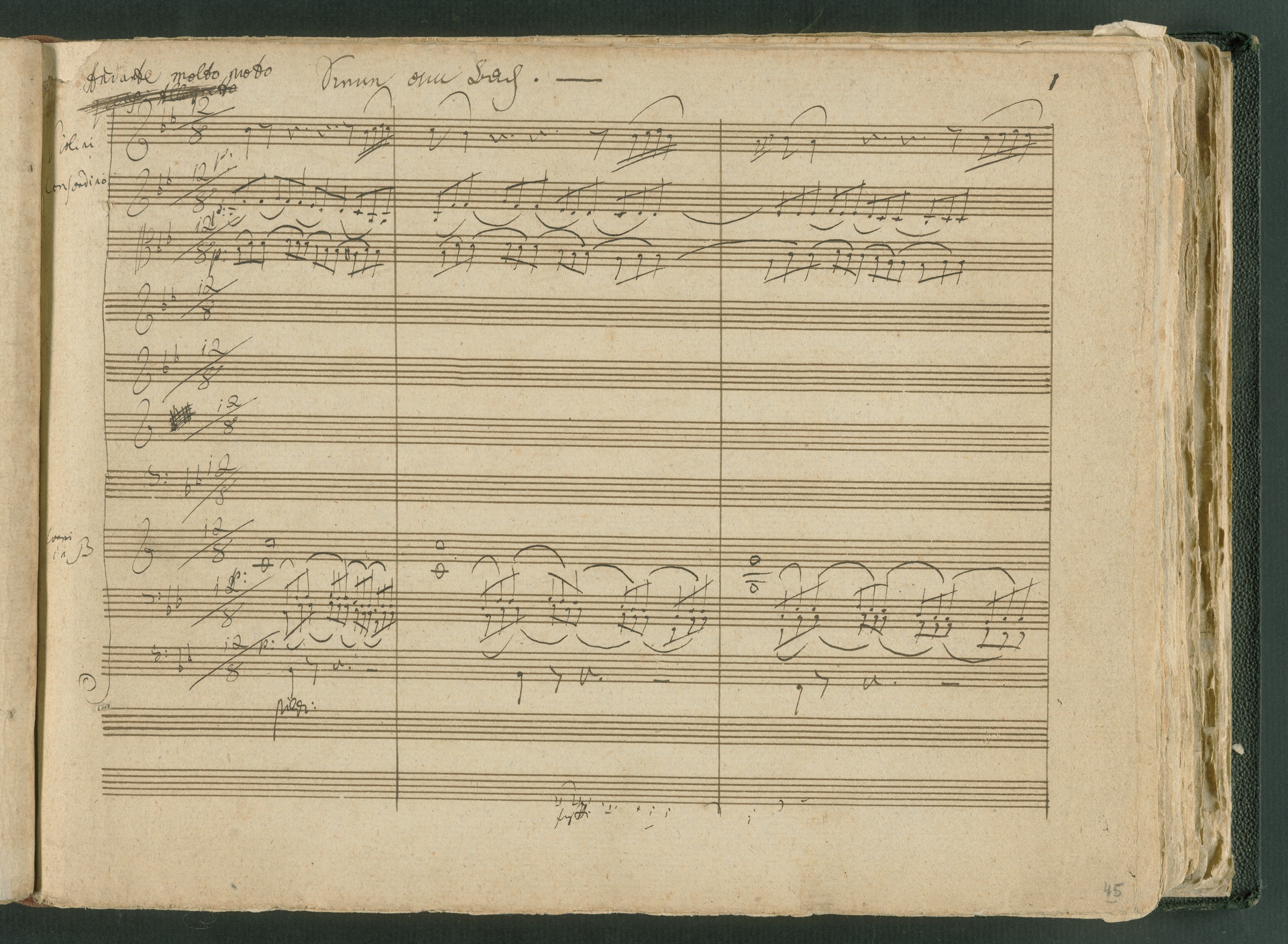 Wir sehen hier den unbestreitbar größten Schatz des Beethoven-Archivs: das vollständige Autograph der 6. Sinfonie op. 68, der "Pastorale". Es ist jedoch ein Irrtum zu glauben, dieses Autograph wäre der saubere Abschluß einer Entwicklung, an deren Ende ein fertiges, "ordentliches" Manuskript steht. Vielmehr lässt sich an diesem Autograph der Kompositionsprozeß verfolgen: unter dem abgeschlossenen Text sind mehrere Schichten sichtbar.