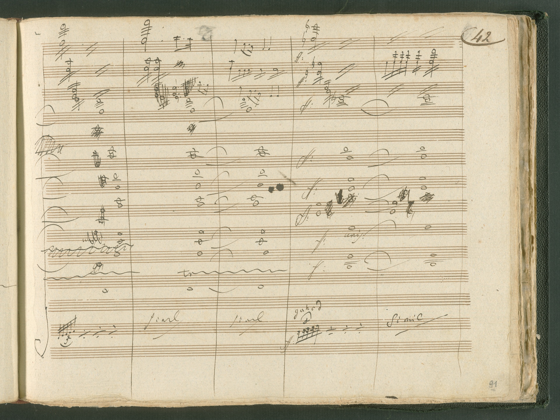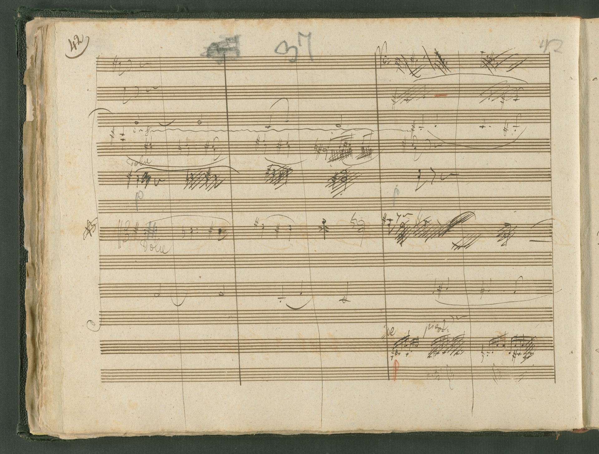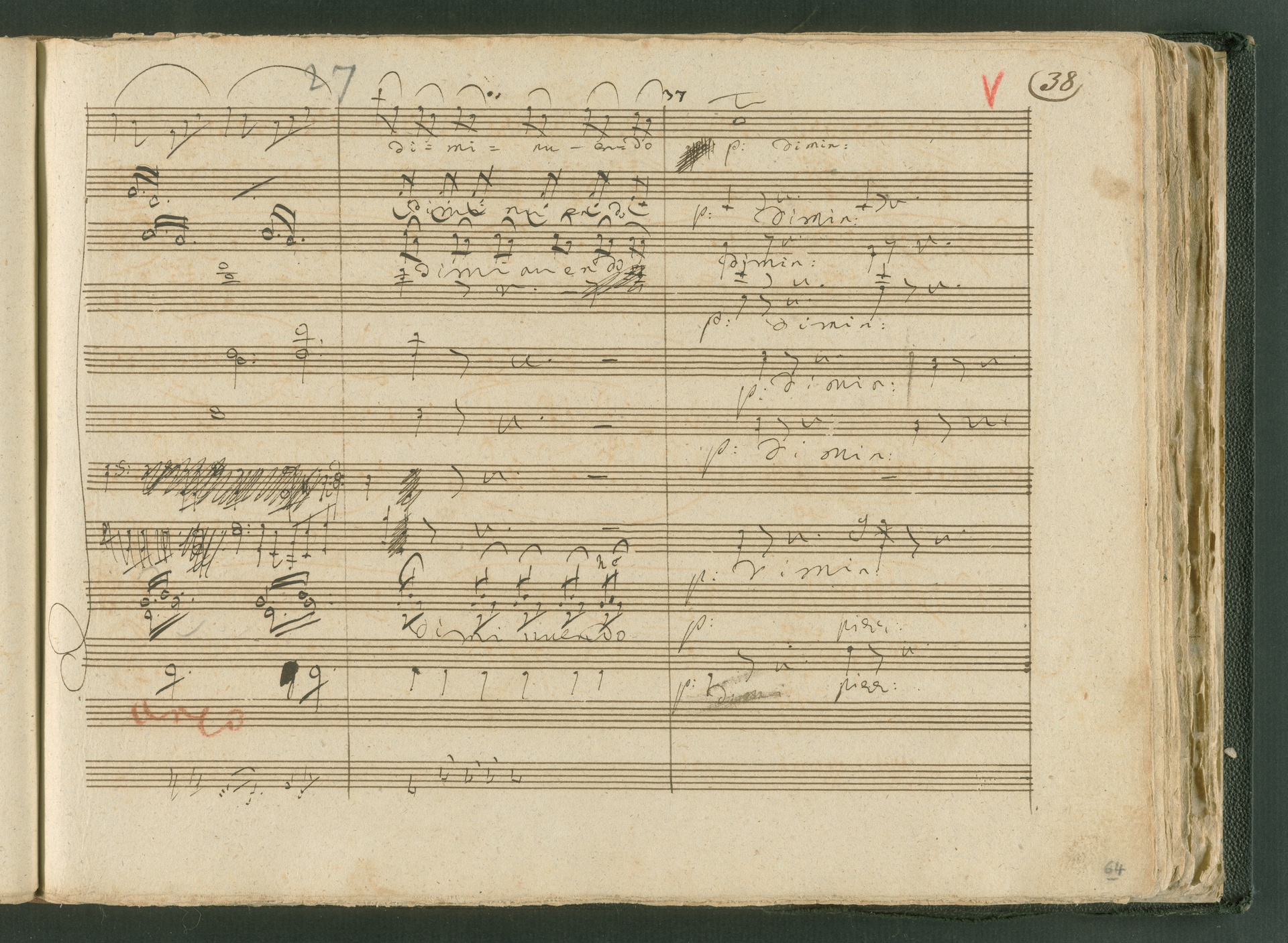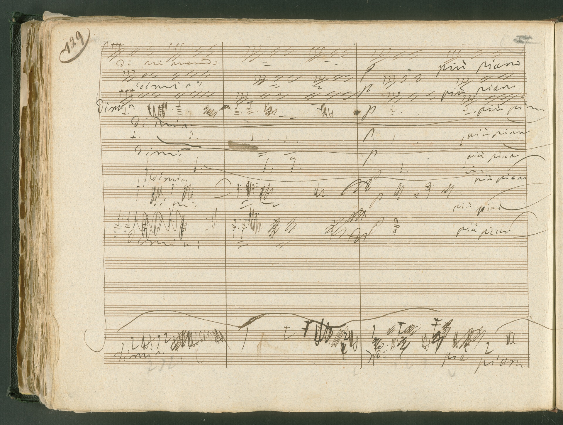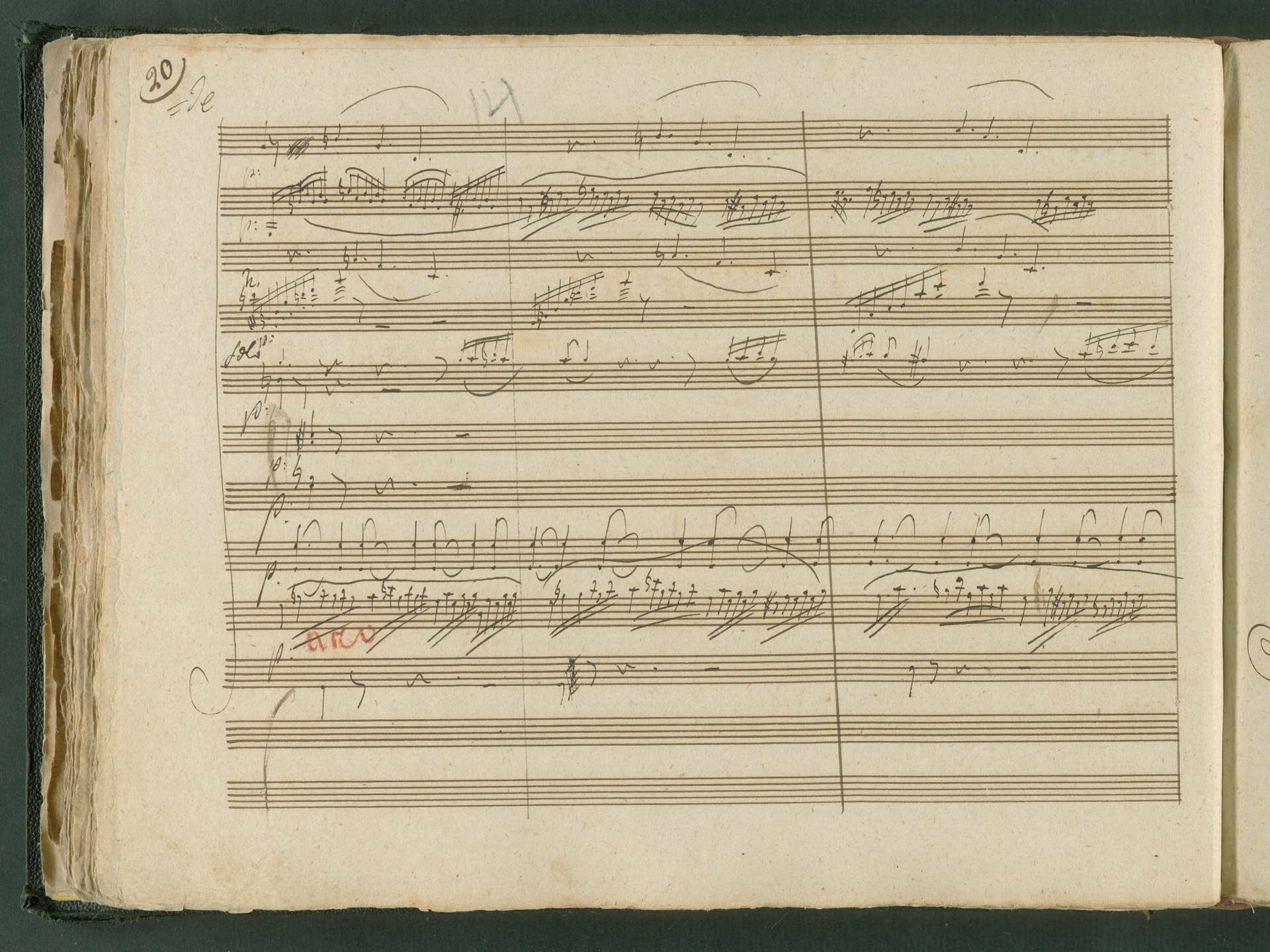 Wir sehen hier den unbestreitbar größten Schatz des Beethoven-Archivs: das vollständige Autograph der 6. Sinfonie op. 68, der "Pastorale". Es ist jedoch ein Irrtum zu glauben, dieses Autograph wäre der saubere Abschluß einer Entwicklung, an deren Ende ein fertiges, "ordentliches" Manuskript steht. Vielmehr lässt sich an diesem Autograph der Kompositionsprozeß verfolgen: unter dem abgeschlossenen Text sind mehrere Schichten sichtbar.
