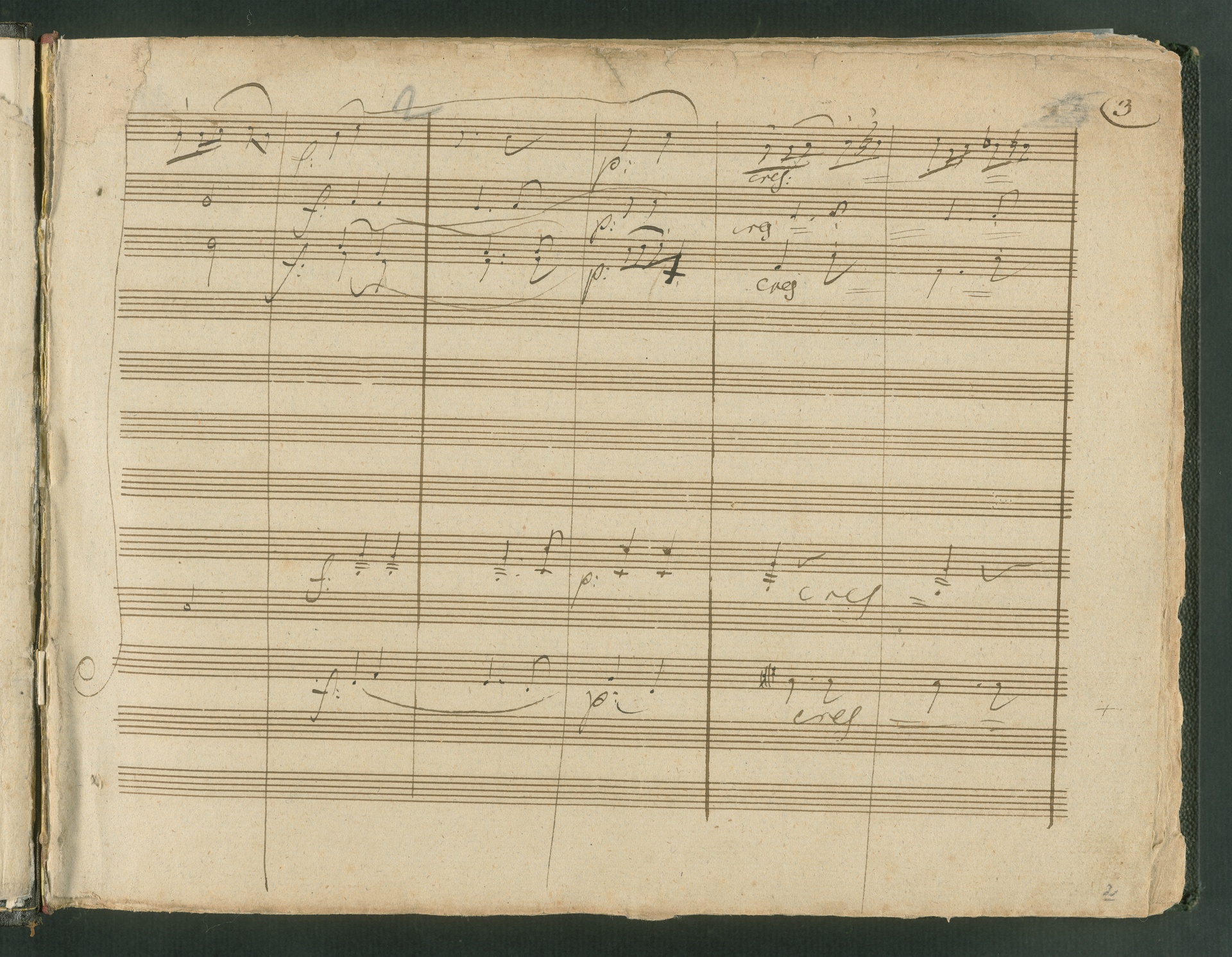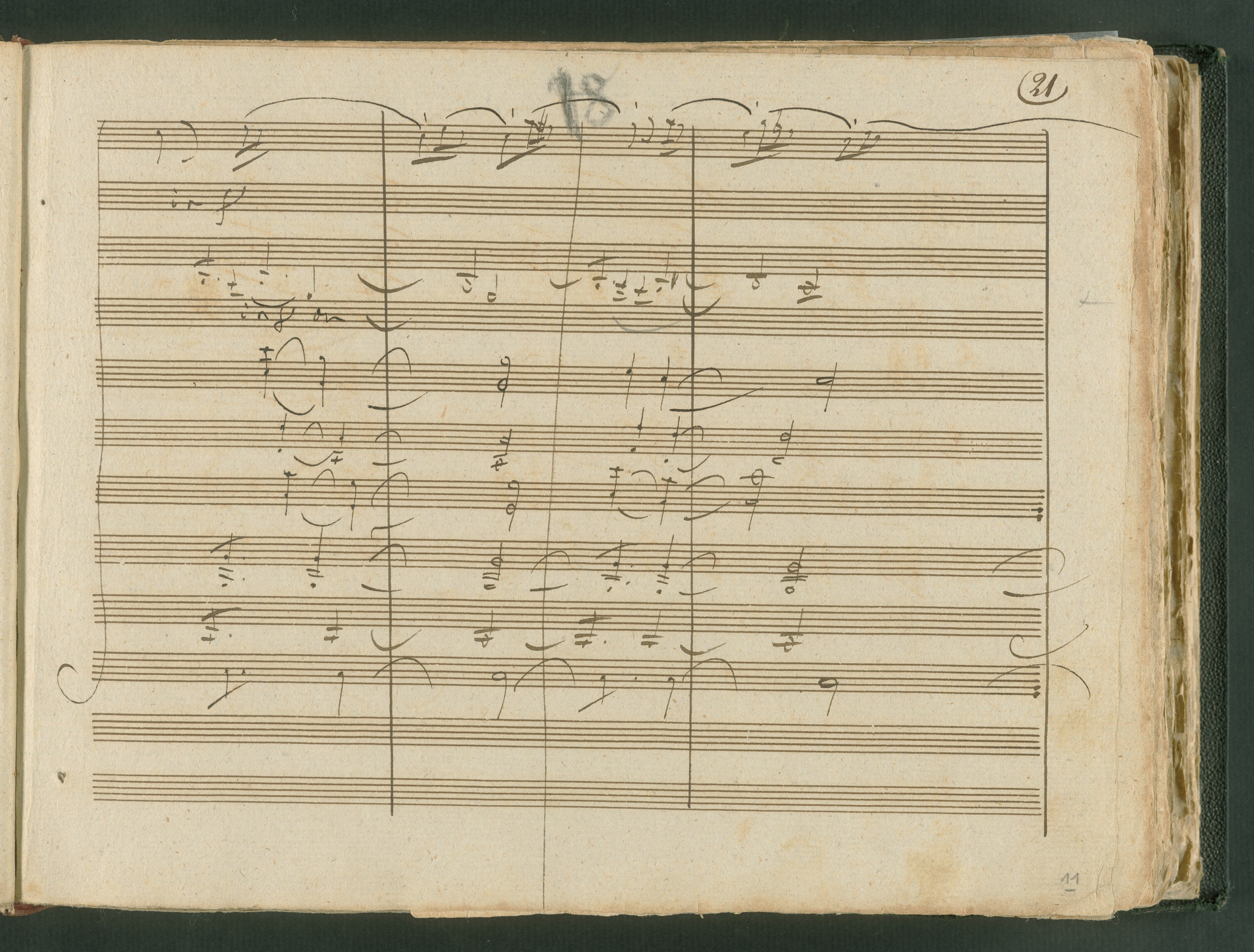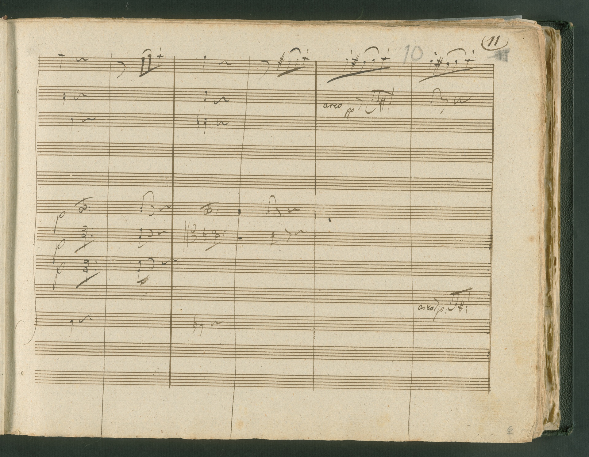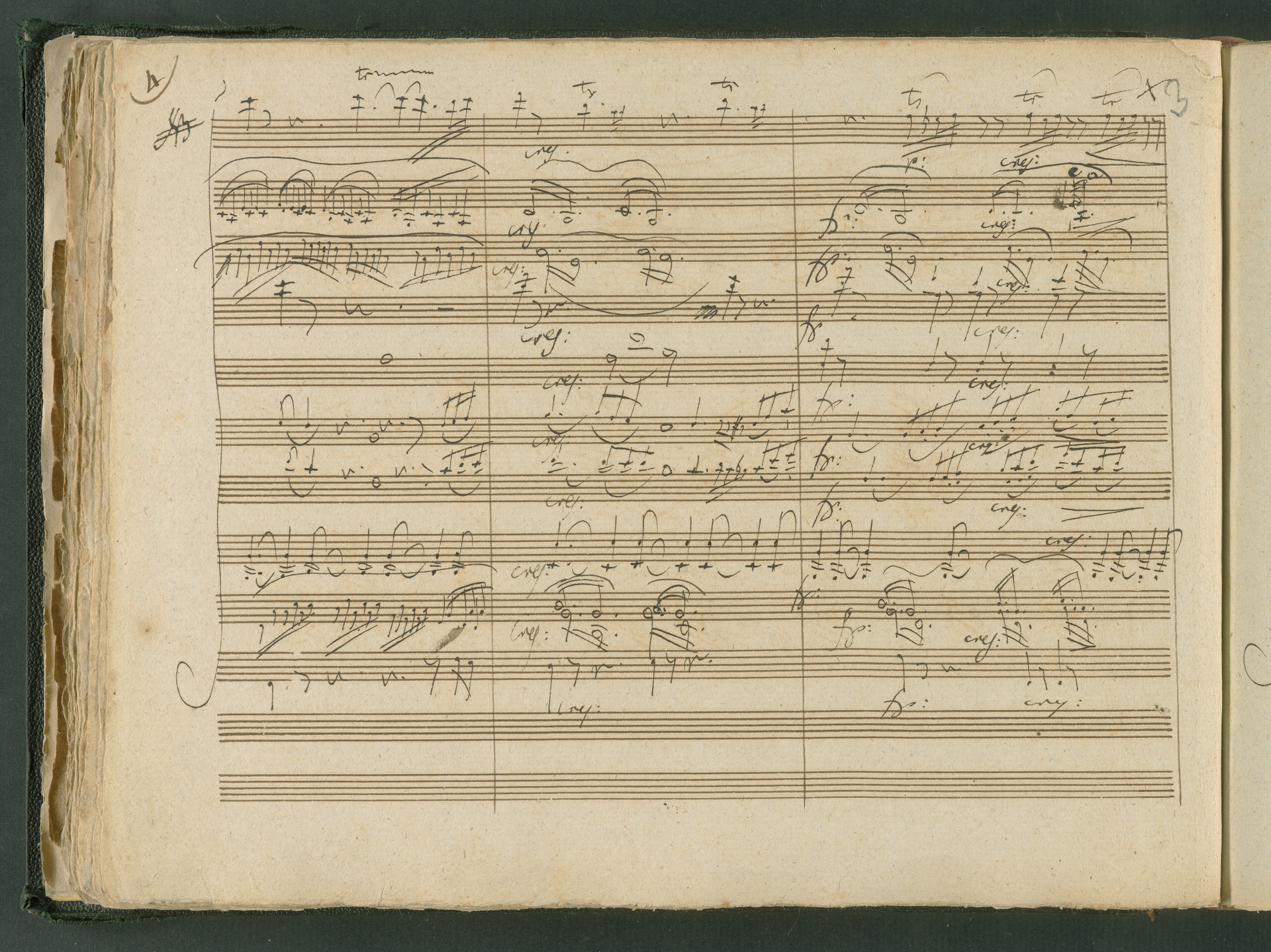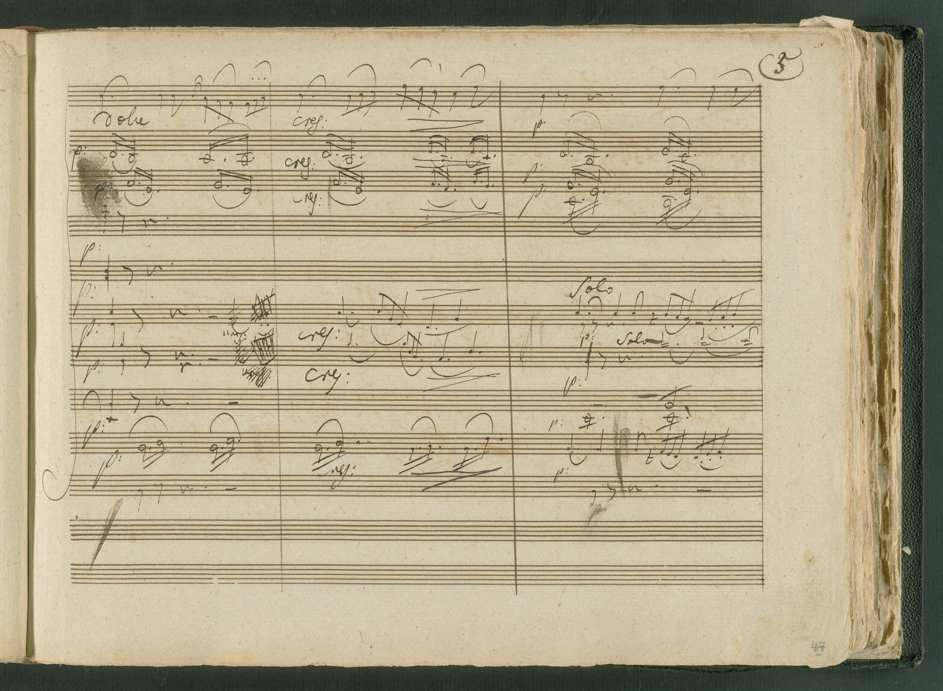 Wir sehen hier den unbestreitbar größten Schatz des Beethoven-Archivs: das vollständige Autograph der 6. Sinfonie op. 68, der "Pastorale". Es ist jedoch ein Irrtum zu glauben, dieses Autograph wäre der saubere Abschluß einer Entwicklung, an deren Ende ein fertiges, "ordentliches" Manuskript steht. Vielmehr lässt sich an diesem Autograph der Kompositionsprozeß verfolgen: unter dem abgeschlossenen Text sind mehrere Schichten sichtbar.