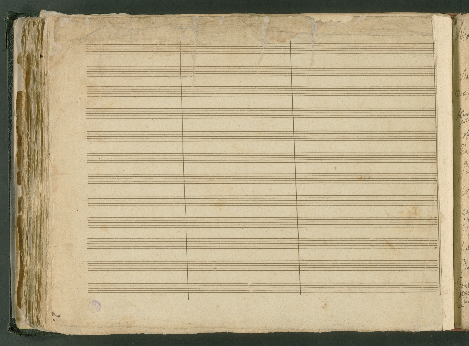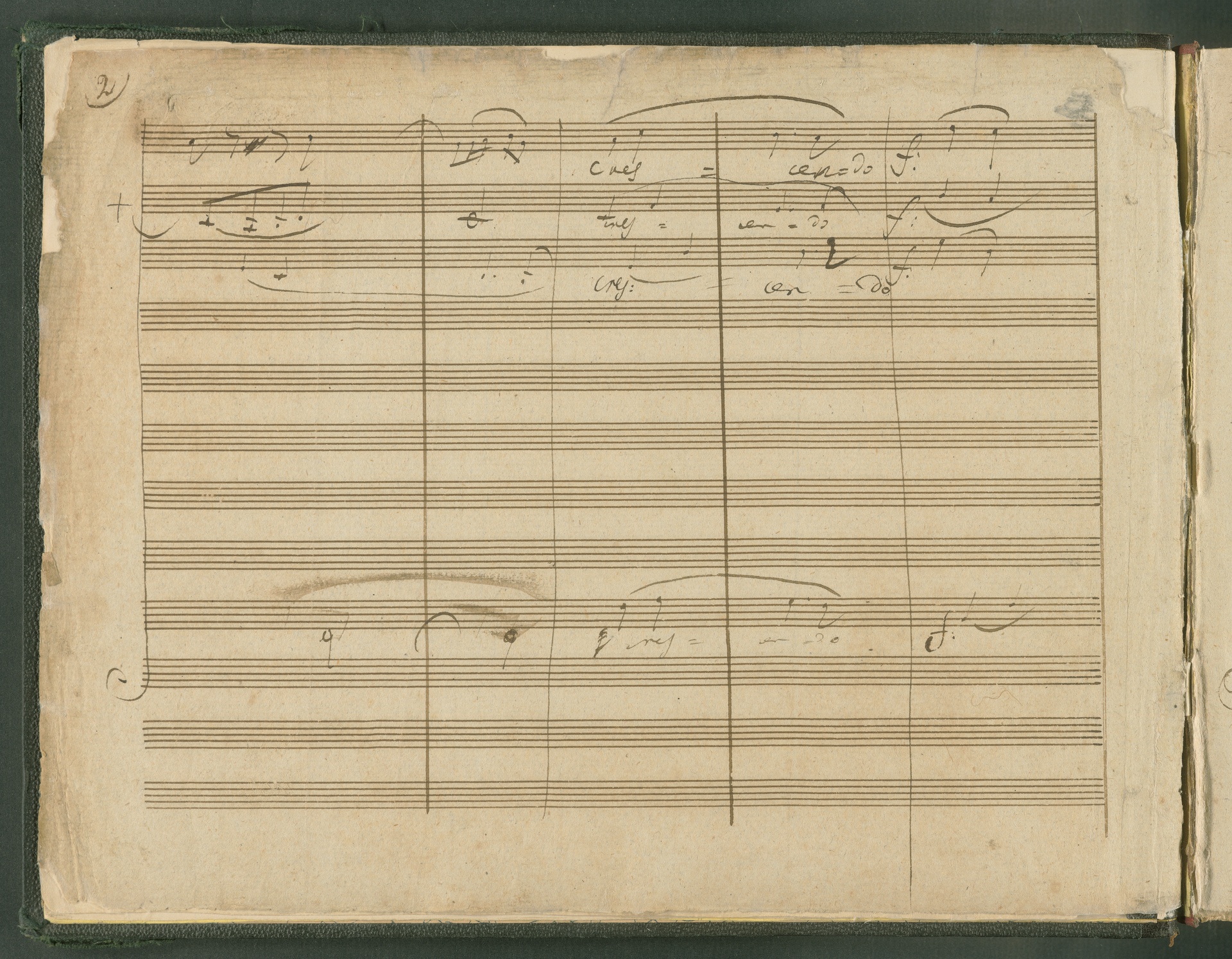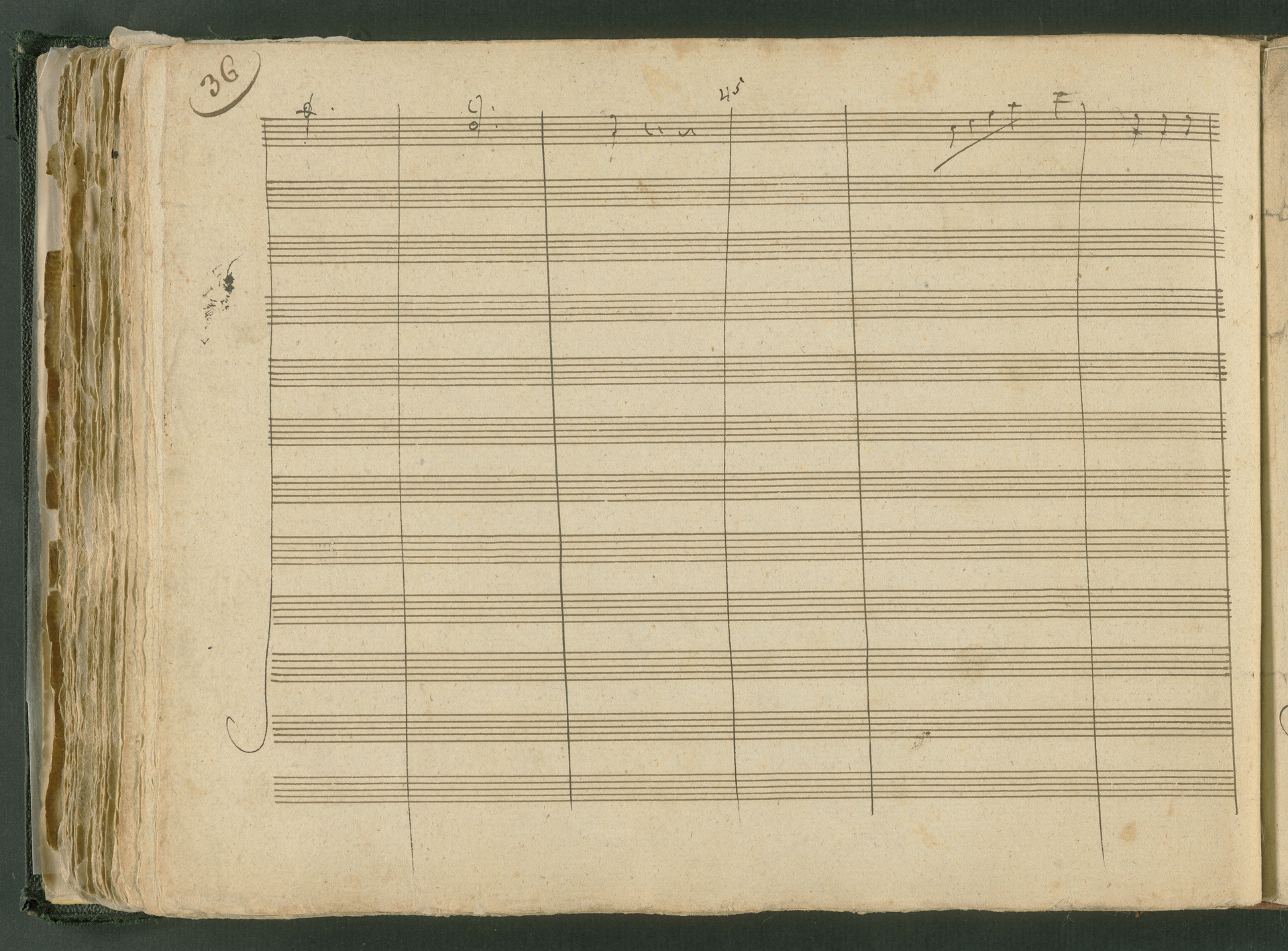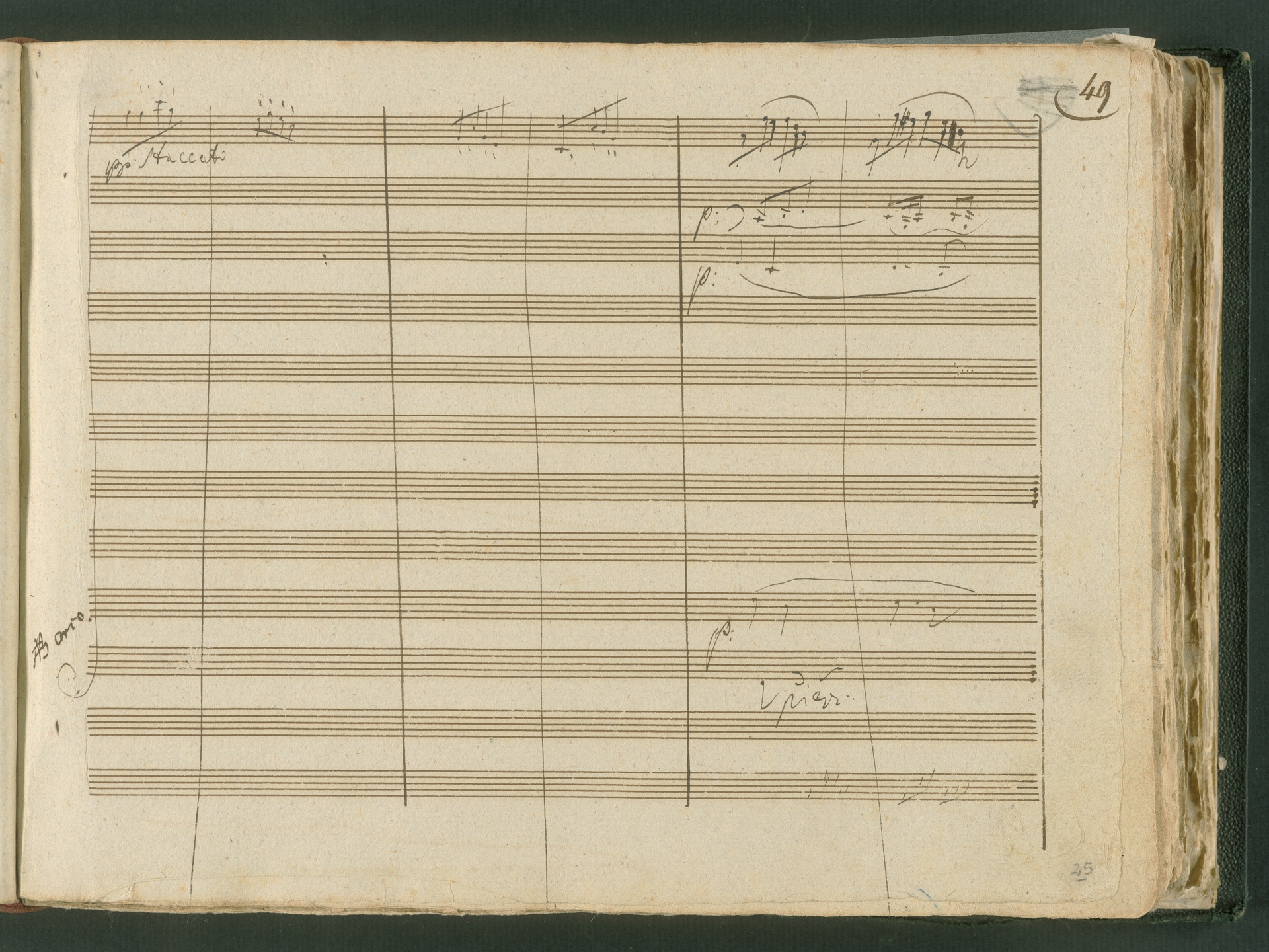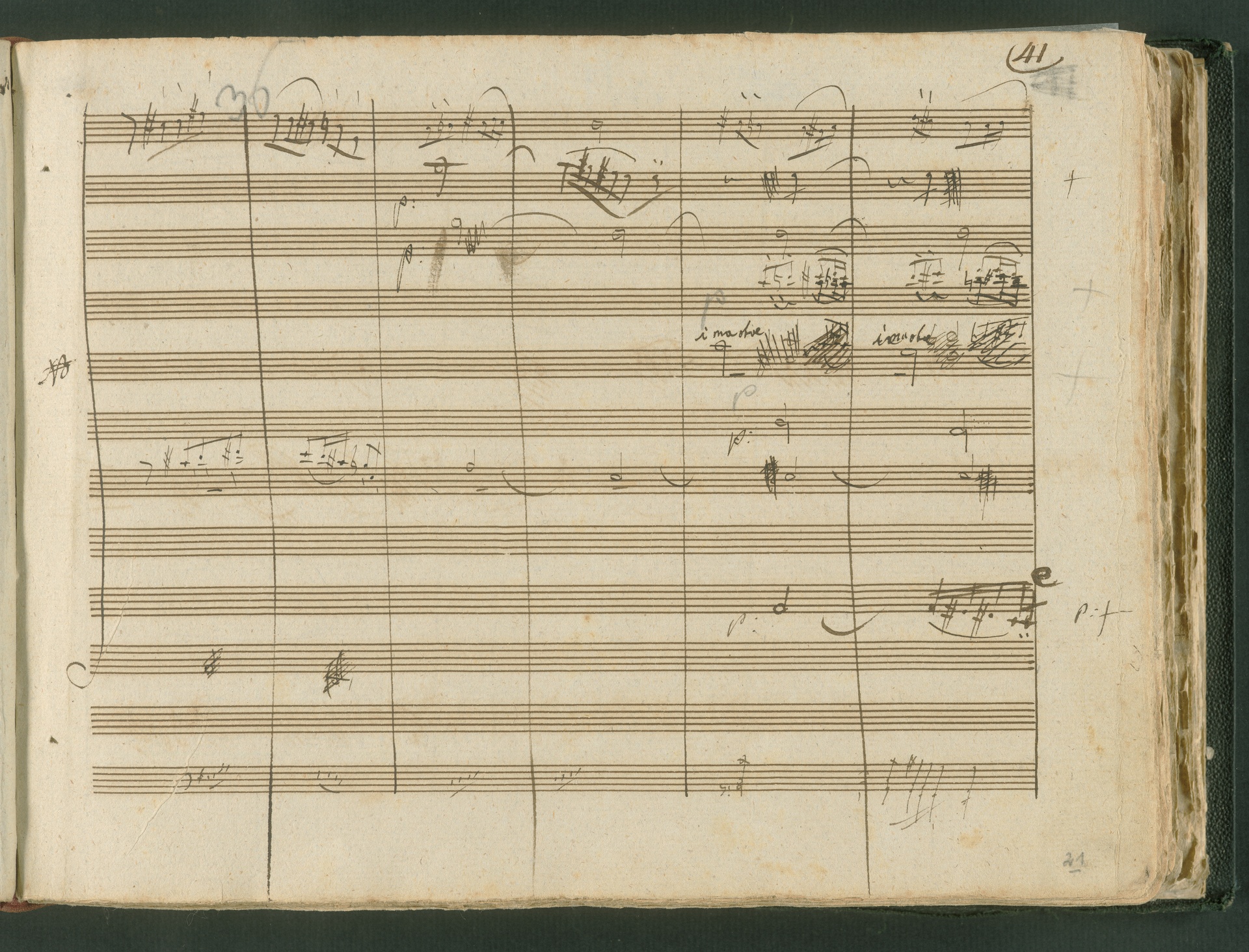 Wir sehen hier den unbestreitbar größten Schatz des Beethoven-Archivs: das vollständige Autograph der 6. Sinfonie op. 68, der "Pastorale". Es ist jedoch ein Irrtum zu glauben, dieses Autograph wäre der saubere Abschluß einer Entwicklung, an deren Ende ein fertiges, "ordentliches" Manuskript steht. Vielmehr lässt sich an diesem Autograph der Kompositionsprozeß verfolgen: unter dem abgeschlossenen Text sind mehrere Schichten sichtbar.