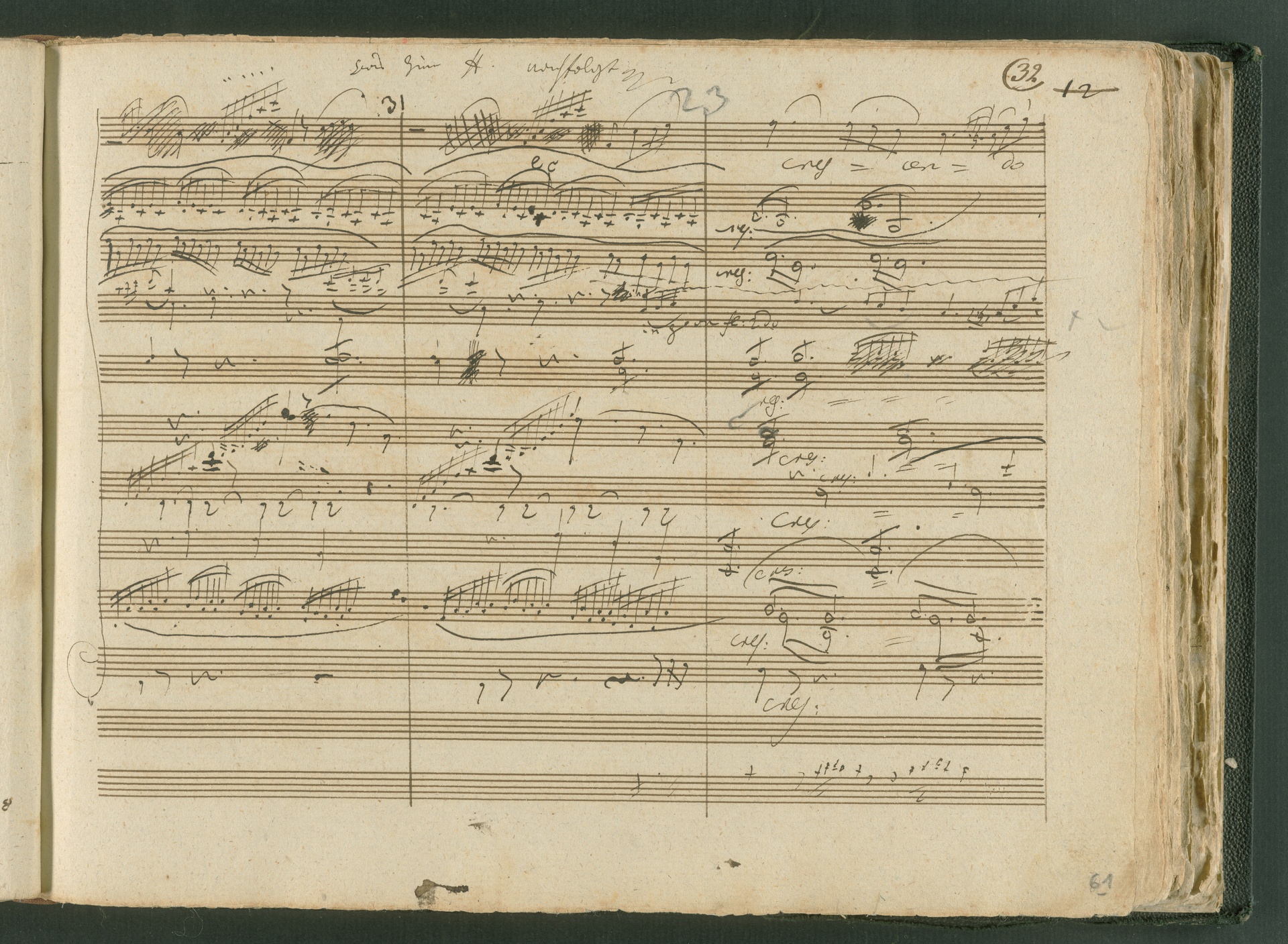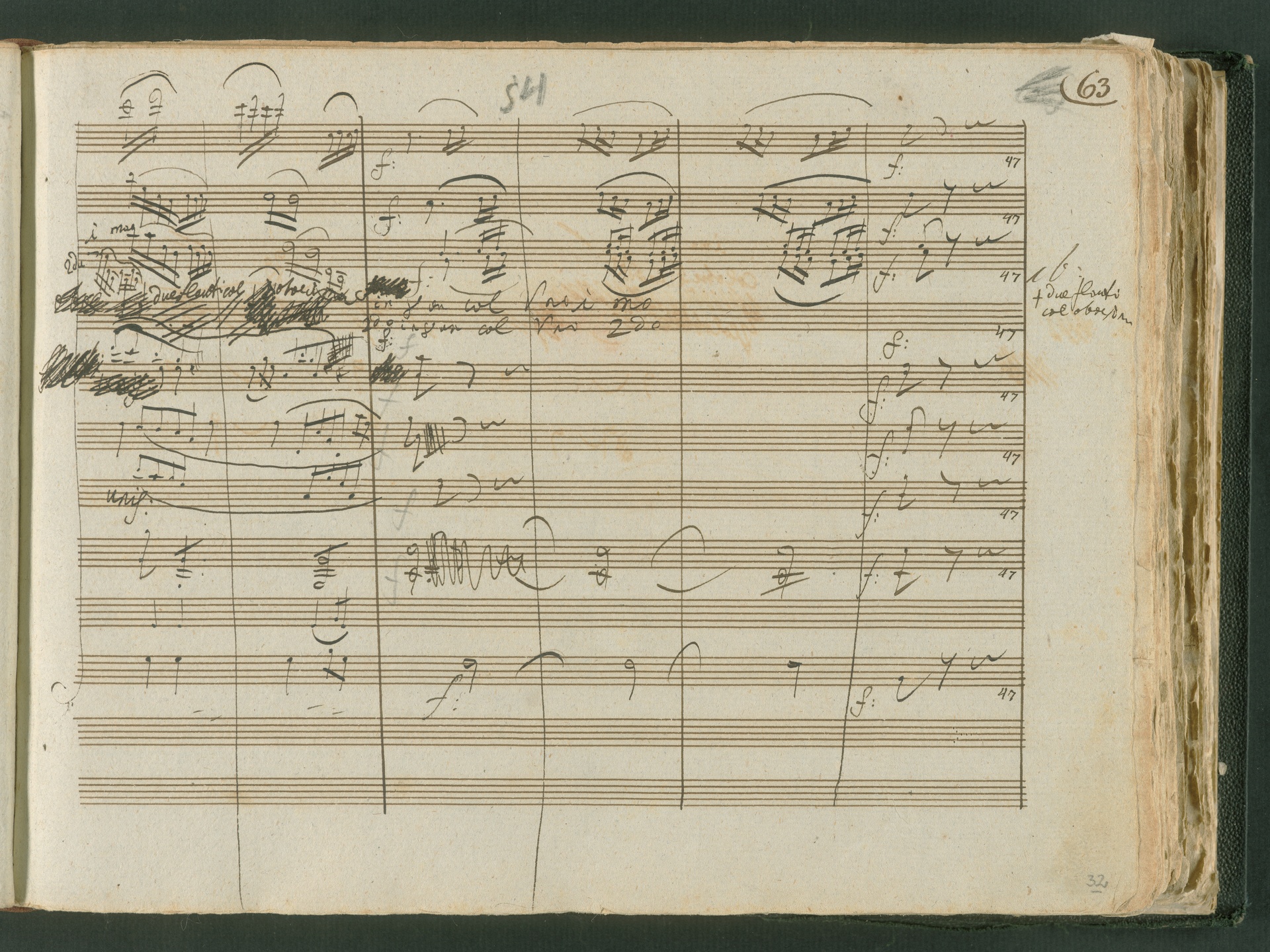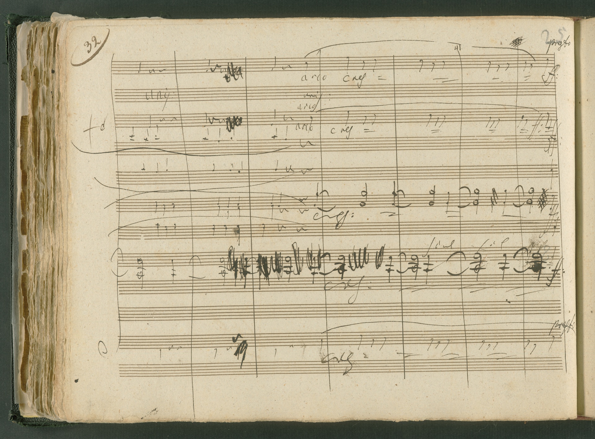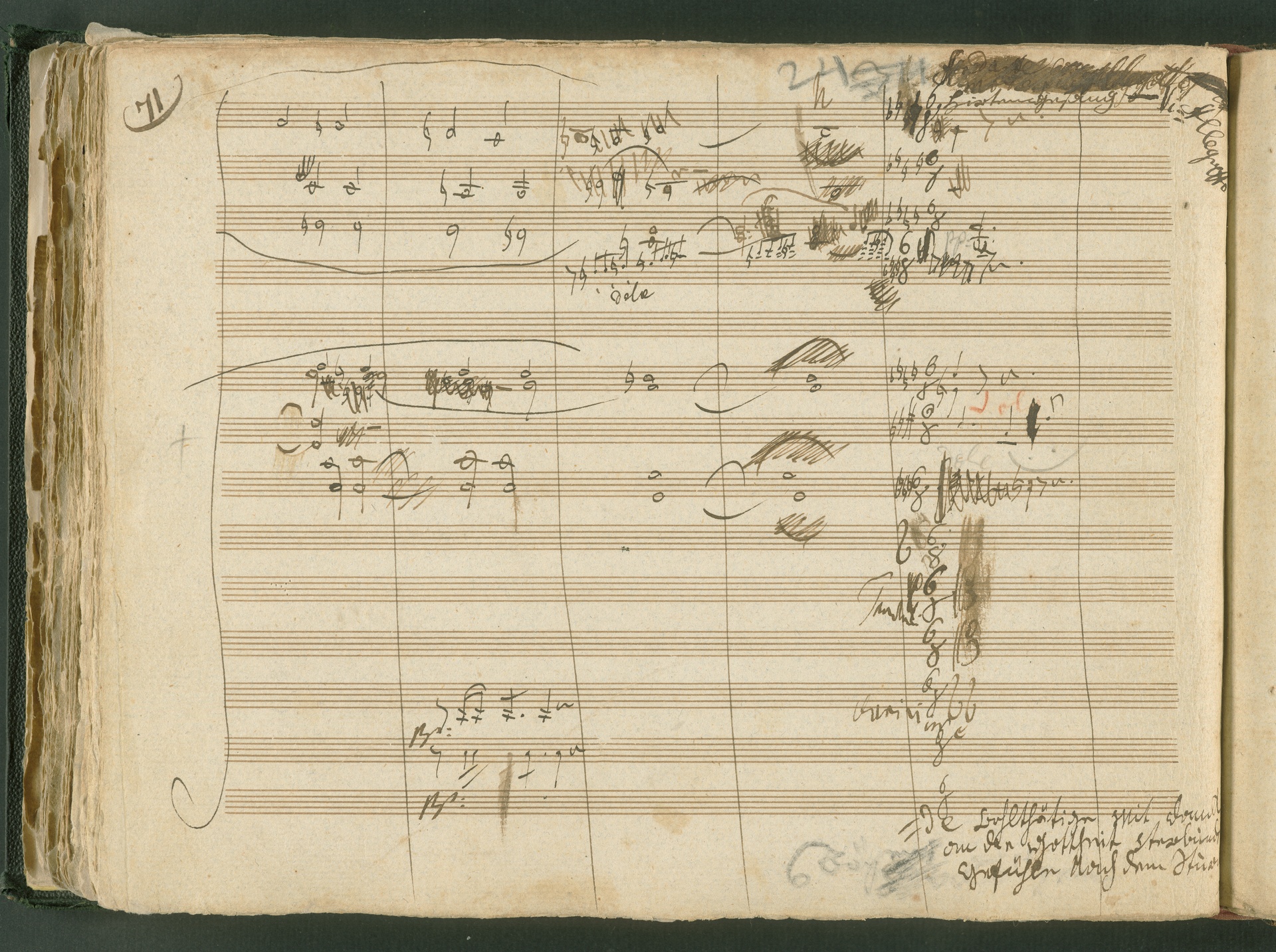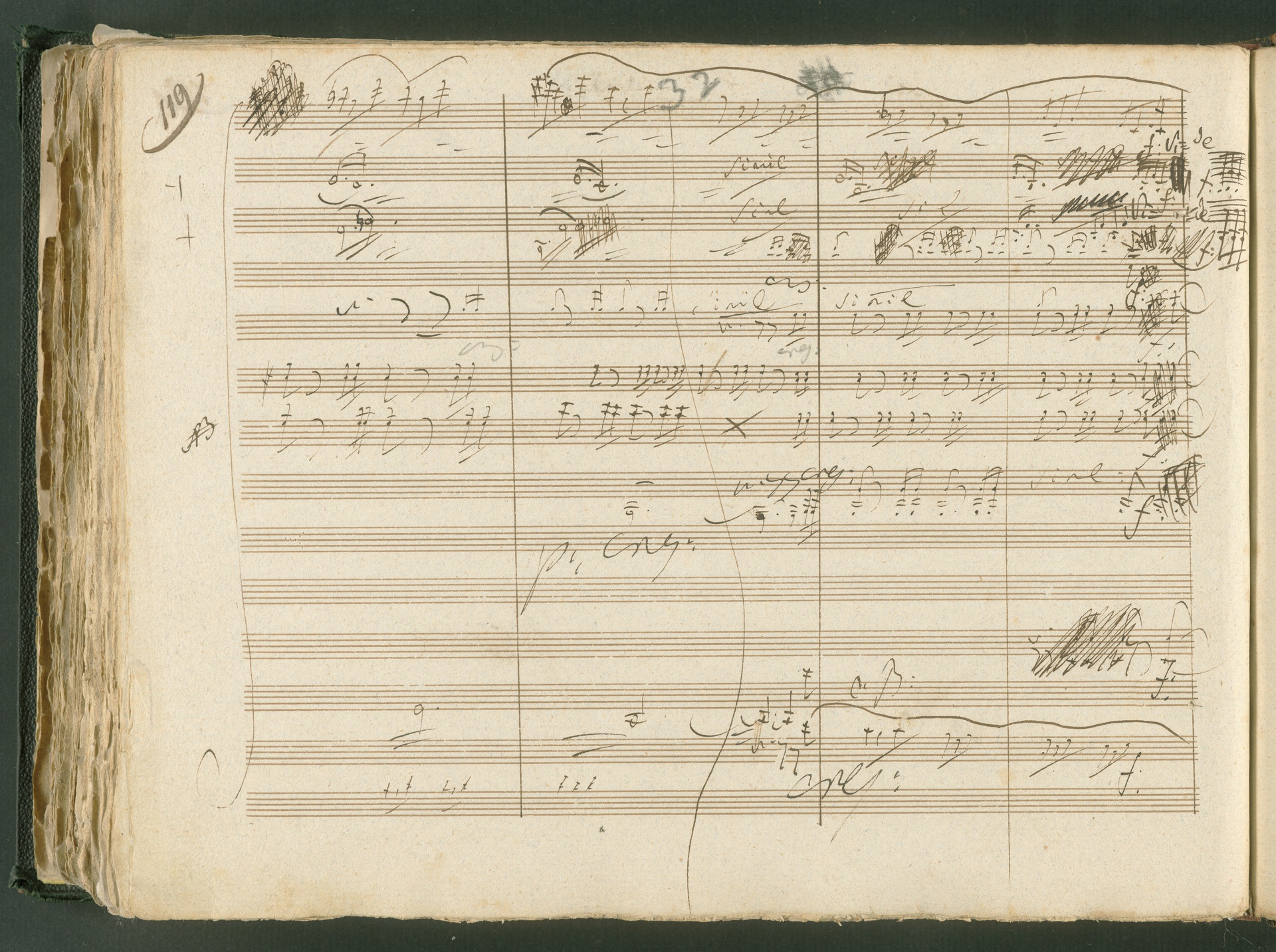 Manchmal änderte Beethoven auch während der Arbeit die Seitenaufteilung, so dass er Takte oder Taktgruppen streichen musste, so z.B. auf Bl. 32. Der erste Takt auf der Rückseite, Bl. 32v, war vornotiert, passte dann aber bei der Ausarbeitung als letzter Takt schon auf die Vorderseite, Bl. 32r - er konnte also verso gestrichen werden. Auch nahm Beethoven Änderungen in der Struktur des Werkes vor, kürzte Abschnitte oder verlängerte sie oder änderte ganze Phrasen. Auf vielen Seiten tragen die unteren freien Systeme flüchtige Skizzen zu Takten, die sich weiter oben auf der Seite in der Partitur wieder finden. Beethoven notierte sich hier keine neuen melodischen Ideen oder Entwürfe, sondern probierte meist Instrumentationen kritischer Stellen. Diese Notierungen gehören einem relativ frühen Stadium der Komposition an.