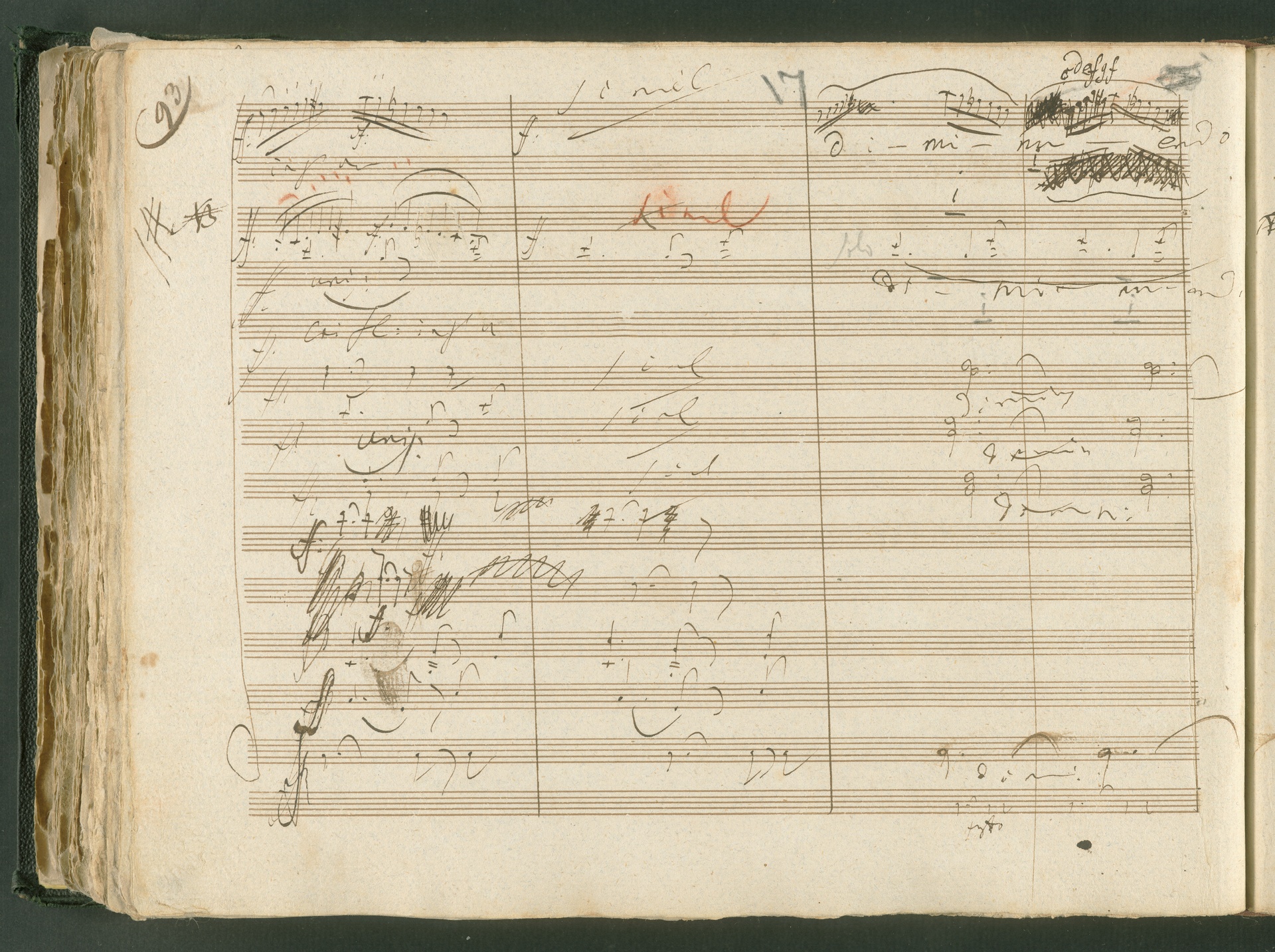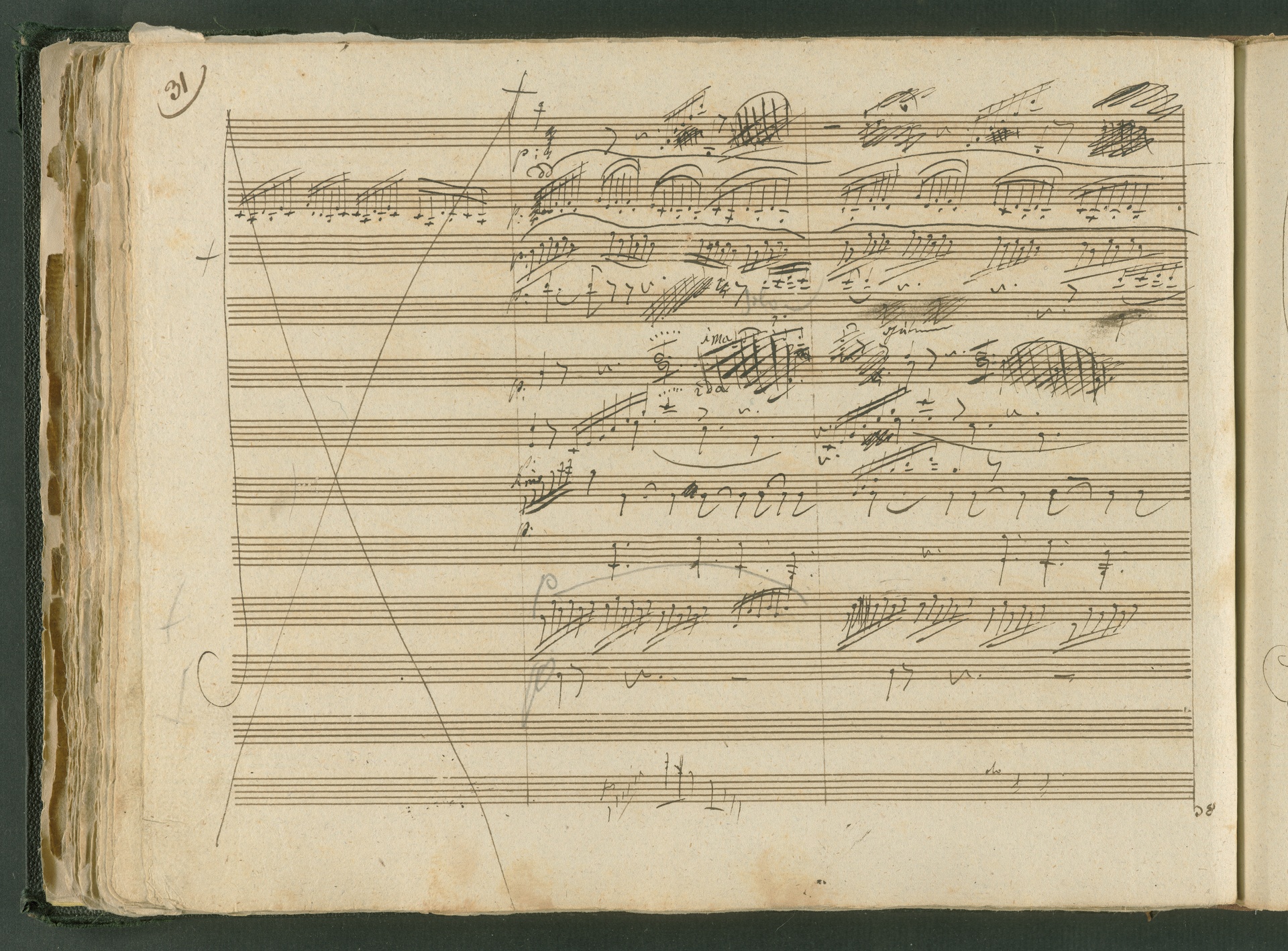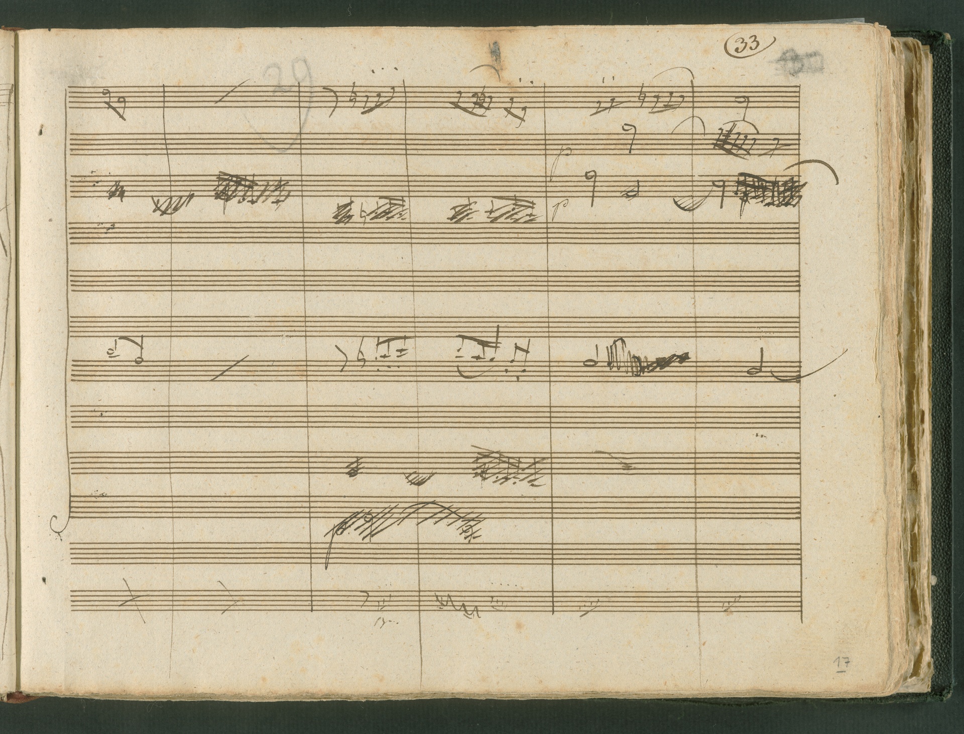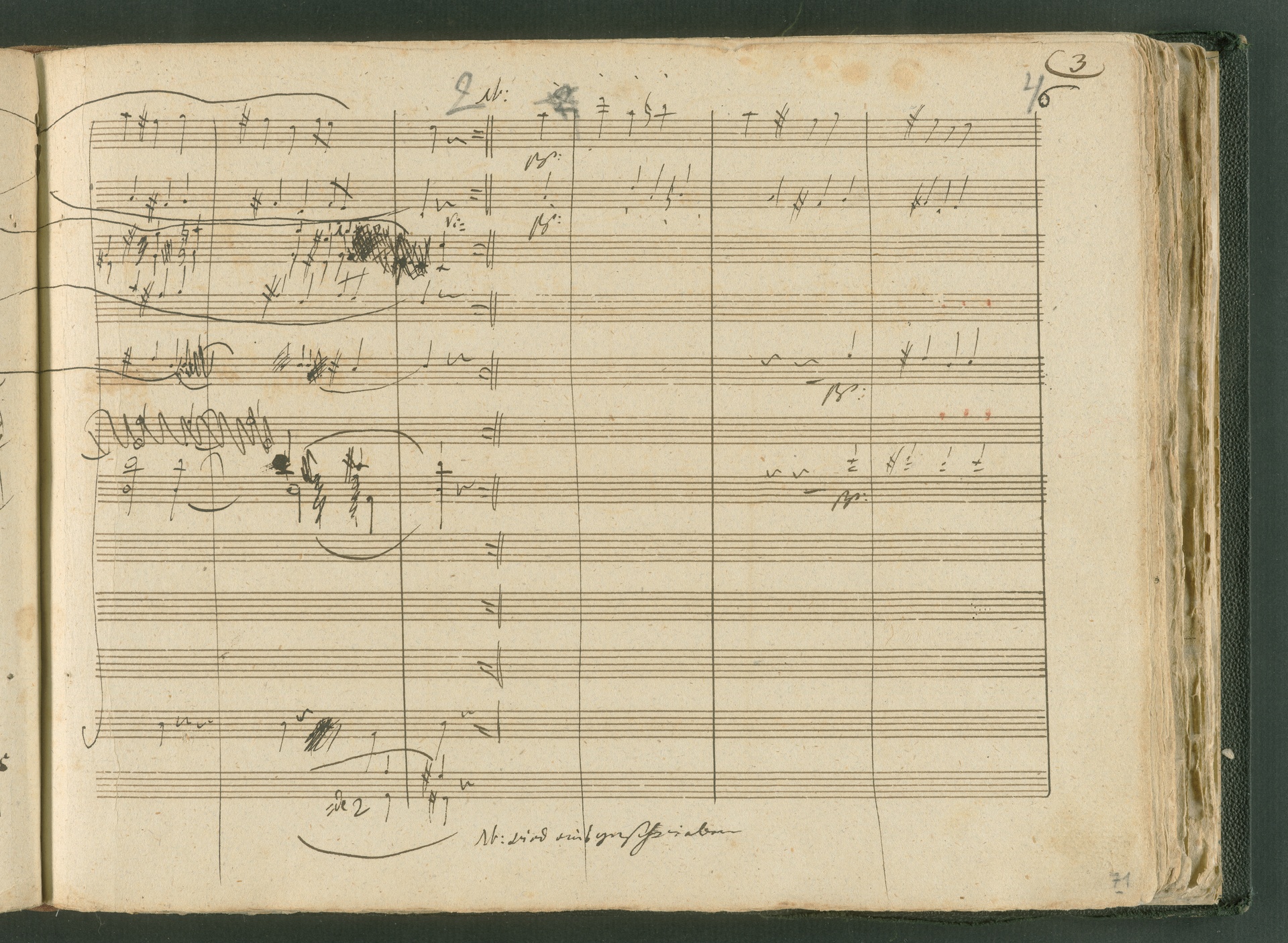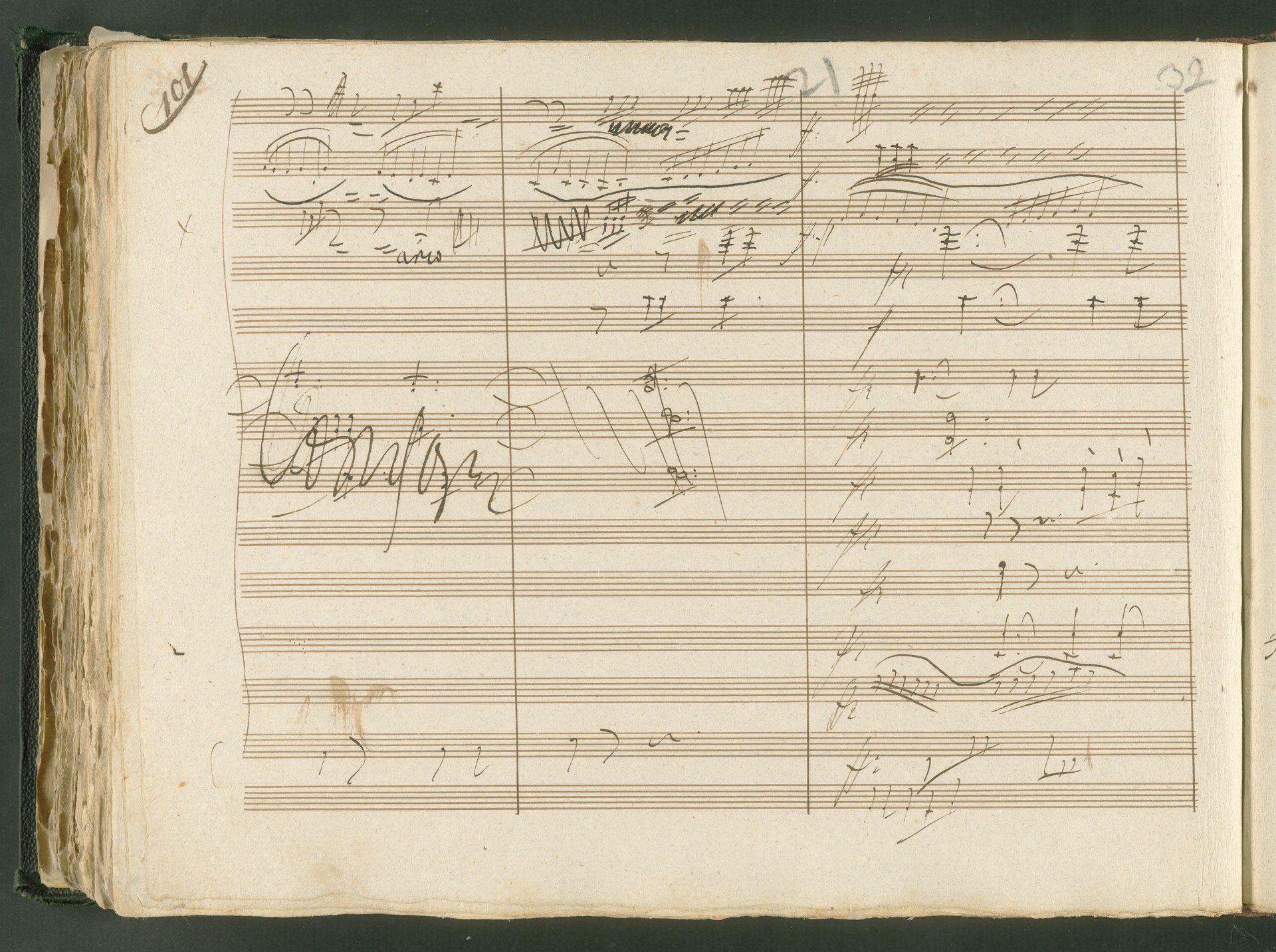 Manchmal änderte Beethoven auch während der Arbeit die Seitenaufteilung, so dass er Takte oder Taktgruppen streichen musste, so z.B. auf Bl. 32. Der erste Takt auf der Rückseite, Bl. 32v, war vornotiert, passte dann aber bei der Ausarbeitung als letzter Takt schon auf die Vorderseite, Bl. 32r - er konnte also verso gestrichen werden. Auch nahm Beethoven Änderungen in der Struktur des Werkes vor, kürzte Abschnitte oder verlängerte sie oder änderte ganze Phrasen. Auf vielen Seiten tragen die unteren freien Systeme flüchtige Skizzen zu Takten, die sich weiter oben auf der Seite in der Partitur wieder finden. Beethoven notierte sich hier keine neuen melodischen Ideen oder Entwürfe, sondern probierte meist Instrumentationen kritischer Stellen. Diese Notierungen gehören einem relativ frühen Stadium der Komposition an.