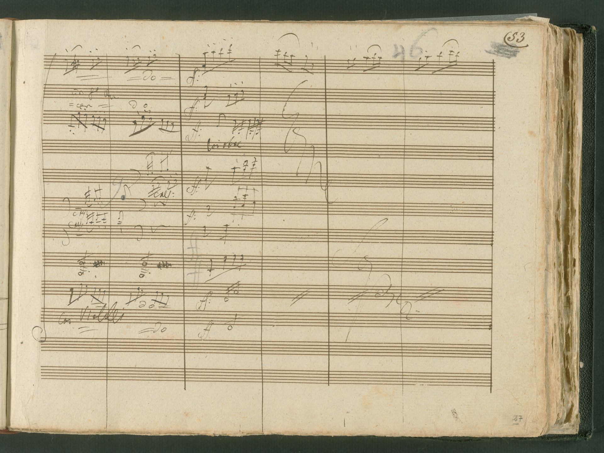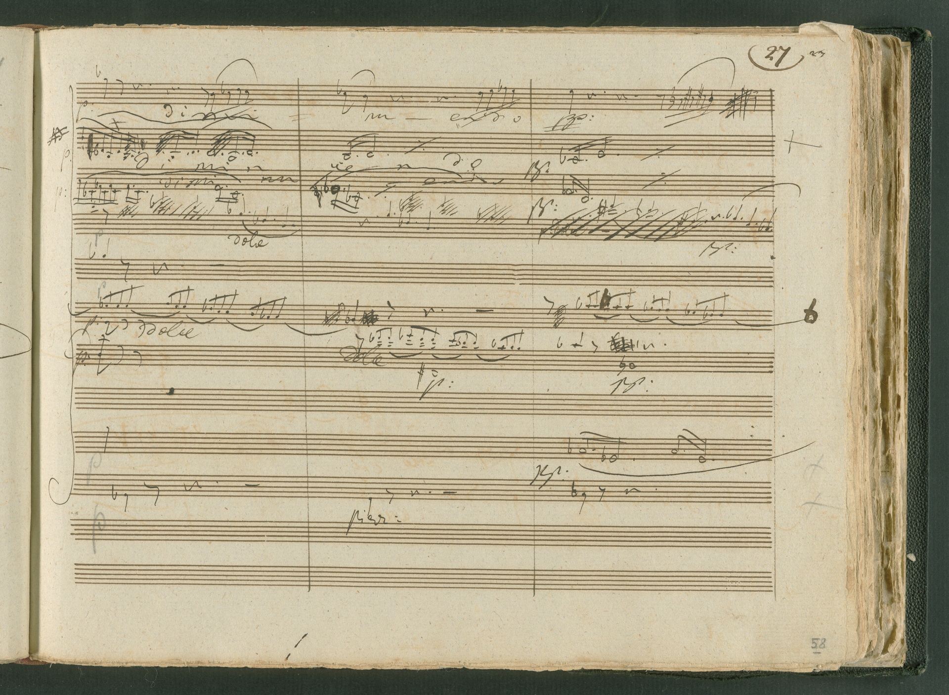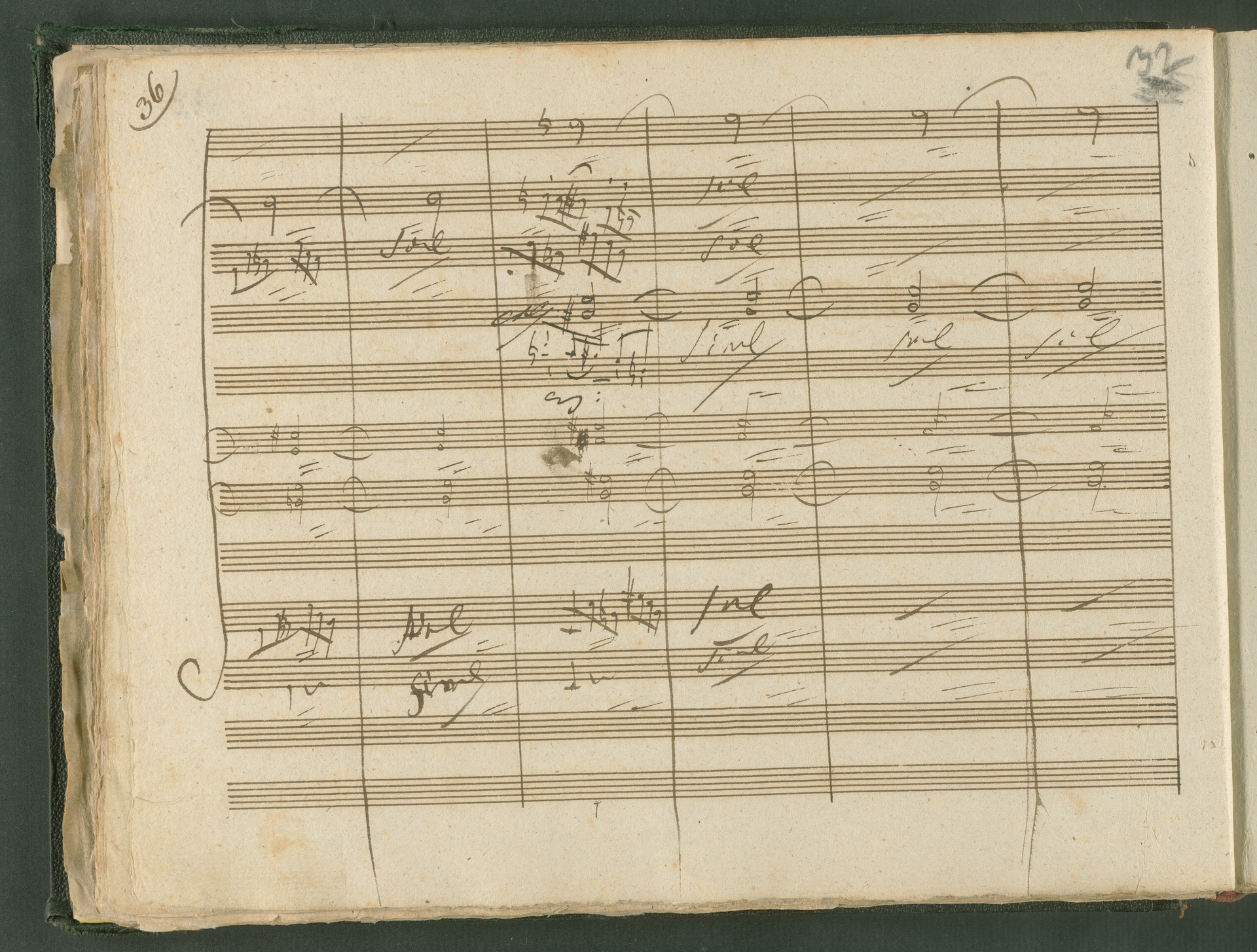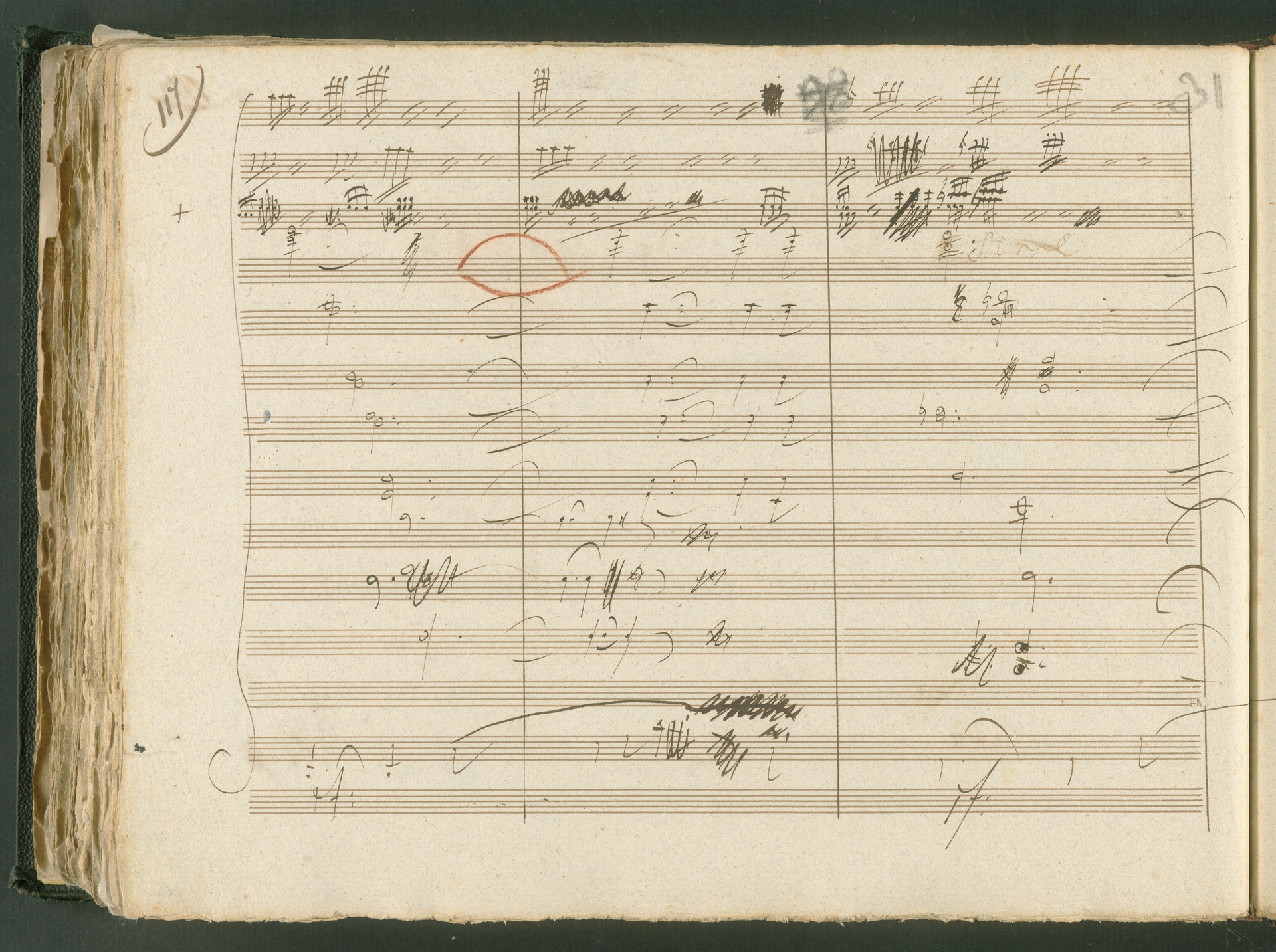 Manchmal änderte Beethoven auch während der Arbeit die Seitenaufteilung, so dass er Takte oder Taktgruppen streichen musste, so z.B. auf Bl. 32. Der erste Takt auf der Rückseite, Bl. 32v, war vornotiert, passte dann aber bei der Ausarbeitung als letzter Takt schon auf die Vorderseite, Bl. 32r - er konnte also verso gestrichen werden. Auch nahm Beethoven Änderungen in der Struktur des Werkes vor, kürzte Abschnitte oder verlängerte sie oder änderte ganze Phrasen. Auf vielen Seiten tragen die unteren freien Systeme flüchtige Skizzen zu Takten, die sich weiter oben auf der Seite in der Partitur wieder finden. Beethoven notierte sich hier keine neuen melodischen Ideen oder Entwürfe, sondern probierte meist Instrumentationen kritischer Stellen. Diese Notierungen gehören einem relativ frühen Stadium der Komposition an.