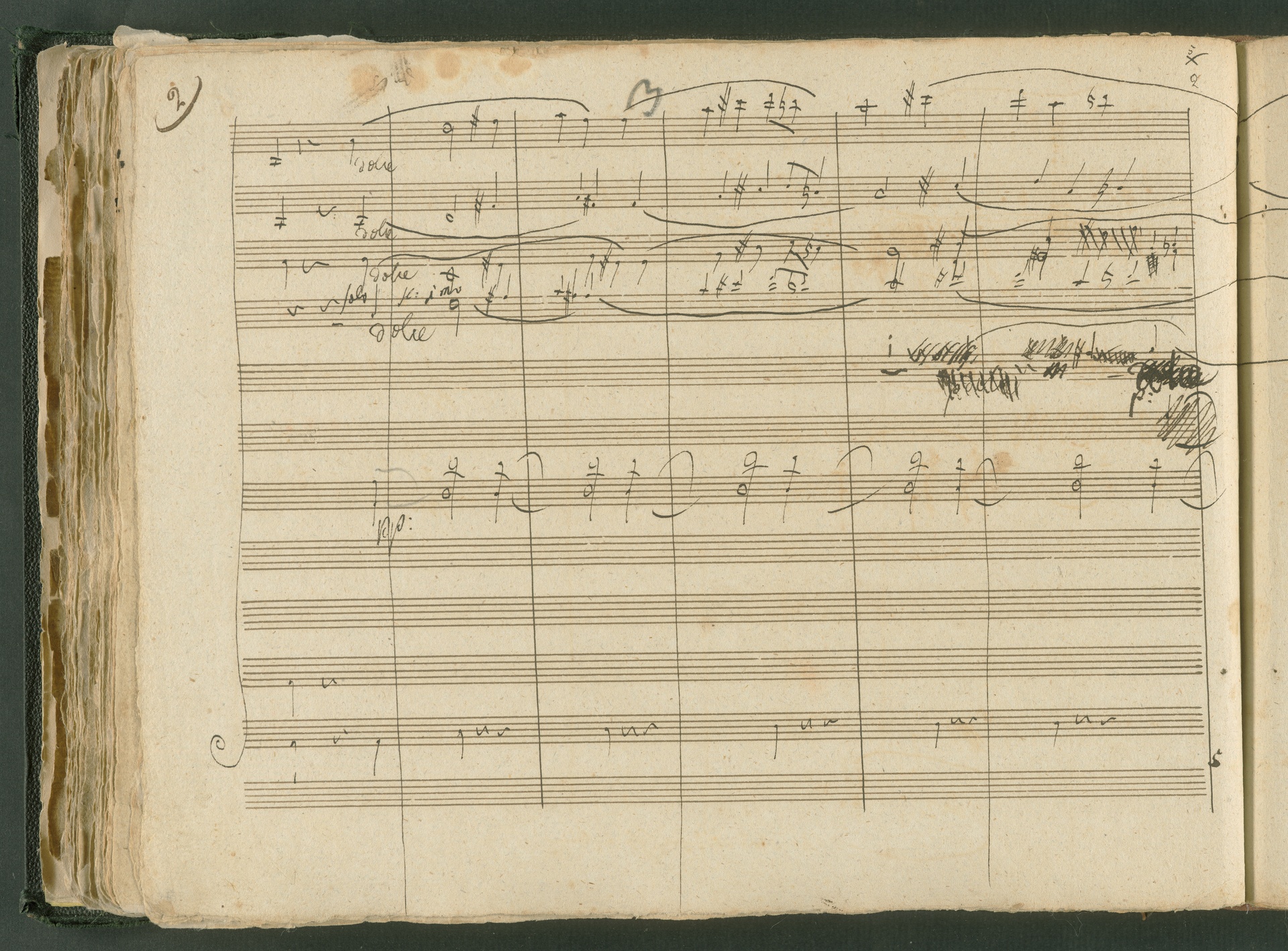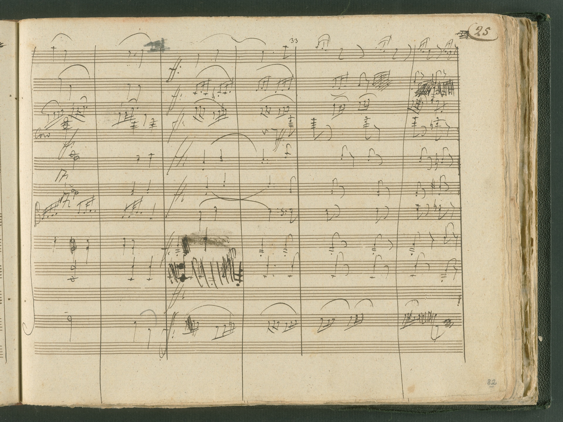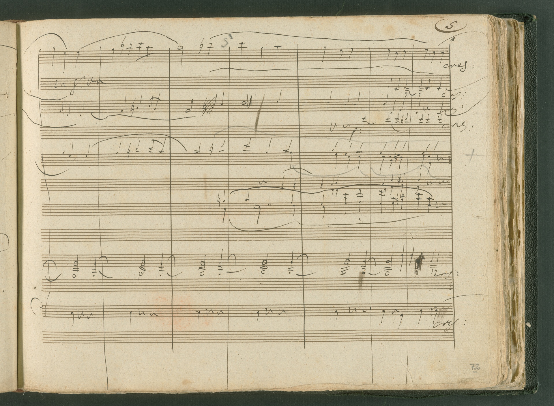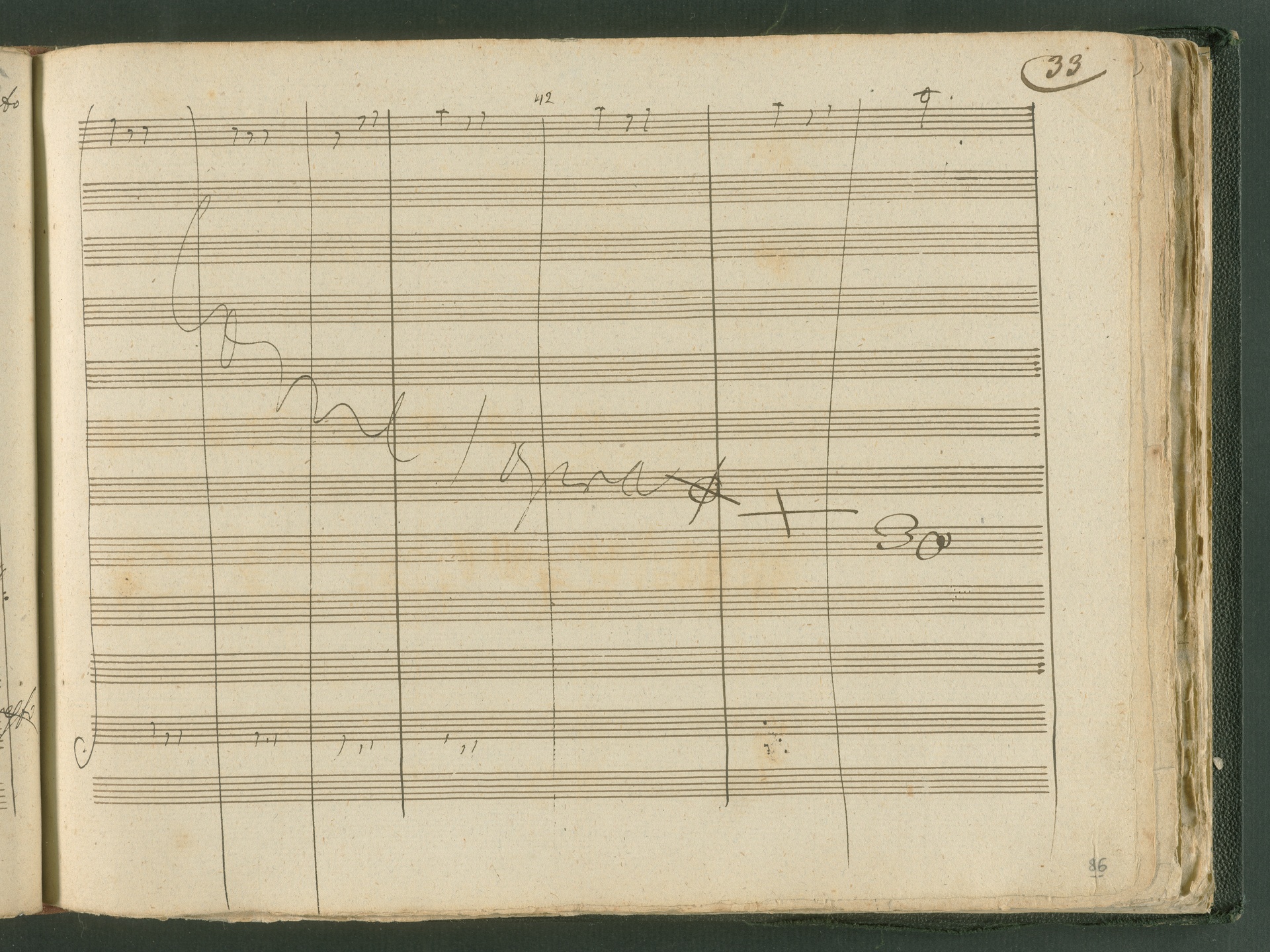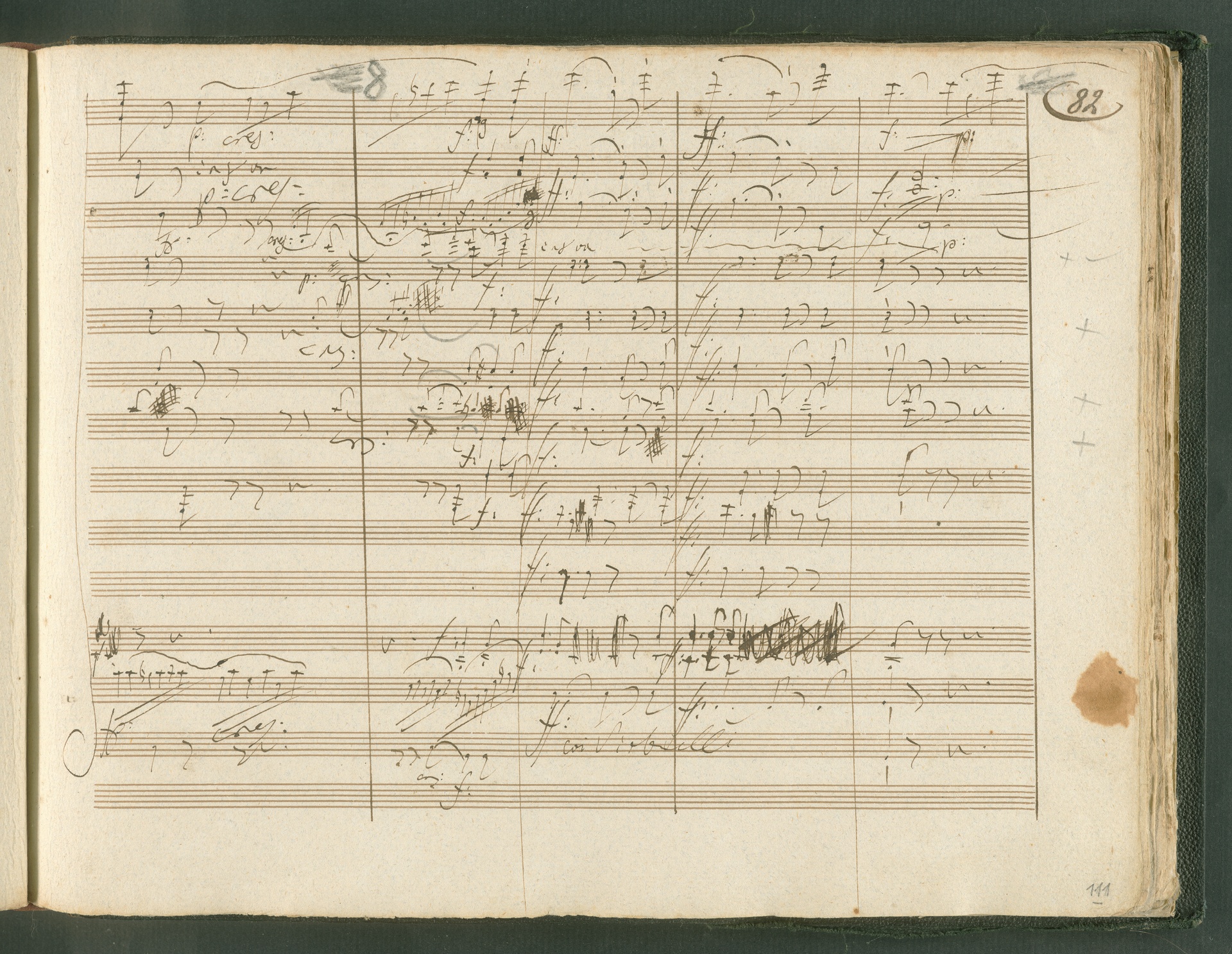 Manchmal änderte Beethoven auch während der Arbeit die Seitenaufteilung, so dass er Takte oder Taktgruppen streichen musste, so z.B. auf Bl. 32. Der erste Takt auf der Rückseite, Bl. 32v, war vornotiert, passte dann aber bei der Ausarbeitung als letzter Takt schon auf die Vorderseite, Bl. 32r - er konnte also verso gestrichen werden. Auch nahm Beethoven Änderungen in der Struktur des Werkes vor, kürzte Abschnitte oder verlängerte sie oder änderte ganze Phrasen. Auf vielen Seiten tragen die unteren freien Systeme flüchtige Skizzen zu Takten, die sich weiter oben auf der Seite in der Partitur wieder finden. Beethoven notierte sich hier keine neuen melodischen Ideen oder Entwürfe, sondern probierte meist Instrumentationen kritischer Stellen. Diese Notierungen gehören einem relativ frühen Stadium der Komposition an.