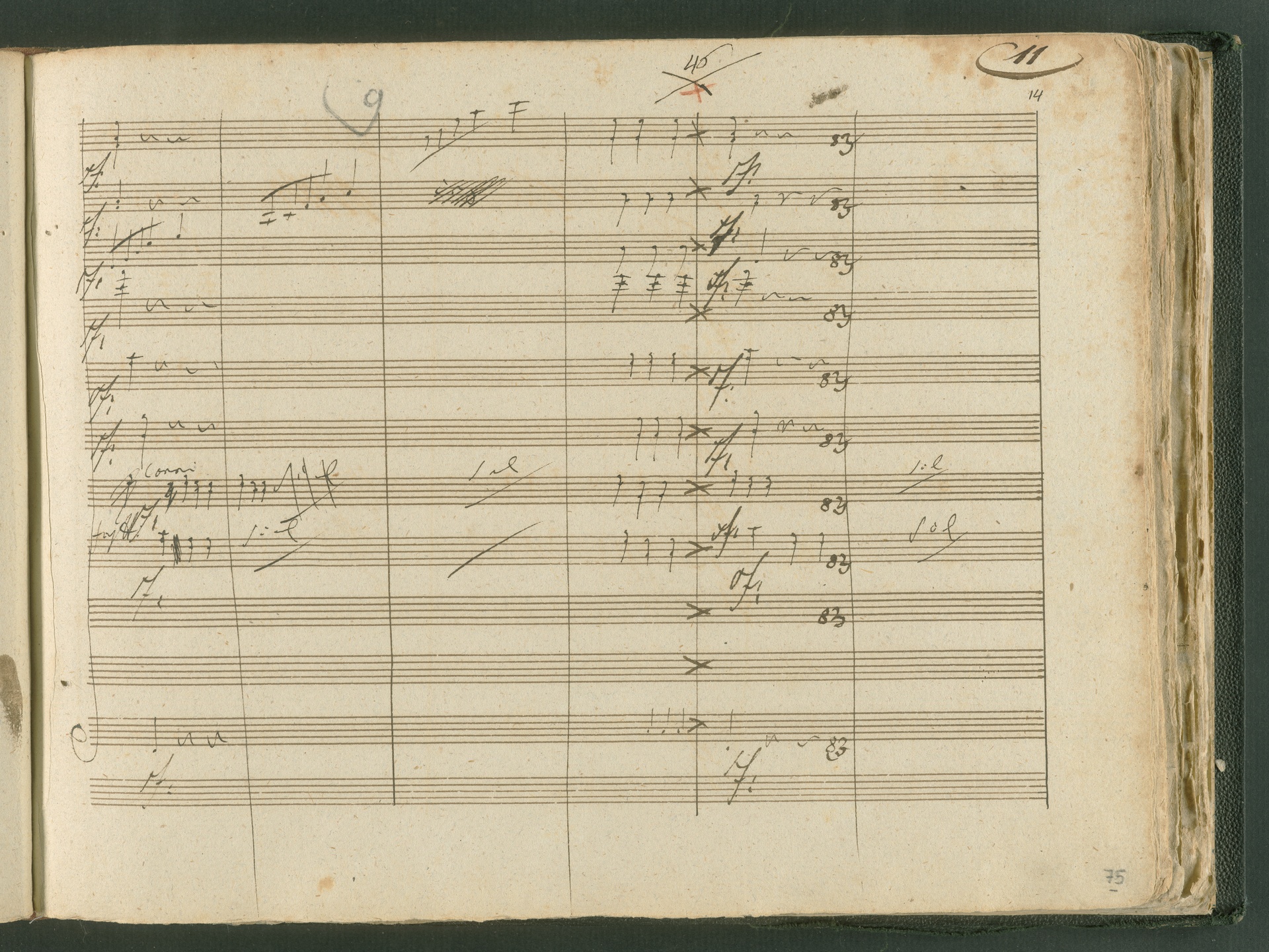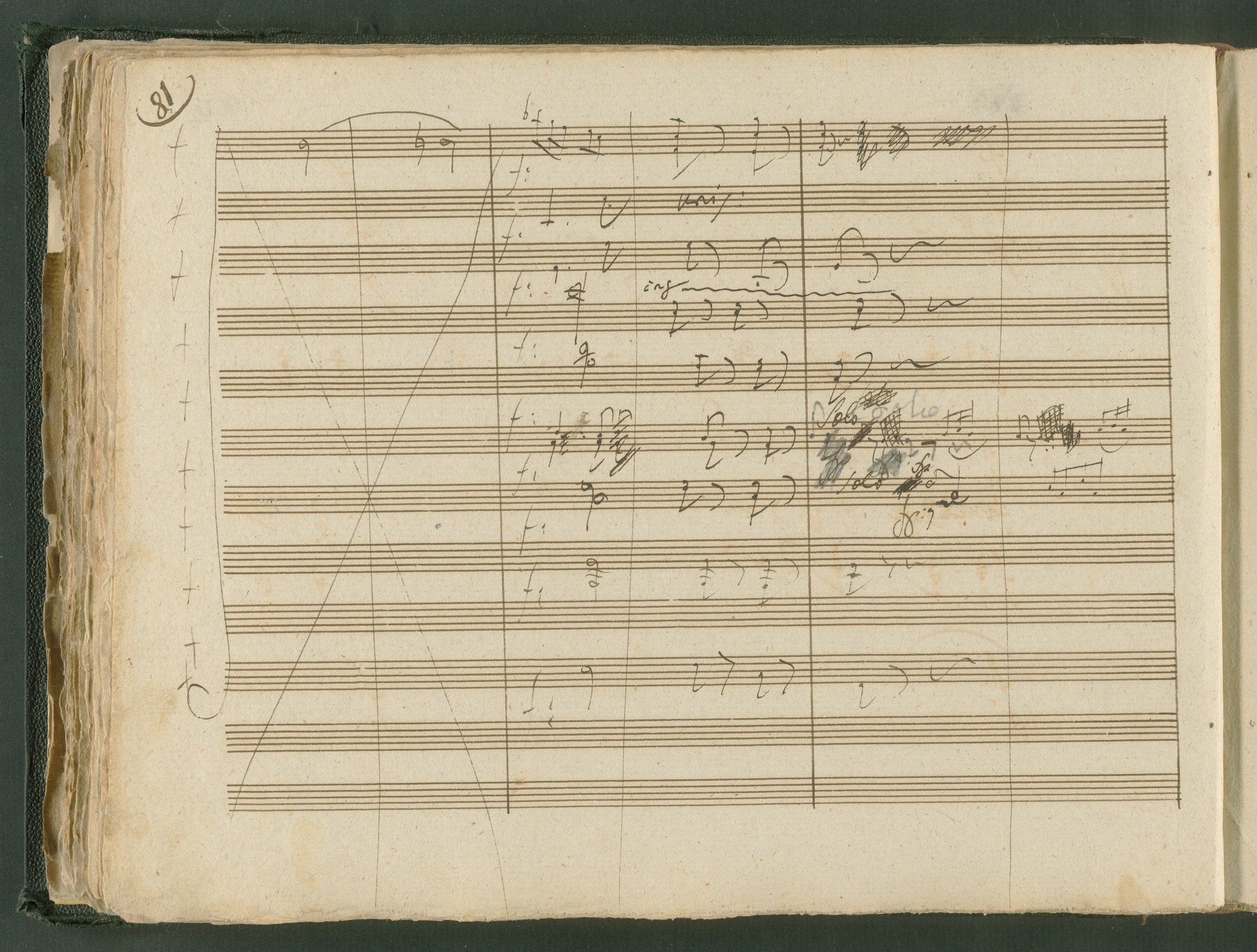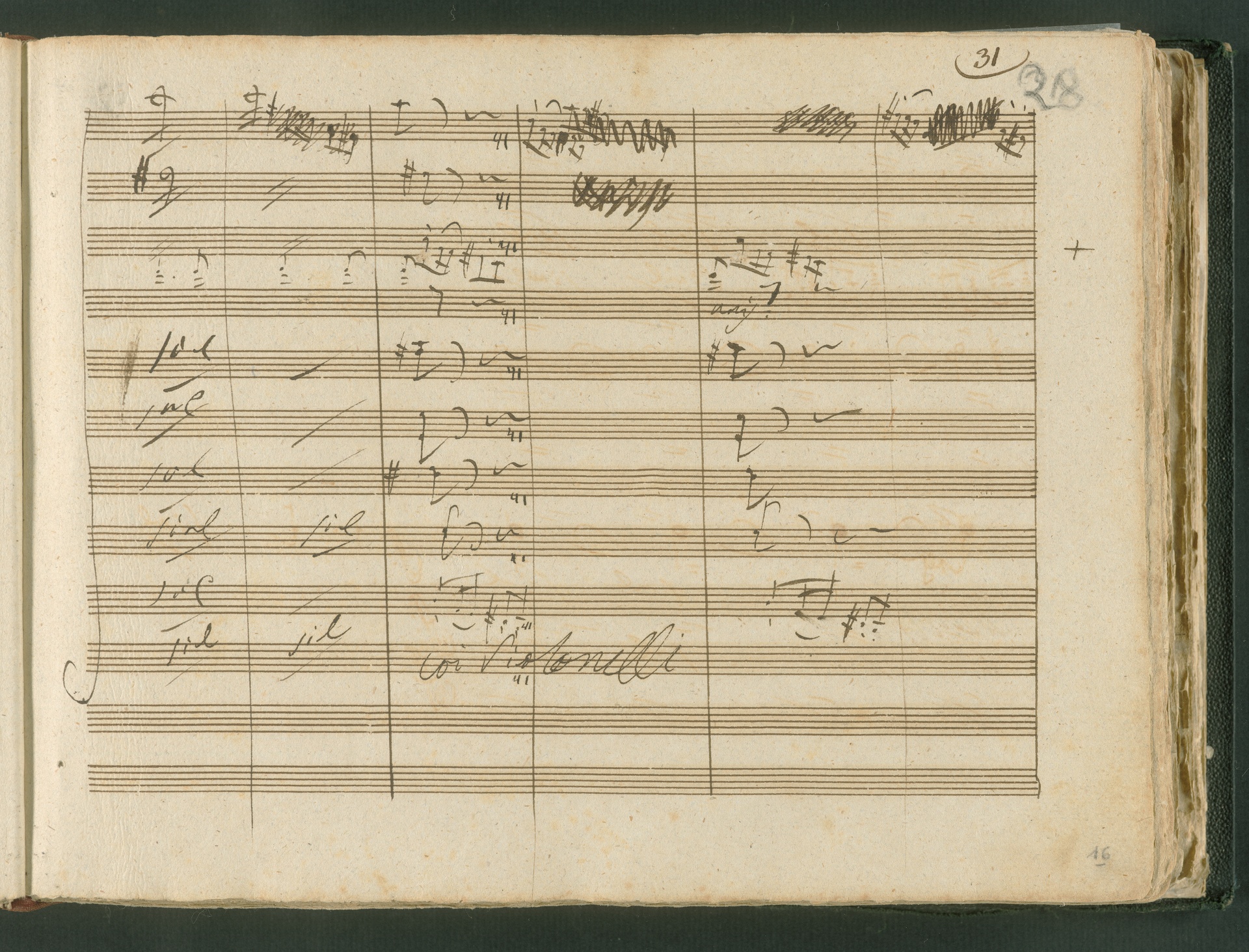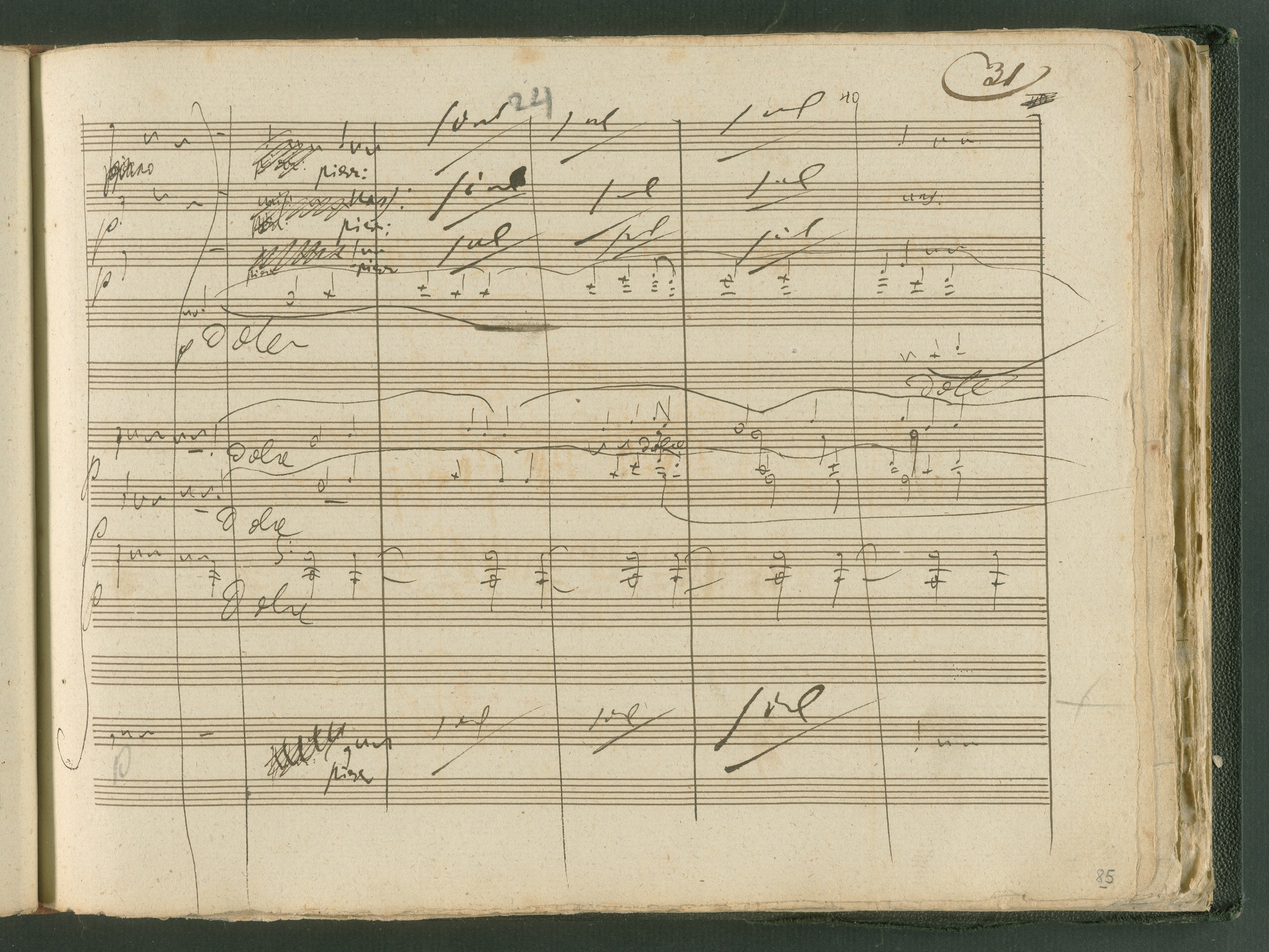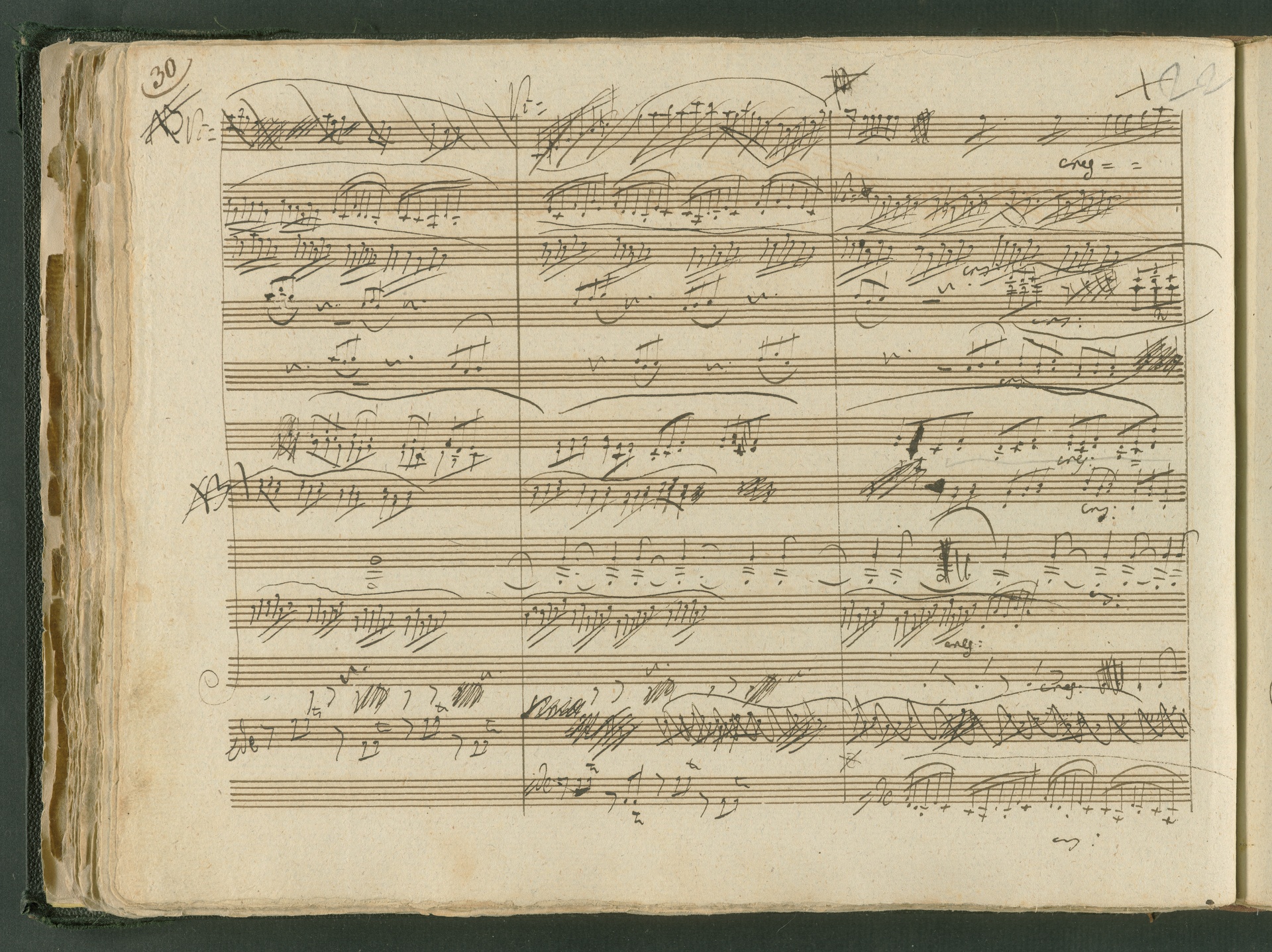 Manchmal änderte Beethoven auch während der Arbeit die Seitenaufteilung, so dass er Takte oder Taktgruppen streichen musste, so z.B. auf Bl. 32. Der erste Takt auf der Rückseite, Bl. 32v, war vornotiert, passte dann aber bei der Ausarbeitung als letzter Takt schon auf die Vorderseite, Bl. 32r - er konnte also verso gestrichen werden. Auch nahm Beethoven Änderungen in der Struktur des Werkes vor, kürzte Abschnitte oder verlängerte sie oder änderte ganze Phrasen. Auf vielen Seiten tragen die unteren freien Systeme flüchtige Skizzen zu Takten, die sich weiter oben auf der Seite in der Partitur wieder finden. Beethoven notierte sich hier keine neuen melodischen Ideen oder Entwürfe, sondern probierte meist Instrumentationen kritischer Stellen. Diese Notierungen gehören einem relativ frühen Stadium der Komposition an.