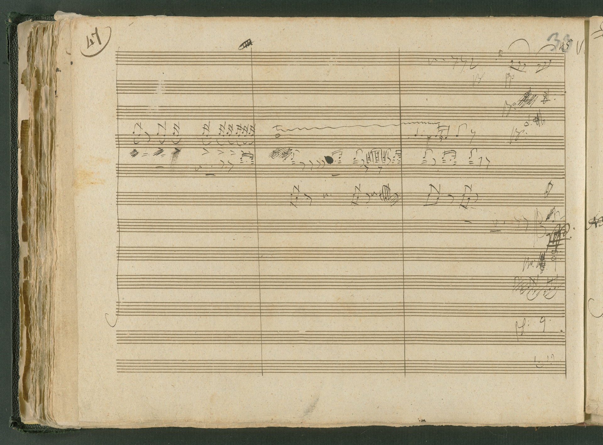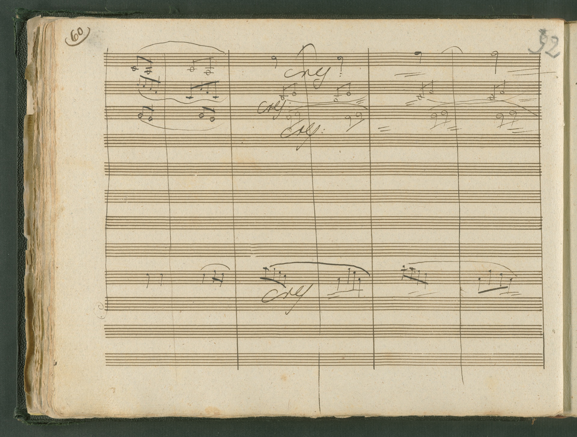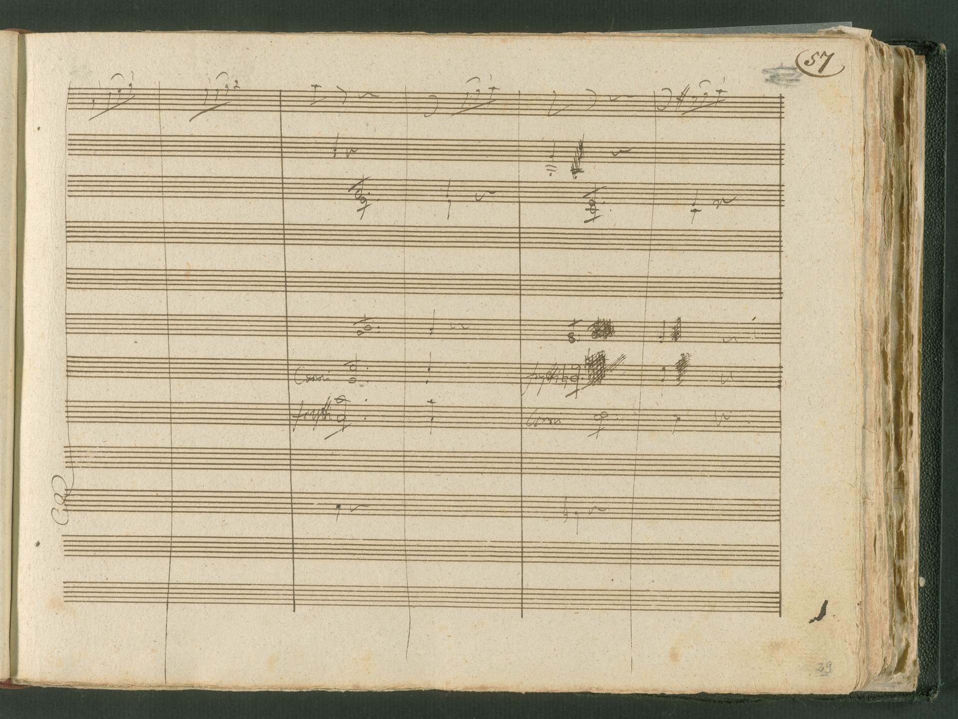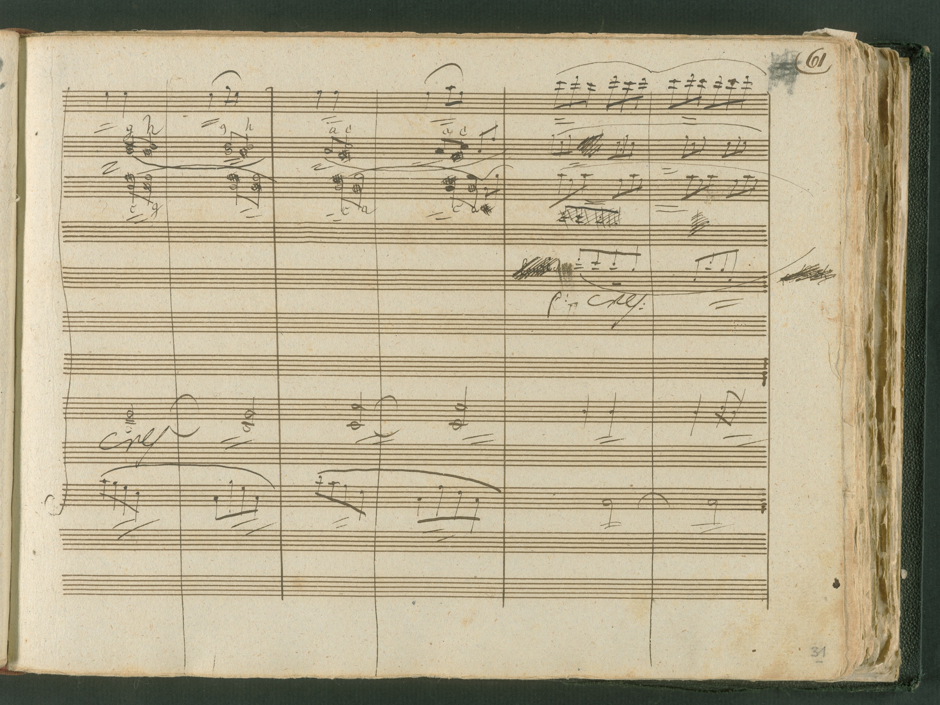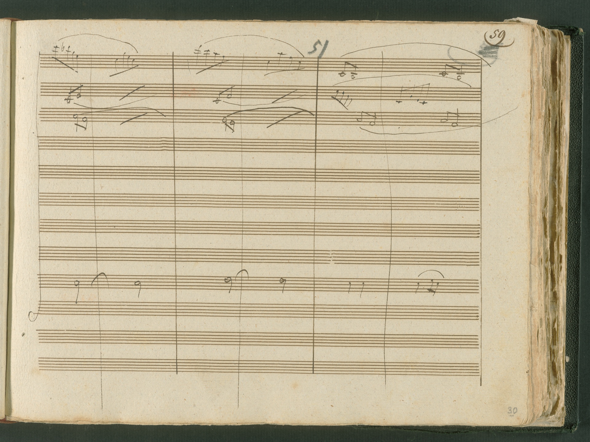 Manchmal änderte Beethoven auch während der Arbeit die Seitenaufteilung, so dass er Takte oder Taktgruppen streichen musste, so z.B. auf Bl. 32. Der erste Takt auf der Rückseite, Bl. 32v, war vornotiert, passte dann aber bei der Ausarbeitung als letzter Takt schon auf die Vorderseite, Bl. 32r - er konnte also verso gestrichen werden. Auch nahm Beethoven Änderungen in der Struktur des Werkes vor, kürzte Abschnitte oder verlängerte sie oder änderte ganze Phrasen. Auf vielen Seiten tragen die unteren freien Systeme flüchtige Skizzen zu Takten, die sich weiter oben auf der Seite in der Partitur wieder finden. Beethoven notierte sich hier keine neuen melodischen Ideen oder Entwürfe, sondern probierte meist Instrumentationen kritischer Stellen. Diese Notierungen gehören einem relativ frühen Stadium der Komposition an.