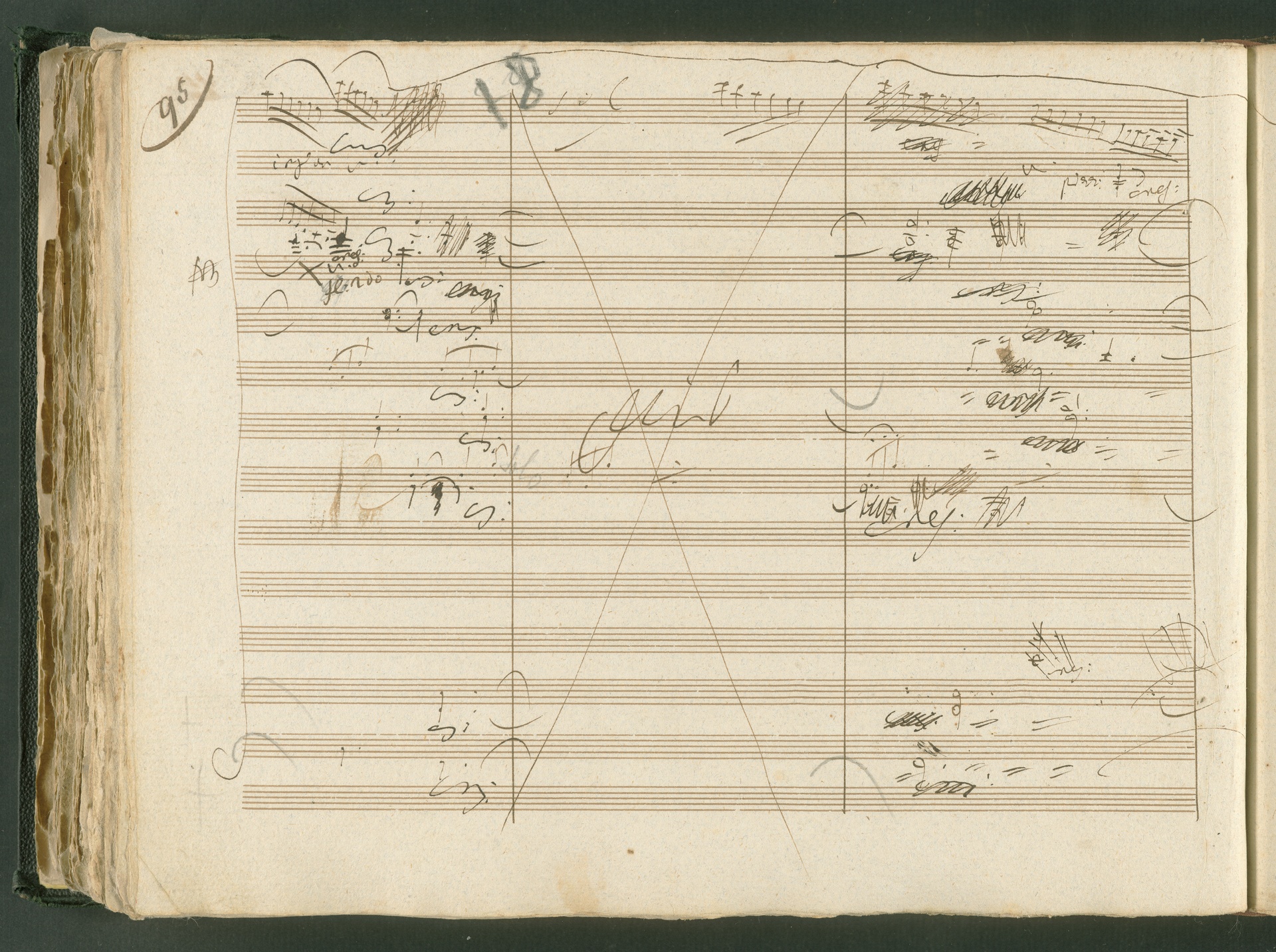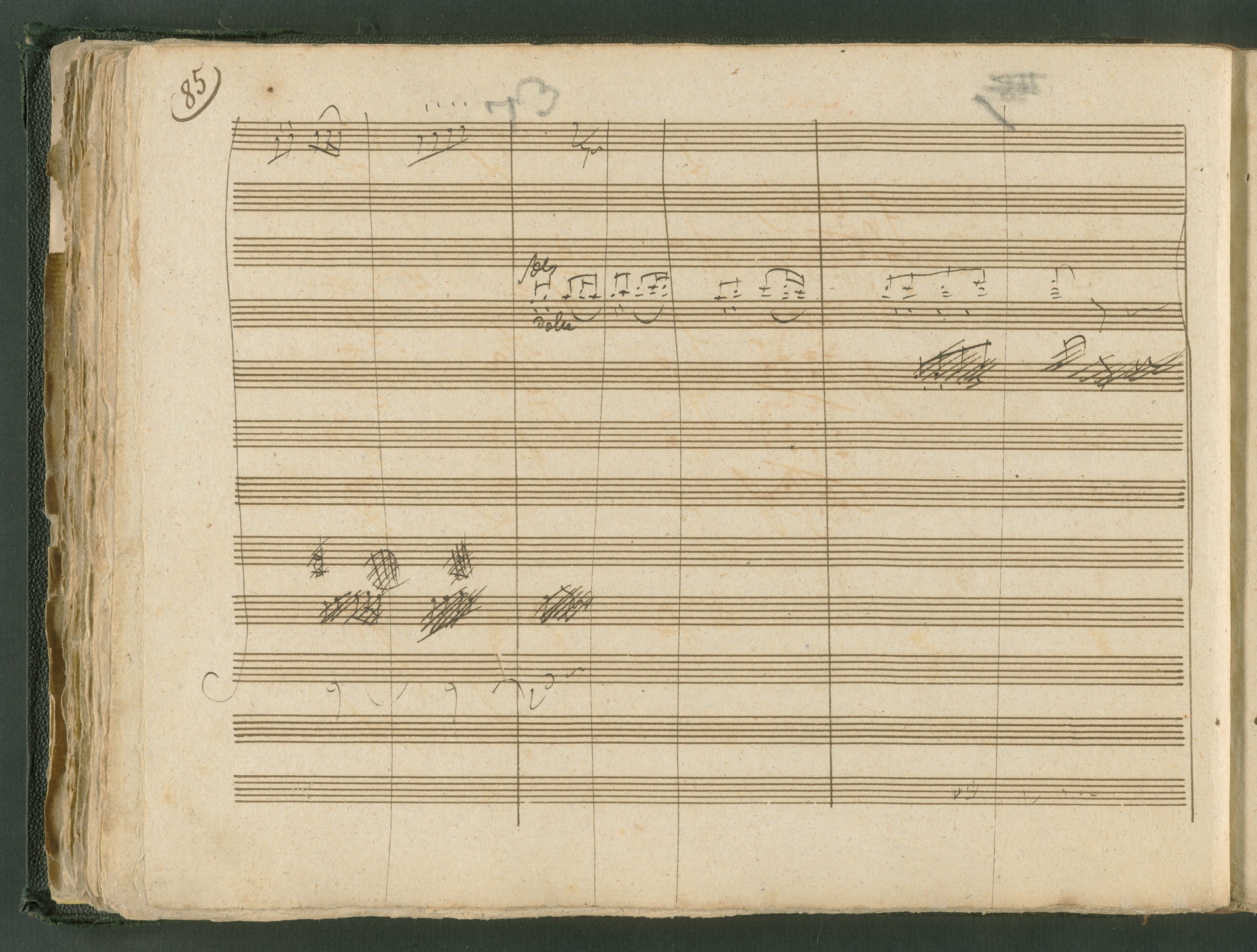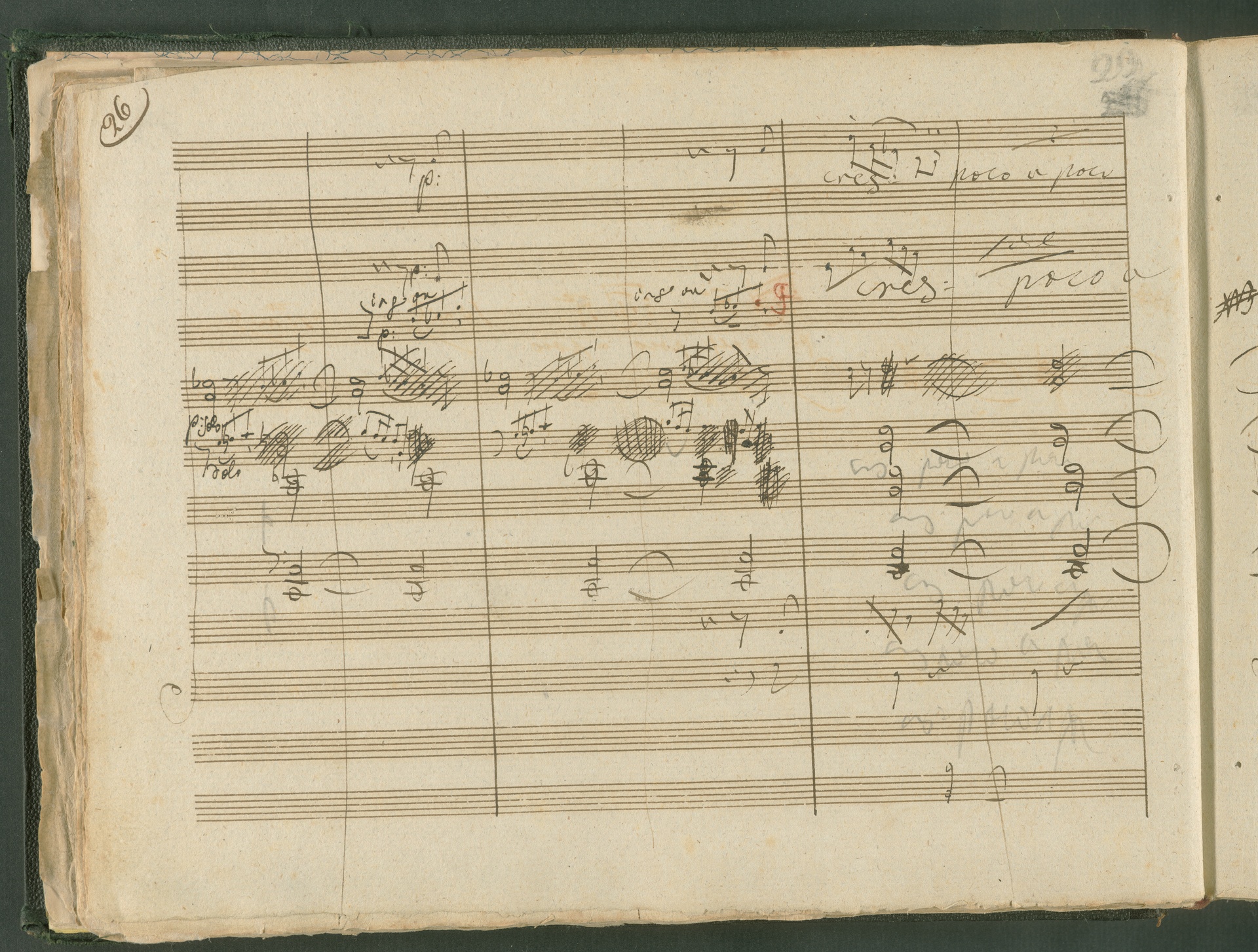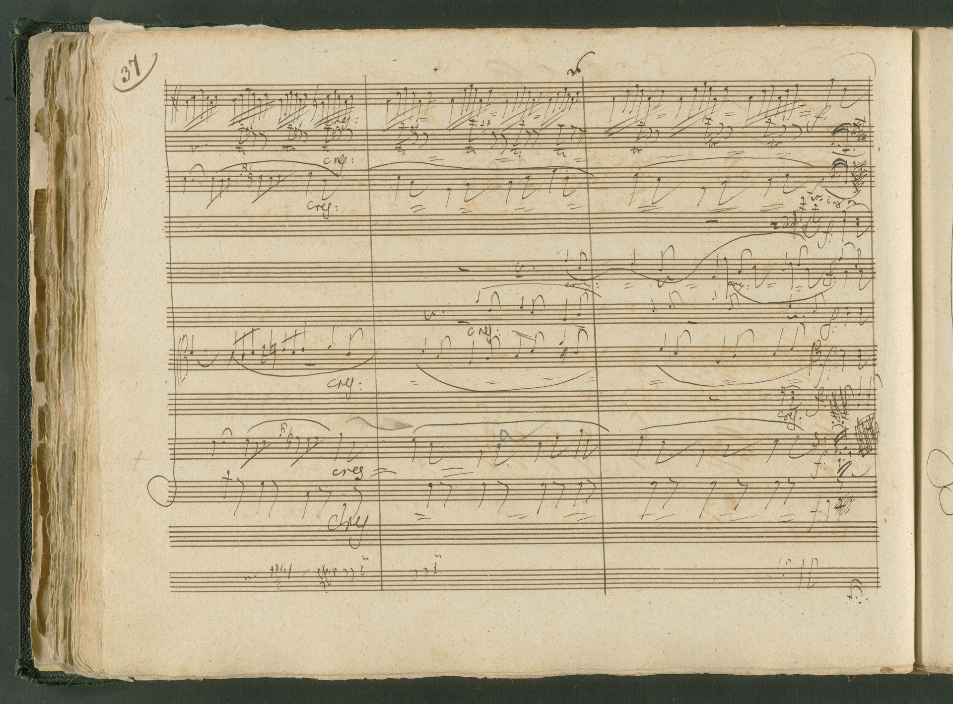 Manchmal änderte Beethoven auch während der Arbeit die Seitenaufteilung, so dass er Takte oder Taktgruppen streichen musste, so z.B. auf Bl. 32. Der erste Takt auf der Rückseite, Bl. 32v, war vornotiert, passte dann aber bei der Ausarbeitung als letzter Takt schon auf die Vorderseite, Bl. 32r - er konnte also verso gestrichen werden. Auch nahm Beethoven Änderungen in der Struktur des Werkes vor, kürzte Abschnitte oder verlängerte sie oder änderte ganze Phrasen. Auf vielen Seiten tragen die unteren freien Systeme flüchtige Skizzen zu Takten, die sich weiter oben auf der Seite in der Partitur wieder finden. Beethoven notierte sich hier keine neuen melodischen Ideen oder Entwürfe, sondern probierte meist Instrumentationen kritischer Stellen. Diese Notierungen gehören einem relativ frühen Stadium der Komposition an.