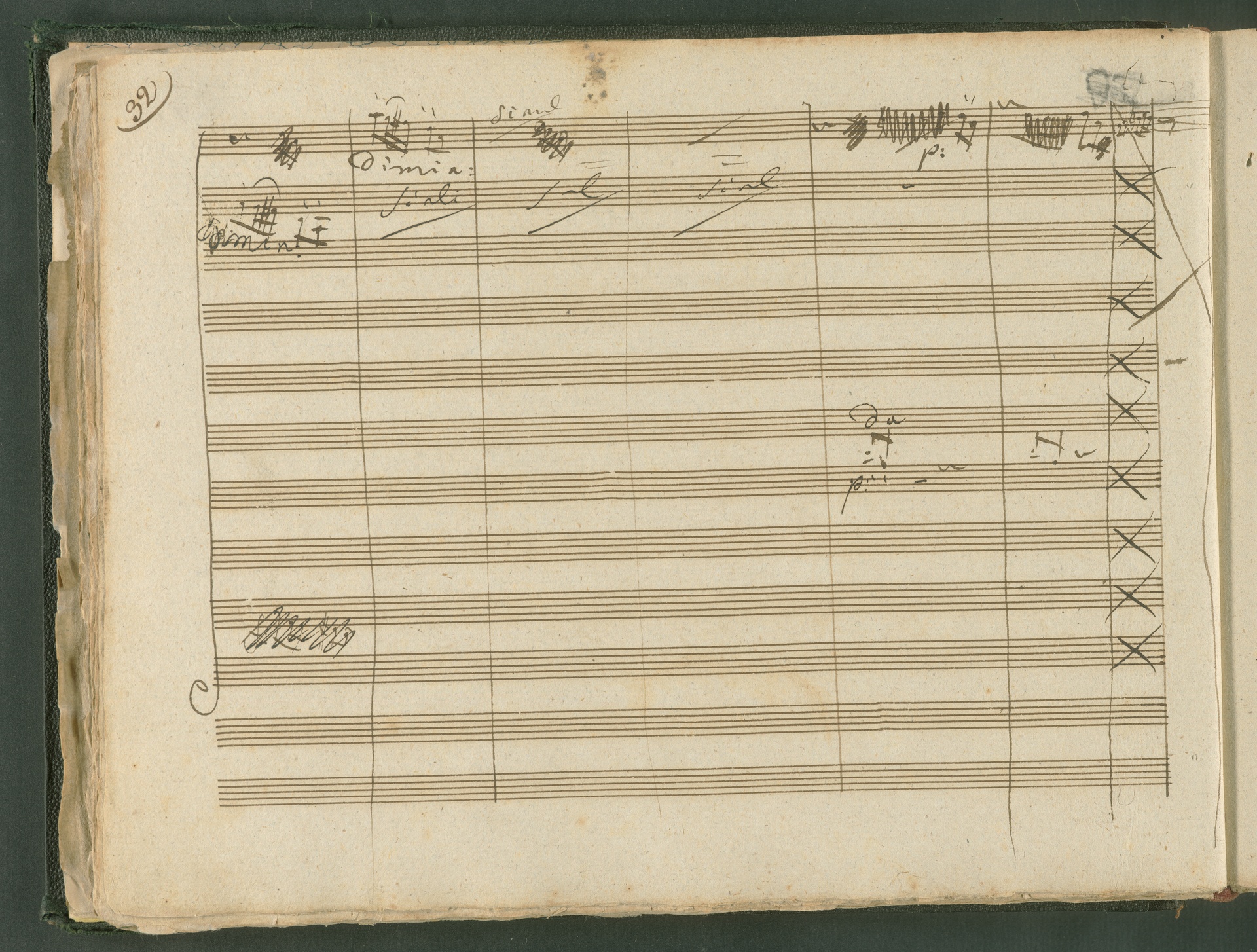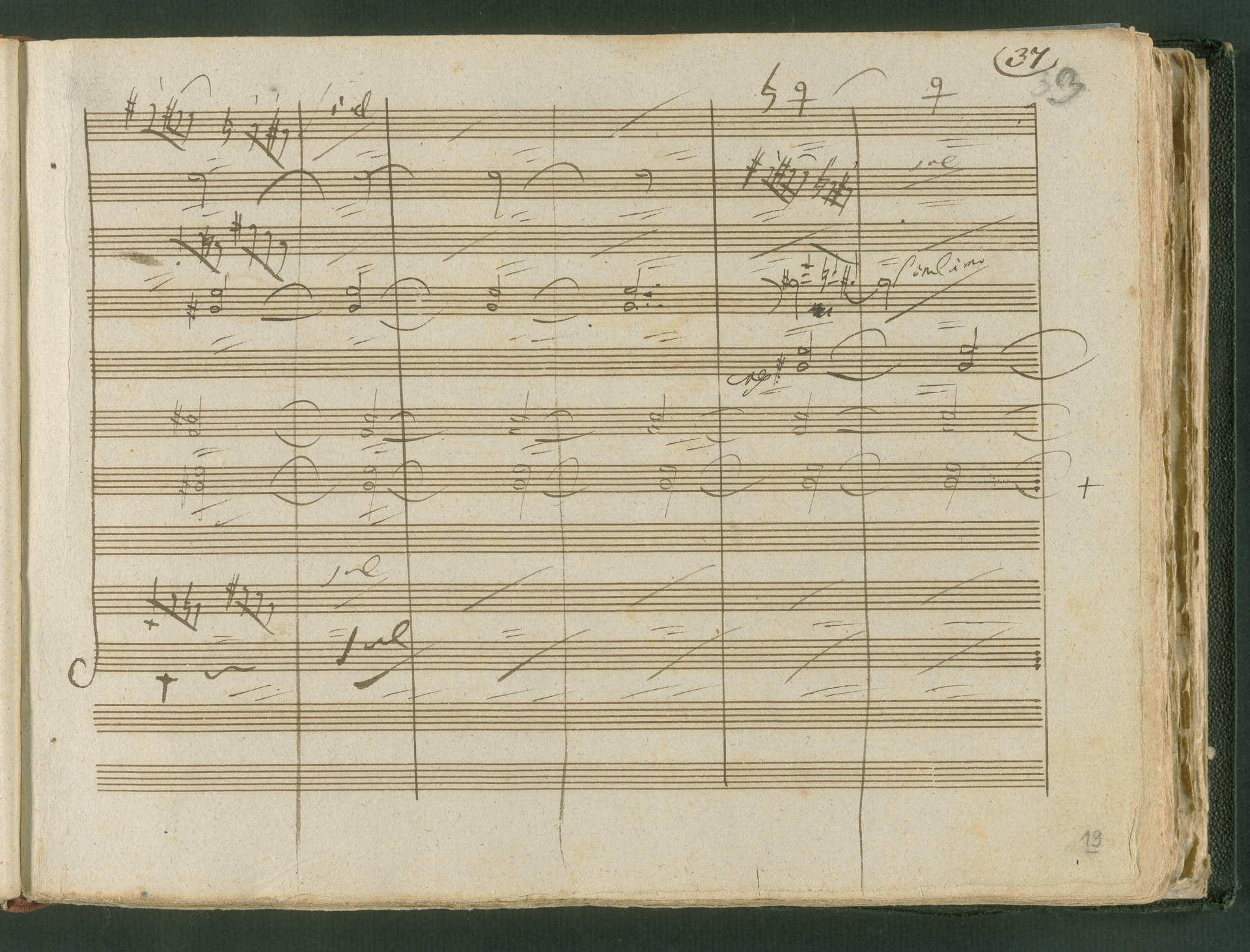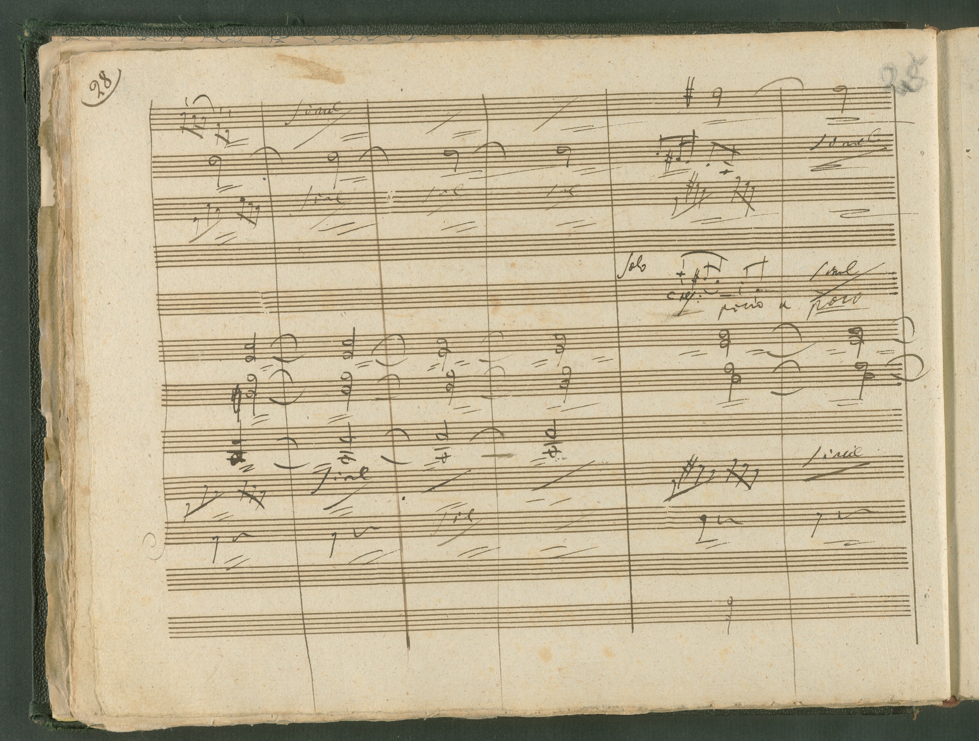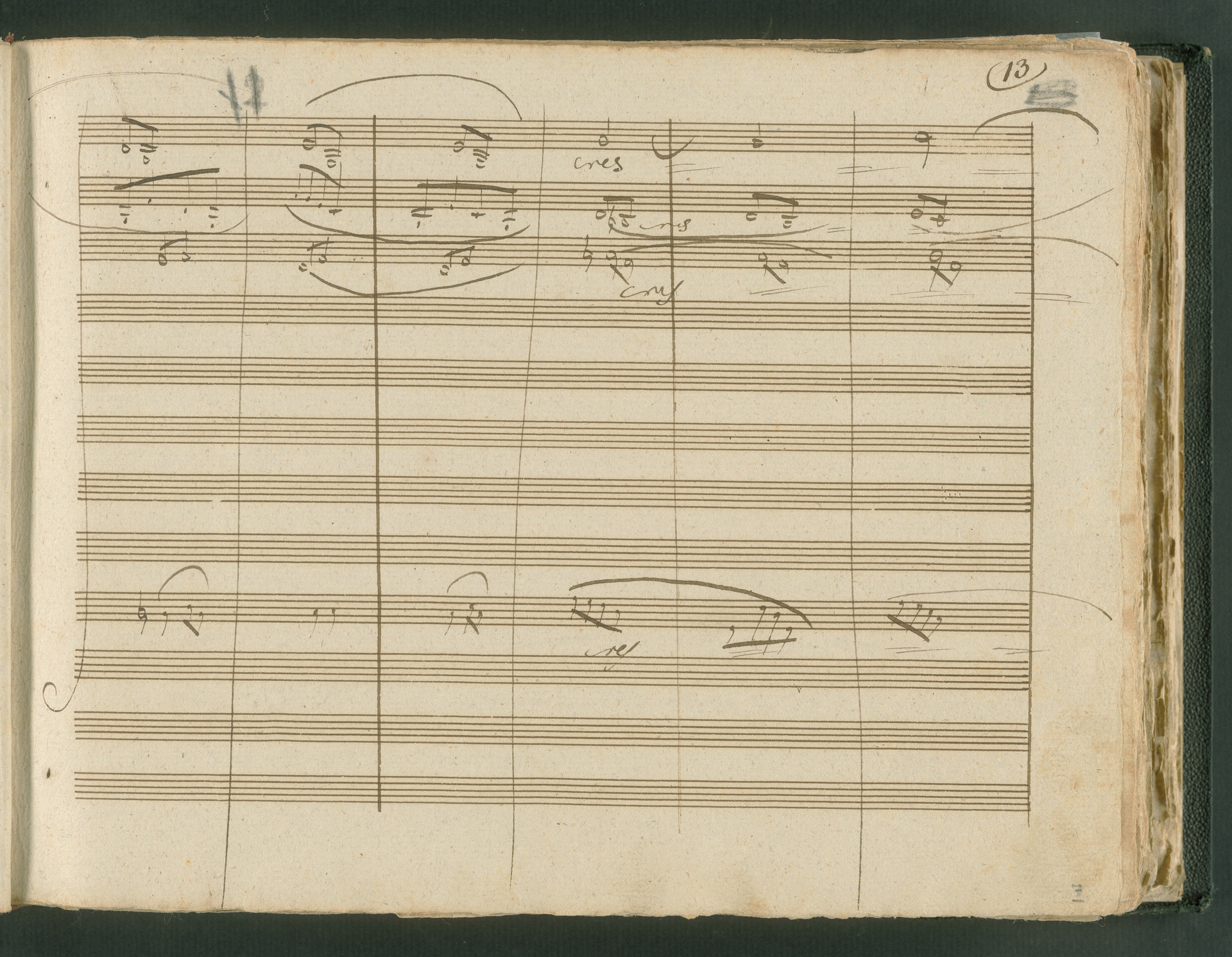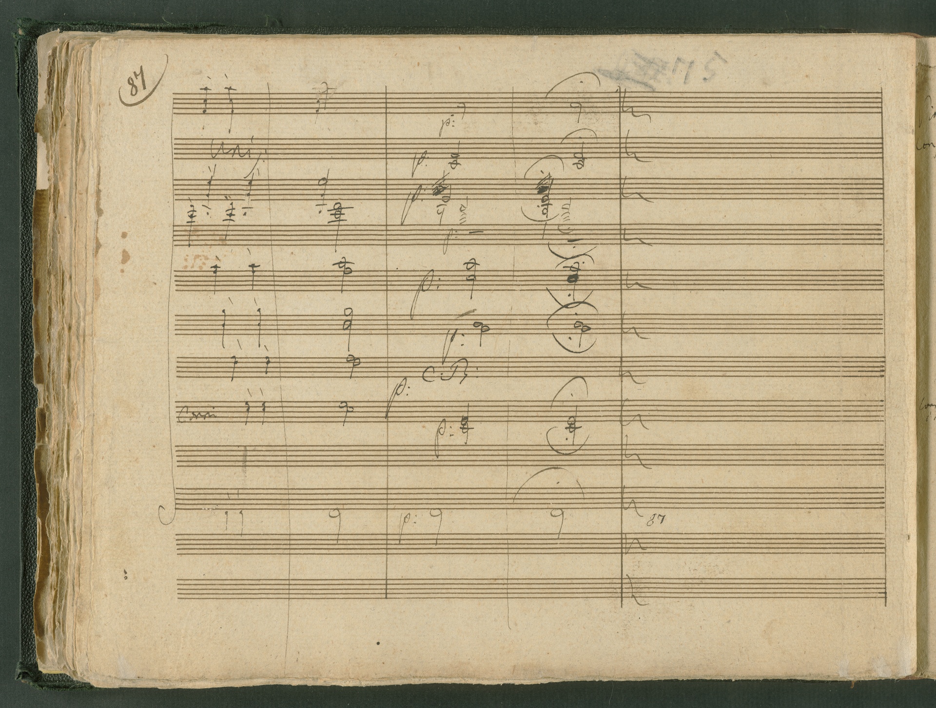 Manchmal änderte Beethoven auch während der Arbeit die Seitenaufteilung, so dass er Takte oder Taktgruppen streichen musste, so z.B. auf Bl. 32. Der erste Takt auf der Rückseite, Bl. 32v, war vornotiert, passte dann aber bei der Ausarbeitung als letzter Takt schon auf die Vorderseite, Bl. 32r - er konnte also verso gestrichen werden. Auch nahm Beethoven Änderungen in der Struktur des Werkes vor, kürzte Abschnitte oder verlängerte sie oder änderte ganze Phrasen. Auf vielen Seiten tragen die unteren freien Systeme flüchtige Skizzen zu Takten, die sich weiter oben auf der Seite in der Partitur wieder finden. Beethoven notierte sich hier keine neuen melodischen Ideen oder Entwürfe, sondern probierte meist Instrumentationen kritischer Stellen. Diese Notierungen gehören einem relativ frühen Stadium der Komposition an.