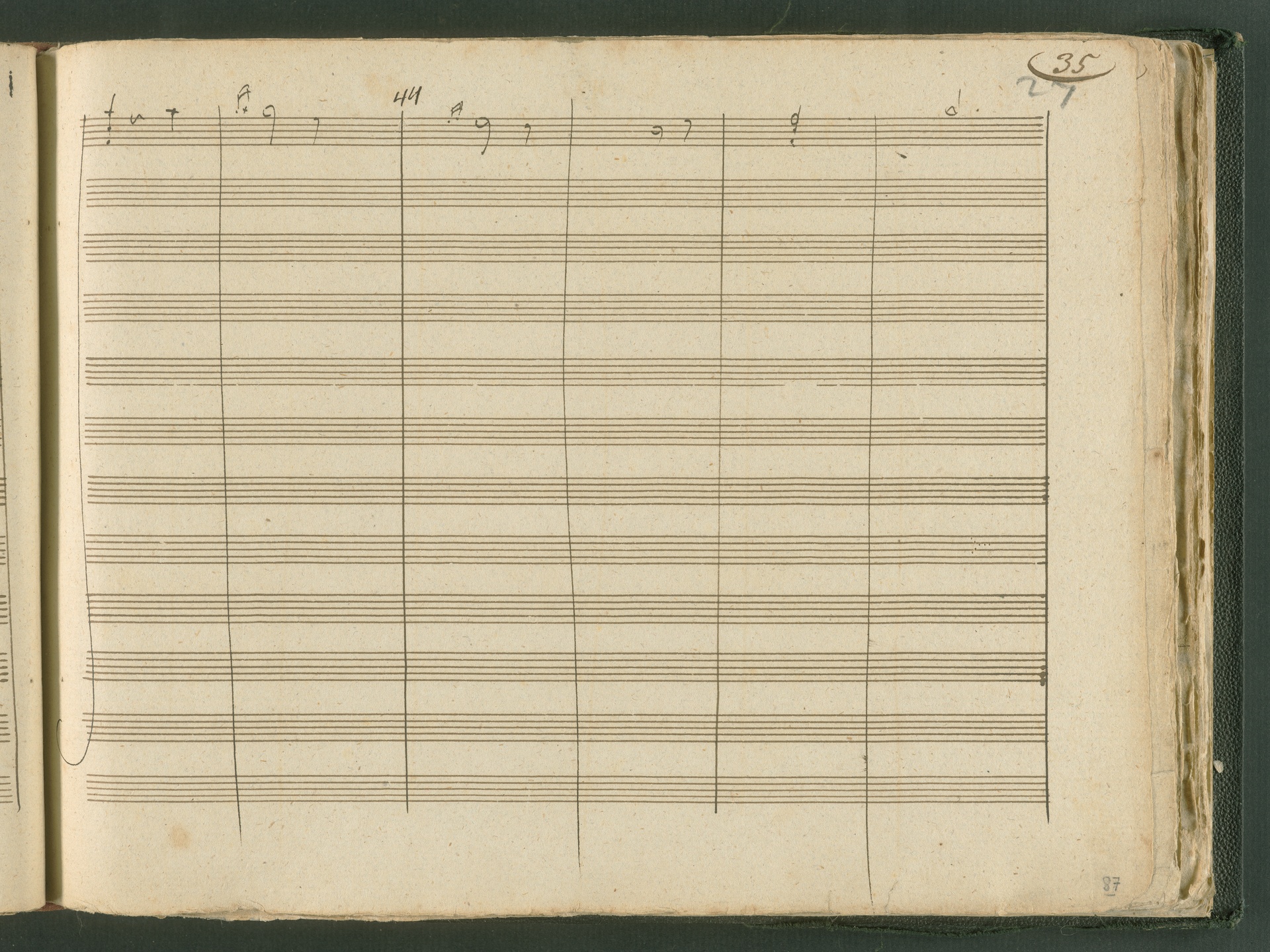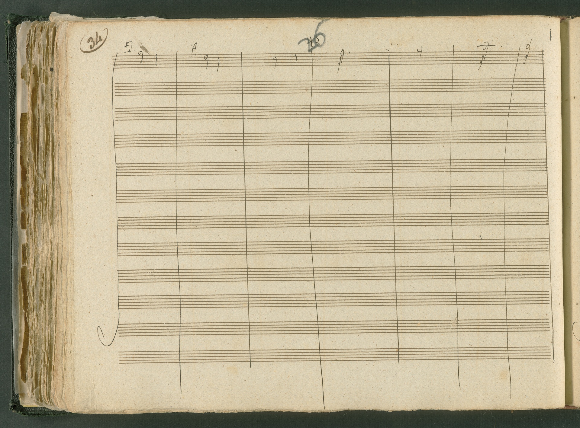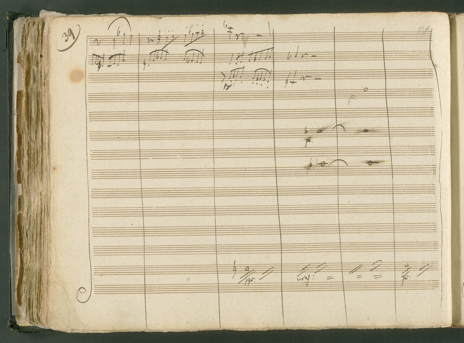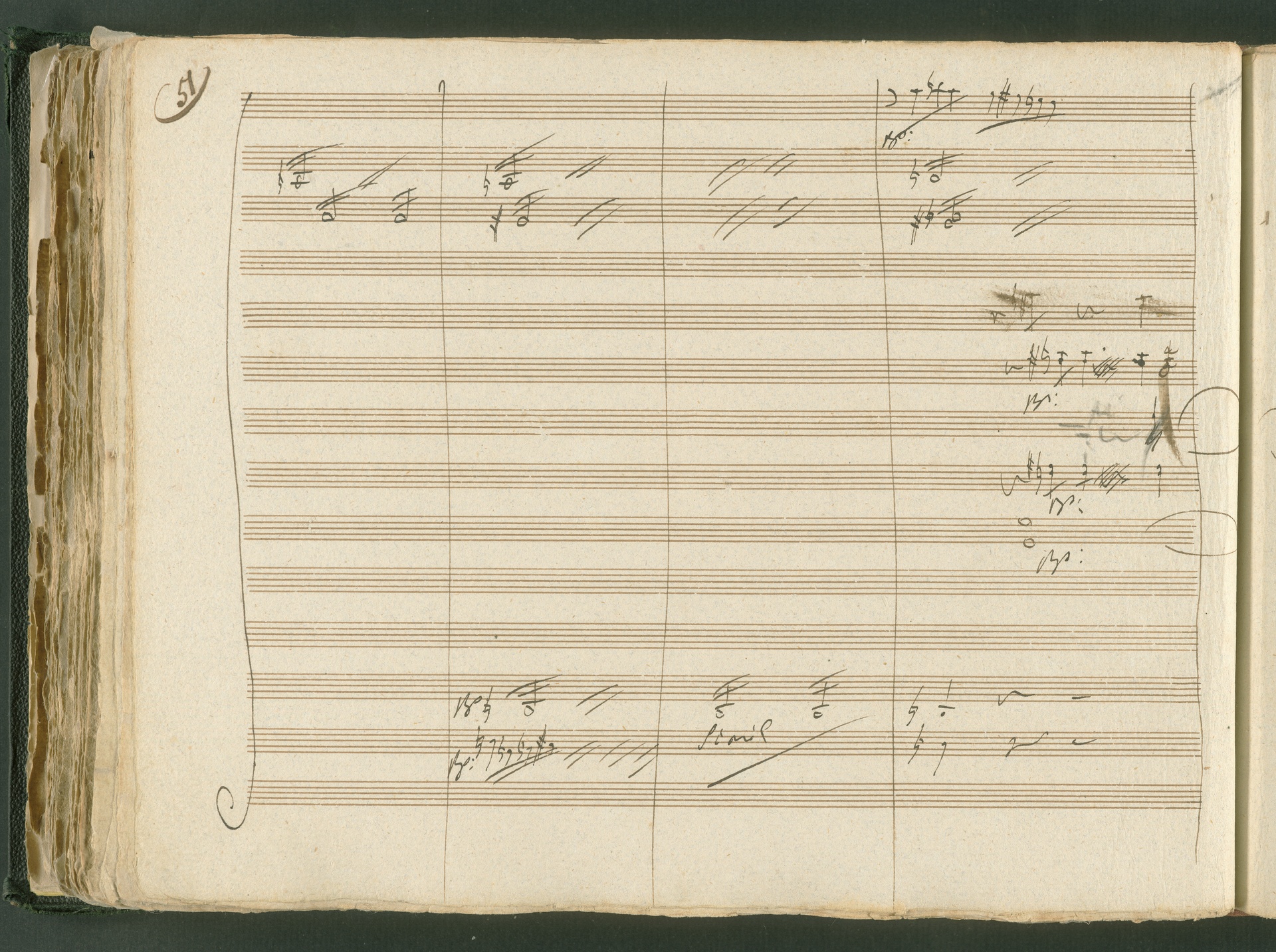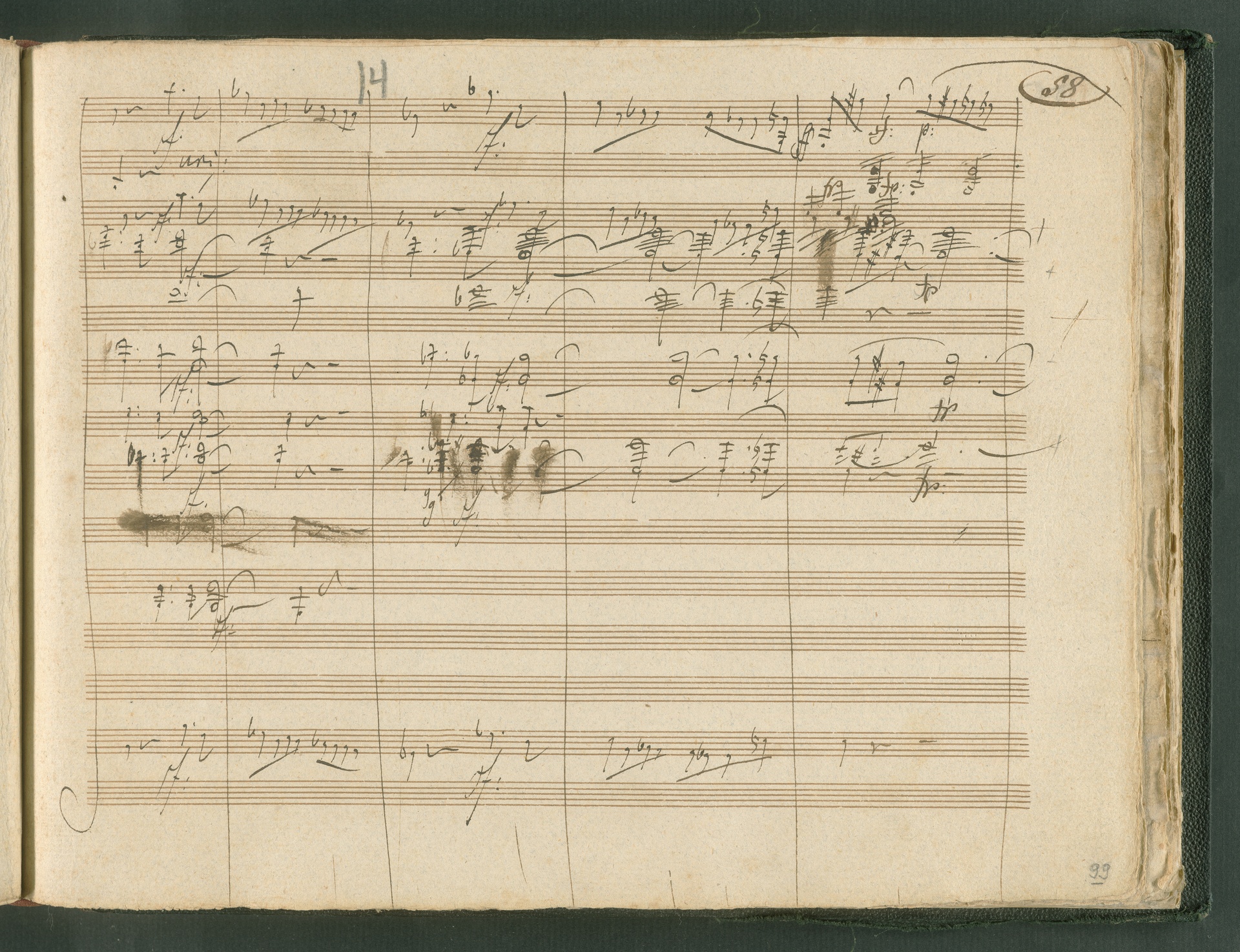 Manchmal änderte Beethoven auch während der Arbeit die Seitenaufteilung, so dass er Takte oder Taktgruppen streichen musste, so z.B. auf Bl. 32. Der erste Takt auf der Rückseite, Bl. 32v, war vornotiert, passte dann aber bei der Ausarbeitung als letzter Takt schon auf die Vorderseite, Bl. 32r - er konnte also verso gestrichen werden. Auch nahm Beethoven Änderungen in der Struktur des Werkes vor, kürzte Abschnitte oder verlängerte sie oder änderte ganze Phrasen. Auf vielen Seiten tragen die unteren freien Systeme flüchtige Skizzen zu Takten, die sich weiter oben auf der Seite in der Partitur wieder finden. Beethoven notierte sich hier keine neuen melodischen Ideen oder Entwürfe, sondern probierte meist Instrumentationen kritischer Stellen. Diese Notierungen gehören einem relativ frühen Stadium der Komposition an.