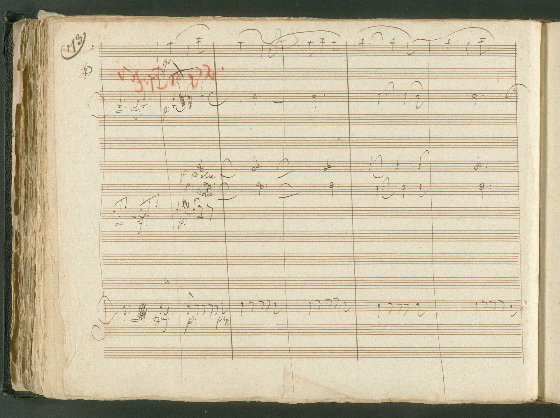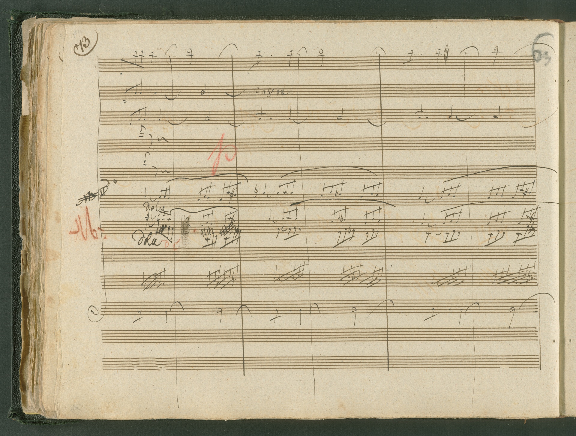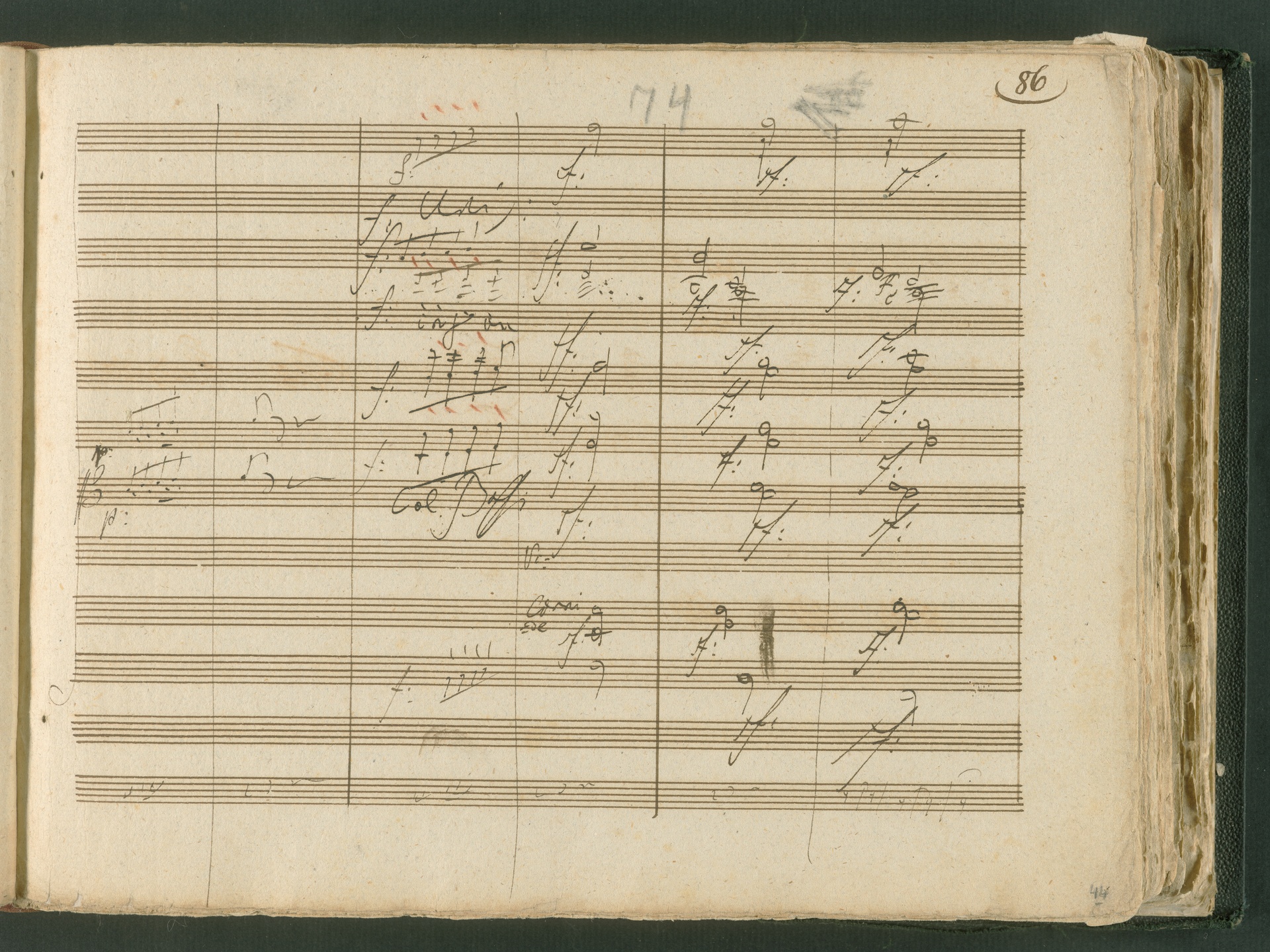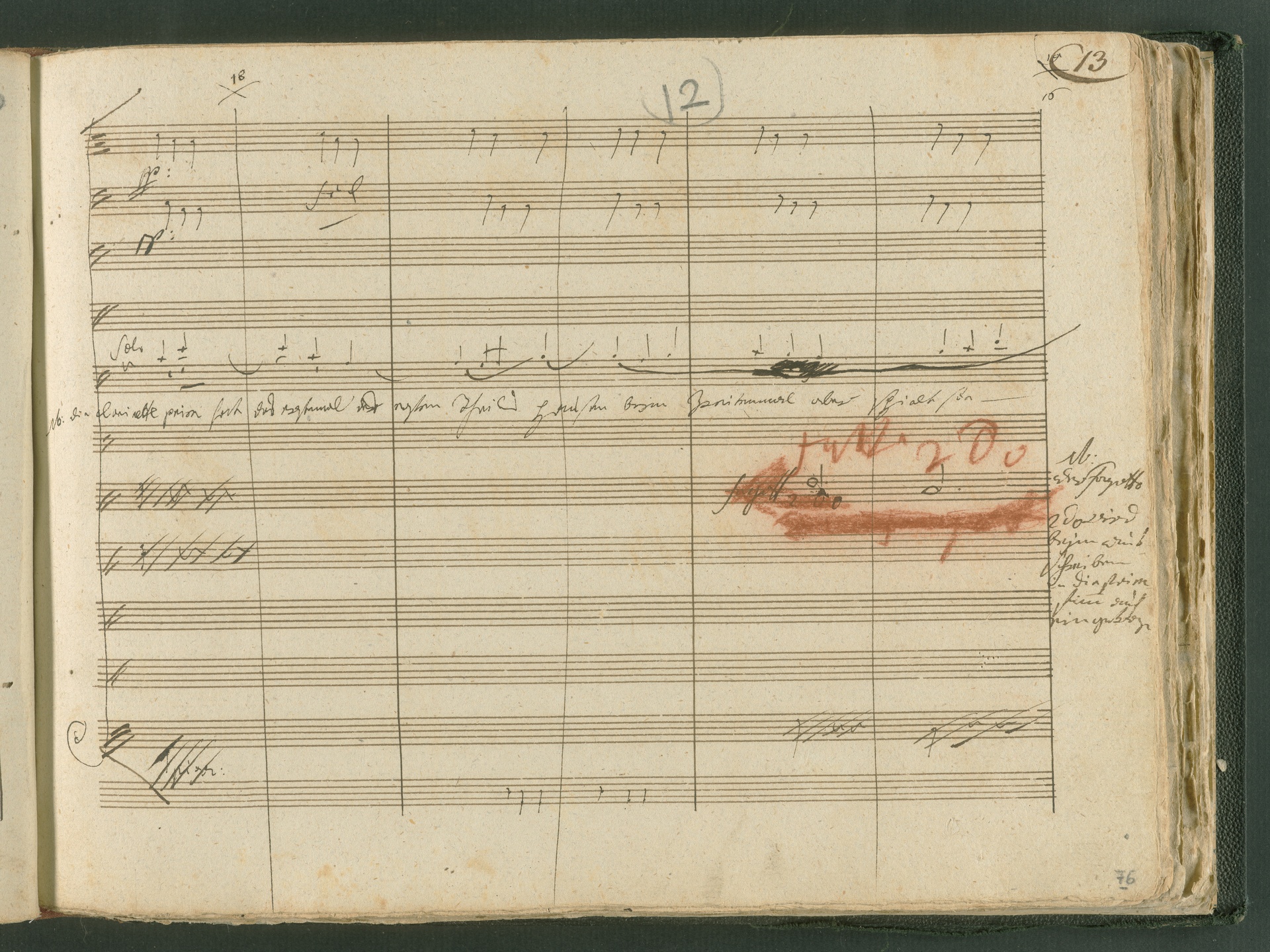 Nach der Niederschrift der Füllstimmen hatte der Komponist nun eine zunächst fertige, vorläufig vollständige Partitur vor sich. In einem weiteren Schritt sah er sich das ganze Werk noch einmal durch und überarbeitete es an vielen Stellen vollständig. Dabei konnte es auch vorkommen, dass er vorherige Änderungen wieder zurücknahm. In so einem Fall wurde eine gestrichene Stelle mit "bleibt" gekennzeichnet, z.B. auf Bl. 69r (Bild 139). Schließlich sah sich ein zuverlässiger Berufskopist, Joseph Klumpar, der etliche Male für Beethoven arbeitete, die Partitur durch, um daraus die Abschrift der Orchesterstimmen vorzubereiten. Bei dieser Durchsicht las Klumpar das Autograph auch Korrektur und machte Anmerkungen zu unklaren Stellen im Text oder zu Versäumnissen, auf die er Beethoven aufmerksam machte und die dieser dann korrigierte. An solchen Stellen notiert Klumpar am Rand ein "NB", nach Korrektur wurde der Vermerk durchgestrichen. So hatte Beethoven z.B. auf Bl. 52r Noten vergessen. Der Kopist hatte dies bemerkt, daraufhin trug Beethoven mit seinem roten Korrekturstift (Rötel) die entsprechende Stelle nach und Klumpar strich seinen Vermerk am linken Rand wieder durch - erledigt. Vermutlich schrieb Beethoven den vierten Satz etwas später als die übrigen Sätze noch einmal aus. Es finden sich darin keine Instrumentierungsskizzen, eine andere Tinte, eine andere Heftung und er war auch nicht zuvor in drei Großtakte geordnet worden. (J.R.)