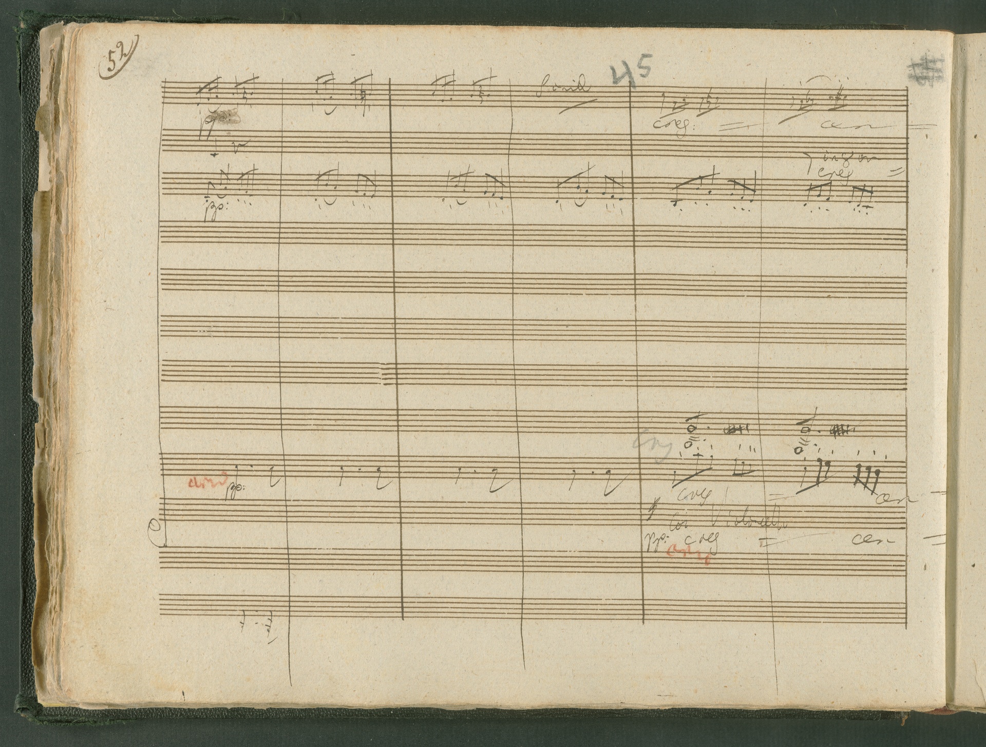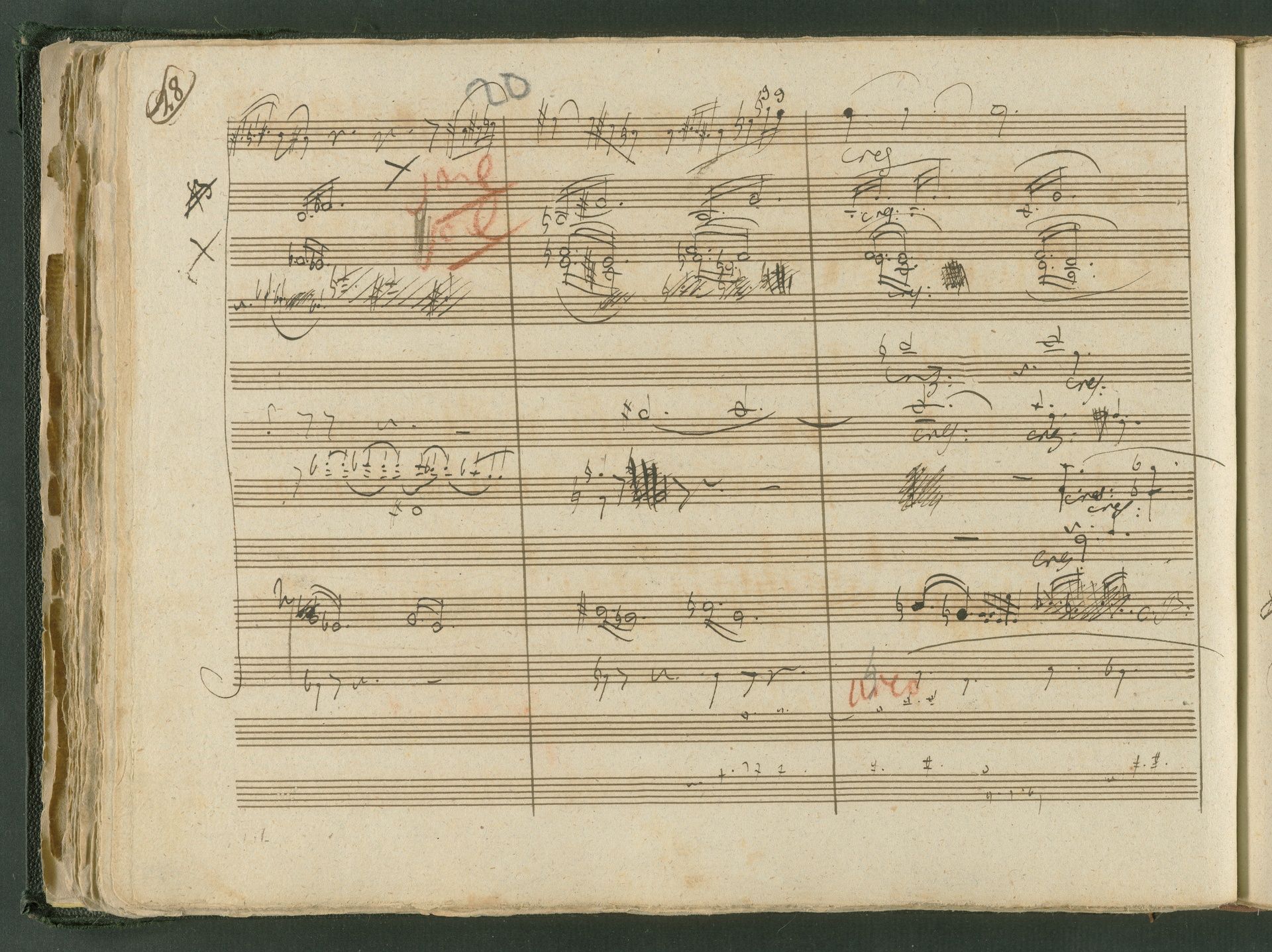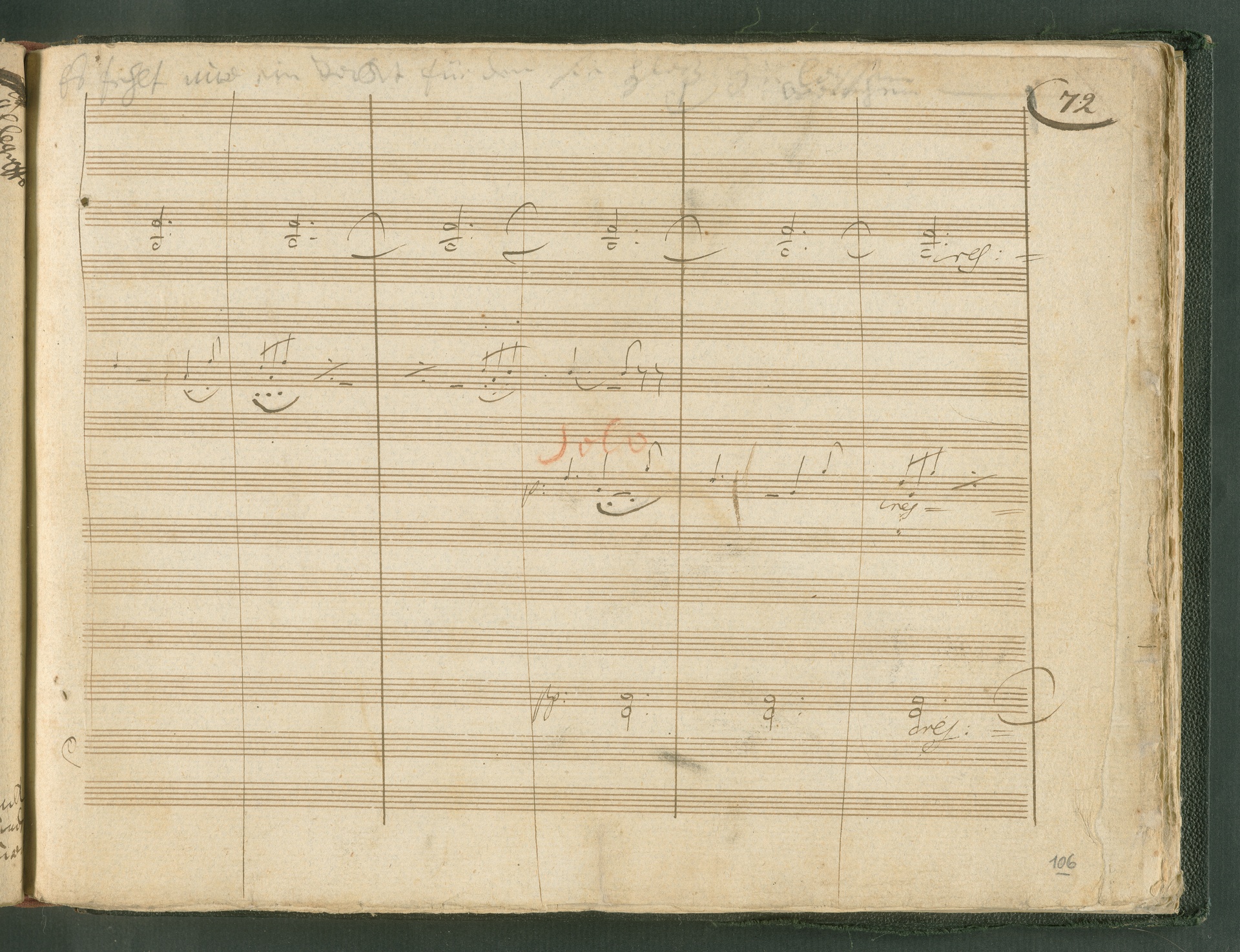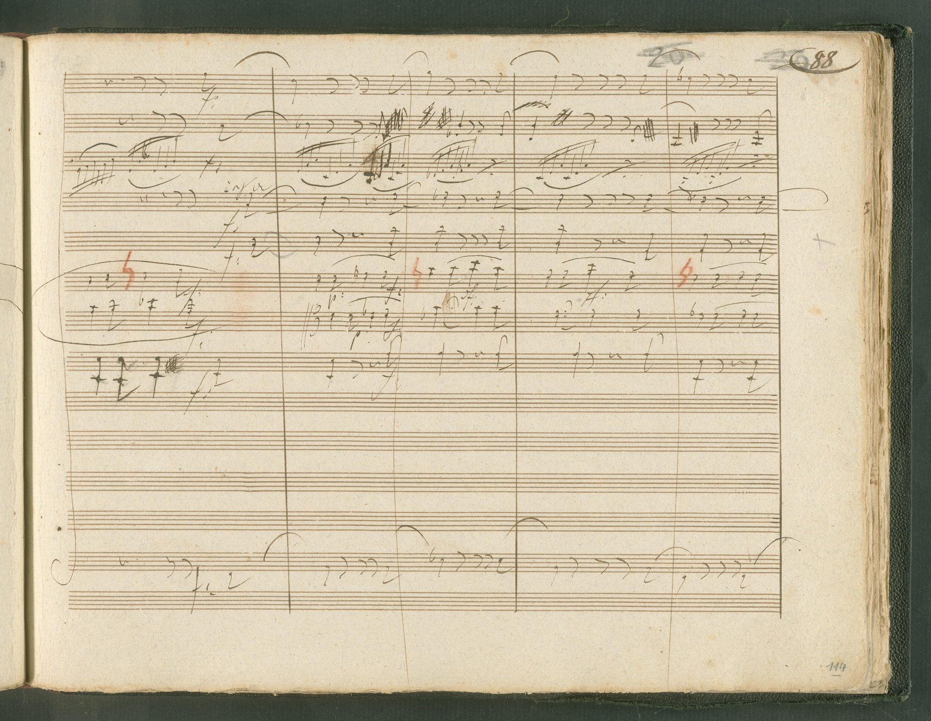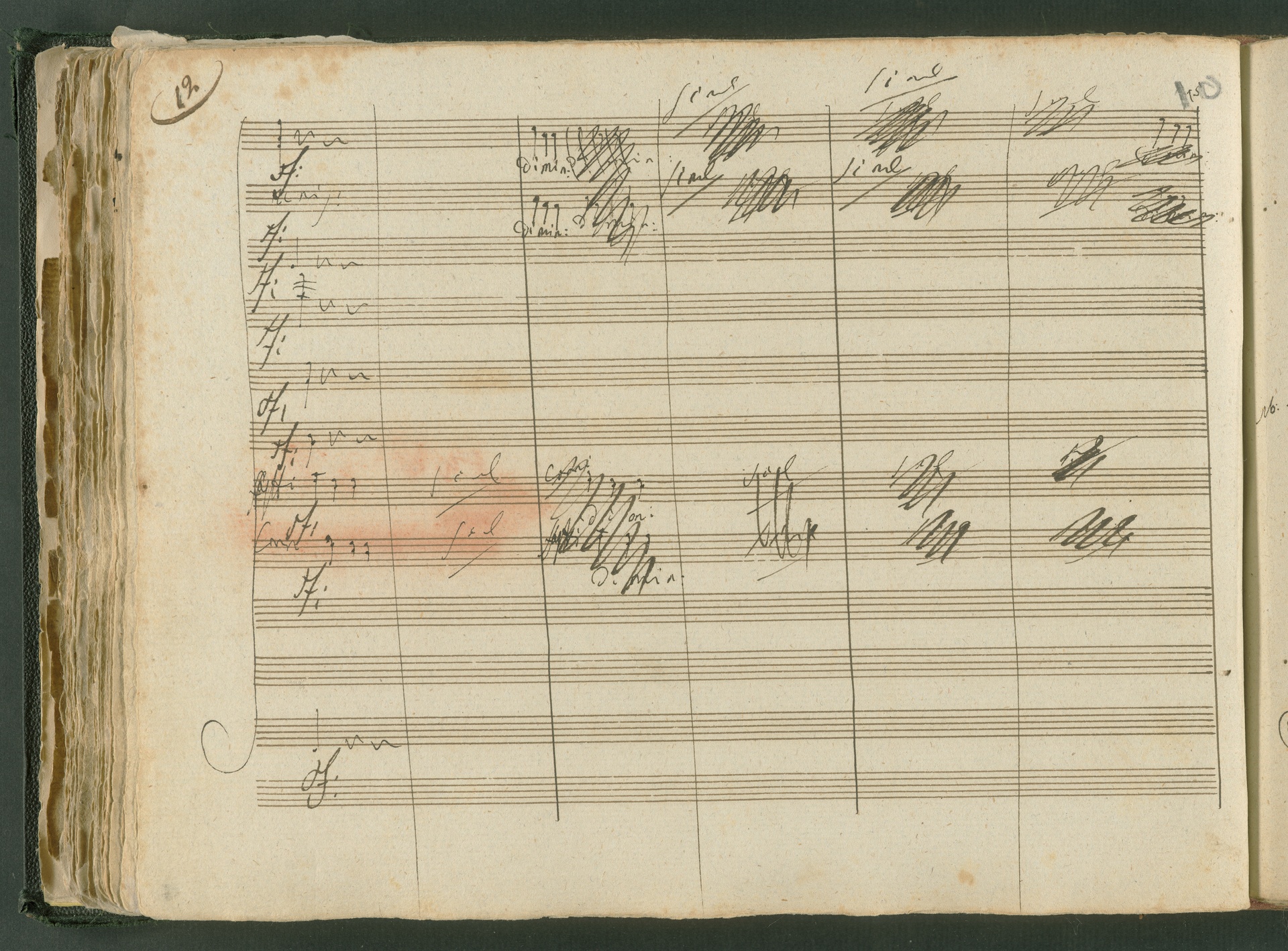 Nach der Niederschrift der Füllstimmen hatte der Komponist nun eine zunächst fertige, vorläufig vollständige Partitur vor sich. In einem weiteren Schritt sah er sich das ganze Werk noch einmal durch und überarbeitete es an vielen Stellen vollständig. Dabei konnte es auch vorkommen, dass er vorherige Änderungen wieder zurücknahm. In so einem Fall wurde eine gestrichene Stelle mit "bleibt" gekennzeichnet, z.B. auf Bl. 69r (Bild 139). Schließlich sah sich ein zuverlässiger Berufskopist, Joseph Klumpar, der etliche Male für Beethoven arbeitete, die Partitur durch, um daraus die Abschrift der Orchesterstimmen vorzubereiten. Bei dieser Durchsicht las Klumpar das Autograph auch Korrektur und machte Anmerkungen zu unklaren Stellen im Text oder zu Versäumnissen, auf die er Beethoven aufmerksam machte und die dieser dann korrigierte. An solchen Stellen notiert Klumpar am Rand ein "NB", nach Korrektur wurde der Vermerk durchgestrichen. So hatte Beethoven z.B. auf Bl. 52r Noten vergessen. Der Kopist hatte dies bemerkt, daraufhin trug Beethoven mit seinem roten Korrekturstift (Rötel) die entsprechende Stelle nach und Klumpar strich seinen Vermerk am linken Rand wieder durch - erledigt. Vermutlich schrieb Beethoven den vierten Satz etwas später als die übrigen Sätze noch einmal aus. Es finden sich darin keine Instrumentierungsskizzen, eine andere Tinte, eine andere Heftung und er war auch nicht zuvor in drei Großtakte geordnet worden. (J.R.)