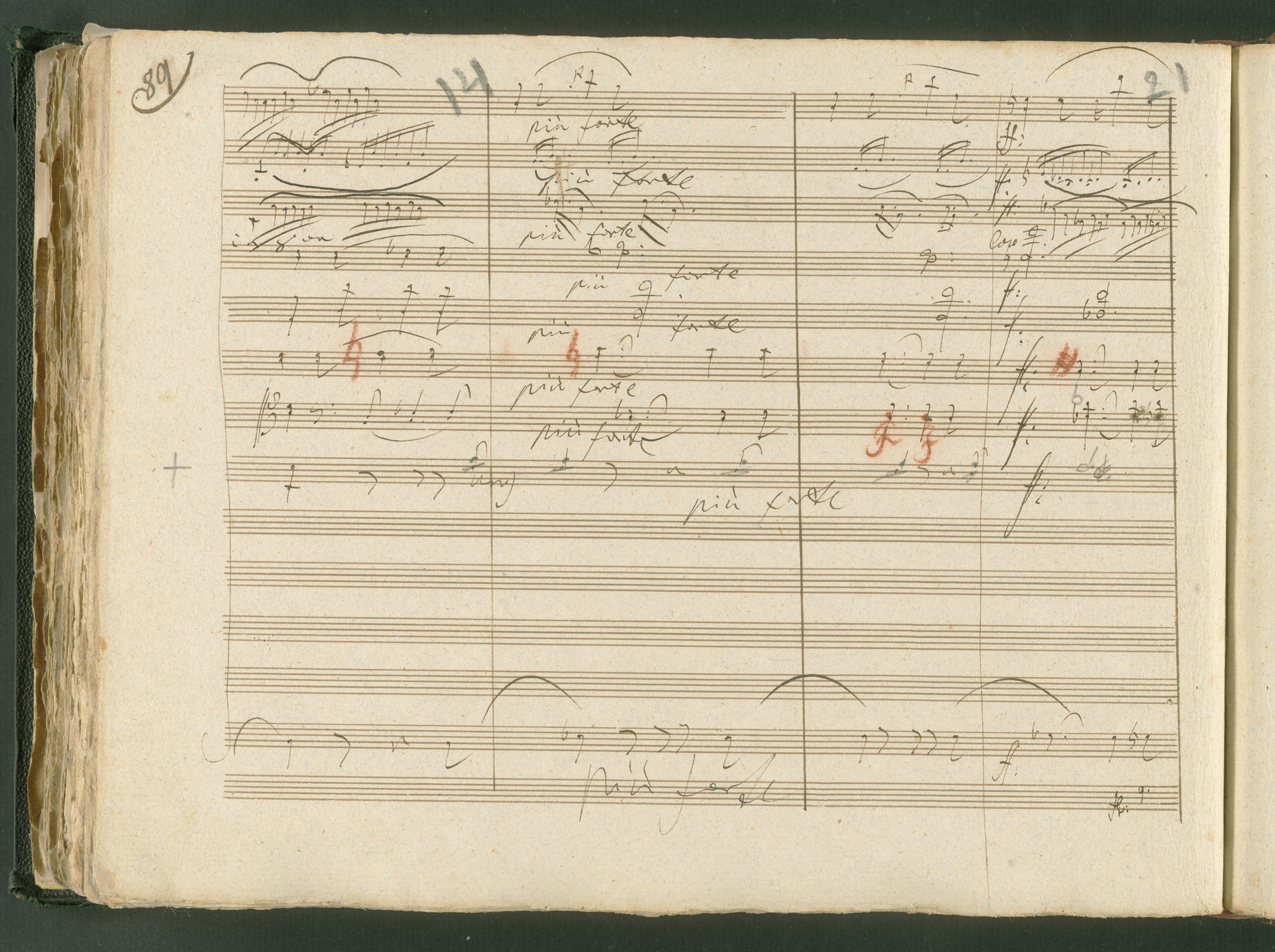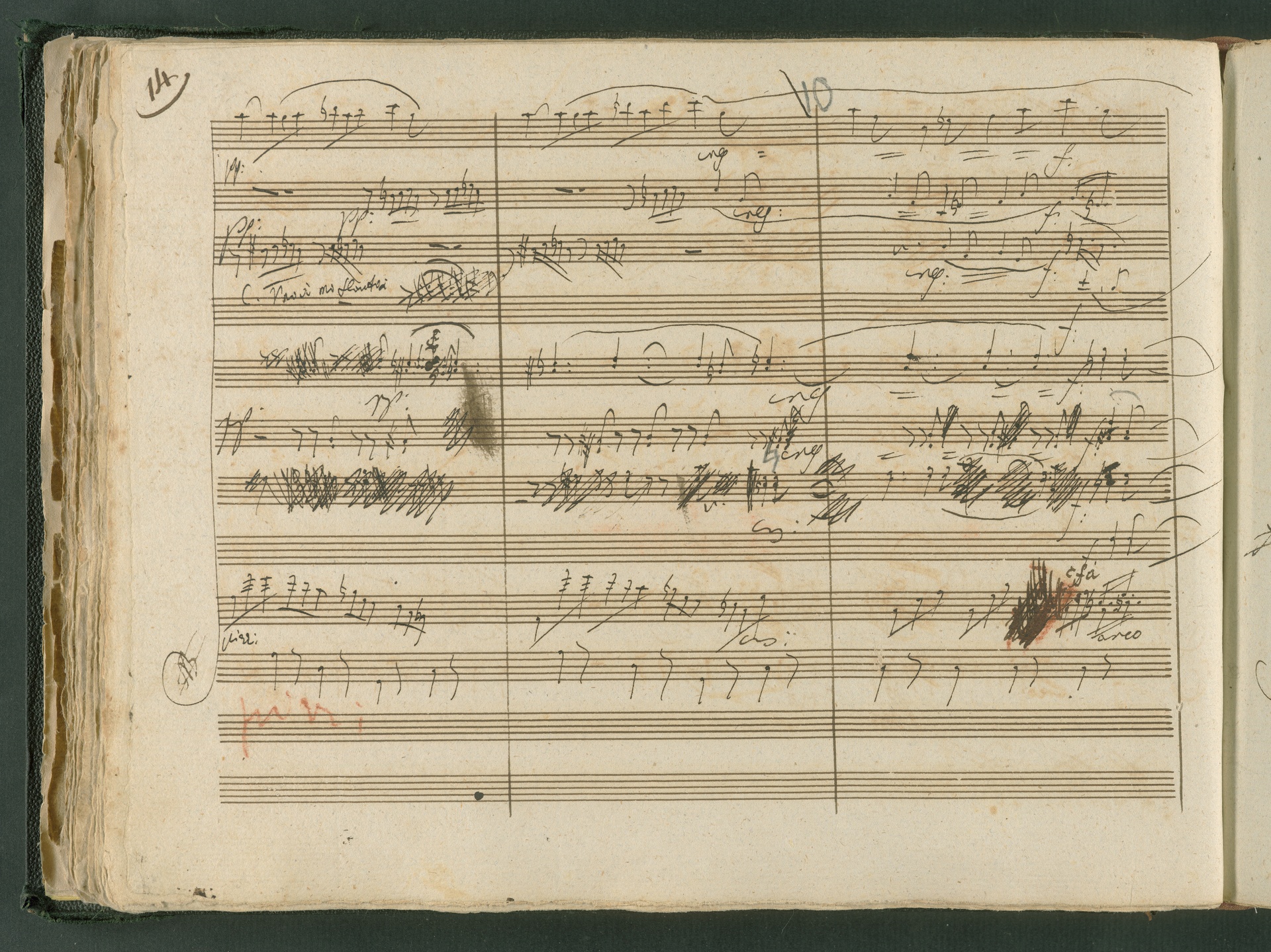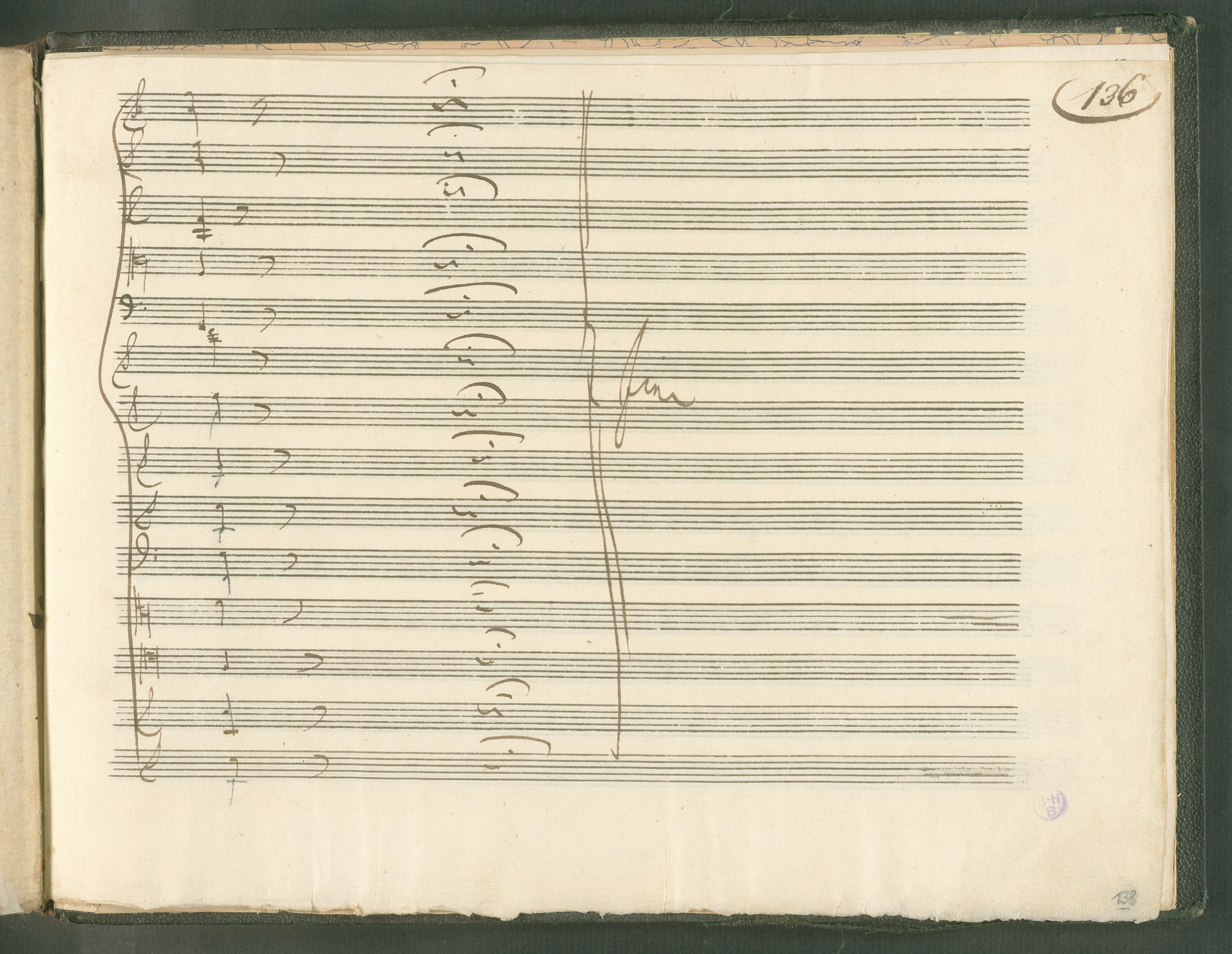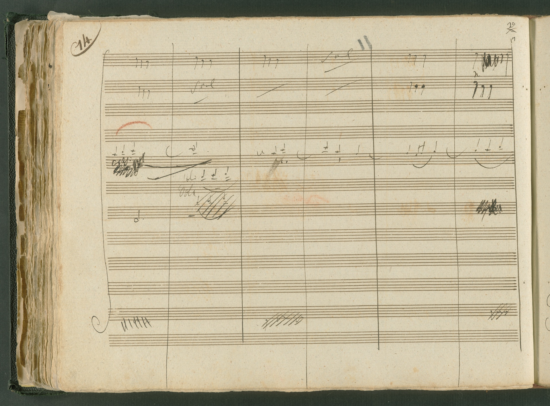 Nach der Niederschrift der Füllstimmen hatte der Komponist nun eine zunächst fertige, vorläufig vollständige Partitur vor sich. In einem weiteren Schritt sah er sich das ganze Werk noch einmal durch und überarbeitete es an vielen Stellen vollständig. Dabei konnte es auch vorkommen, dass er vorherige Änderungen wieder zurücknahm. In so einem Fall wurde eine gestrichene Stelle mit "bleibt" gekennzeichnet, z.B. auf Bl. 69r (Bild 139). Schließlich sah sich ein zuverlässiger Berufskopist, Joseph Klumpar, der etliche Male für Beethoven arbeitete, die Partitur durch, um daraus die Abschrift der Orchesterstimmen vorzubereiten. Bei dieser Durchsicht las Klumpar das Autograph auch Korrektur und machte Anmerkungen zu unklaren Stellen im Text oder zu Versäumnissen, auf die er Beethoven aufmerksam machte und die dieser dann korrigierte. An solchen Stellen notiert Klumpar am Rand ein "NB", nach Korrektur wurde der Vermerk durchgestrichen. So hatte Beethoven z.B. auf Bl. 52r Noten vergessen. Der Kopist hatte dies bemerkt, daraufhin trug Beethoven mit seinem roten Korrekturstift (Rötel) die entsprechende Stelle nach und Klumpar strich seinen Vermerk am linken Rand wieder durch - erledigt. Vermutlich schrieb Beethoven den vierten Satz etwas später als die übrigen Sätze noch einmal aus. Es finden sich darin keine Instrumentierungsskizzen, eine andere Tinte, eine andere Heftung und er war auch nicht zuvor in drei Großtakte geordnet worden. (J.R.)