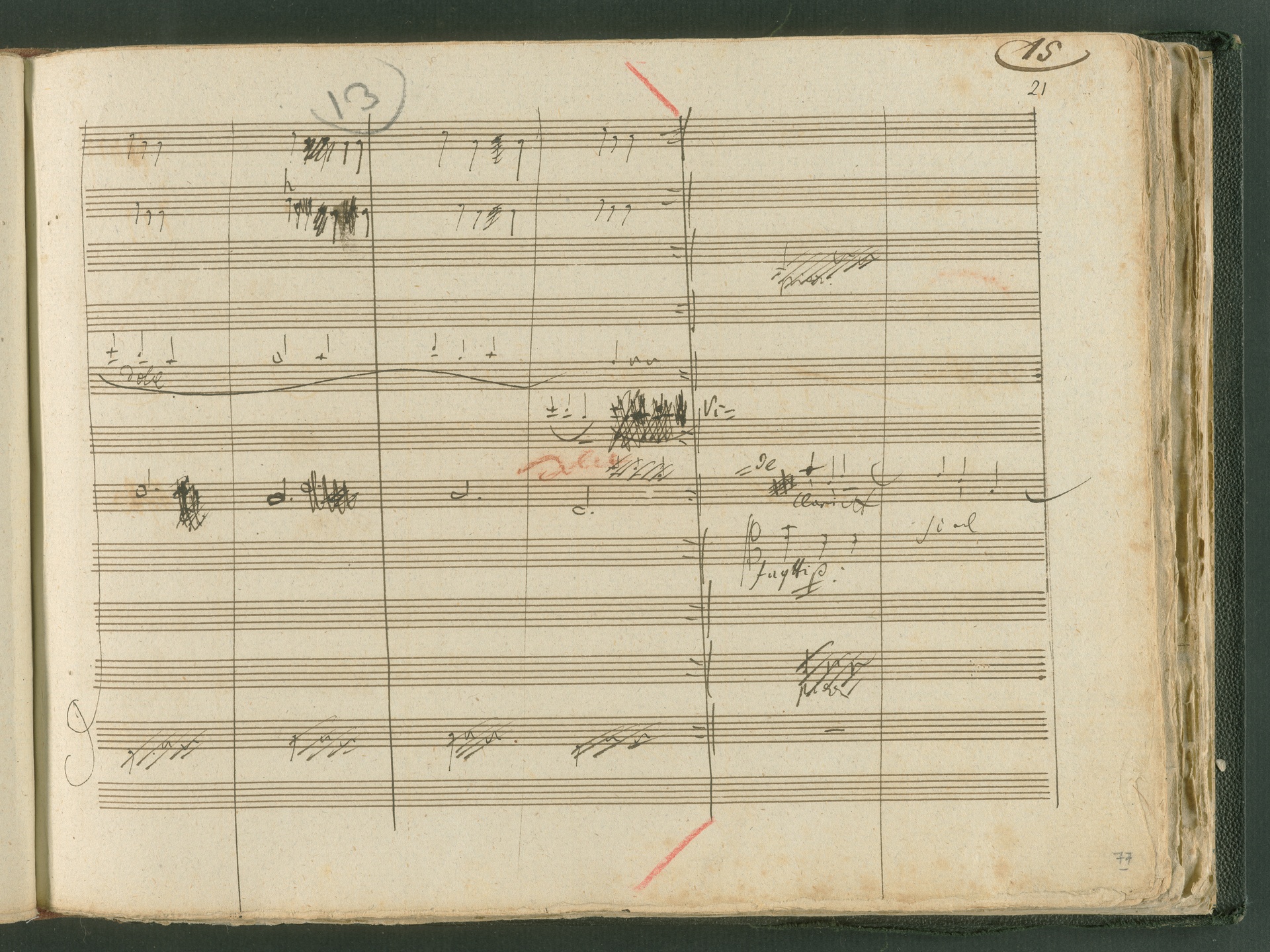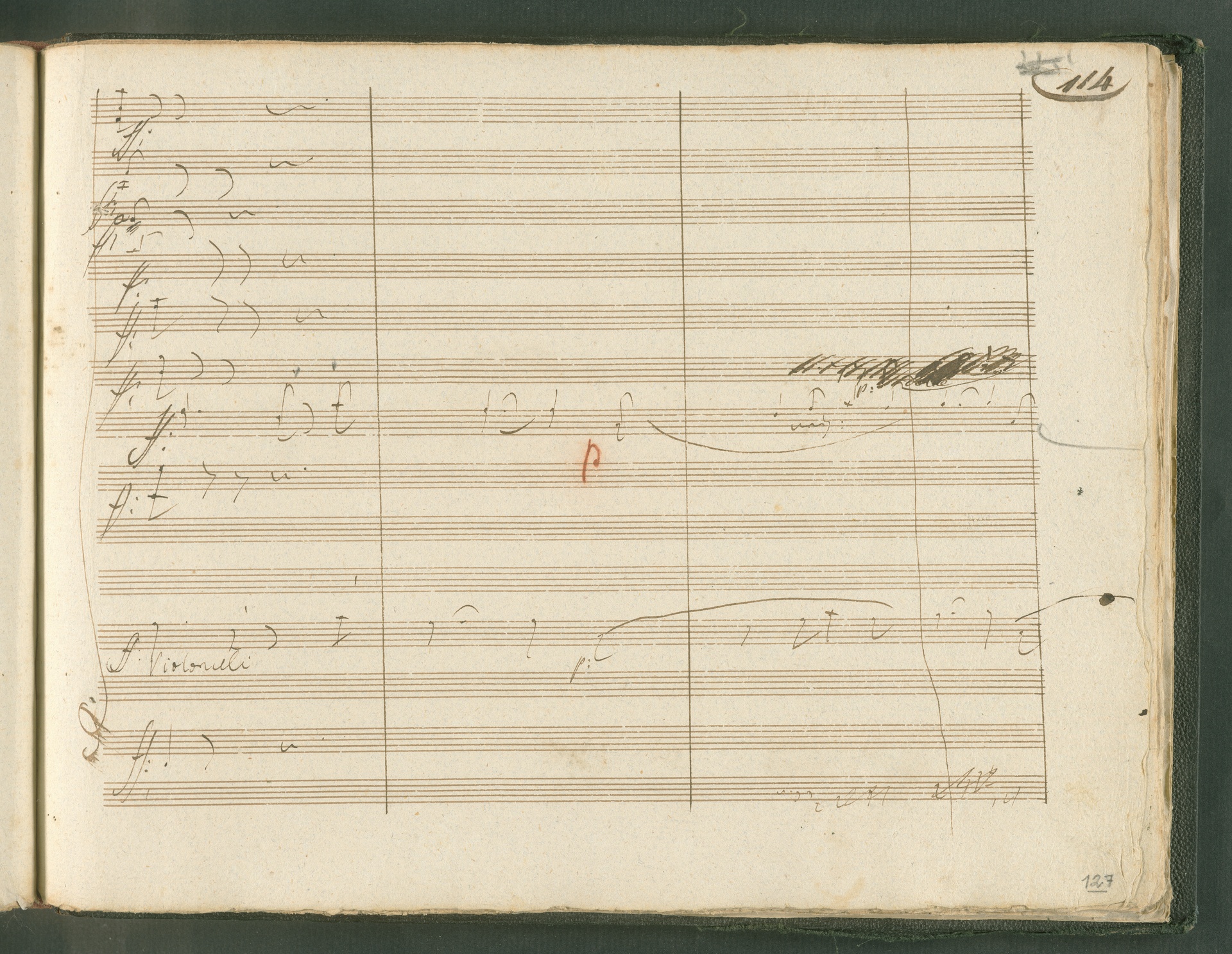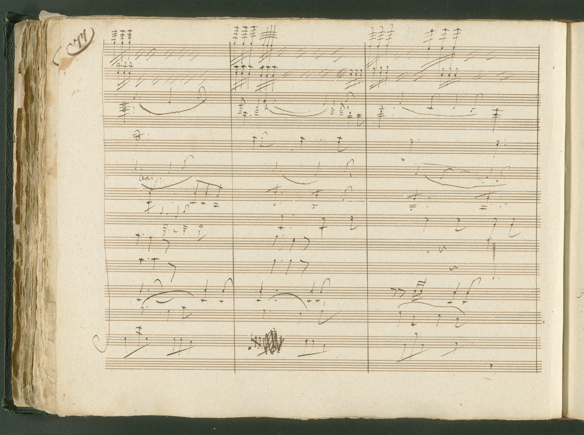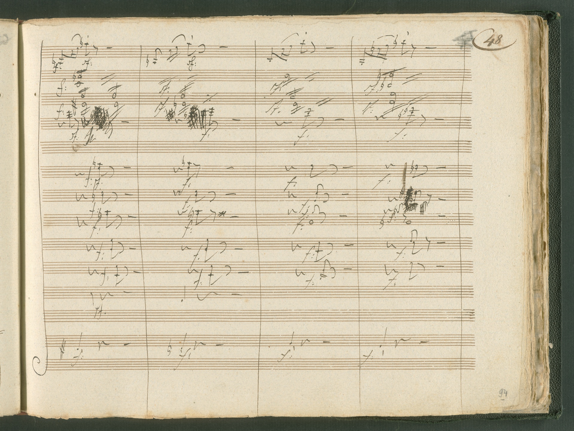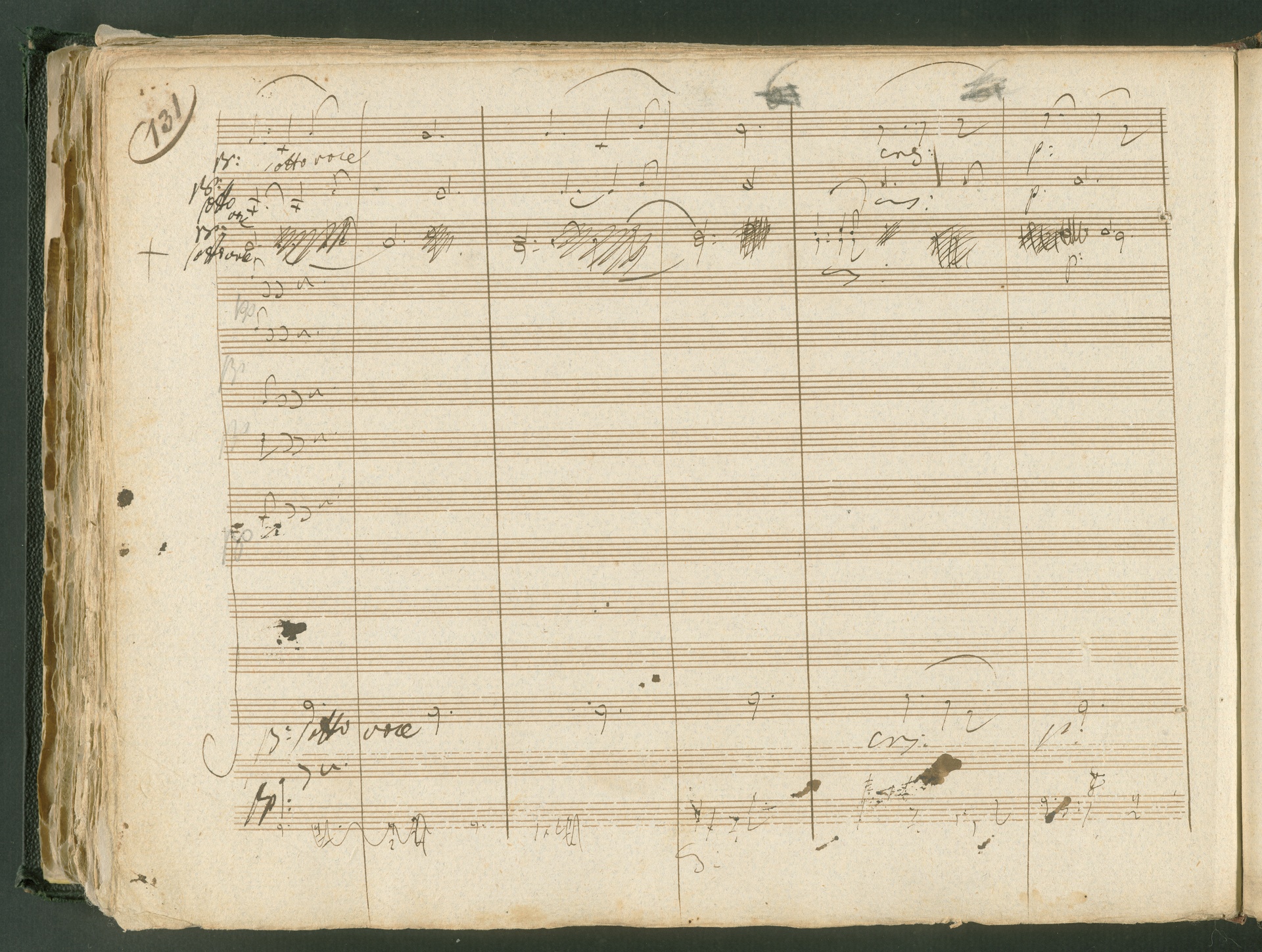Nach der Niederschrift der Füllstimmen hatte der Komponist nun eine zunächst fertige, vorläufig vollständige Partitur vor sich. In einem weiteren Schritt sah er sich das ganze Werk noch einmal durch und überarbeitete es an vielen Stellen vollständig. Dabei konnte es auch vorkommen, dass er vorherige Änderungen wieder zurücknahm. In so einem Fall wurde eine gestrichene Stelle mit "bleibt" gekennzeichnet, z.B. auf Bl. 69r (Bild 139). Schließlich sah sich ein zuverlässiger Berufskopist, Joseph Klumpar, der etliche Male für Beethoven arbeitete, die Partitur durch, um daraus die Abschrift der Orchesterstimmen vorzubereiten. Bei dieser Durchsicht las Klumpar das Autograph auch Korrektur und machte Anmerkungen zu unklaren Stellen im Text oder zu Versäumnissen, auf die er Beethoven aufmerksam machte und die dieser dann korrigierte. An solchen Stellen notiert Klumpar am Rand ein "NB", nach Korrektur wurde der Vermerk durchgestrichen. So hatte Beethoven z.B. auf Bl. 52r Noten vergessen. Der Kopist hatte dies bemerkt, daraufhin trug Beethoven mit seinem roten Korrekturstift (Rötel) die entsprechende Stelle nach und Klumpar strich seinen Vermerk am linken Rand wieder durch - erledigt. Vermutlich schrieb Beethoven den vierten Satz etwas später als die übrigen Sätze noch einmal aus. Es finden sich darin keine Instrumentierungsskizzen, eine andere Tinte, eine andere Heftung und er war auch nicht zuvor in drei Großtakte geordnet worden. (J.R.)