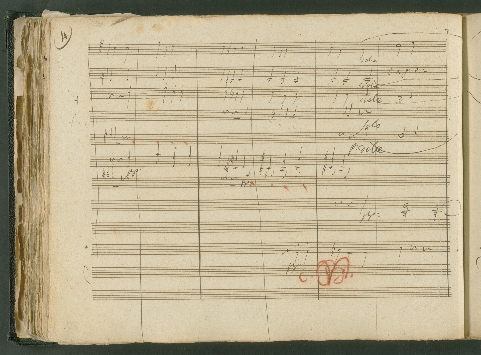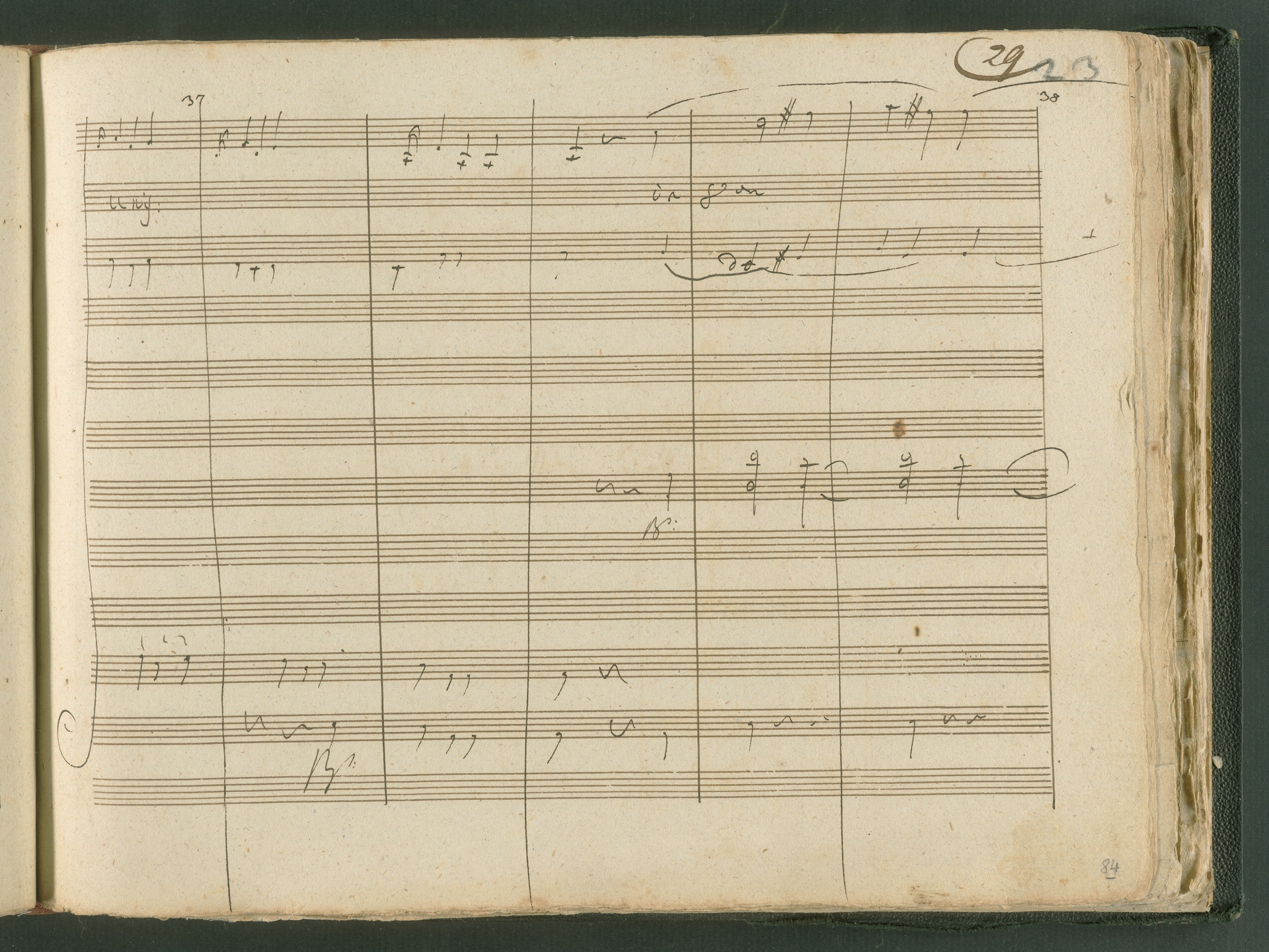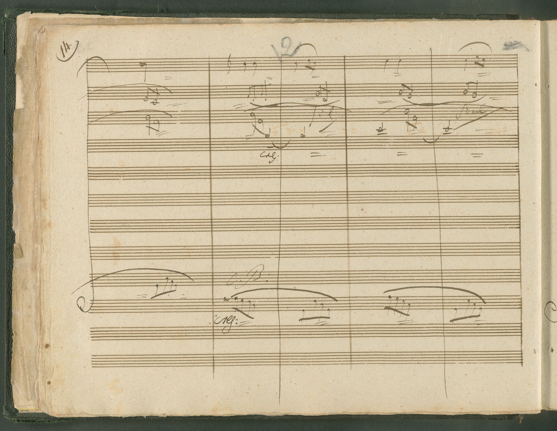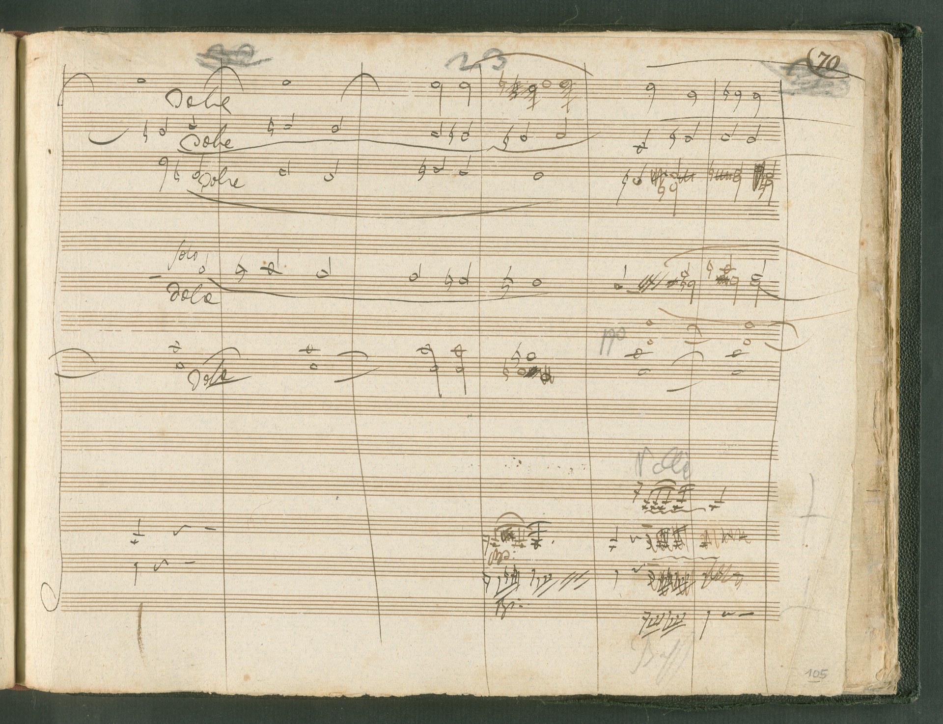 Nach der Niederschrift der Füllstimmen hatte der Komponist nun eine zunächst fertige, vorläufig vollständige Partitur vor sich. In einem weiteren Schritt sah er sich das ganze Werk noch einmal durch und überarbeitete es an vielen Stellen vollständig. Dabei konnte es auch vorkommen, dass er vorherige Änderungen wieder zurücknahm. In so einem Fall wurde eine gestrichene Stelle mit "bleibt" gekennzeichnet, z.B. auf Bl. 69r (Bild 139). Schließlich sah sich ein zuverlässiger Berufskopist, Joseph Klumpar, der etliche Male für Beethoven arbeitete, die Partitur durch, um daraus die Abschrift der Orchesterstimmen vorzubereiten. Bei dieser Durchsicht las Klumpar das Autograph auch Korrektur und machte Anmerkungen zu unklaren Stellen im Text oder zu Versäumnissen, auf die er Beethoven aufmerksam machte und die dieser dann korrigierte. An solchen Stellen notiert Klumpar am Rand ein "NB", nach Korrektur wurde der Vermerk durchgestrichen. So hatte Beethoven z.B. auf Bl. 52r Noten vergessen. Der Kopist hatte dies bemerkt, daraufhin trug Beethoven mit seinem roten Korrekturstift (Rötel) die entsprechende Stelle nach und Klumpar strich seinen Vermerk am linken Rand wieder durch - erledigt. Vermutlich schrieb Beethoven den vierten Satz etwas später als die übrigen Sätze noch einmal aus. Es finden sich darin keine Instrumentierungsskizzen, eine andere Tinte, eine andere Heftung und er war auch nicht zuvor in drei Großtakte geordnet worden. (J.R.)