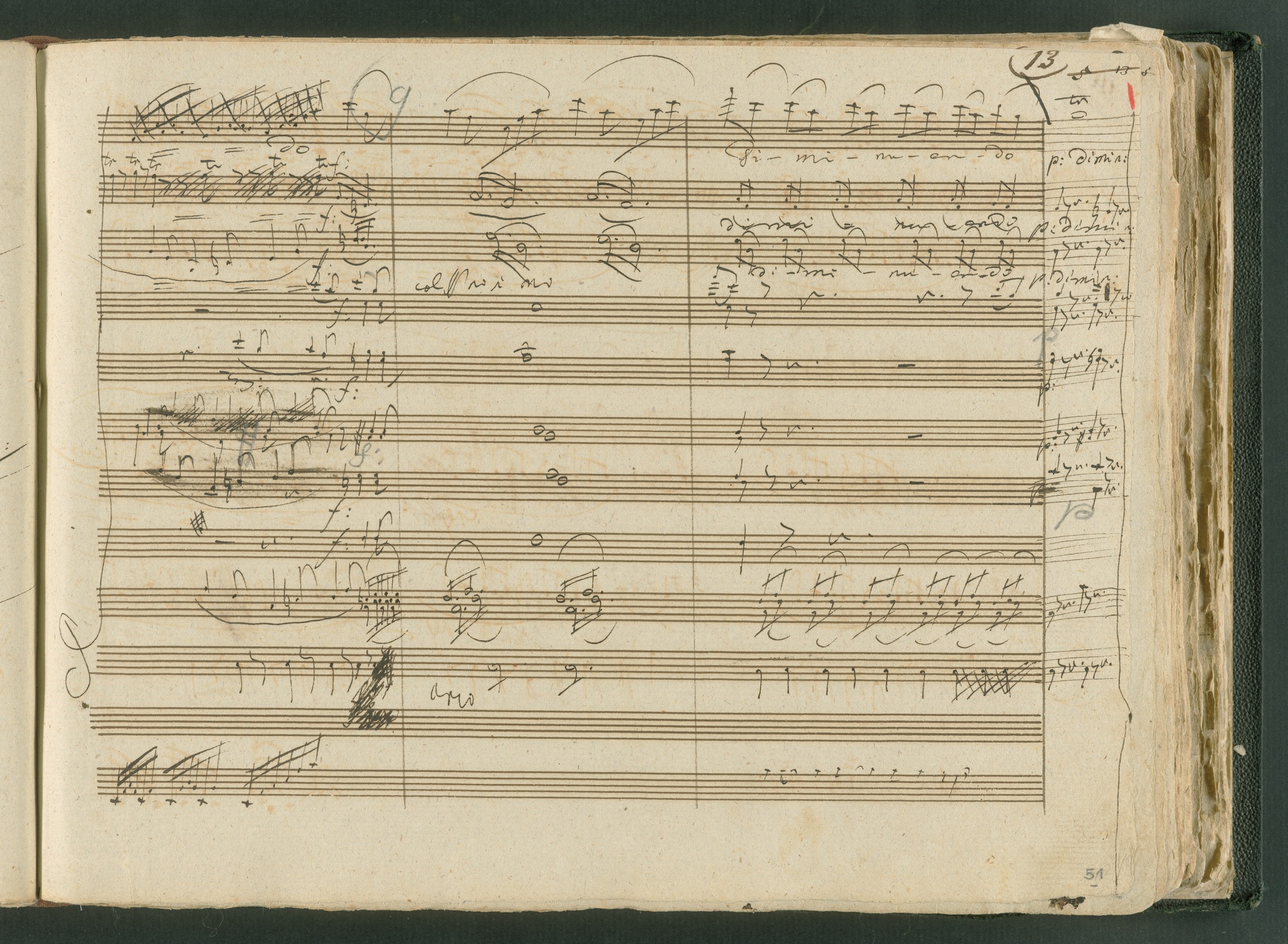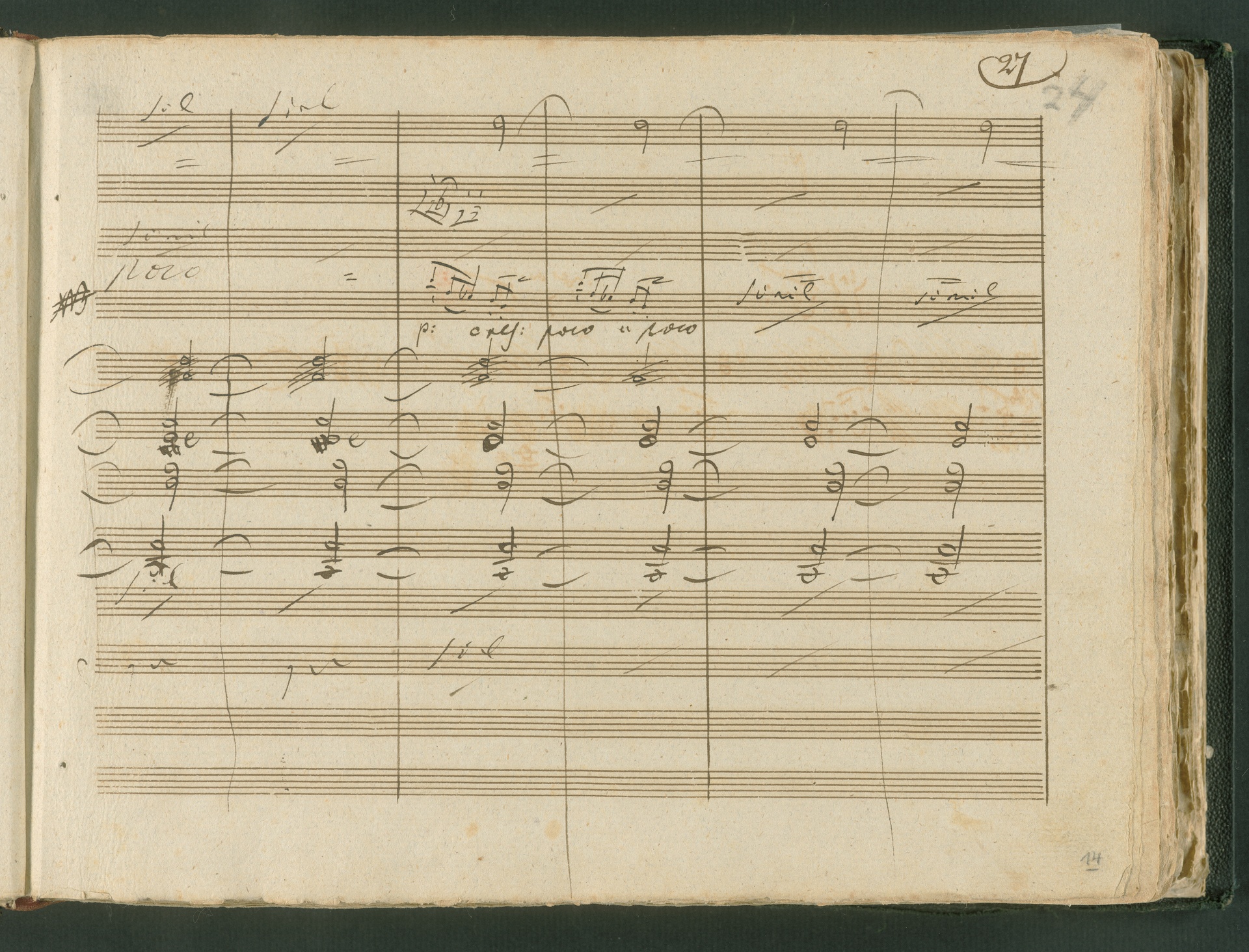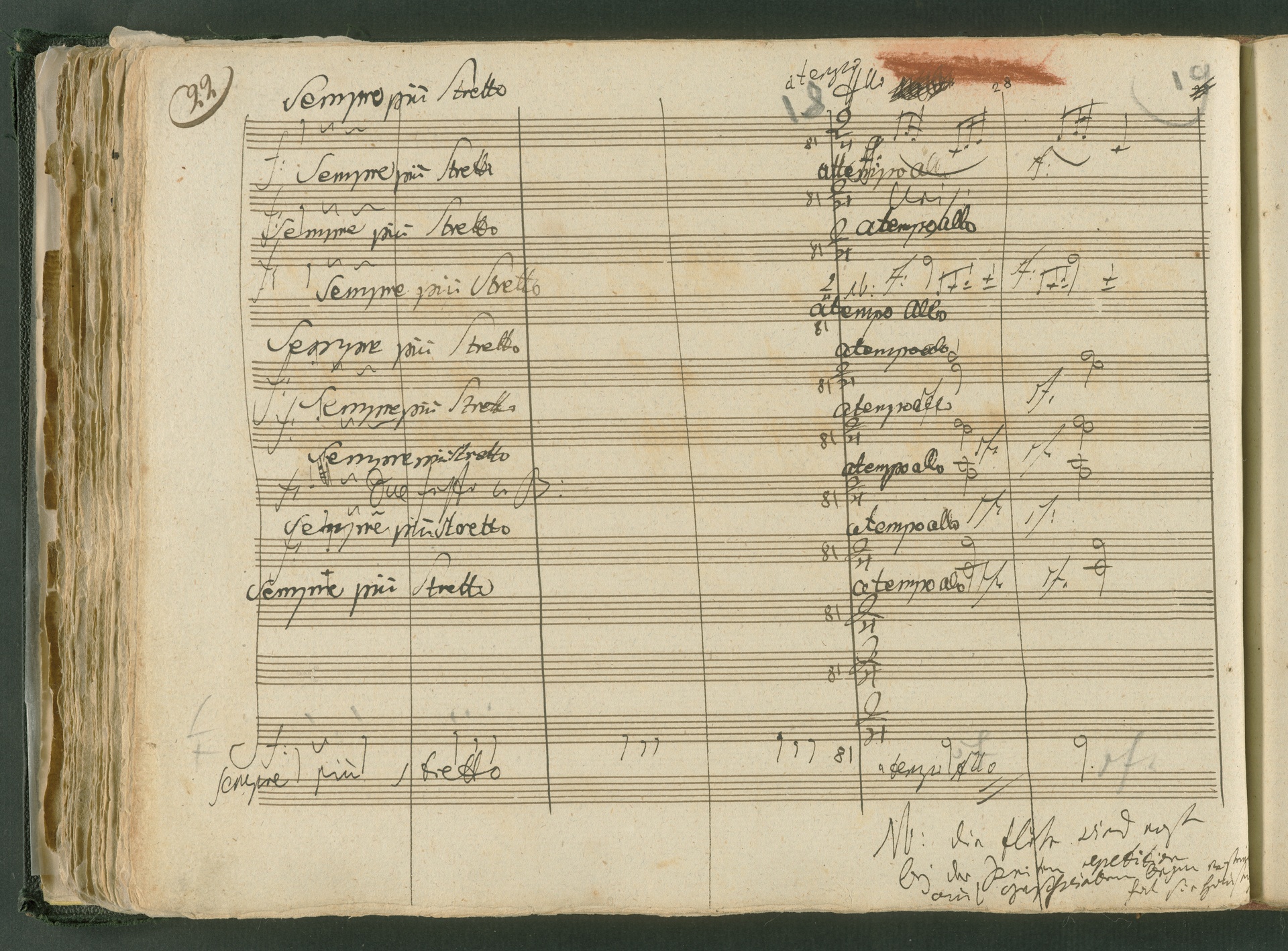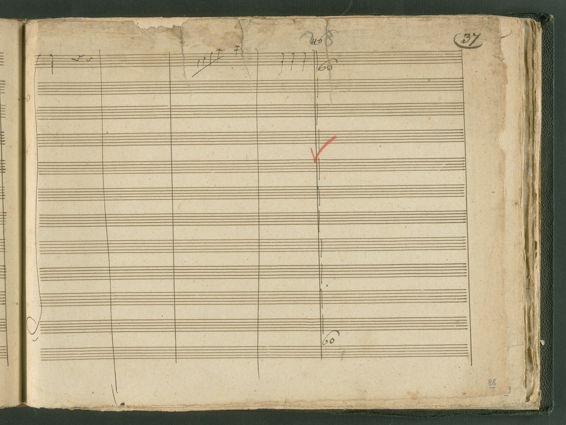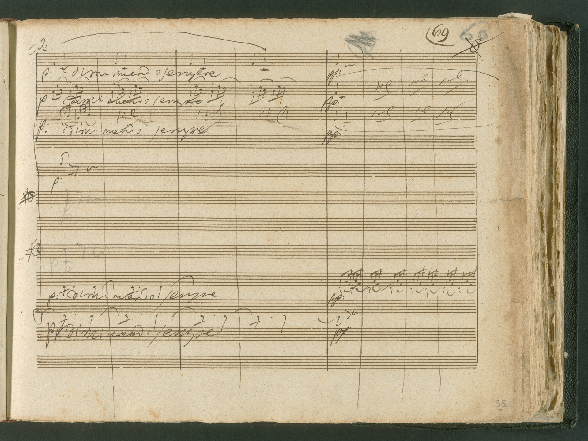 Nach der Niederschrift der Füllstimmen hatte der Komponist nun eine zunächst fertige, vorläufig vollständige Partitur vor sich. In einem weiteren Schritt sah er sich das ganze Werk noch einmal durch und überarbeitete es an vielen Stellen vollständig. Dabei konnte es auch vorkommen, dass er vorherige Änderungen wieder zurücknahm. In so einem Fall wurde eine gestrichene Stelle mit "bleibt" gekennzeichnet, z.B. auf Bl. 69r (Bild 139). Schließlich sah sich ein zuverlässiger Berufskopist, Joseph Klumpar, der etliche Male für Beethoven arbeitete, die Partitur durch, um daraus die Abschrift der Orchesterstimmen vorzubereiten. Bei dieser Durchsicht las Klumpar das Autograph auch Korrektur und machte Anmerkungen zu unklaren Stellen im Text oder zu Versäumnissen, auf die er Beethoven aufmerksam machte und die dieser dann korrigierte. An solchen Stellen notiert Klumpar am Rand ein "NB", nach Korrektur wurde der Vermerk durchgestrichen. So hatte Beethoven z.B. auf Bl. 52r Noten vergessen. Der Kopist hatte dies bemerkt, daraufhin trug Beethoven mit seinem roten Korrekturstift (Rötel) die entsprechende Stelle nach und Klumpar strich seinen Vermerk am linken Rand wieder durch - erledigt. Vermutlich schrieb Beethoven den vierten Satz etwas später als die übrigen Sätze noch einmal aus. Es finden sich darin keine Instrumentierungsskizzen, eine andere Tinte, eine andere Heftung und er war auch nicht zuvor in drei Großtakte geordnet worden. (J.R.)