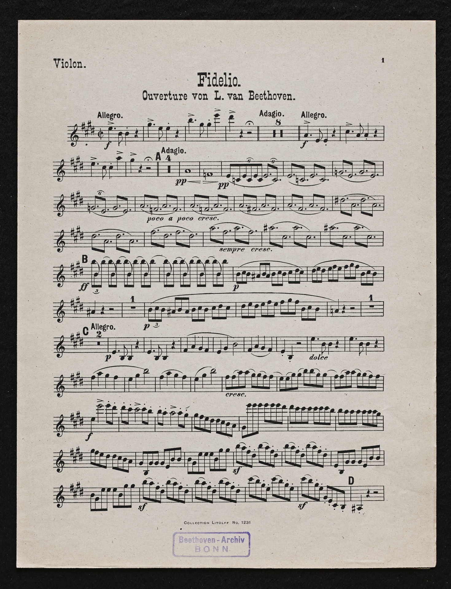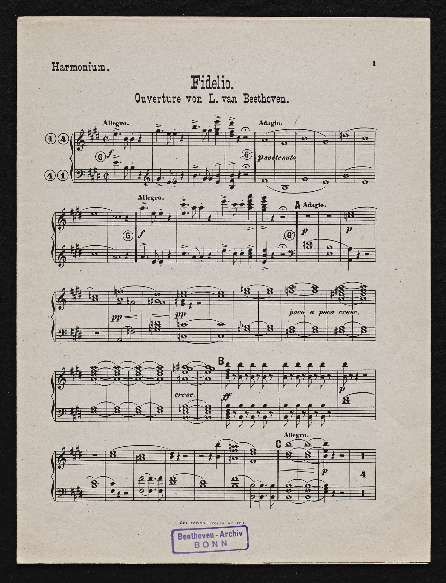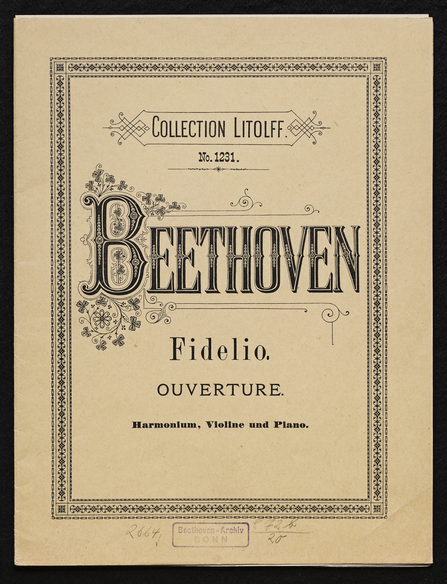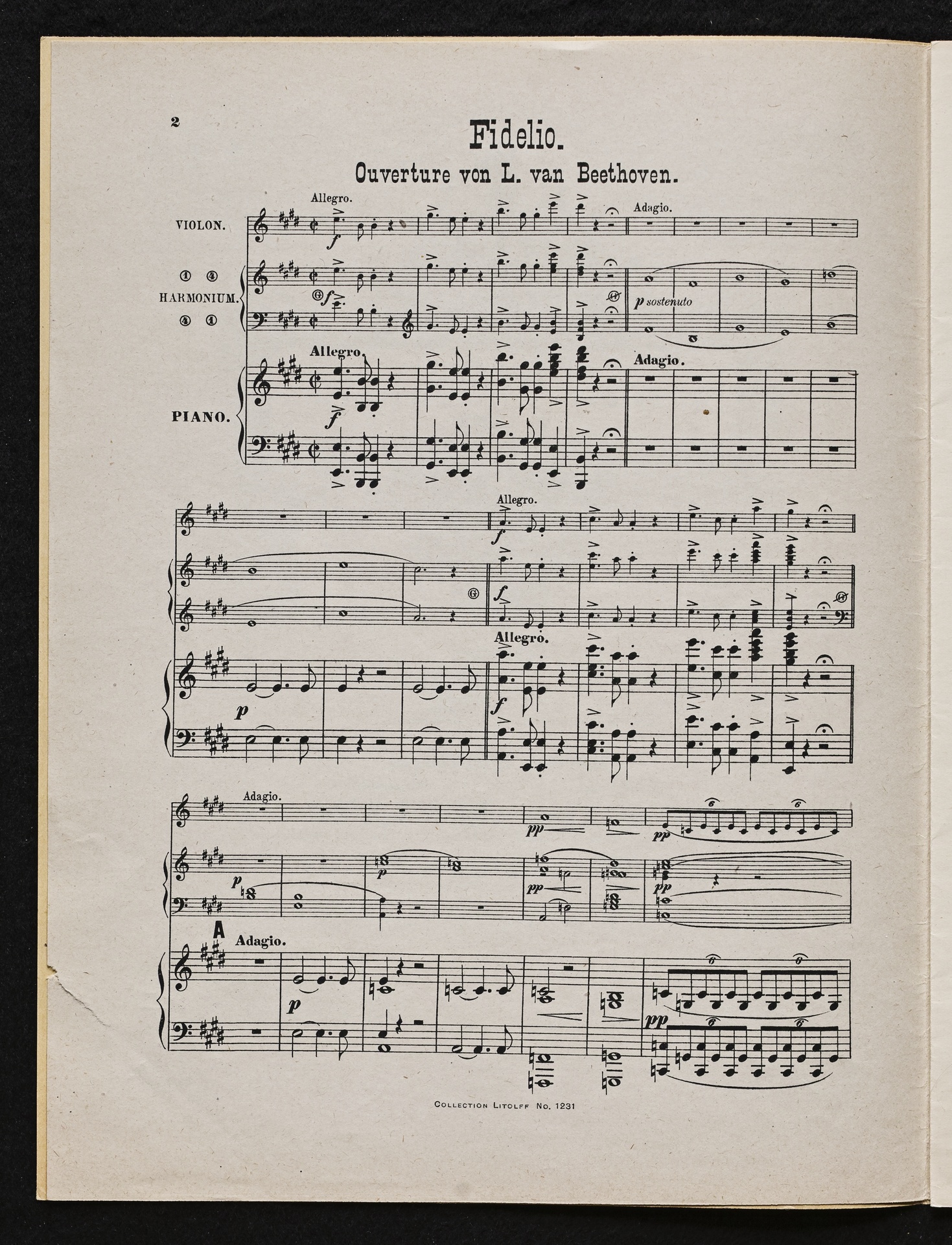 Ludwig van Beethoven, Fidelio op. 72, 3. Fassung 1814, Ouvertüre (E-Dur), Bearbeitung für Violine, Harmonium und Klavier von W. Lenz, Stimmen, Litolff, 1231