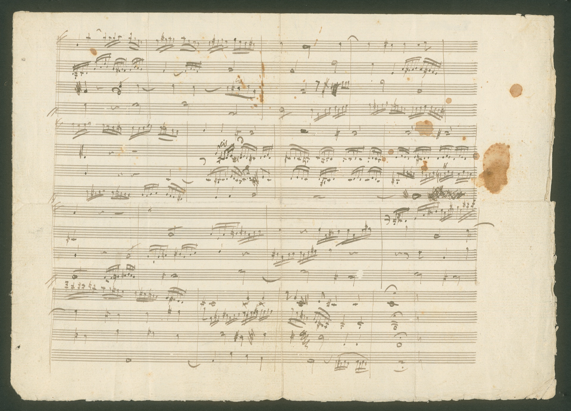 "Geiz ist geil", dachte sich vermutlich auch Beethoven. Zumindest bei seinen Notenpapieren ließ er nichts umkommen. Auf diesem autographen Blatt wurden Vorder- und Rückseite zu unterschiedlichen Anlässen beschriftet. Was jetzt als Rückseite erscheint, war für Beethoven wahrscheinlich ursprünglich die Vorderseite des Blattes (der breite Rand liegt rechts außen), diese Seite beschriftete er zuerst. Notiert hat er hier einen vierstimmigen Satz, ein Präludium zu einer Fuge, vielleicht für Streichquartett. Dieser Entwurf gehört zu den Materialien, die während Beethovens Unterricht bei Johann Georg Albrechtsberger 1794 und 1795 entstanden sind: wahrscheinlich war es eine Übung oder Aufgabe im Kontrapunkt gewesen. Wenig später arbeitete Beethoven an der Vertonung des Liedes "Adelaide" op. 46 (es erschien im Februar 1797 im Druck). Vielleicht hatte er gerade einen guten Gedanken, aber kein Notenpapier zur Hand. Jedenfalls nahm er die unbeschriftete Rückseite dieses Blattes (jetzt die Vorderseite) und skizzierte darauf den 1. Teil des Liedes. (J.R.)