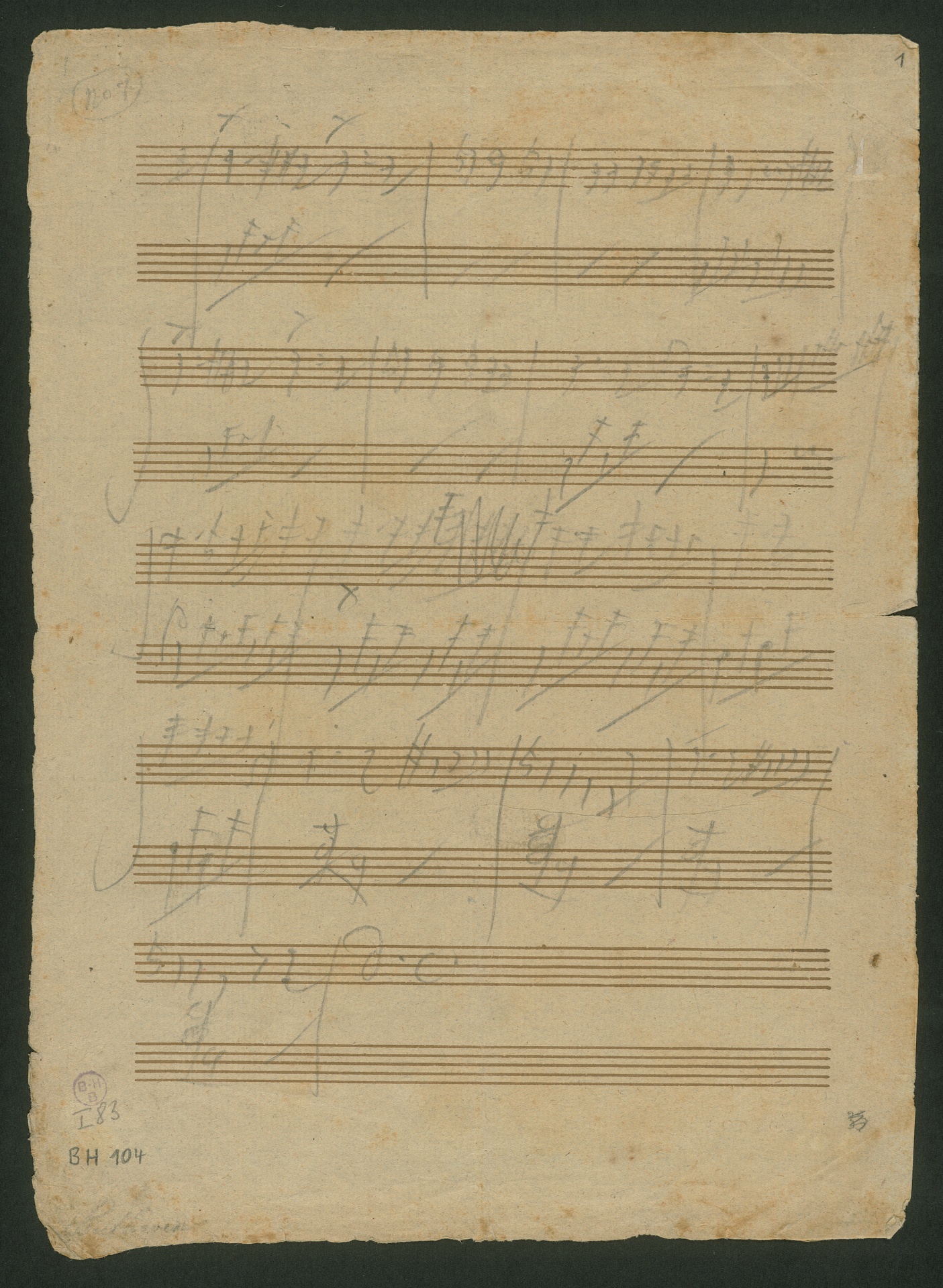 Wir sehen ein Einzelblatt, von Beethoven mit Bleistift beschrieben. Er benutzte ein hochformatiges Papier, wie man es sonst für Abschriften von Stimmen verwendete, kein Standardpapier für seine Skizzen. Vielleicht hatte er gerade kein anderes zur Hand? Das Papier, ein Kiesling-Papier, stammt aus einer Papiermühle in Böhmen; Beethoven benutzte es vor allem in den Jahren 1810 bis 1812. Die Notizen auf dem Blatt sehen aus, als seien sie für Klavier gedacht. Ob sich Beethoven Klavierstudien skizzierte? Oder vielleicht hat er sich auch von irgendwoher ein Stück abgeschrieben? Die Seite endet mit den beiden Buchstaben "d. c.", ausgeschrieben bedeutet das "da capo", noch mal von vorne. Also wohl doch eher eine Abschrift? Es bleibt noch viel zu tun für die Forschung! (J.R.)