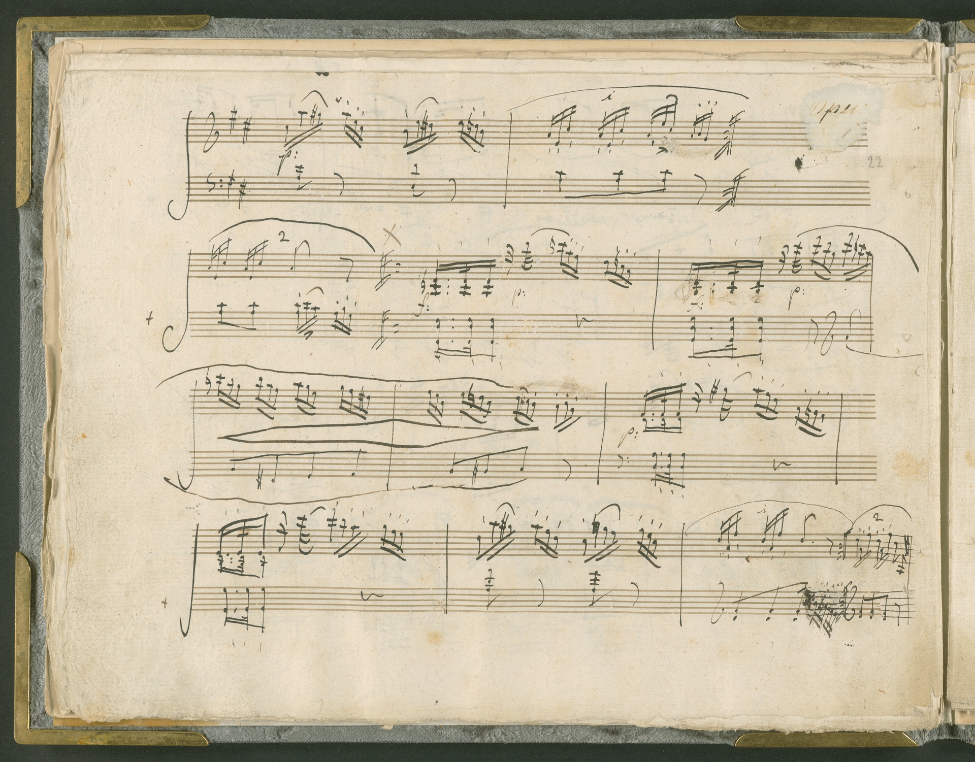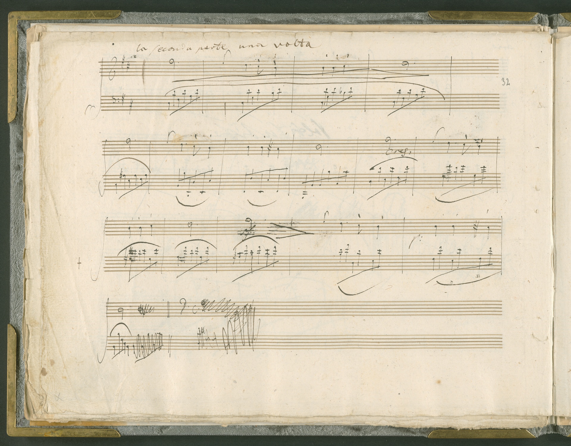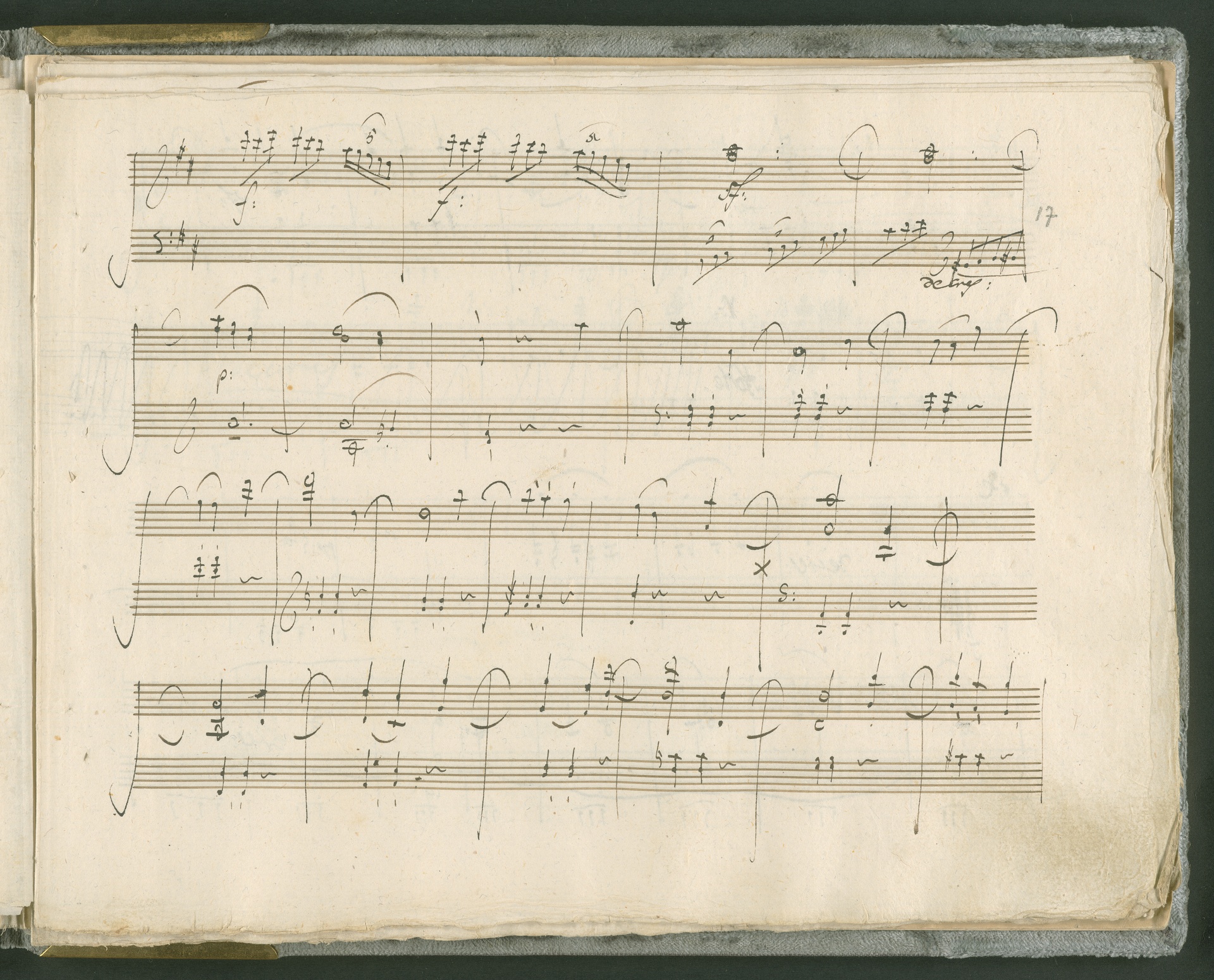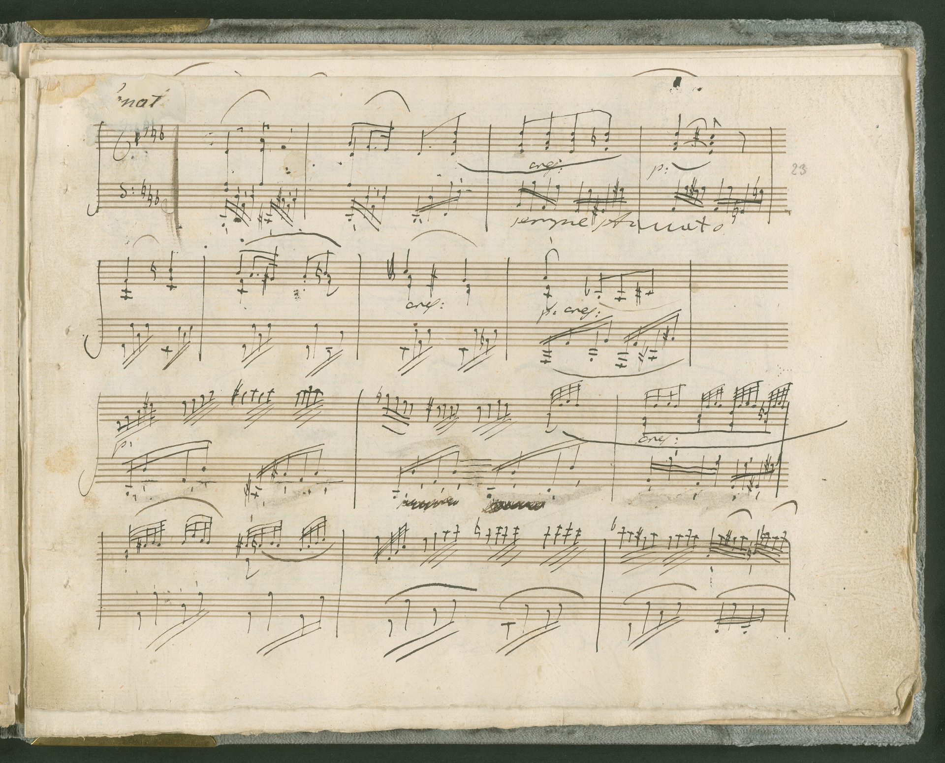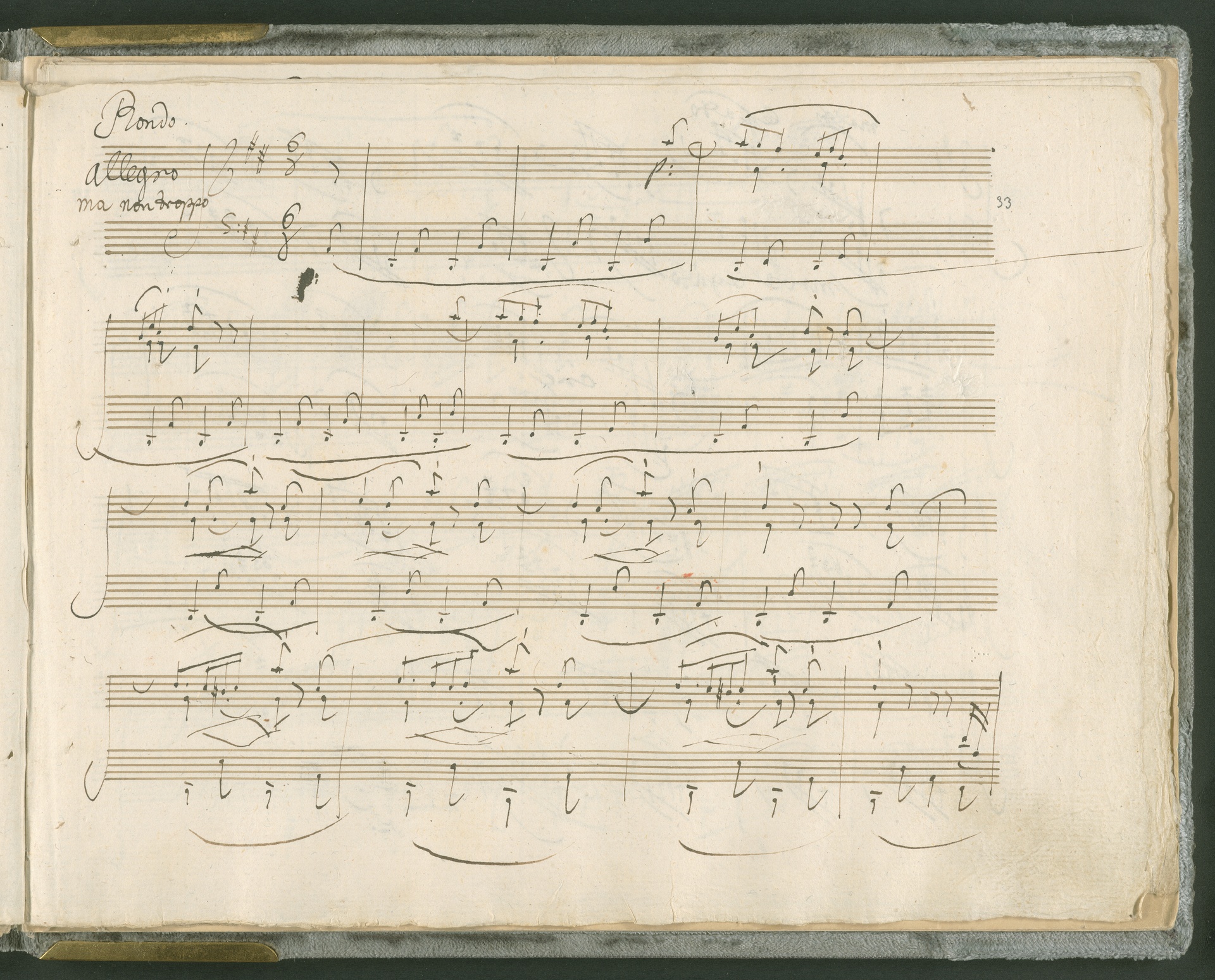 Abgebildet ist das Autograph der Klaviersonate op. 28, die Beethoven Joseph von Sonnenfels widmete. Sonnenfels (1732-1817) war Jurist, Lehrer, Aufklärer, Freimaurer und Schriftsteller, einer der führenden Köpfe der sozialen Reformen in Österreich (unter seiner Ägide wurde die Folter abgeschafft und die Polizeigewalt gezügelt). Sonnenfels war Inbegriff der aufklärerischen Ideen von Freiheit und Verehrung der Freien Künste - Prinzipien, denen Beethoven bekanntermaßen verpflichtet war. Ein Treffen des Komponisten mit Sonnenfels ist nicht nachweisbar, jedoch hatten sie gemeinsame Freunde, die ein Treffen ermöglicht haben können: Zum einen Freiherr van Swieten, ebenfalls ein Freund und Förderer der Künste. Möglicherweise hatte er Beethoven und Sonnenfels einander bei einem privaten Hauskonzert, derer er viele veranstaltete, vorgestellt. Zum anderen auch Johann Melchior von Birkenstock, Sonnenfels Schwager. In seinem Haus ging Beethoven eine Zeit lang ein und aus, weil die mit ihm befreundete Familie Brentano dort wohnte. Auch der Verlag, das Kunst- und Industrie-Comptoir, der die Sonate druckte, wird als möglicher Schnittpunkt der beiden Männer angeführt. Denkbar ist schließlich auch, daß Sonnenfels sogar Beethoven mit der Komposition der Klaviersonate beauftragte. Vielleicht war Beethoven jedoch auch schlicht beeindruckt von Sonnenfels Prinzipien und dessen Philosophie. (J.R.)