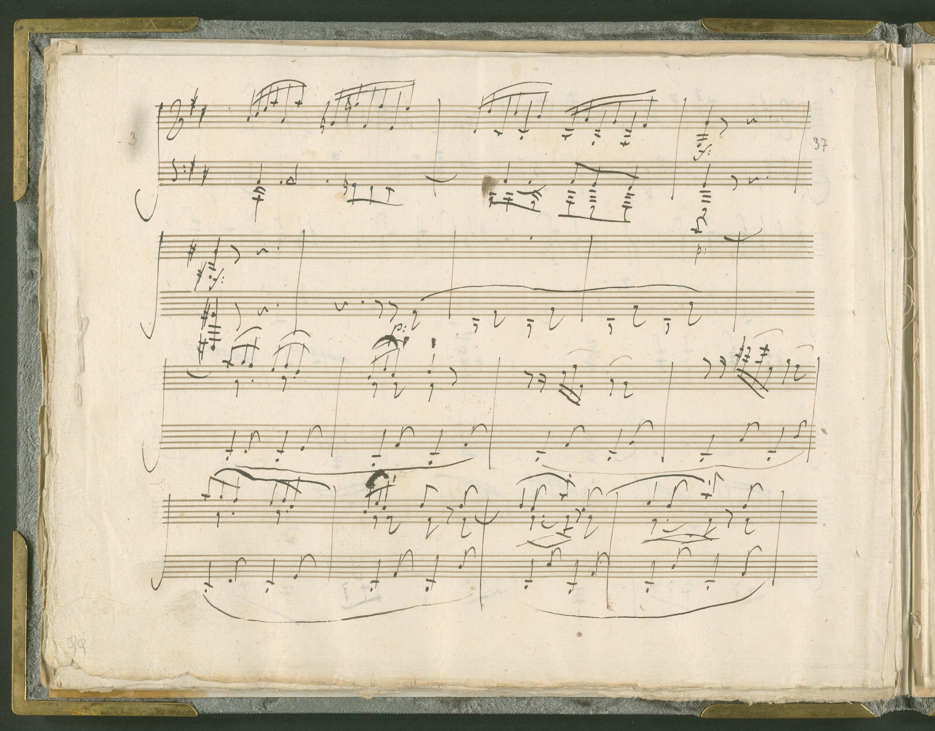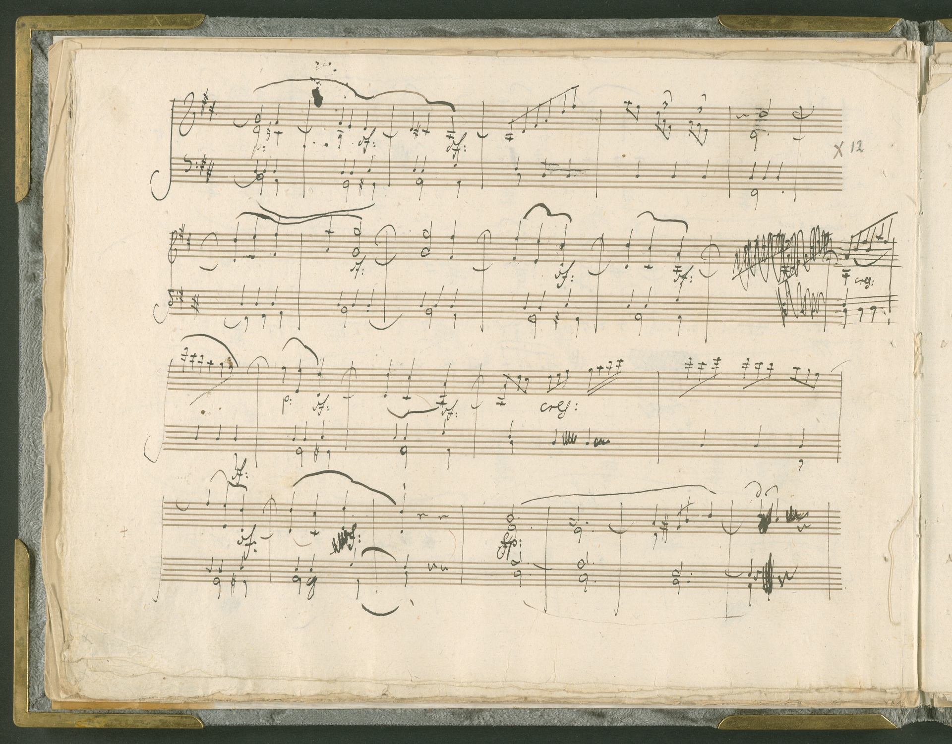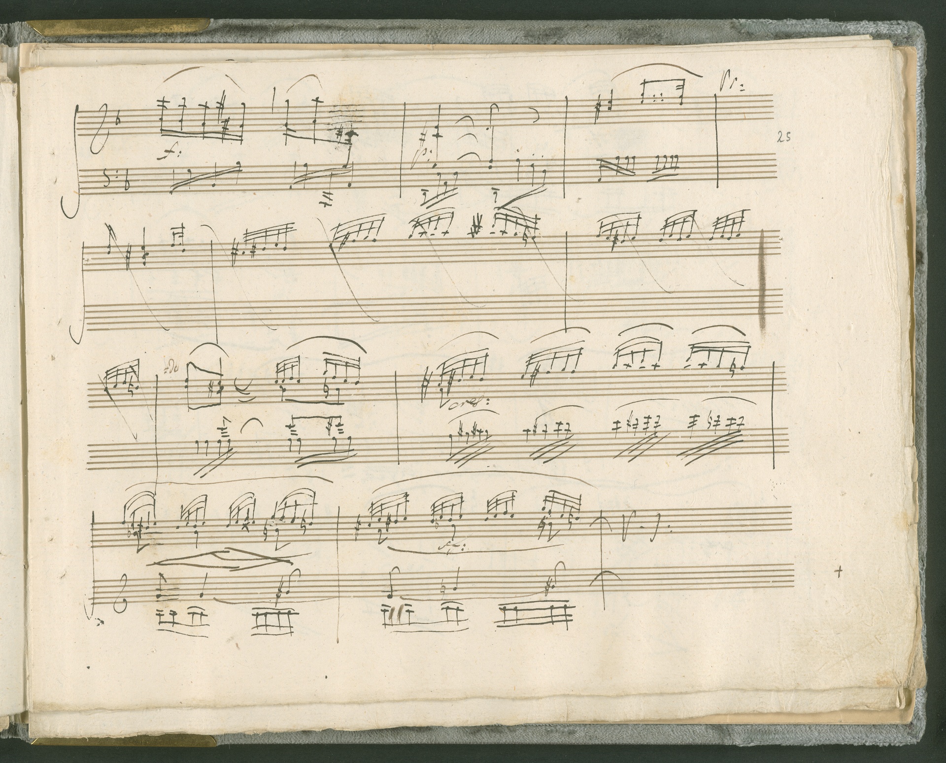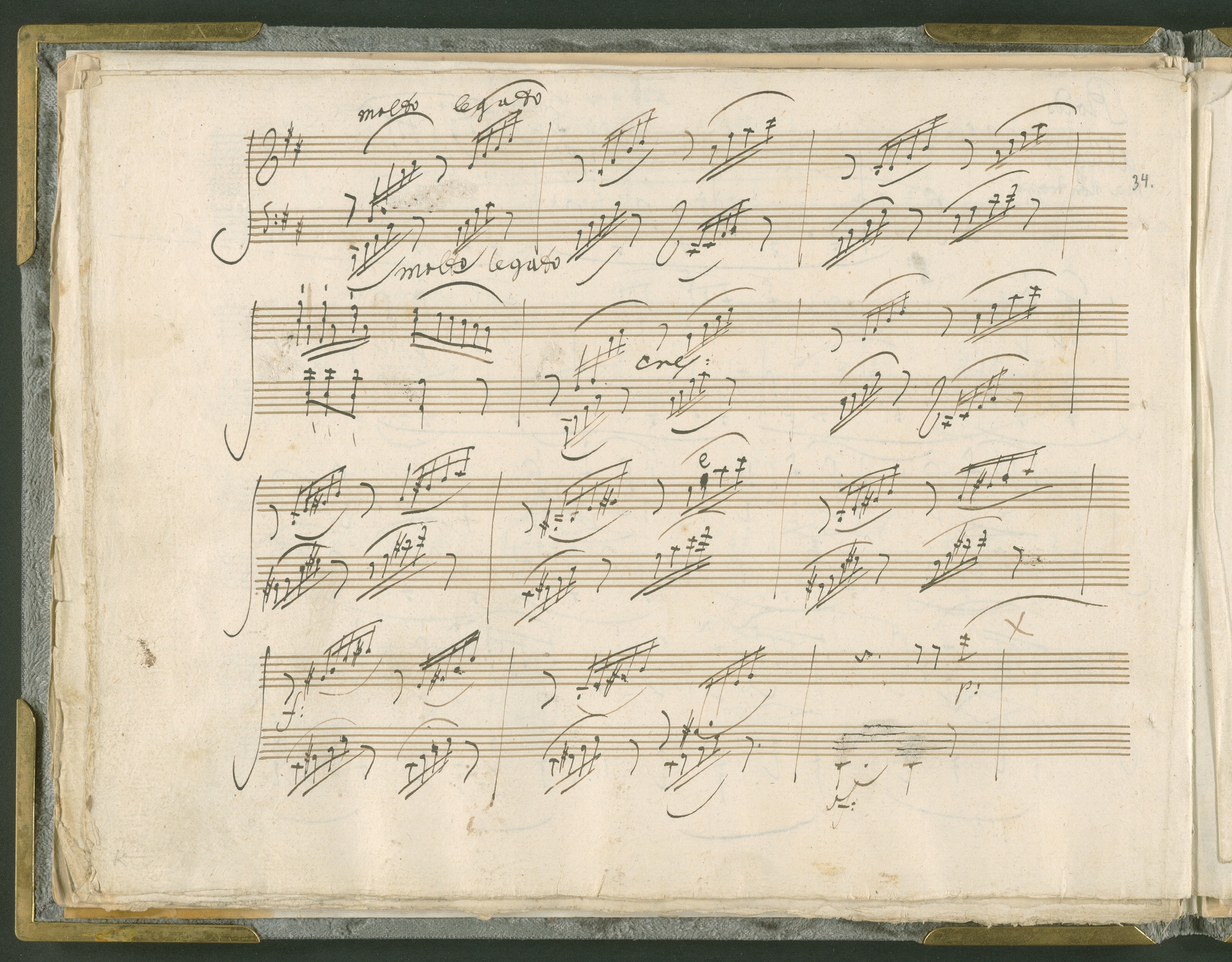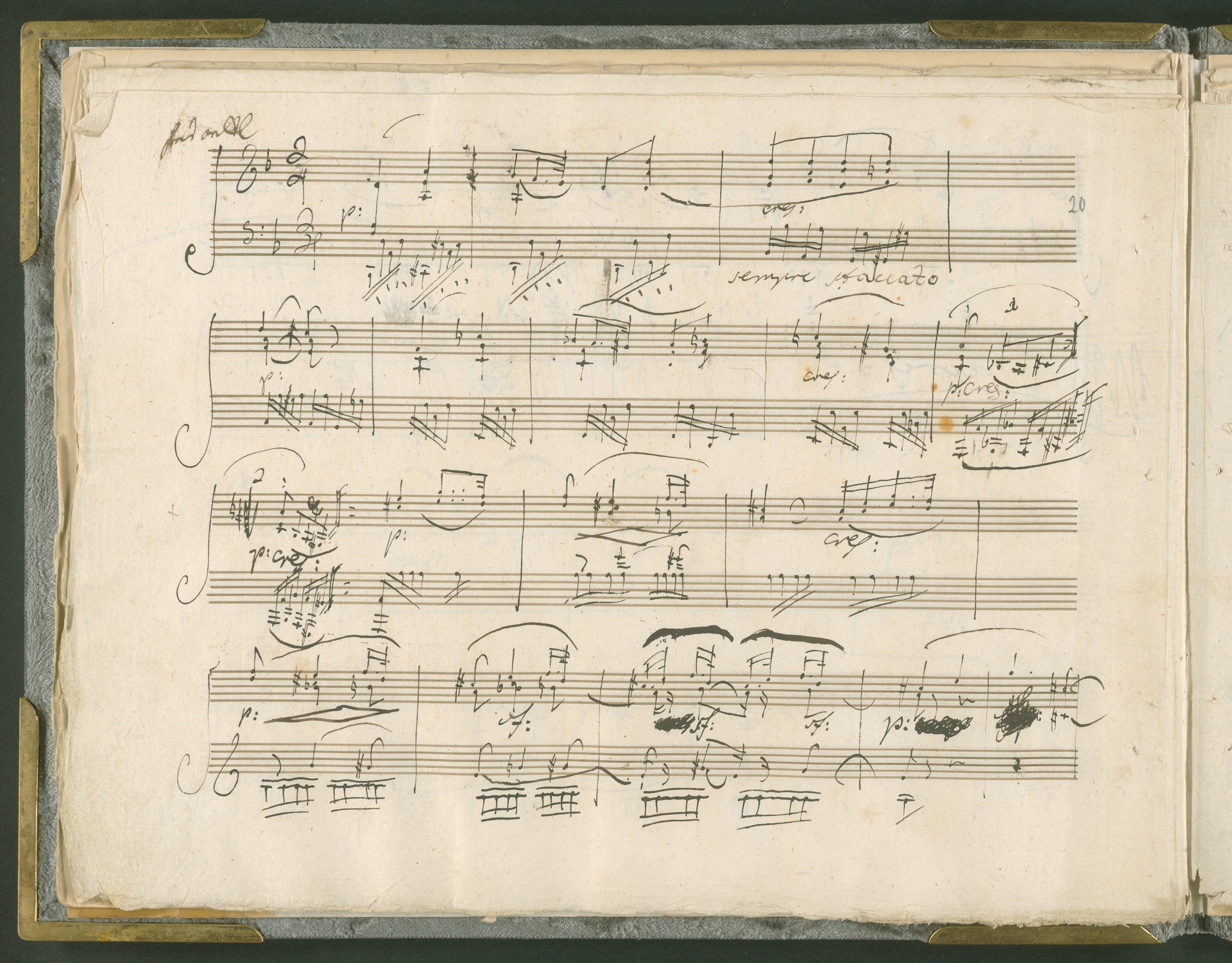 Abgebildet ist das Autograph der Klaviersonate op. 28, die Beethoven Joseph von Sonnenfels widmete. Sonnenfels (1732-1817) war Jurist, Lehrer, Aufklärer, Freimaurer und Schriftsteller, einer der führenden Köpfe der sozialen Reformen in Österreich (unter seiner Ägide wurde die Folter abgeschafft und die Polizeigewalt gezügelt). Sonnenfels war Inbegriff der aufklärerischen Ideen von Freiheit und Verehrung der Freien Künste - Prinzipien, denen Beethoven bekanntermaßen verpflichtet war. Ein Treffen des Komponisten mit Sonnenfels ist nicht nachweisbar, jedoch hatten sie gemeinsame Freunde, die ein Treffen ermöglicht haben können: Zum einen Freiherr van Swieten, ebenfalls ein Freund und Förderer der Künste. Möglicherweise hatte er Beethoven und Sonnenfels einander bei einem privaten Hauskonzert, derer er viele veranstaltete, vorgestellt. Zum anderen auch Johann Melchior von Birkenstock, Sonnenfels Schwager. In seinem Haus ging Beethoven eine Zeit lang ein und aus, weil die mit ihm befreundete Familie Brentano dort wohnte. Auch der Verlag, das Kunst- und Industrie-Comptoir, der die Sonate druckte, wird als möglicher Schnittpunkt der beiden Männer angeführt. Denkbar ist schließlich auch, daß Sonnenfels sogar Beethoven mit der Komposition der Klaviersonate beauftragte. Vielleicht war Beethoven jedoch auch schlicht beeindruckt von Sonnenfels Prinzipien und dessen Philosophie. (J.R.)