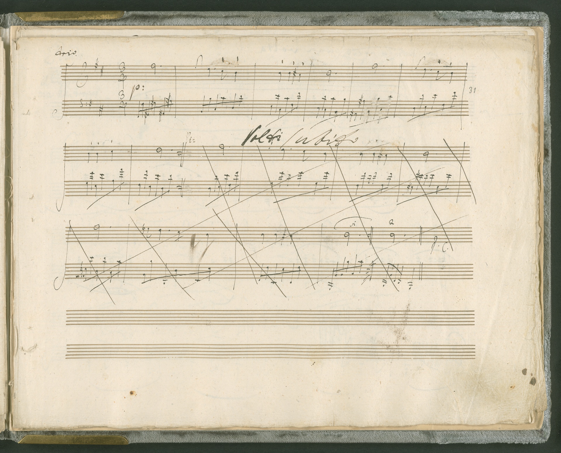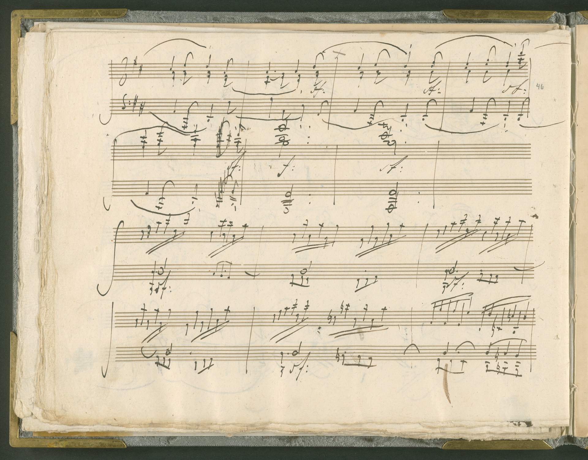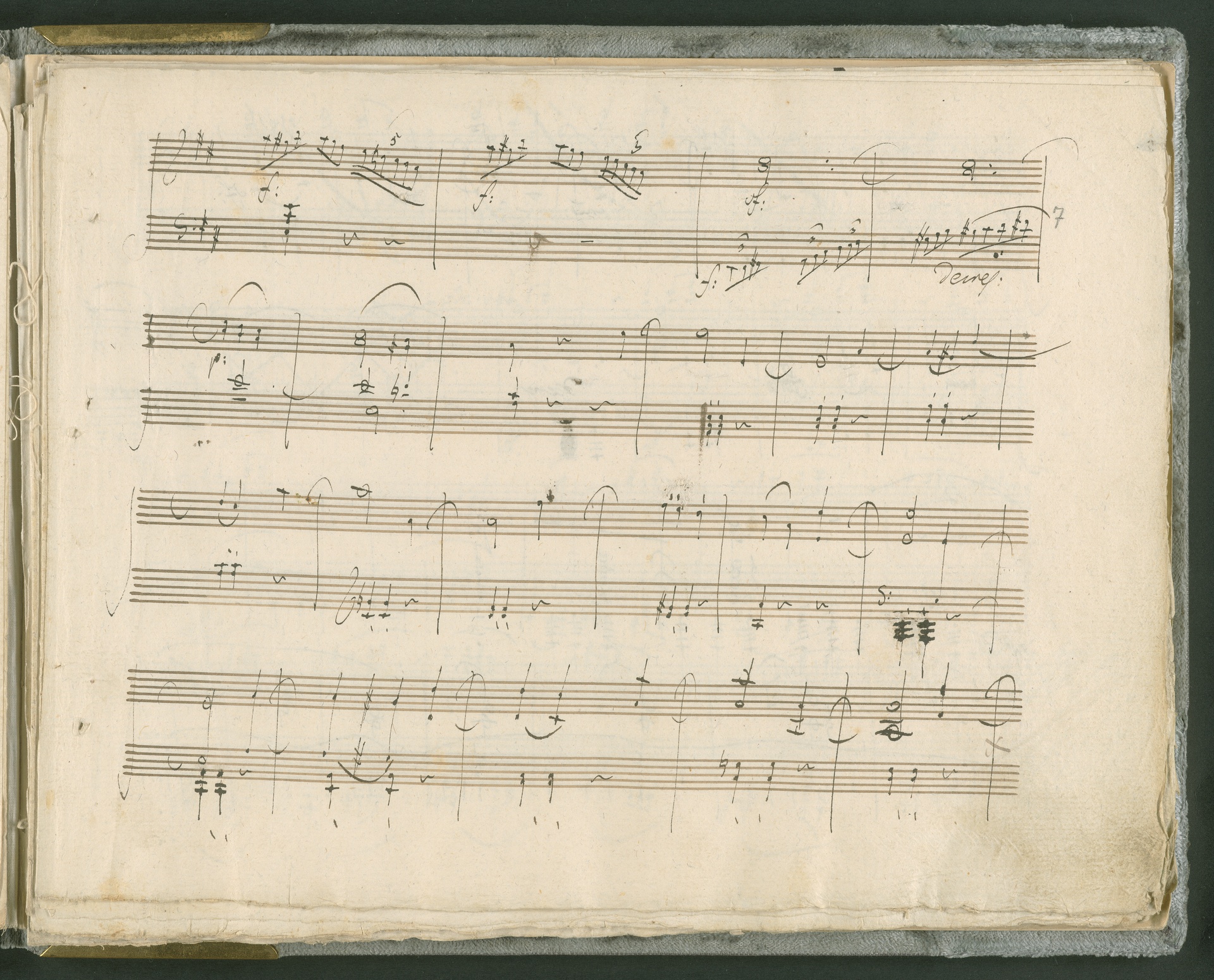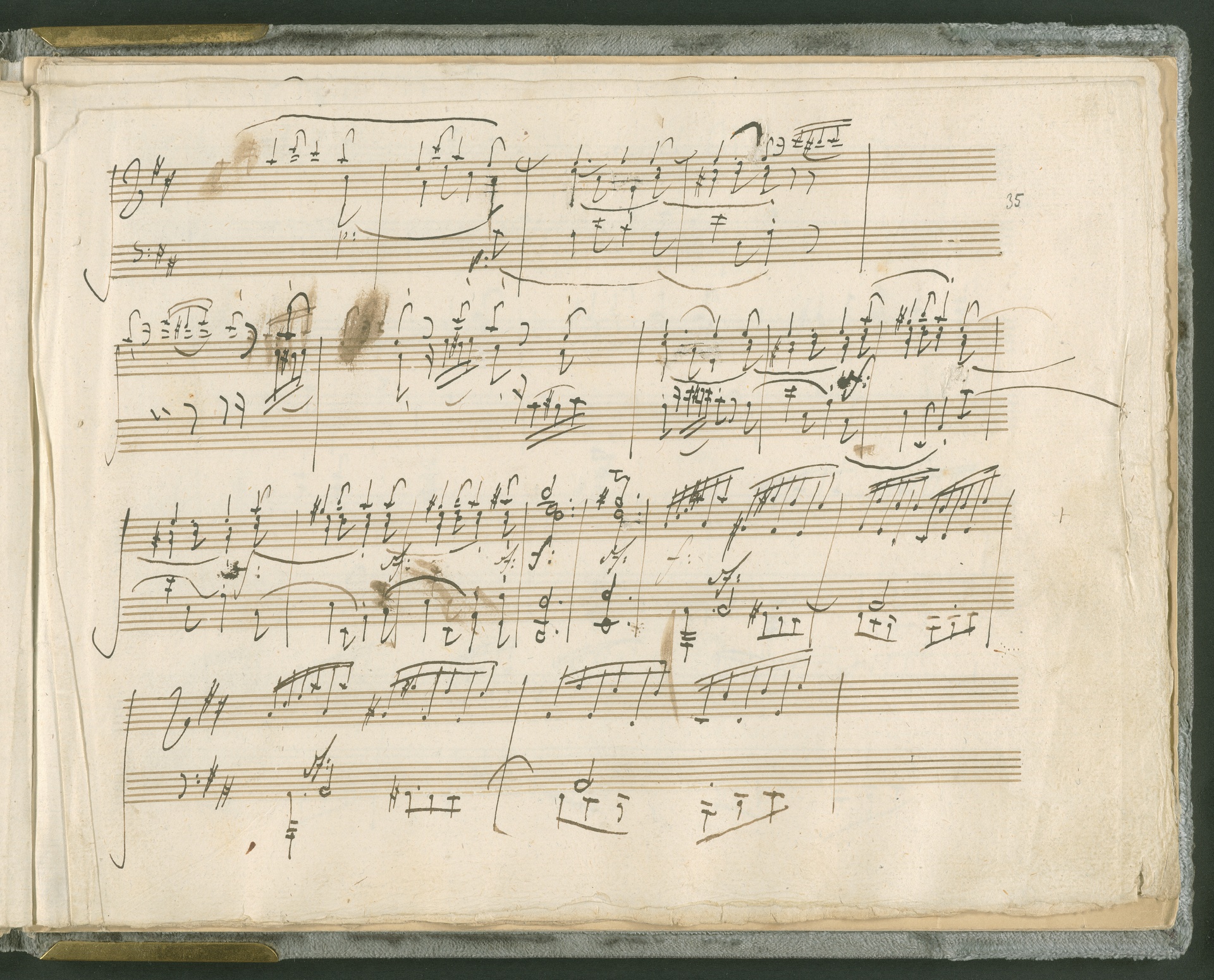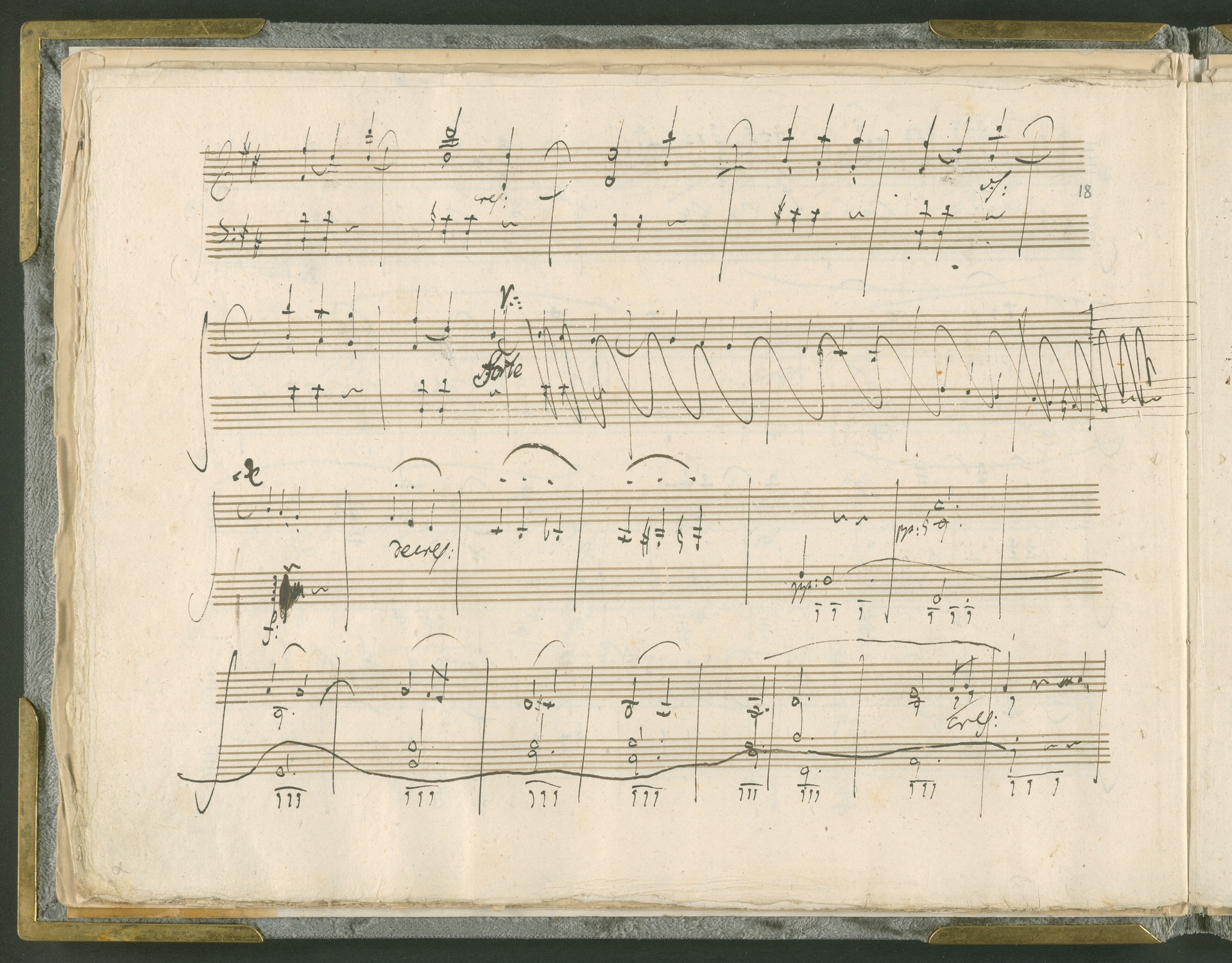 Abgebildet ist das Autograph der Klaviersonate op. 28, die Beethoven Joseph von Sonnenfels widmete. Sonnenfels (1732-1817) war Jurist, Lehrer, Aufklärer, Freimaurer und Schriftsteller, einer der führenden Köpfe der sozialen Reformen in Österreich (unter seiner Ägide wurde die Folter abgeschafft und die Polizeigewalt gezügelt). Sonnenfels war Inbegriff der aufklärerischen Ideen von Freiheit und Verehrung der Freien Künste - Prinzipien, denen Beethoven bekanntermaßen verpflichtet war. Ein Treffen des Komponisten mit Sonnenfels ist nicht nachweisbar, jedoch hatten sie gemeinsame Freunde, die ein Treffen ermöglicht haben können: Zum einen Freiherr van Swieten, ebenfalls ein Freund und Förderer der Künste. Möglicherweise hatte er Beethoven und Sonnenfels einander bei einem privaten Hauskonzert, derer er viele veranstaltete, vorgestellt. Zum anderen auch Johann Melchior von Birkenstock, Sonnenfels Schwager. In seinem Haus ging Beethoven eine Zeit lang ein und aus, weil die mit ihm befreundete Familie Brentano dort wohnte. Auch der Verlag, das Kunst- und Industrie-Comptoir, der die Sonate druckte, wird als möglicher Schnittpunkt der beiden Männer angeführt. Denkbar ist schließlich auch, daß Sonnenfels sogar Beethoven mit der Komposition der Klaviersonate beauftragte. Vielleicht war Beethoven jedoch auch schlicht beeindruckt von Sonnenfels Prinzipien und dessen Philosophie. (J.R.)