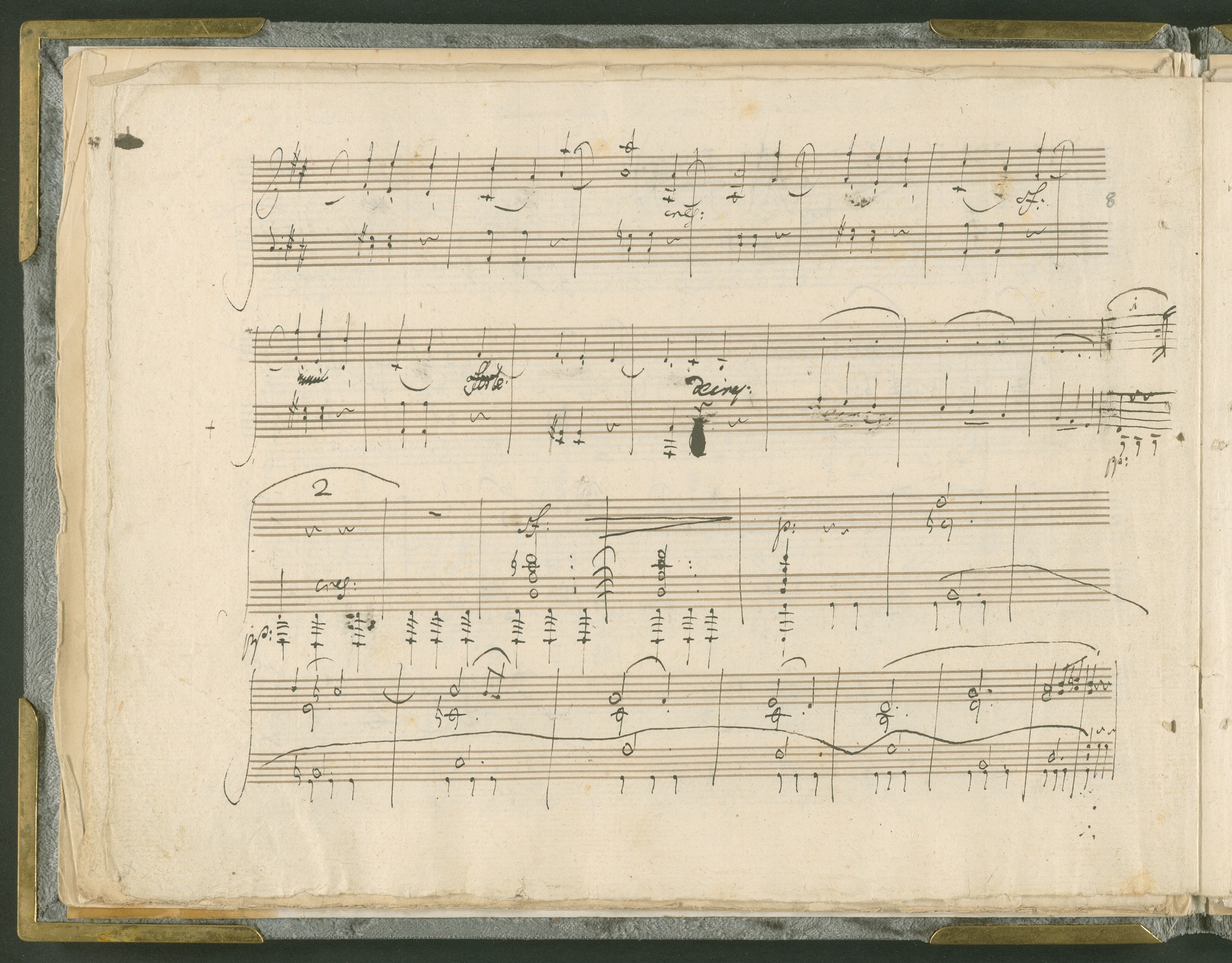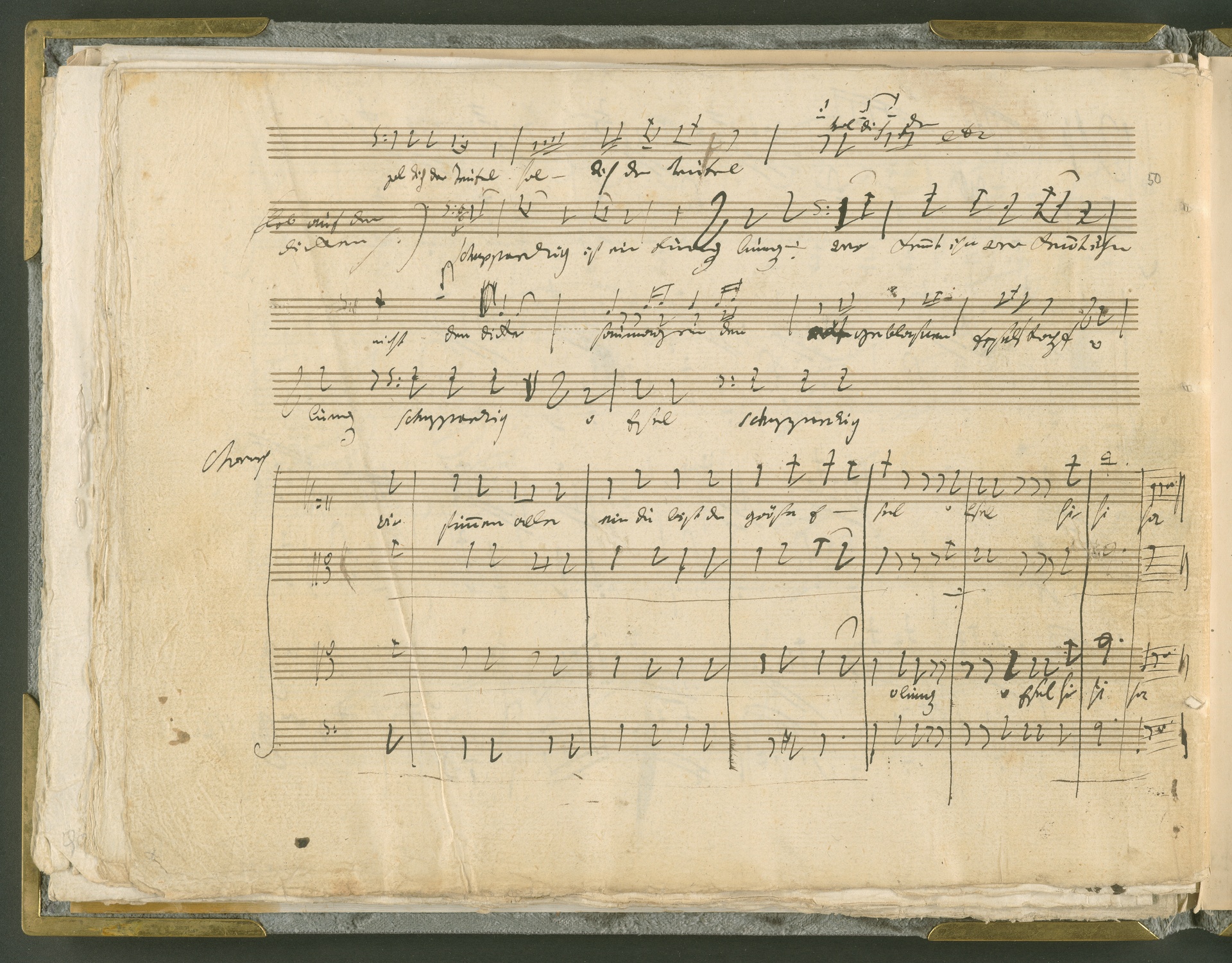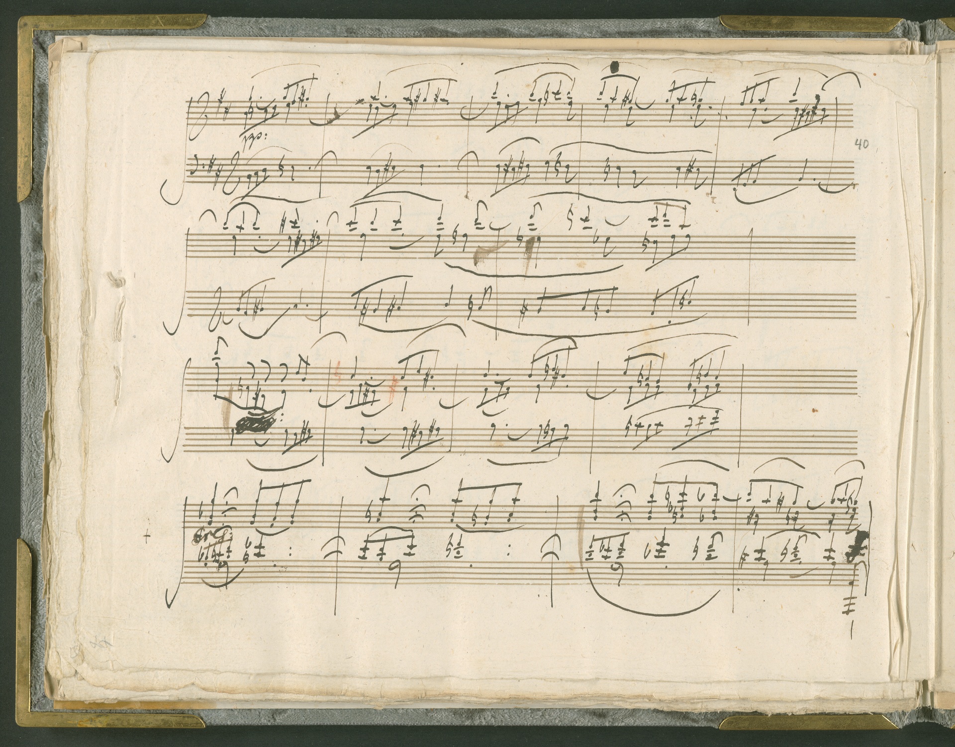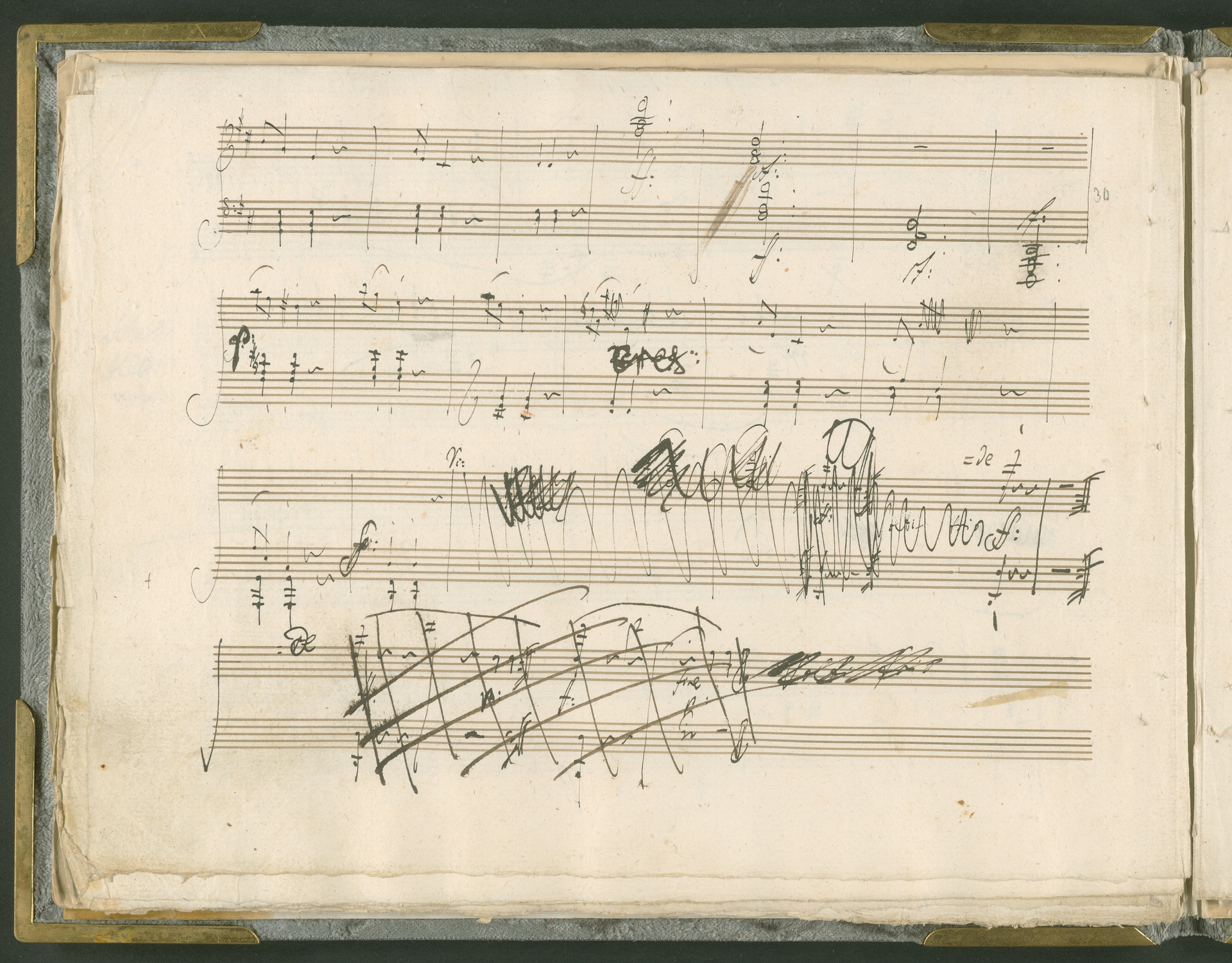 Abgebildet ist das Autograph der Klaviersonate op. 28, die Beethoven Joseph von Sonnenfels widmete. Sonnenfels (1732-1817) war Jurist, Lehrer, Aufklärer, Freimaurer und Schriftsteller, einer der führenden Köpfe der sozialen Reformen in Österreich (unter seiner Ägide wurde die Folter abgeschafft und die Polizeigewalt gezügelt). Sonnenfels war Inbegriff der aufklärerischen Ideen von Freiheit und Verehrung der Freien Künste - Prinzipien, denen Beethoven bekanntermaßen verpflichtet war. Ein Treffen des Komponisten mit Sonnenfels ist nicht nachweisbar, jedoch hatten sie gemeinsame Freunde, die ein Treffen ermöglicht haben können: Zum einen Freiherr van Swieten, ebenfalls ein Freund und Förderer der Künste. Möglicherweise hatte er Beethoven und Sonnenfels einander bei einem privaten Hauskonzert, derer er viele veranstaltete, vorgestellt. Zum anderen auch Johann Melchior von Birkenstock, Sonnenfels Schwager. In seinem Haus ging Beethoven eine Zeit lang ein und aus, weil die mit ihm befreundete Familie Brentano dort wohnte. Auch der Verlag, das Kunst- und Industrie-Comptoir, der die Sonate druckte, wird als möglicher Schnittpunkt der beiden Männer angeführt. Denkbar ist schließlich auch, daß Sonnenfels sogar Beethoven mit der Komposition der Klaviersonate beauftragte. Vielleicht war Beethoven jedoch auch schlicht beeindruckt von Sonnenfels Prinzipien und dessen Philosophie. (J.R.)