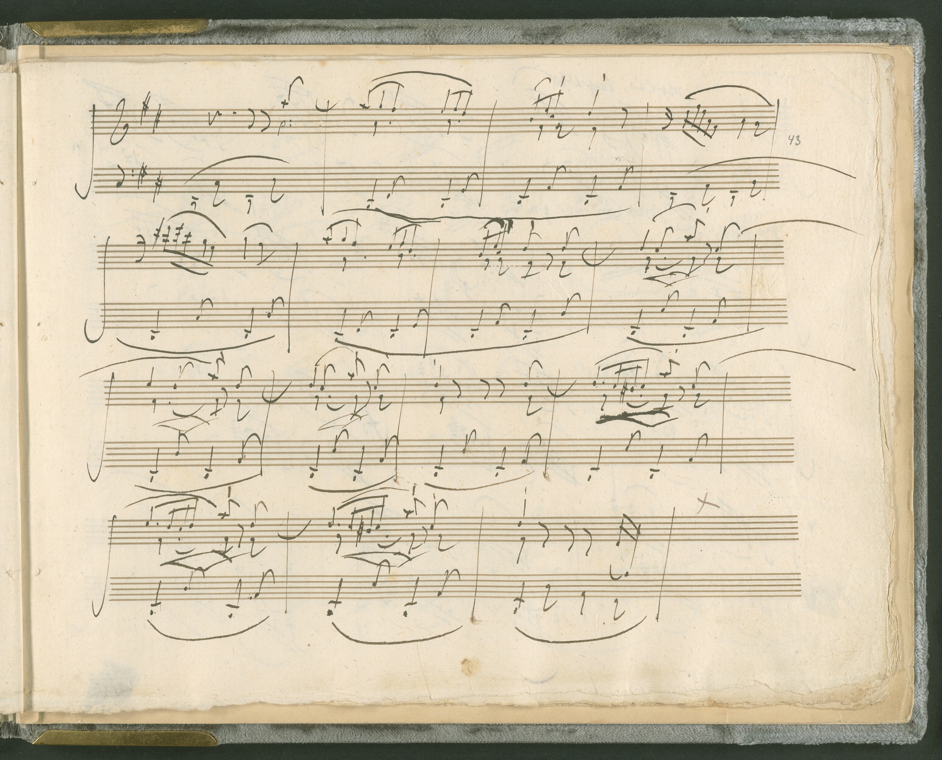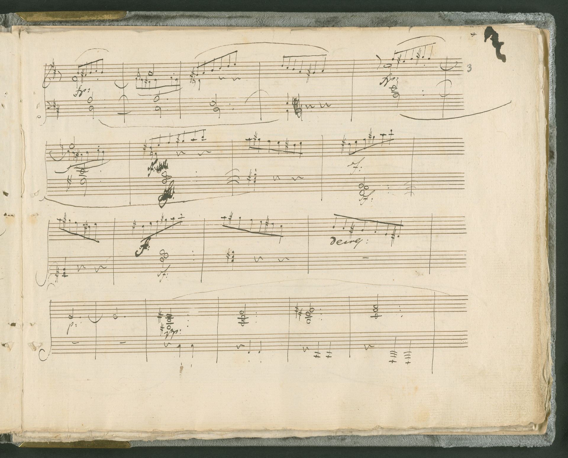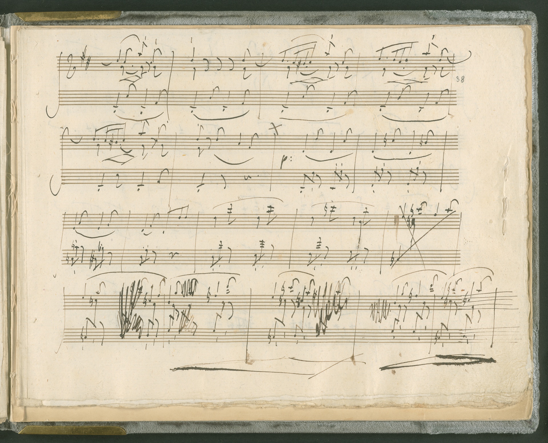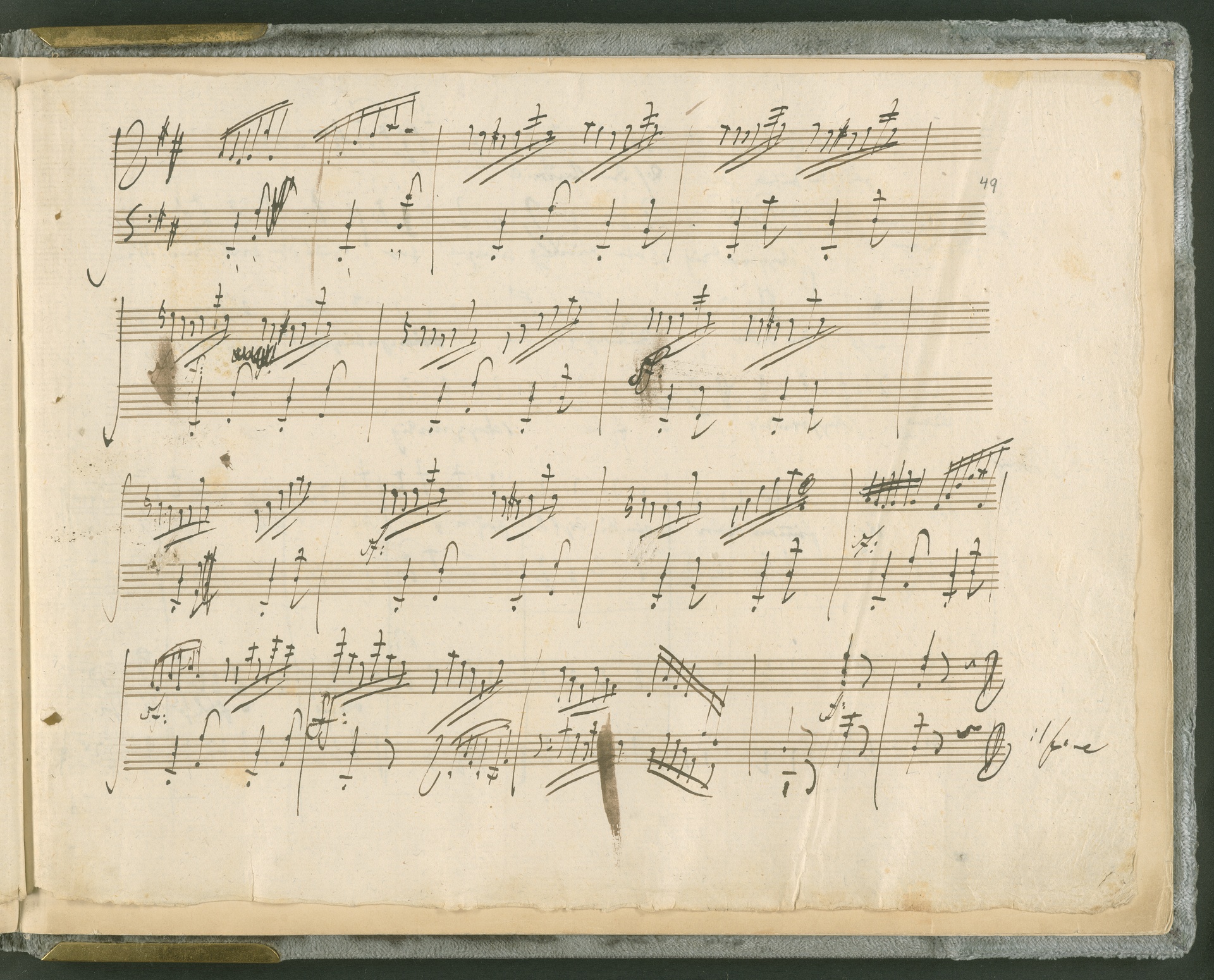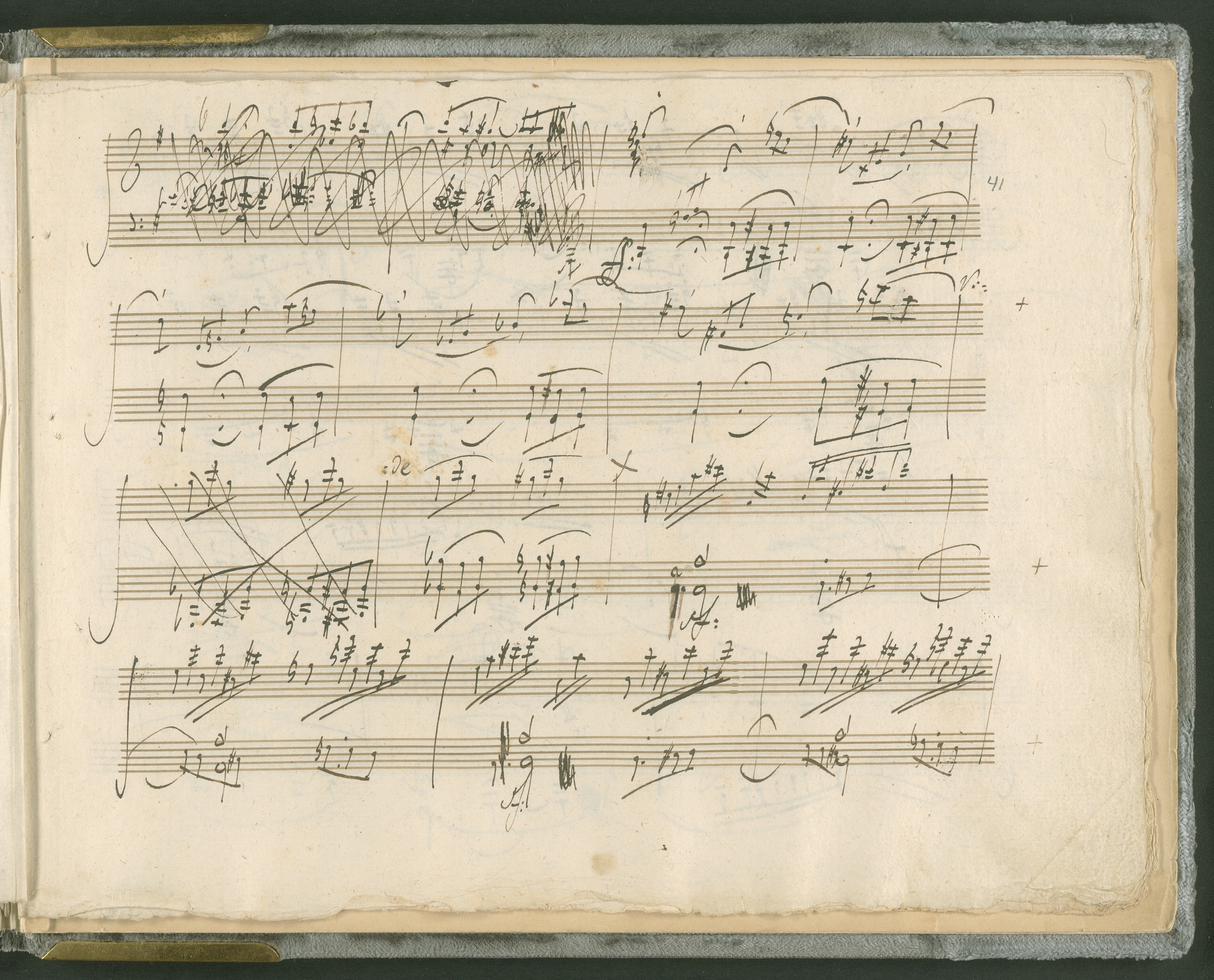 Abgebildet ist das Autograph der Klaviersonate op. 28, die Beethoven Joseph von Sonnenfels widmete. Sonnenfels (1732-1817) war Jurist, Lehrer, Aufklärer, Freimaurer und Schriftsteller, einer der führenden Köpfe der sozialen Reformen in Österreich (unter seiner Ägide wurde die Folter abgeschafft und die Polizeigewalt gezügelt). Sonnenfels war Inbegriff der aufklärerischen Ideen von Freiheit und Verehrung der Freien Künste - Prinzipien, denen Beethoven bekanntermaßen verpflichtet war. Ein Treffen des Komponisten mit Sonnenfels ist nicht nachweisbar, jedoch hatten sie gemeinsame Freunde, die ein Treffen ermöglicht haben können: Zum einen Freiherr van Swieten, ebenfalls ein Freund und Förderer der Künste. Möglicherweise hatte er Beethoven und Sonnenfels einander bei einem privaten Hauskonzert, derer er viele veranstaltete, vorgestellt. Zum anderen auch Johann Melchior von Birkenstock, Sonnenfels Schwager. In seinem Haus ging Beethoven eine Zeit lang ein und aus, weil die mit ihm befreundete Familie Brentano dort wohnte. Auch der Verlag, das Kunst- und Industrie-Comptoir, der die Sonate druckte, wird als möglicher Schnittpunkt der beiden Männer angeführt. Denkbar ist schließlich auch, daß Sonnenfels sogar Beethoven mit der Komposition der Klaviersonate beauftragte. Vielleicht war Beethoven jedoch auch schlicht beeindruckt von Sonnenfels Prinzipien und dessen Philosophie. (J.R.)