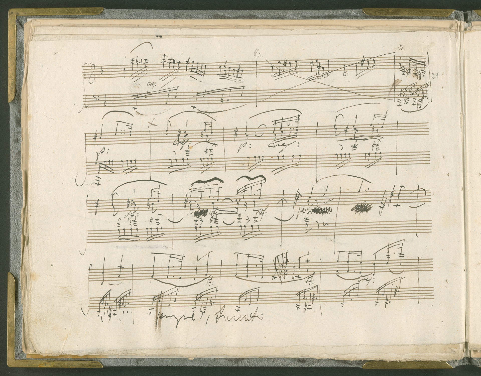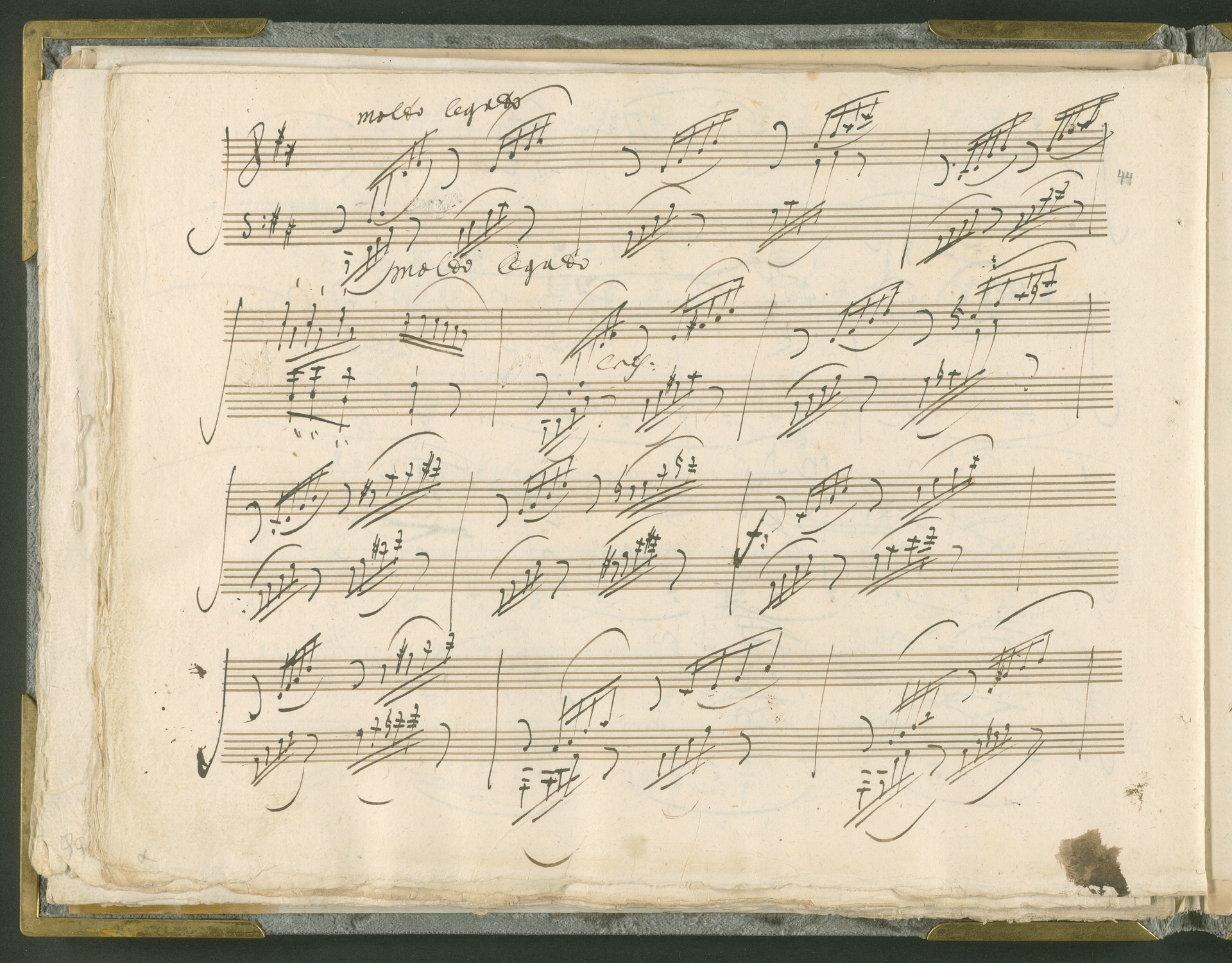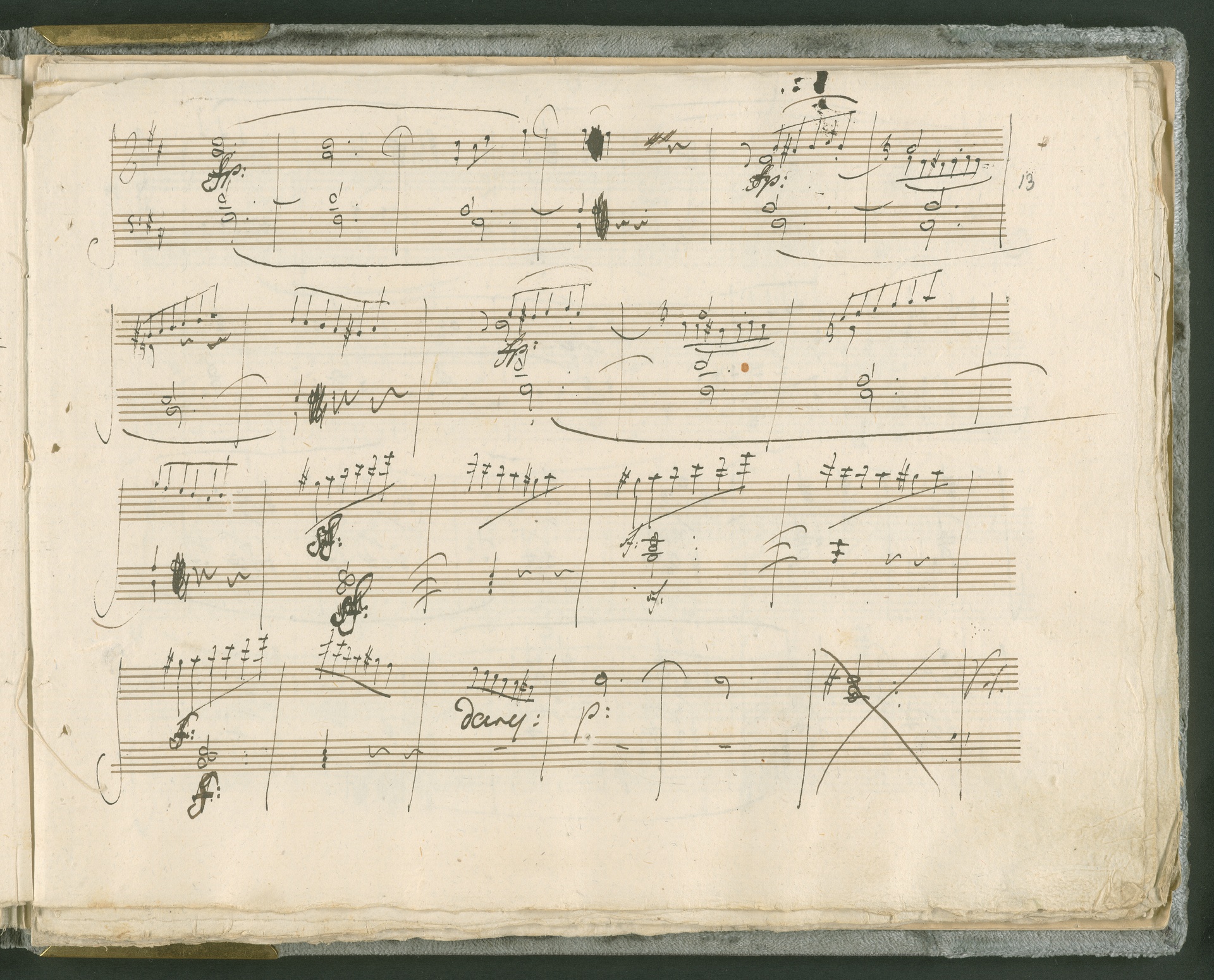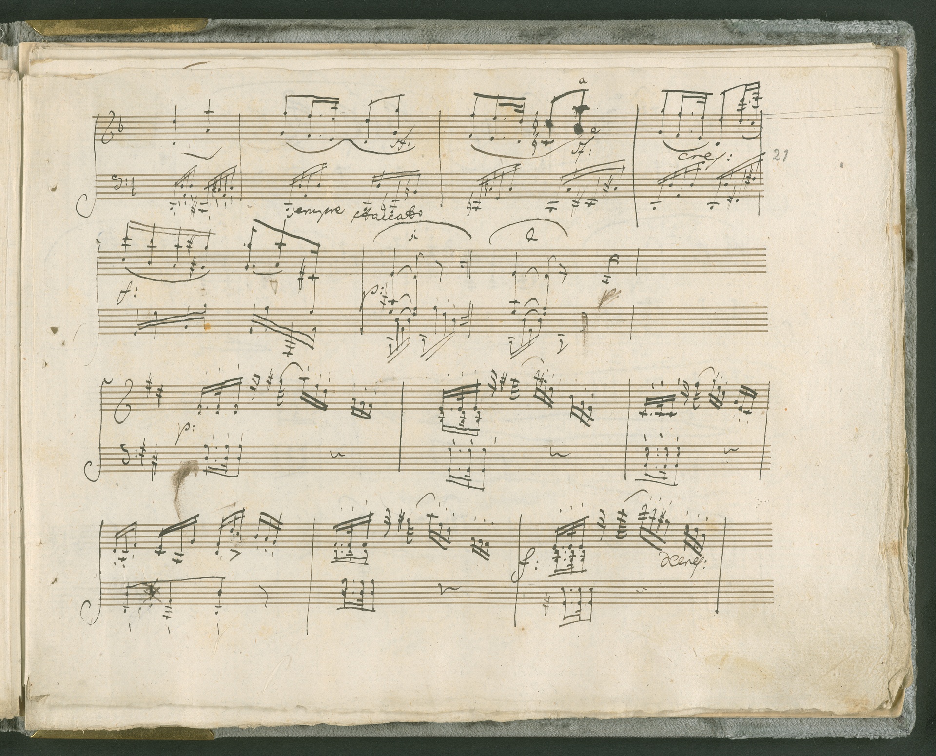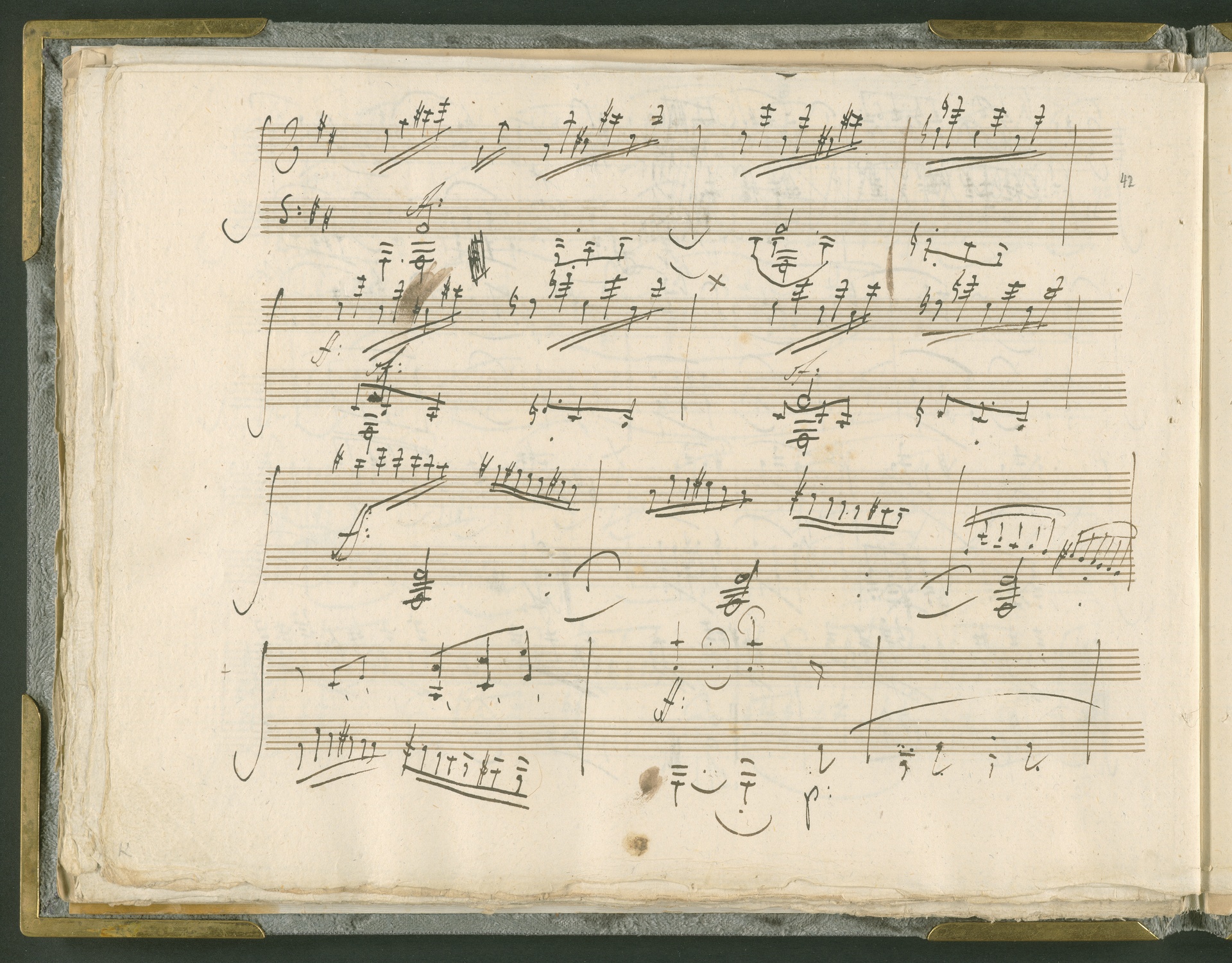 Abgebildet ist das Autograph der Klaviersonate op. 28, die Beethoven Joseph von Sonnenfels widmete. Sonnenfels (1732-1817) war Jurist, Lehrer, Aufklärer, Freimaurer und Schriftsteller, einer der führenden Köpfe der sozialen Reformen in Österreich (unter seiner Ägide wurde die Folter abgeschafft und die Polizeigewalt gezügelt). Sonnenfels war Inbegriff der aufklärerischen Ideen von Freiheit und Verehrung der Freien Künste - Prinzipien, denen Beethoven bekanntermaßen verpflichtet war. Ein Treffen des Komponisten mit Sonnenfels ist nicht nachweisbar, jedoch hatten sie gemeinsame Freunde, die ein Treffen ermöglicht haben können: Zum einen Freiherr van Swieten, ebenfalls ein Freund und Förderer der Künste. Möglicherweise hatte er Beethoven und Sonnenfels einander bei einem privaten Hauskonzert, derer er viele veranstaltete, vorgestellt. Zum anderen auch Johann Melchior von Birkenstock, Sonnenfels Schwager. In seinem Haus ging Beethoven eine Zeit lang ein und aus, weil die mit ihm befreundete Familie Brentano dort wohnte. Auch der Verlag, das Kunst- und Industrie-Comptoir, der die Sonate druckte, wird als möglicher Schnittpunkt der beiden Männer angeführt. Denkbar ist schließlich auch, daß Sonnenfels sogar Beethoven mit der Komposition der Klaviersonate beauftragte. Vielleicht war Beethoven jedoch auch schlicht beeindruckt von Sonnenfels Prinzipien und dessen Philosophie. (J.R.)