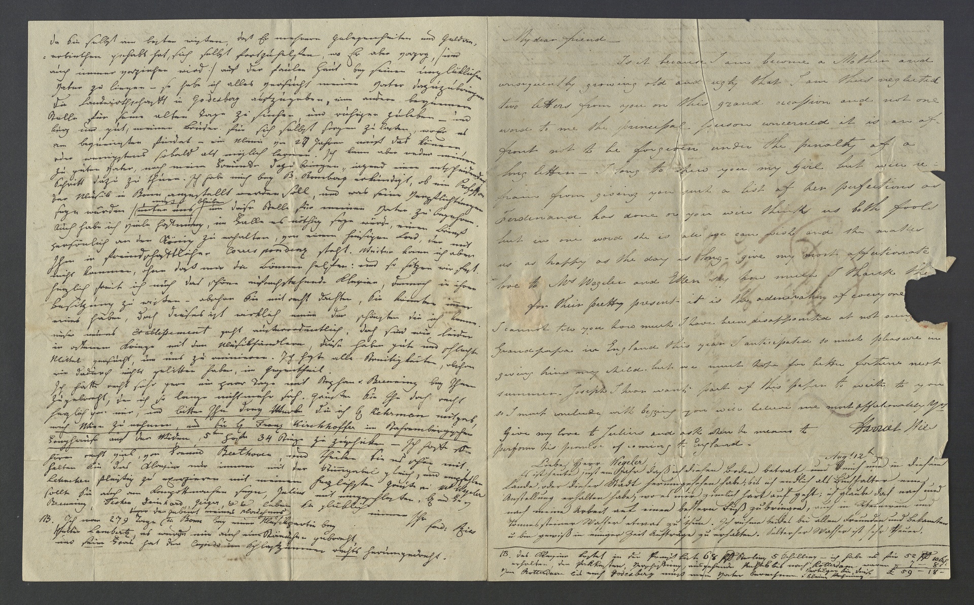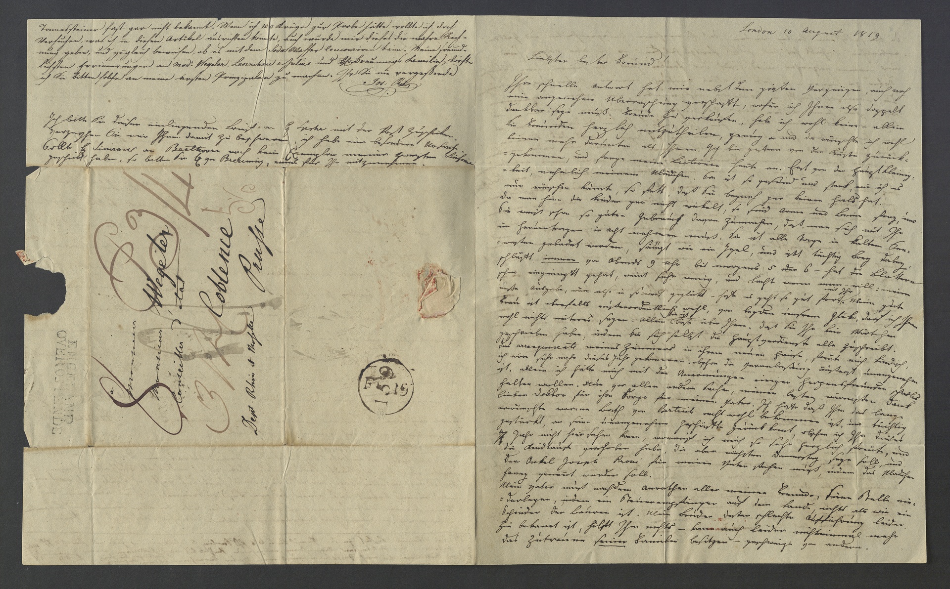 Ferdinand Ries, Brief mit einem Zusatz von Harriet Ries und einem Schreiben von Peter Joseph Ries an Franz Gerhard Wegeler in Koblenz, London, 10. August 1819, Autograph