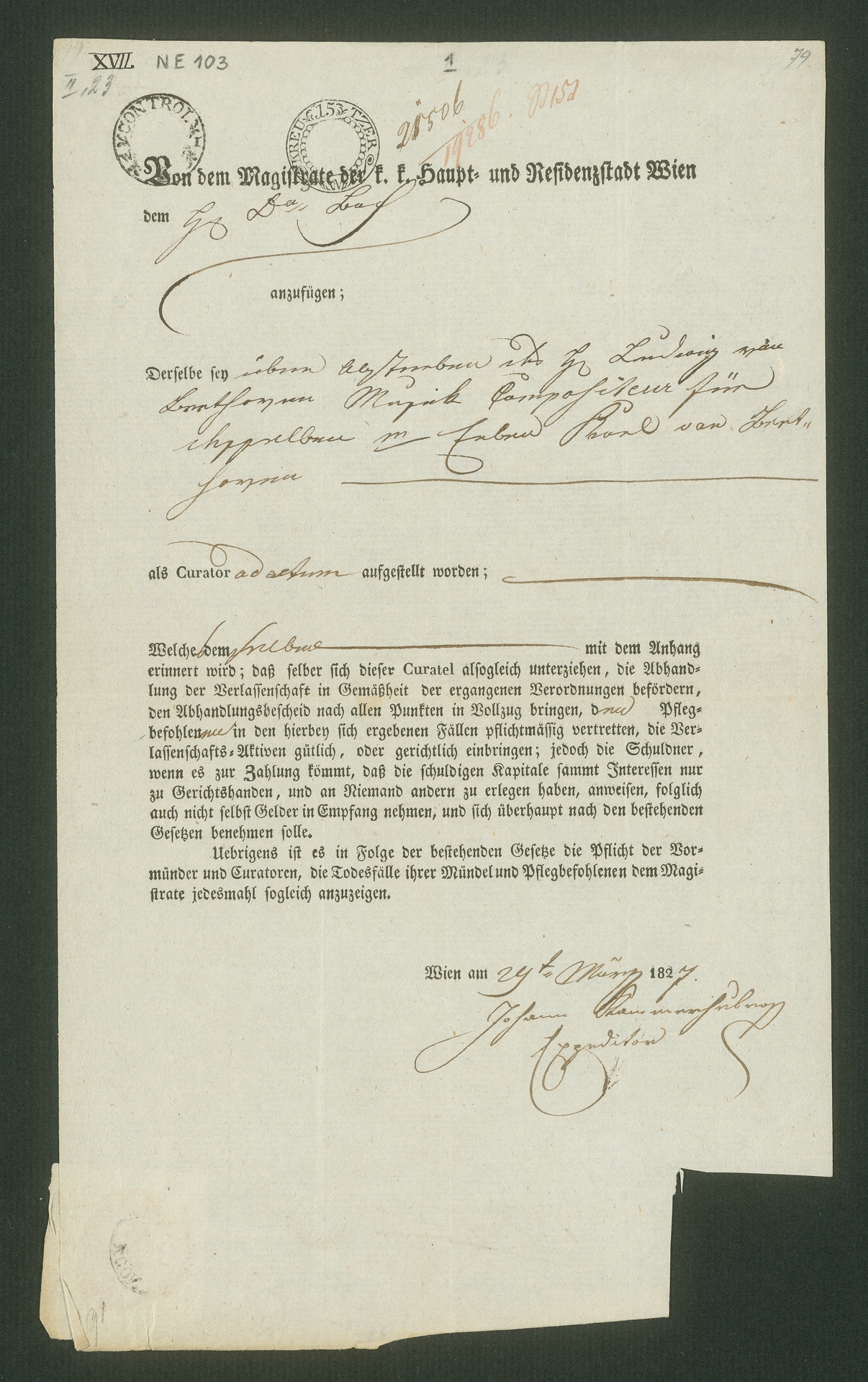 Johann Baptist Bach, Ernennungsurkunde zum Kurator des Karl van Beethoven durch den Wiener Magistrat, Wien, 29. März 1827