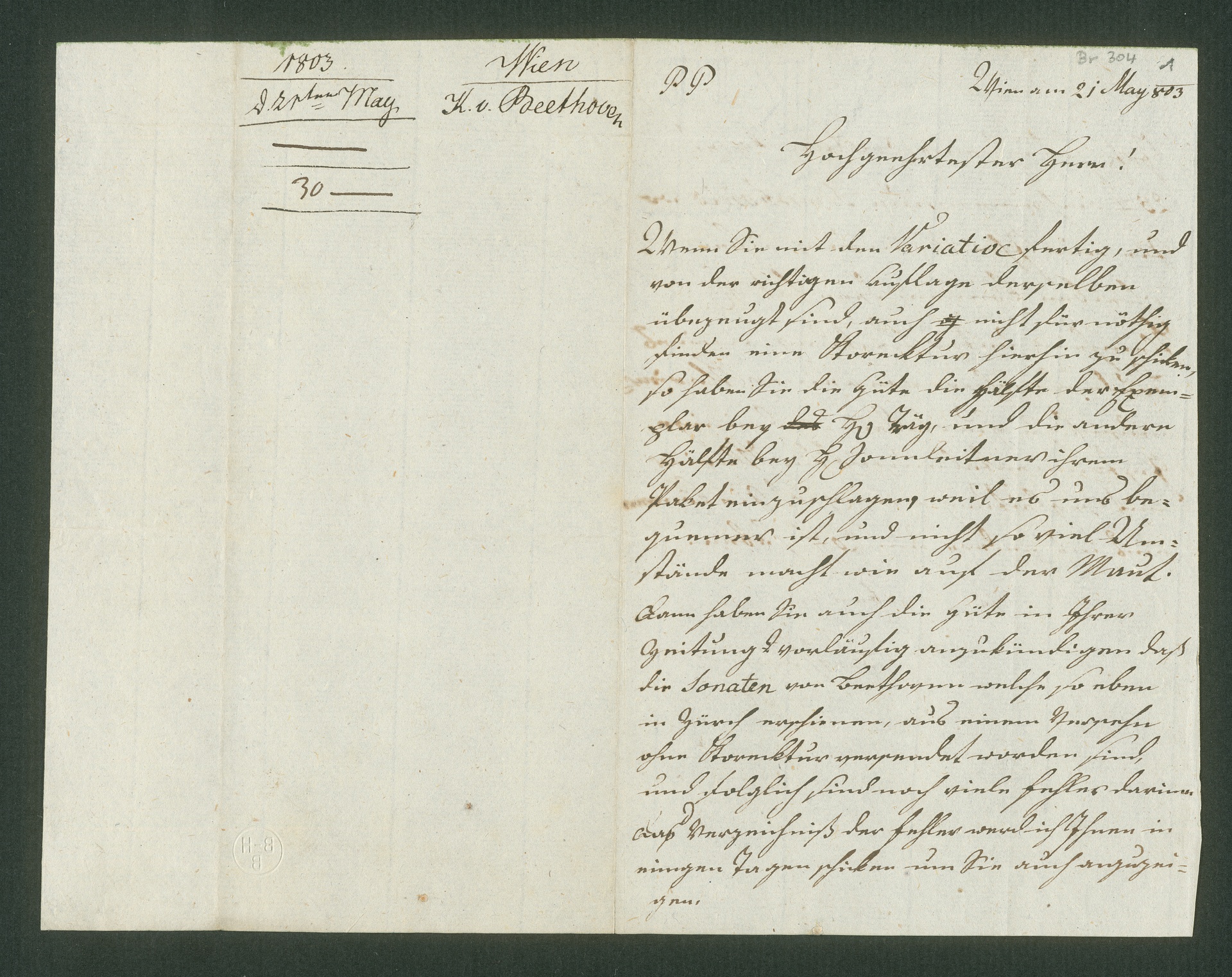 Kaspar Karl van Beethoven, Brief an Breitkopf & Härtel in Leipzig, Wien, 21. Mai 1803, Autograph