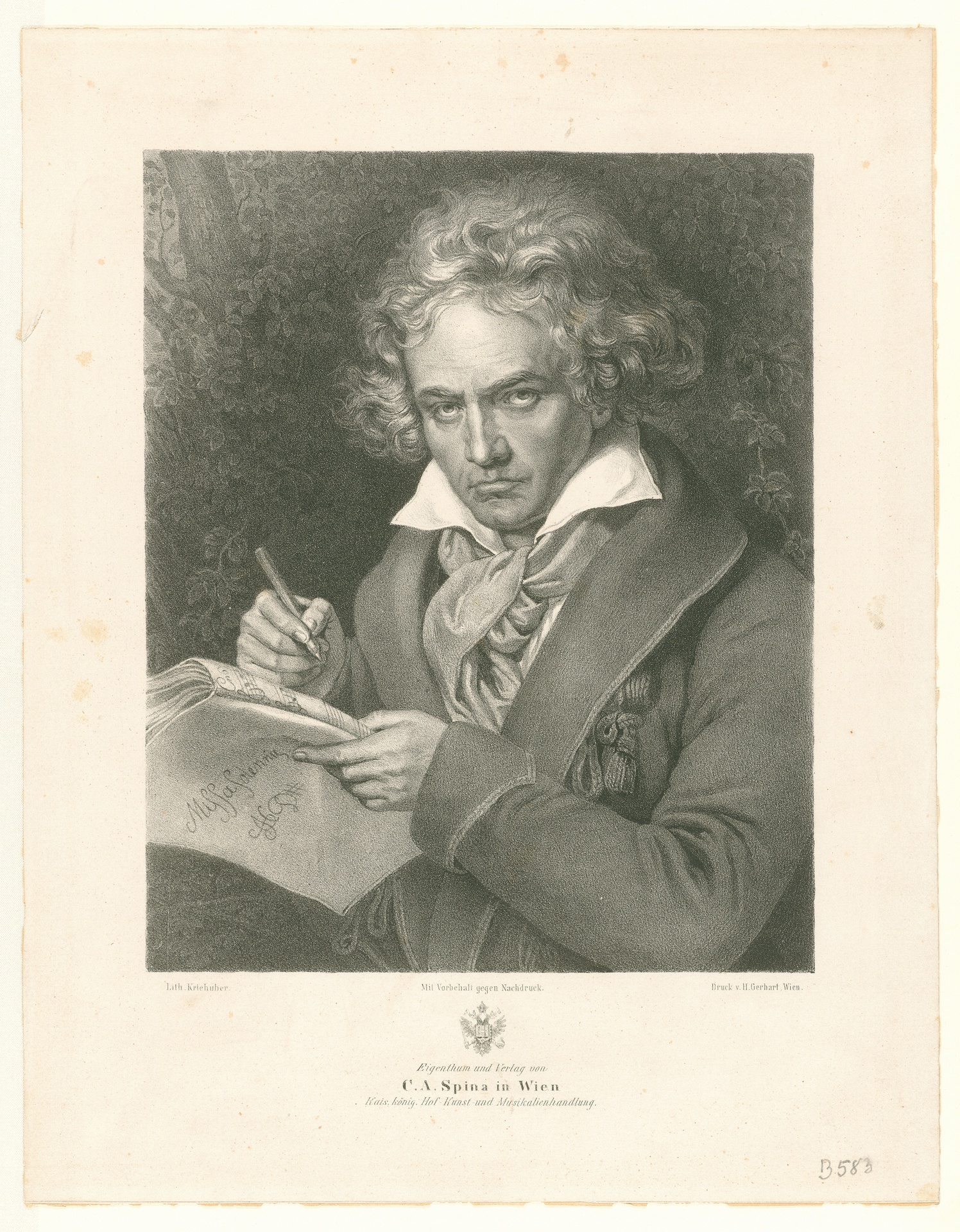 Ludwig van Beethoven mit dem Manuskript der Missa solemnis - Lithographie von Josef Kriehuber nach dem Gemälde von Joseph Stieler aus dem Jahr 1820, gedruckt von H. Gerhart, erschienen bei C. A. Spina, Wien, Mitte 19. Jahrhundert