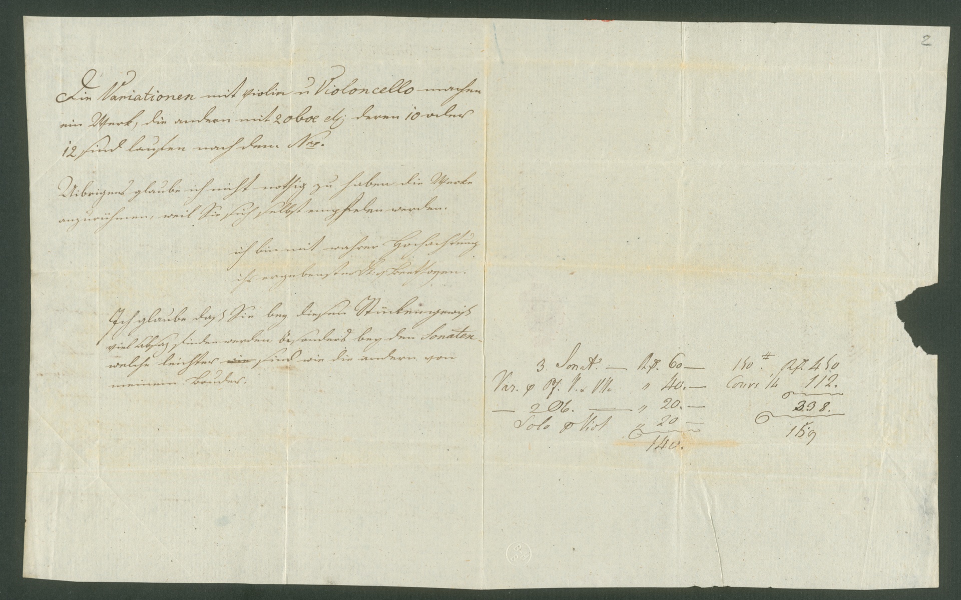 Auf Bl. 2r befinden sich einige Berechnungen des Verlagsinhabers Härtel, die mit den angebotenen Werken und deren Preisen zusammen hängen. (J.R.)