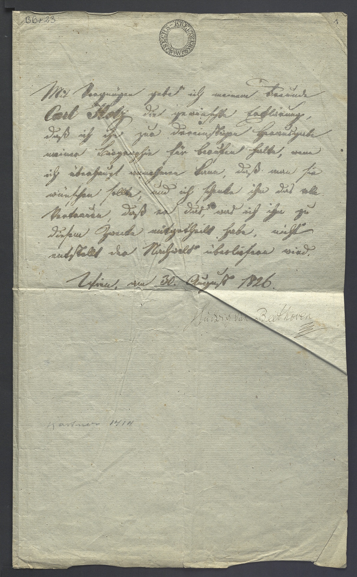 Beethoven formuliert ein offensichtlich von Holz gewünschte Erklärung, mit der er seinen Freund "zur dereinstige Herausgabe meiner Biographie für berufen" hält und ihm sein volles Vertrauen ausspricht, dass dieser "das, was ich ihm zu diesem Zwecke mitgetheilt habe, nicht entstellt der Nachwelt überliefern wird".