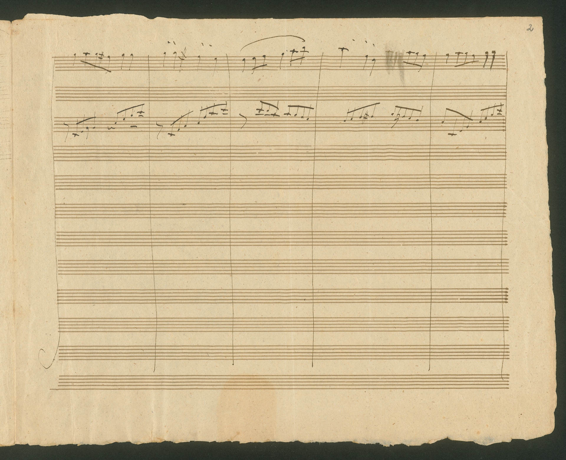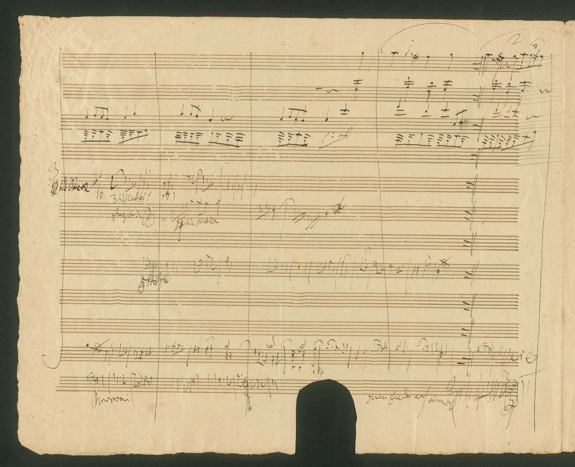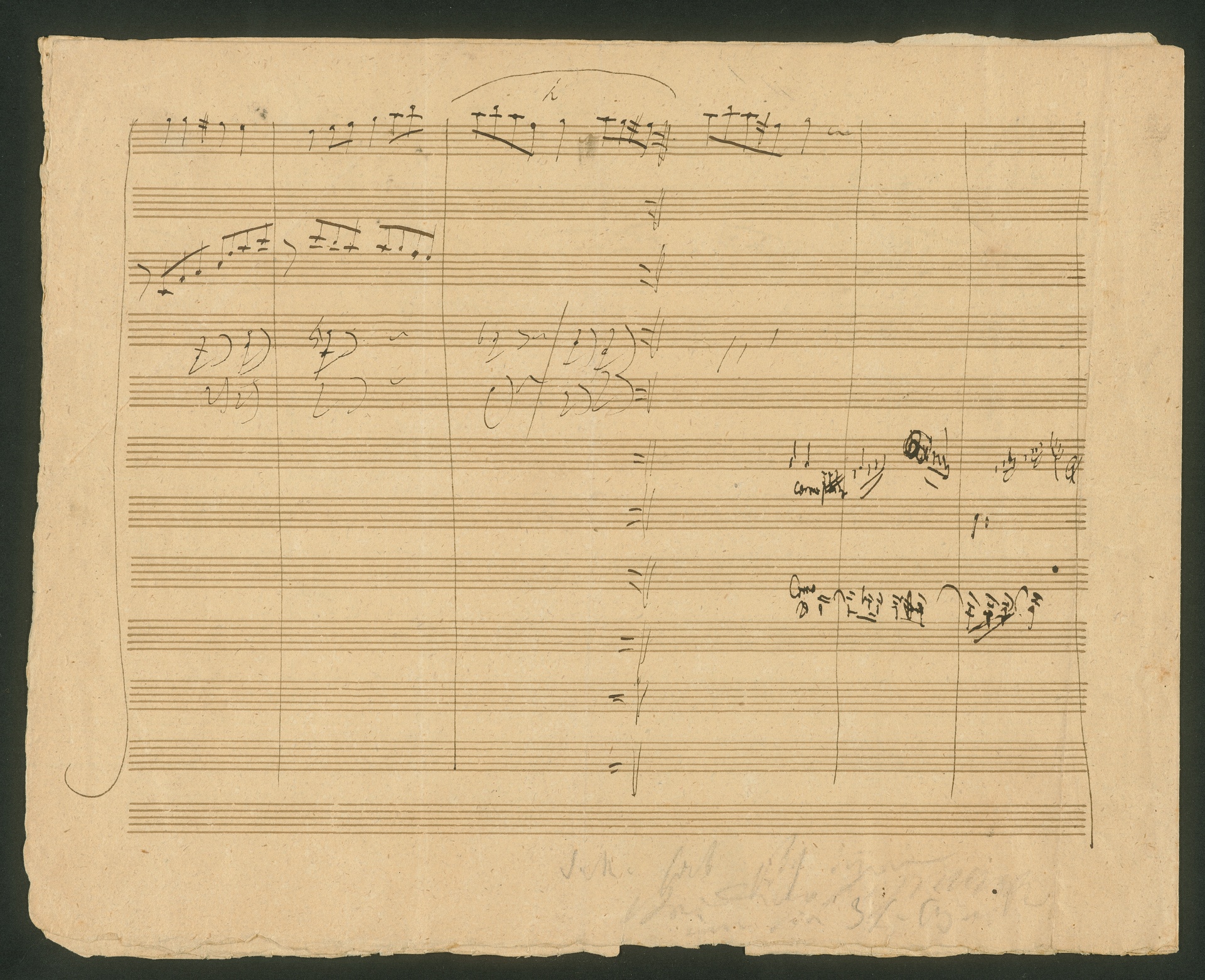 160 Jahre lang galt der "Mythos 10. Sinfonie" als eine der schönsten und beliebtesten Beethoven-Legenden. Gestützt wurde sie durch den Bericht des Beethoven-Freundes Karl Holz, dem er den ersten Satz dieser Sinfonie auf Klavier vorgespielt haben soll. Man glaubte jedoch, dass außerhalb von Beethovens Vorstellung nichts davon existiert habe. Mittlerweile weiß man es besser: zur 10. Sinfonie existiert eine große Anzahl von Skizzen, u.a. auch auf dem vorliegenden Blatt. Deutlich kann man erkennen, dass die Noten mit zwei unterschiedlichen Federn geschrieben wurden, in den oberen Systemen mit einer dickeren als in den unteren. Auch sehen die oberen Systeme, die auf der ersten Seite mit Holzblasinstrumenten bezeichnet sind, ordentlich und sauber geschrieben aus, gar nicht wie Skizzen. In der Tat handelt es sich in diesen Zeilen um eine unfertige Partitur, deren Musik jedoch bereits vollendet war, nämlich um das Trio zu WoO 18, dem sogenannten Yorkschen Marsch. Die Skizzen zur 10. Sinfonie sind in dünnerer Feder darunter geschrieben und wie bei vielen Skizzen mit erklärenden Worten versehen: Auf Bl. 1r (Bild 1) steht auf der Mitte des Blattes links (unterhalb des Contrafagotts) "harmonie allein", ein Instrumentierungshinweis (nur Bläserstimmen). Über der 2. Zeile von unten, rechts vermerkte Beethoven "ohne 2 theile", eine Notiz zur Anlage des ersten Satzes dieser Sinfonie. Auf der Rückseite gibt es weitere Bemerkungen, so bei Gedanken zu weiteren Sätzen, die mit "3tes Stück", "fuga in B" und "5tes Stück" gekennzeichnet sind. Beethoven hat, wie wir wissen, nie eine 10. Sinfonie fertiggestellt. Aber sie ins Reich der Legende zu verbannen, ist, wie nicht zuletzt dieses Skizzenblatt zeigt, sicher verkehrt. (J.R.)