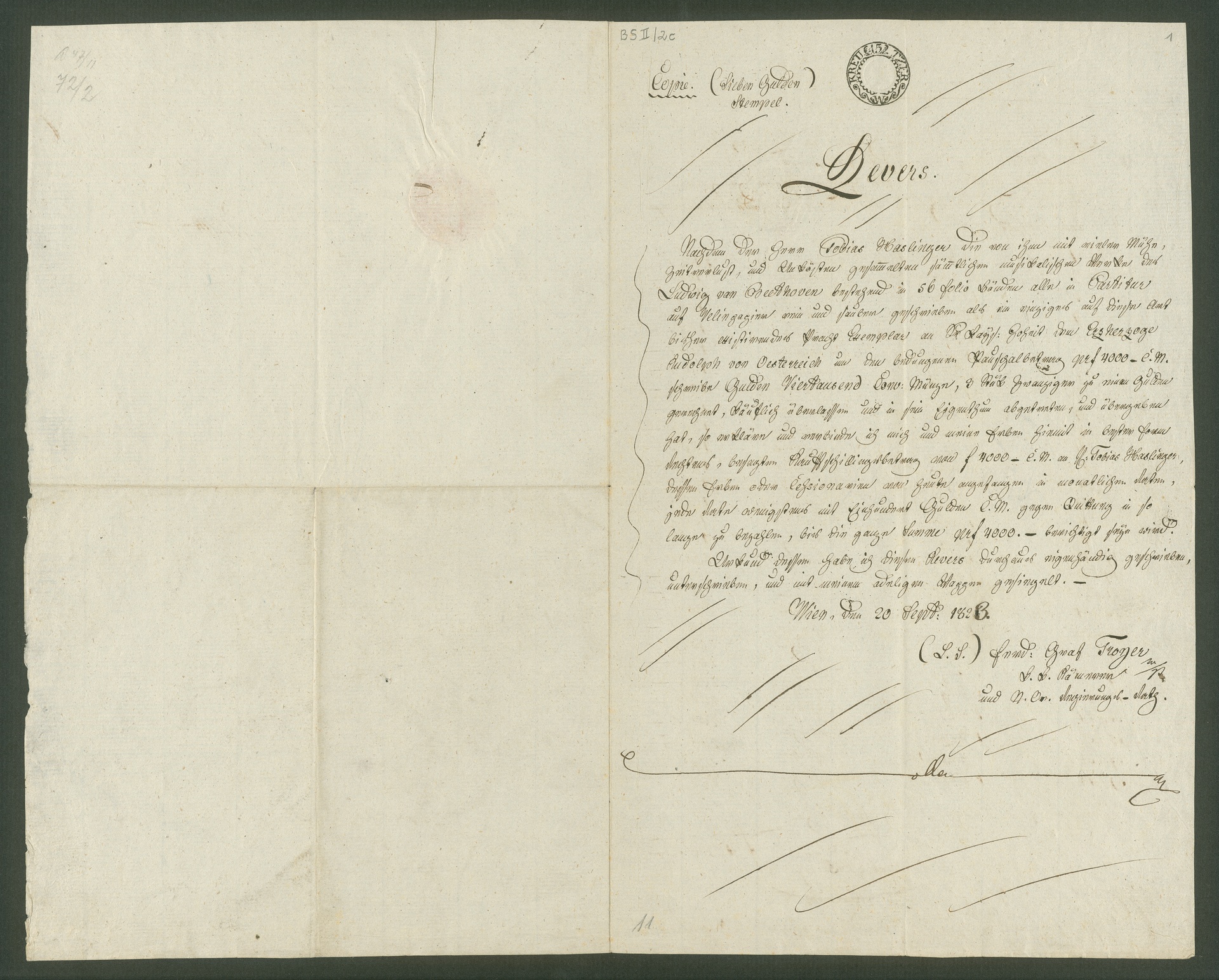 Vertrag zwischen Tobias Haslinger und Graf Ferdinand von Troyer im Auftrage des Erzherzogs Rudolph über den Erwerb der handschriftlichen Prachtsammlung Beethovenscher Werke vom 20. September 1823, Abschrift