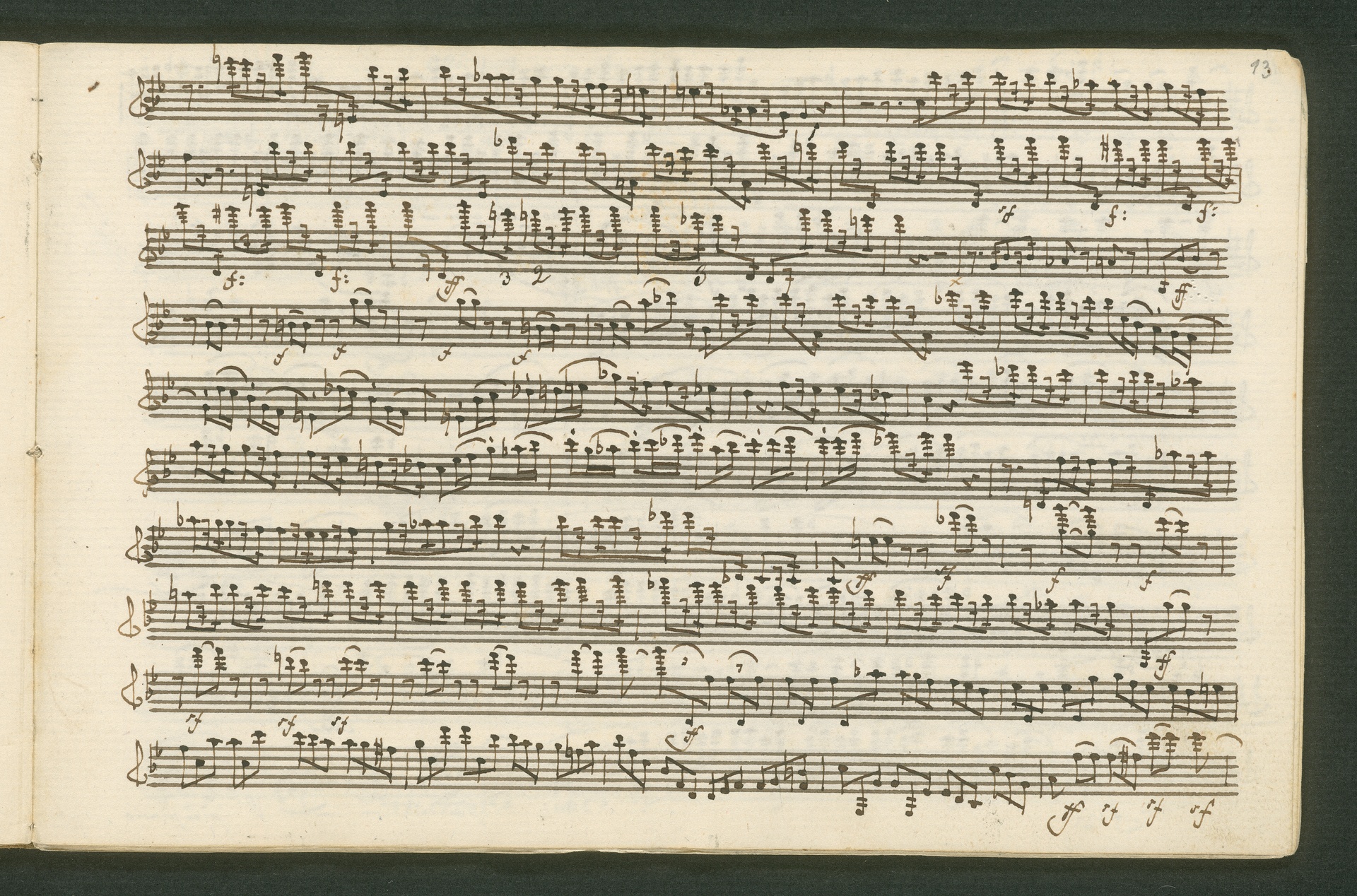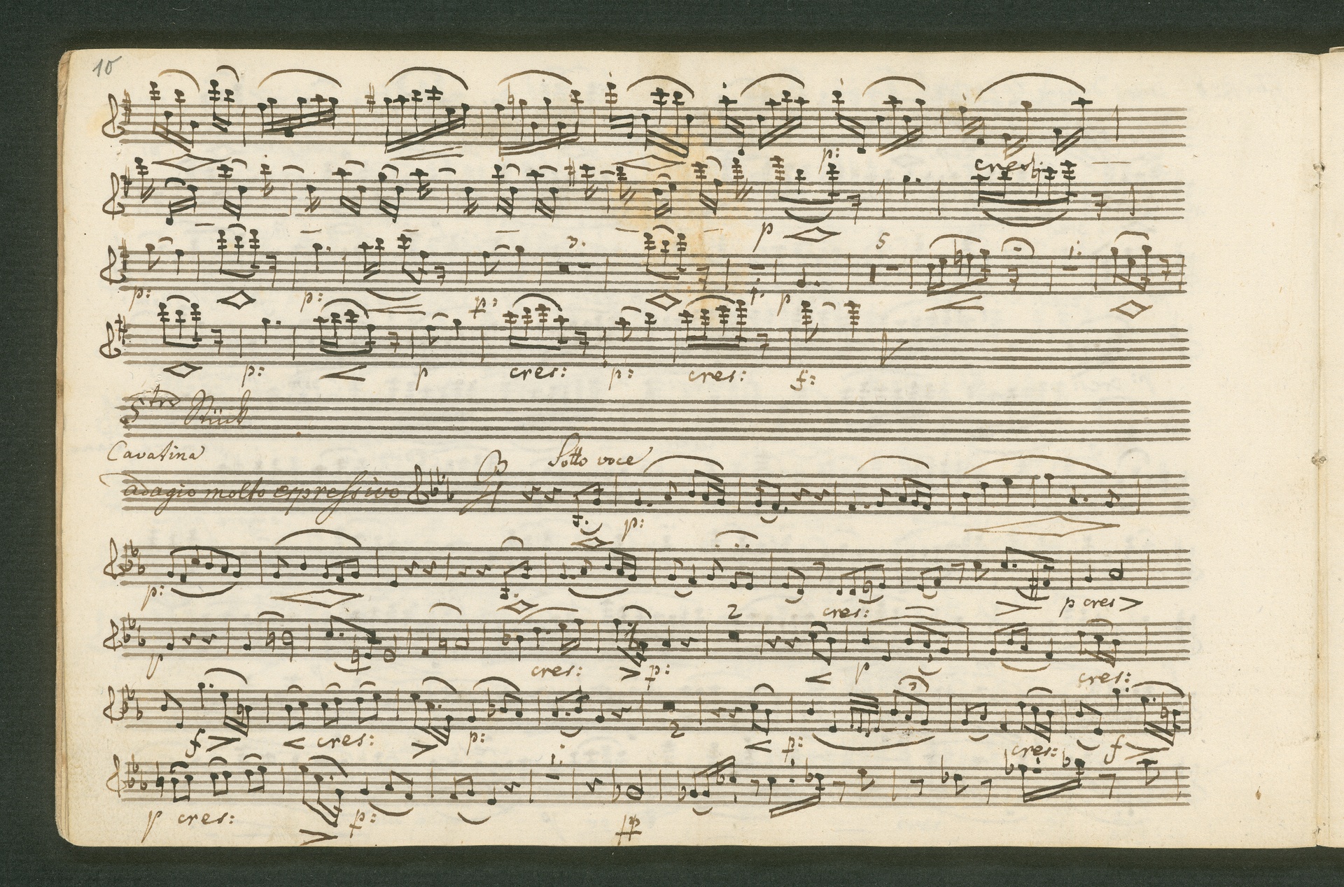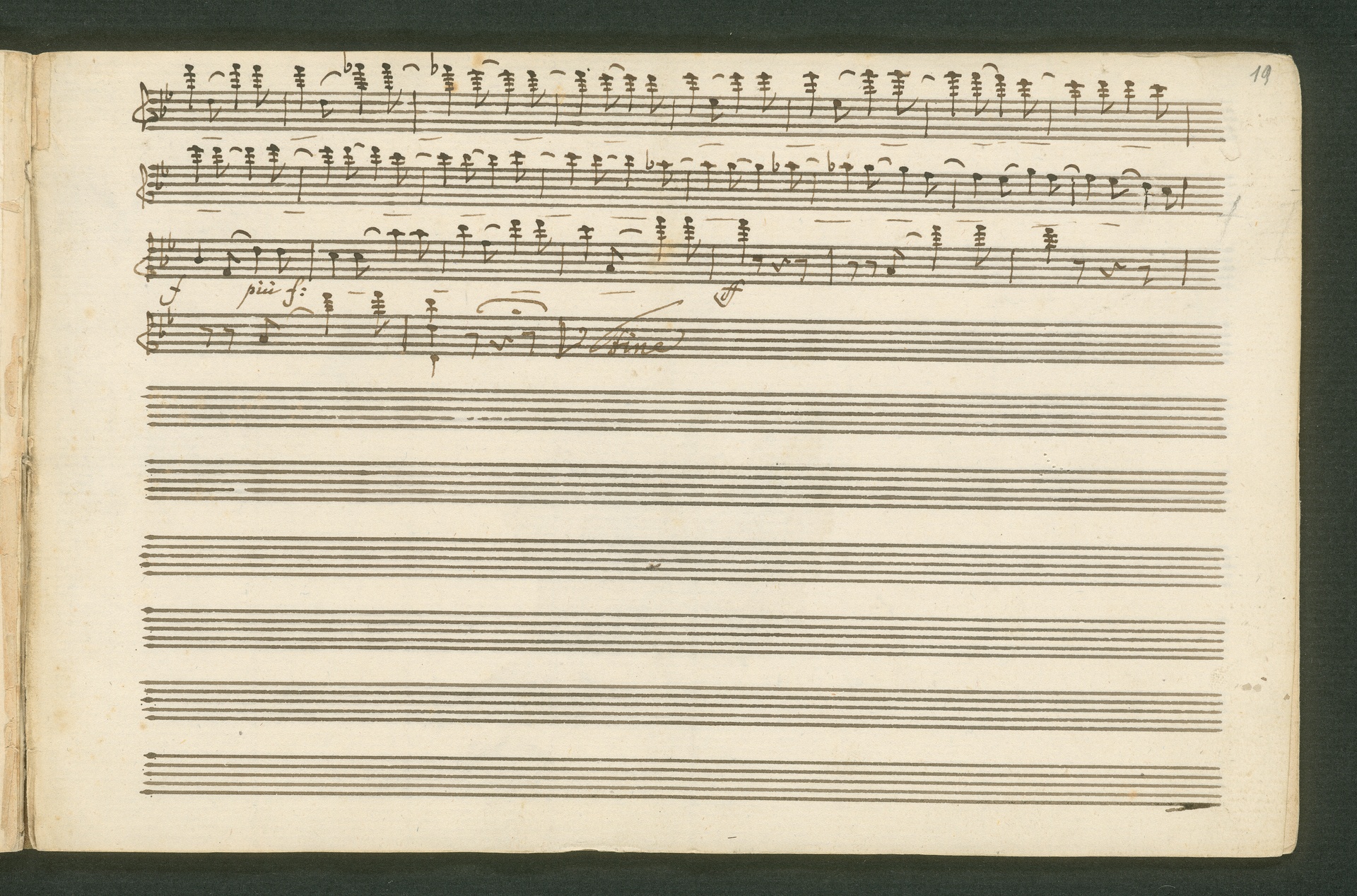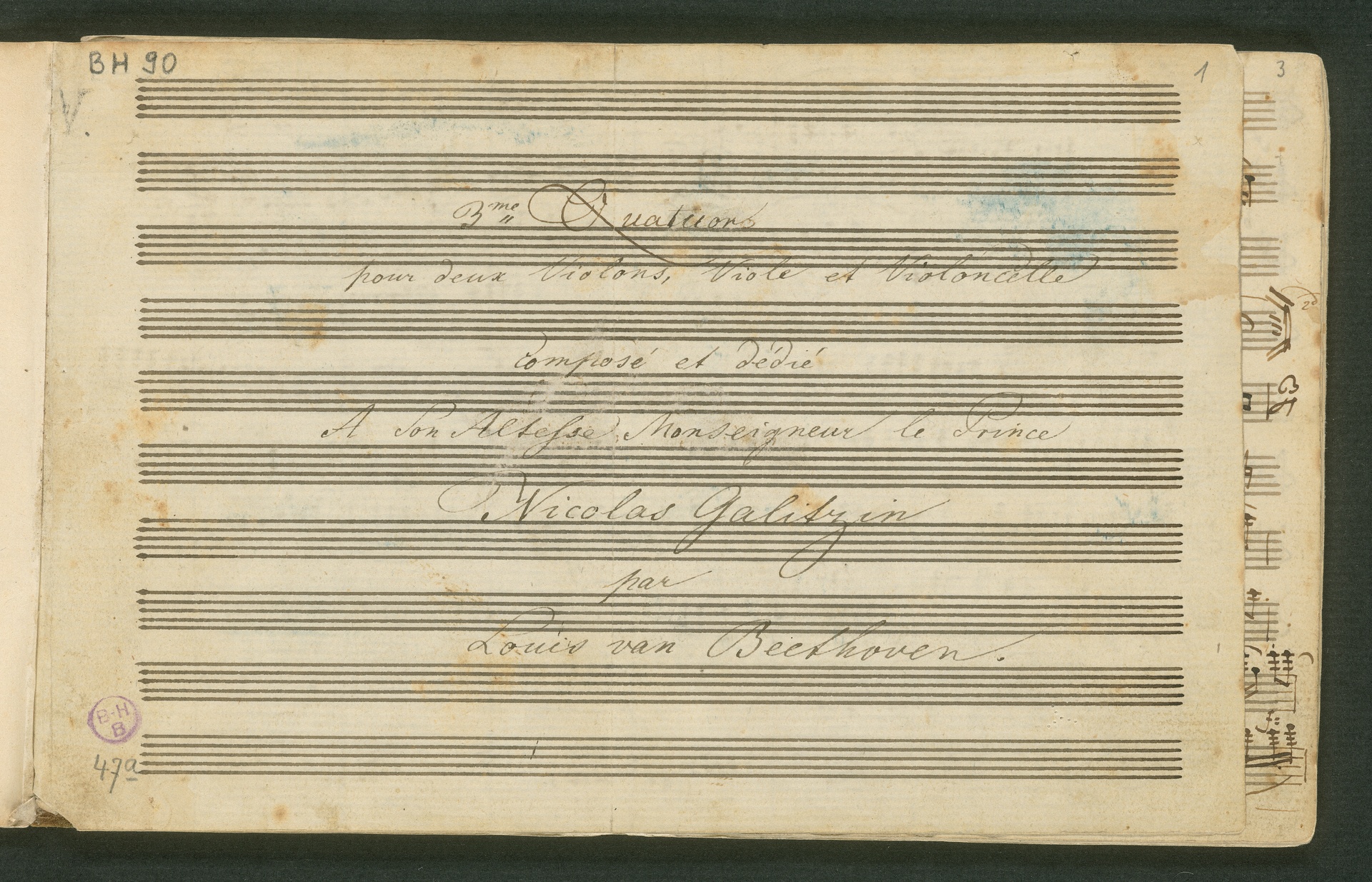 Fürst Nikolaus Borissowitsch Galitzin war einer von Beethovens glühendsten Bewunderern. Der in St. Petersburg lebende Russe war Musikliebhaber und ein begabter Cellist. Schon am 9. November 1822 bestellt er schriftlich bei Beethoven "ein, zwei oder drei Neue Quartette". Den Auftrag nahm Beethoven 1823 an, die Arbeit zog sich aber bis 1825 hin - parallele Projekte, vor allem die 9. Sinfonie, zögerten die Arbeit an den Quartetten hinaus. Der Fürst - seine Ungeduld wurde durch seine übergroße Bewunderung für Beethoven und die Subskription der Missa Solemnis gezügelt - erhielt schließlich von Beethoven die drei Streichquartette op. 127, 130 und 132 gewidmet. Beethoven sandte ihm im Januar 1826 überprüfte Kopistenabschriften in Stimmen nach Rußland, also quasi "gebrauchsfertiges" Material. Die vorliegende Abschrift von op. 130 ist das Widmungsexemplar, mit der Widmung an den Fürsten auf der ersten Seite der ersten Violine. Beethoven schickte dem Fürsten op. 130 noch in seiner ursprünglichen Konzeption, wie er sie im November 1825 fertig stellte, mit der "Großen Fuge" (später ausgegliedert als eigenständiges op. 133) als Schlusssatz.