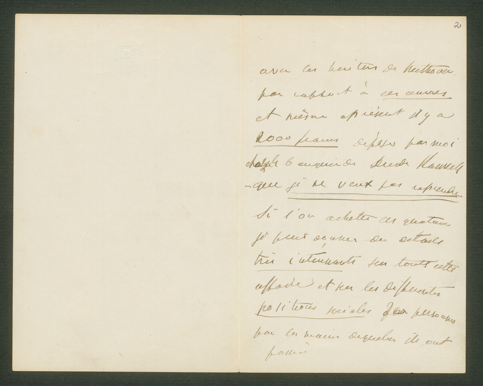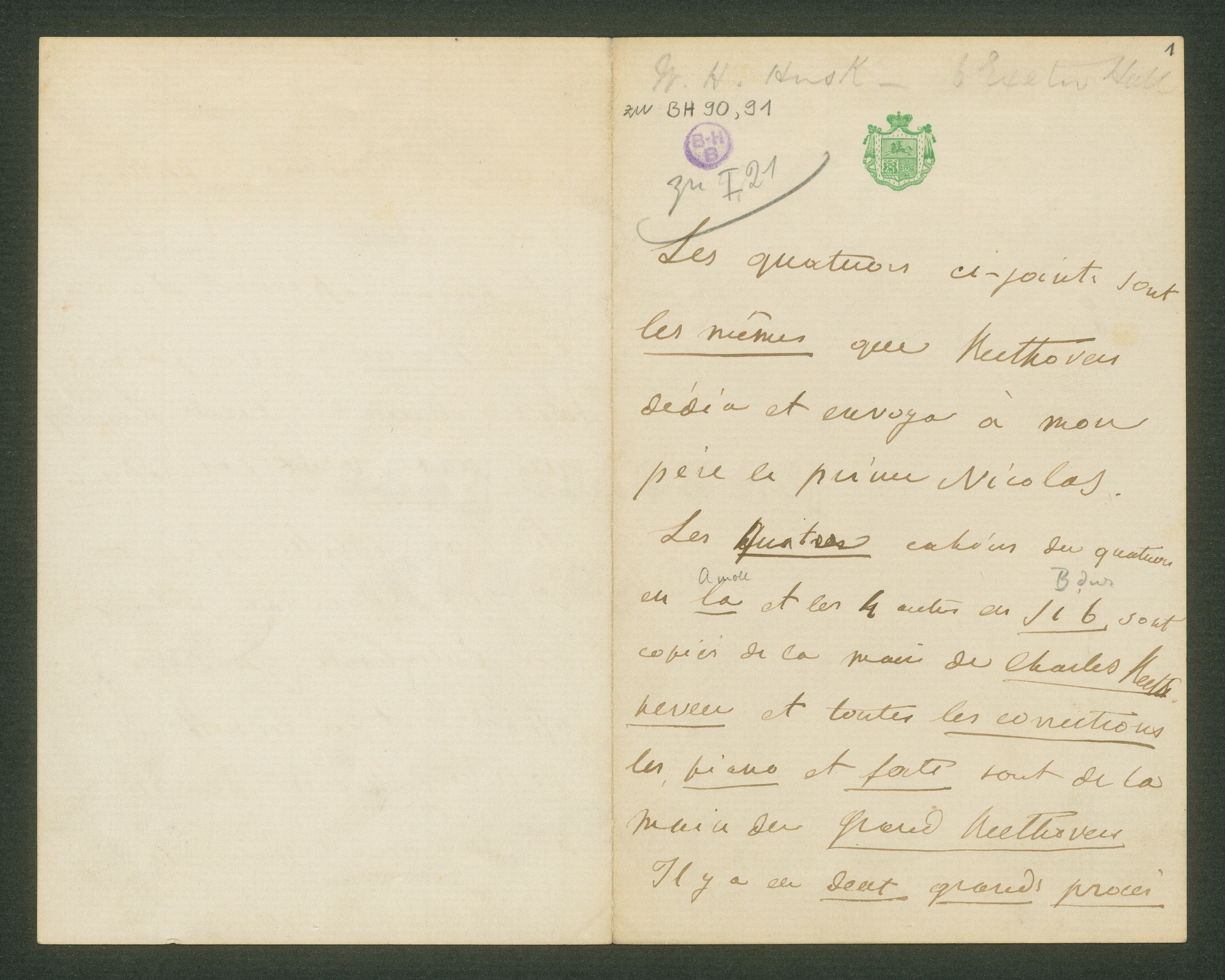 Der Stimmenabschrift des Quartetts op. 130 liegt ein Schreiben Brief ohne Datum und Unterschrift in französischer Sprache bei. Aus dem ersten Satz "Die beigefügten Quartette sind die, welche, Beethoven meinem Vater, dem Fürsten Nikolaus widmete und schickte" schließt man, dass der Brief von der Hand des einzigen Sohnes des Fürsten Nikolaus Galitzin, Jurij Nikolajewitsch Galitzin stammt. Die früher häufig geäußerte Vermutung, die Abschrift der Quartette sei von Beethovens Neffen Karl angefertigt worden (sie ist falsch, einer von Beethovens Berufskopisten, Wenzel Rampl, erstellte sie), stammt aus diesem Schreiben. Außerdem bestätigt Jurij Galitzin, er habe den Rechtsstreit um die noch ausstehende Bezahlung Beethovens - als der Komponist starb, hatte er noch immer keinen Lohn für die Quartette erhalten - mit 2000 Francs an dessen Erben beigelegt. Mit dem Brief bietet der junge Fürst die Quartette zum Kauf an. (J.R.)