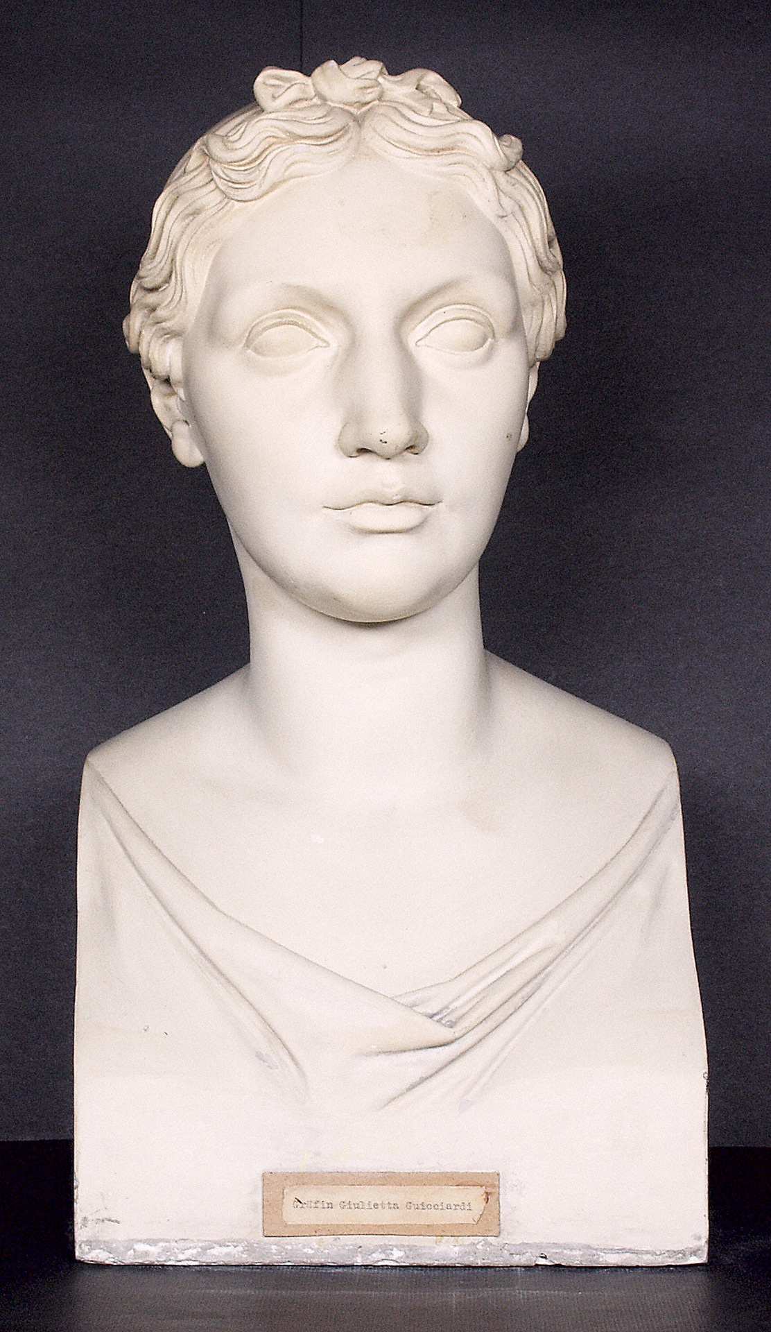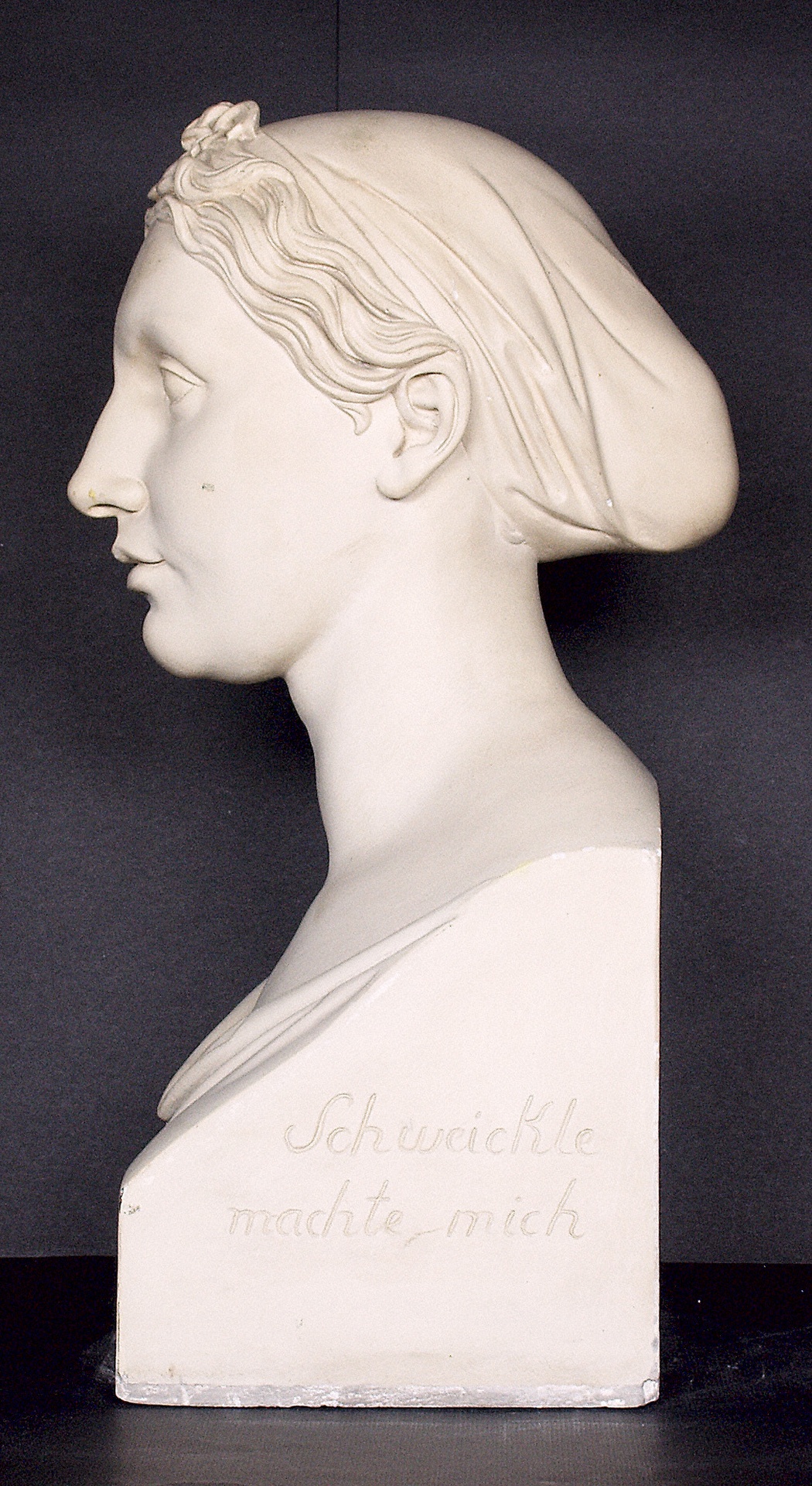 Zu den wenigen heute noch erhaltenen Arbeiten Schweickles aus seiner Zeit in Italien gehört die hier gezeigte Büste Julie Guicciardis, die wohl in Neapel entstanden sein dürfte. Denn dort lebte die Comtesse zwischen 1803 und 1822 gemeinsam mit ihrem Mann Wenzel Robert Graf von Gallenberg. Ihr Portrait in Marmor, von der hier ein im Jahr 1913 angefertigter Gipsabguß zu sehen ist, wird daher wohl zwischen 1806 und 1822 entstanden sein. (S.B.)