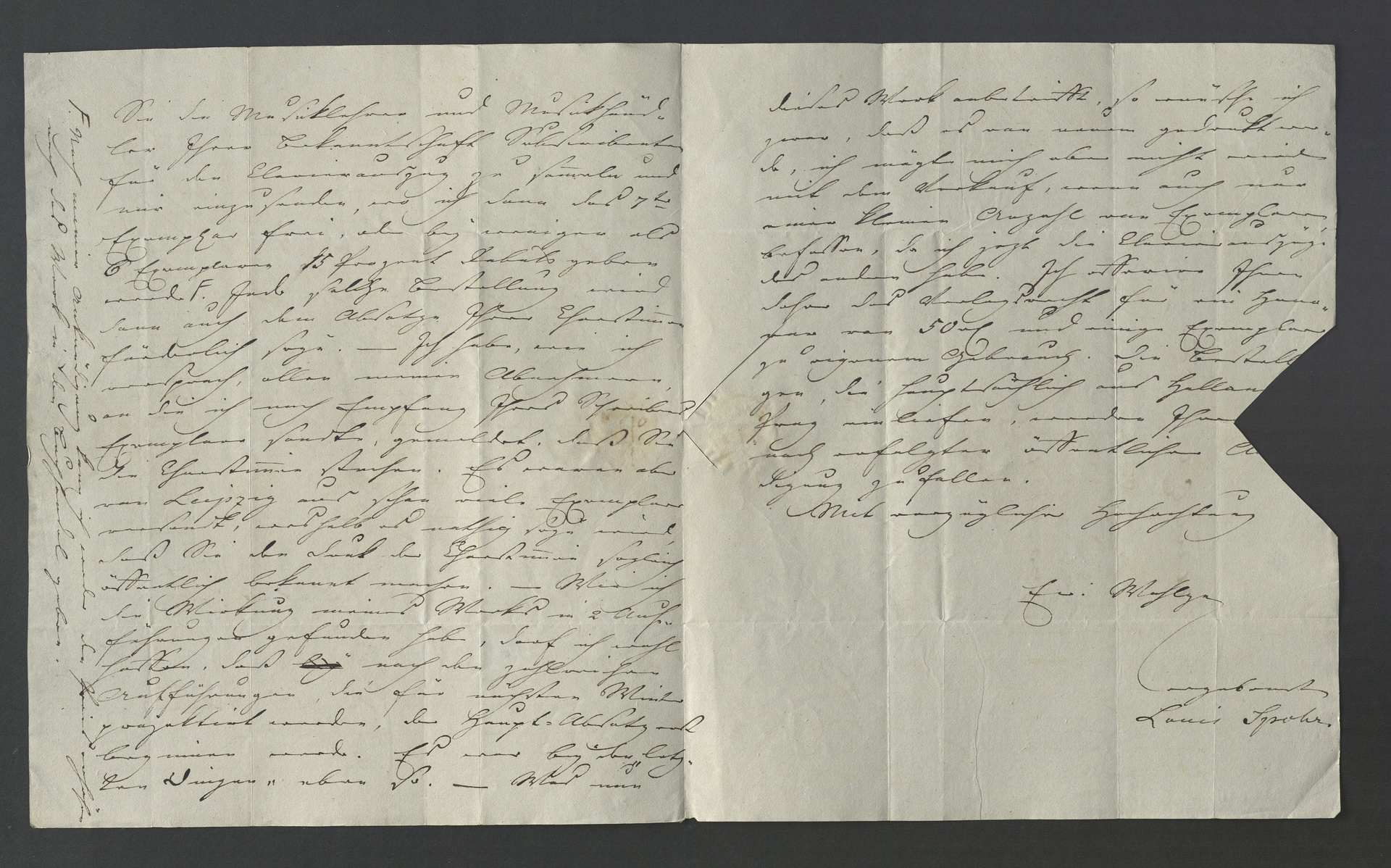 Text: "Wohlgeborner Herr, Die, von Ihnen mir zur Ansicht zugeschickte Stelle, die ich hier wieder beylege, ist ganz richtig aufgeschrieben. Sie steht auch eben so im Clavierauszuge. Doch ist der Text in diesen 2 Takten allerdings von wenig weiter durcheinander gedruckt. Ihr Kopist hat doch nicht vergessen, die Alt- und Tenor-Stimme in die, von Ihnen gewählten (von pag. 105 an bis zu Ende des Chors) zu transponiren? Überhaupt bitte ich Sie, eine recht genaue Correktur der Chorstimmen zu veranlassen. In der Clavierbegleitung meines Clavierauszugs sind leider einige Fehler stehen geblieben, doch zum Glück nur solche, die sich leicht auffinden lassen. - Die, von Ihnen vorgeschlagene Nummerierung der Chöre scheint mir nöthig und zweckmäßig. Hinsichtlich des Verkaufs der Clavierauszüge, wünsche ich nur, dass bey Ihnen welche in Commision liegen, damit mit den Chorstimmen auch diese bey Ihnen bezogen werden können. Wollen Sie sich aber güthigst für den Absatz derselben interessirn, so veranlassen Sie die Musiklehrer und Musikfreunde Ihrer Bekanntschaft Subscribenten für den Clavierauszug zu sammeln und mir einzusenden, wo ich dann das 7te Exemplar frei, aber bey weniger als 6 Exemplaren 15 Prozent Rabatt geben würde. Nach meiner Ankündigung kann ich weder den Preis erhöhen noch das Werk in den Buchhandel geben. Jede solche Bestellung wird dann auch dem Absatz Ihrer Chorstimmen förderlich seyn. - Ich habe, wie ich versprach, allen meinen Abnehmern, an die ich nach Empfang Ihres Schreibens Exemplare sandte, gemeldet, daß Sie die Chorstimmen stechen. Es waren aber von Leipzig aus schon viele Exemplare versandt, weshalb es nöthig seyn wird, daß Sie den Druck der Chorstimmen sogleich öffentlich bekannt machen. - Wie ich die Wirkung meines Werks in 2 Aufführungen gefunden habe, darf ich wohl hoffen, daß nach den zahlreichen Aufführungen, die für nächsten Winter projektirt werden, der Haupt-Absatz erst beginnen werde. Es war bey den "letzten Dingen" eben so. - Was nun dieses Werk anbetrifft, so wünschte ich zwar, daß es von neuem gedruckt werde, ich mögte mich aber nicht wieder mit dem Verkauf, wenn auch nur einer kleinen Anzahl von Exemplaren, befassen, da ich jetzt die Clavierauszüge des andern habe. Ich offerire Ihnen daher das Verlagsrecht für ein Honorar von 50 Rth. und einige Exemplare zu eigenem Gebrauch. Die Bestell[un]gen, die hauptsächlich aus Hollan[d und] Prag einlaufen, werden Ihnen [gleich?] nach erfolgter öffentlicher A[nkün]digung zufallen. Mit vorzüglicher Hochachtung Ew. Wohlgeb. ergebenster Louis Spohr.". Karl Traugott Goldbach, Spohr-Briefe: <http://bit.ly/1P4pFUC>