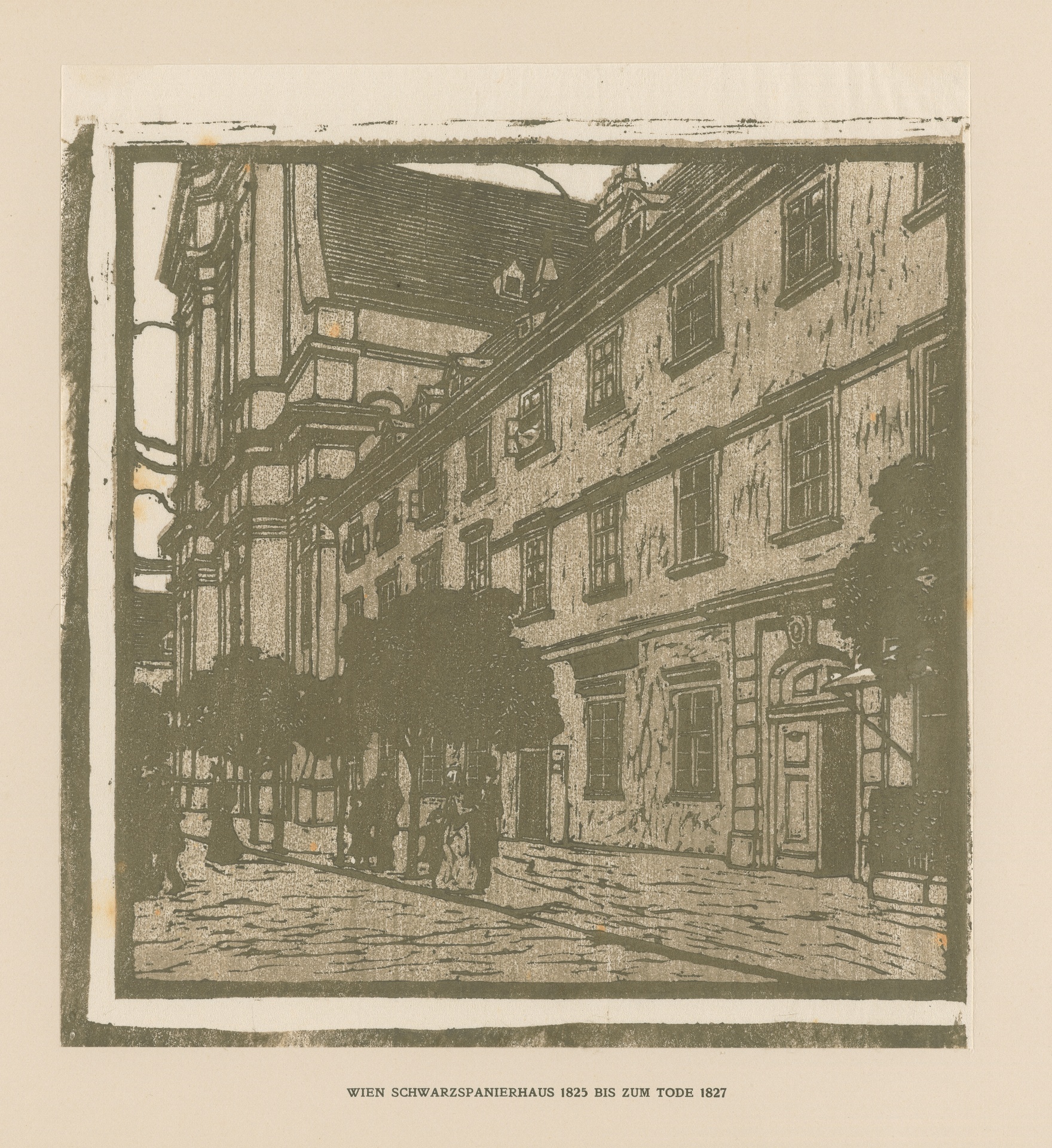 Wien, Alsergrund, Schwarzspanierstraße 15, Wohnung von Ludwig van Beethoven (Schwarzspanierhaus) - Holzschnitt von Carl Moll, im Aquarelldruckverfahren farbig gedruckt von der Wiener Werkstätte, Wien, um 1907