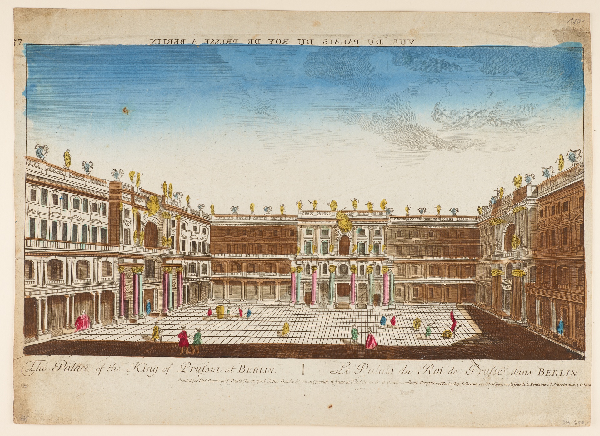 Ansicht des Königlichen Schlosses in Berlin - Anonymes Guckkastenbild, gedruckt von J. Chereau, Paris, verlegt von Thomas Bowles, John Bowles, Robert Sayers und von Henry Overton, London, 2. Hälfte des 18. Jh.