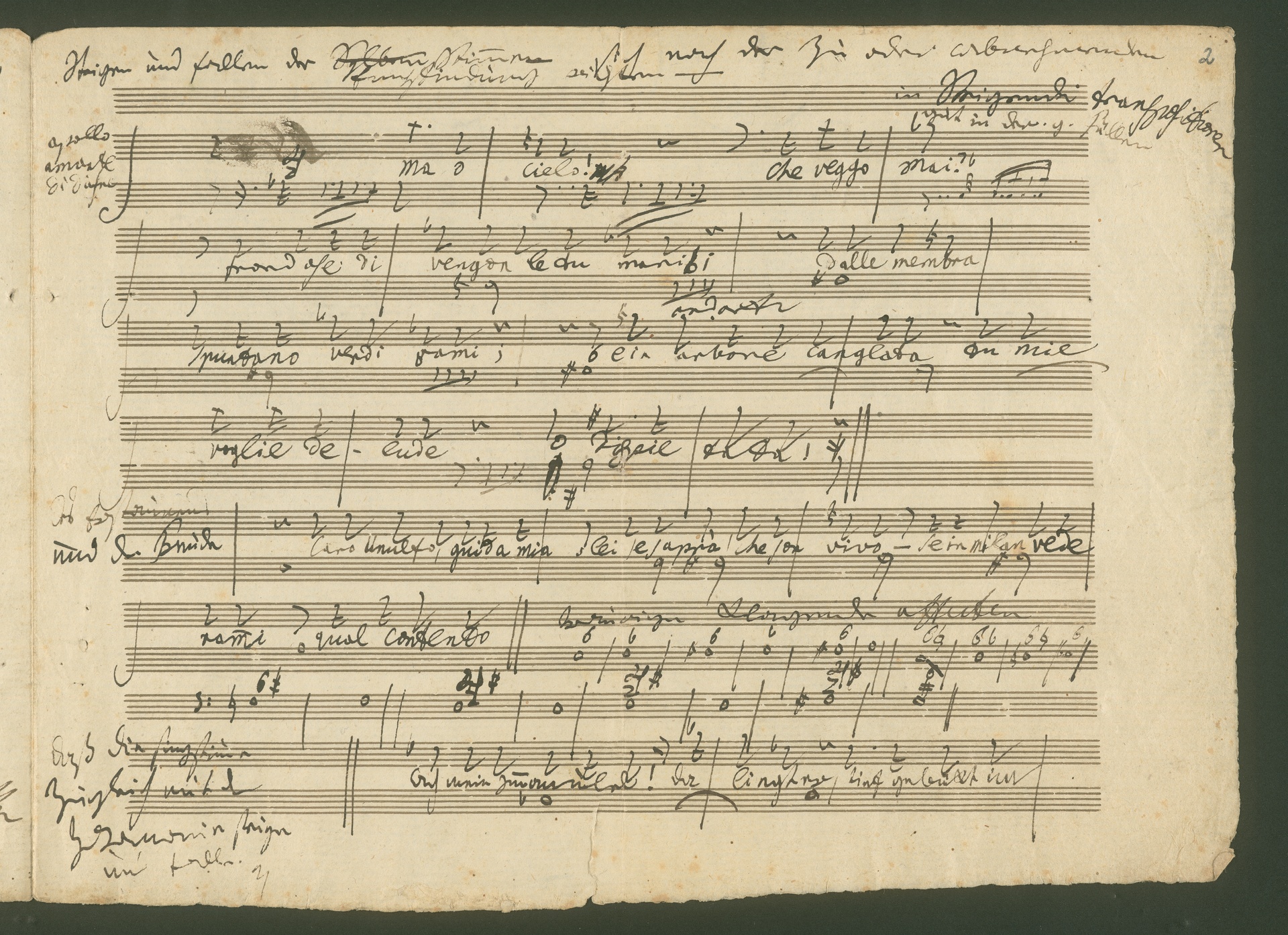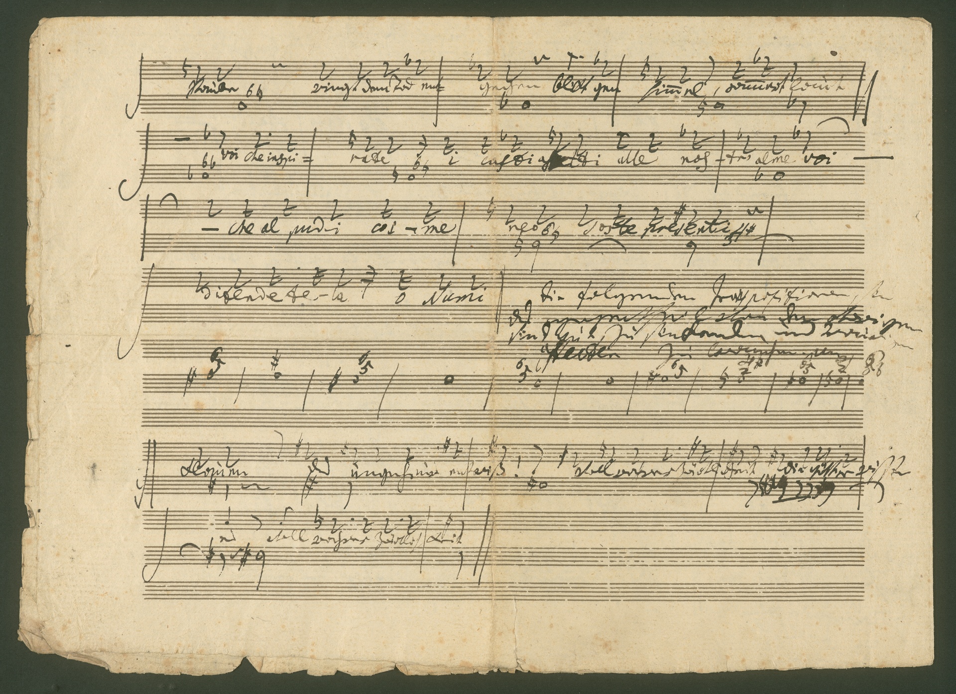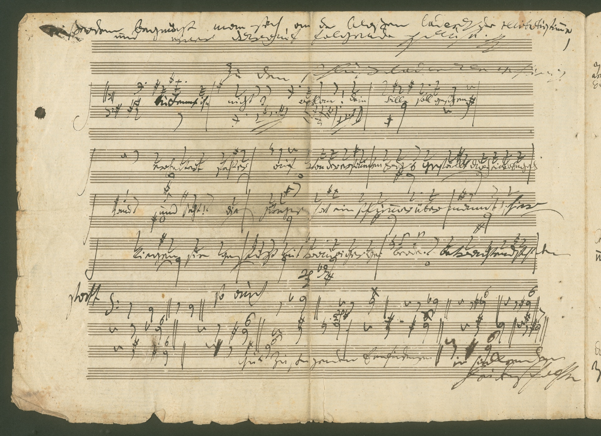 In Vorbereitung seines Oratoriums "Christus am Ölberge" und seiner Oper "Fidelio" befaßte sich Beethoven zwischen 1802 und 1804 eingehend mit Textvertonung und Deklamation und den damit verbundenen musikalischen Komplikationen. Zum Studium der besten Lösungen und der Regeln der Kunst nahm Beethoven gewissermaßen "Anschauungsunterricht" bei Kollegen. Berühmt sind seine Abschriften aus Opern Mozarts. Aber auch mit den Schriften der großen Musiktheoretiker seiner Zeit setzte sich der Komponist auseinander. Auf dem vorliegenden Doppelblatt hielt Beethoven Exzerpte eines Lexikonartikels fest: Notenbeispiele und Anmerkungen zum "Rezitativ" aus Johann Georg Sulzers "Allgemeine Theorie der Schönen Künste". Den praktisch-musikalischen Teil dieses Artikels verfaßte der Komponist und Musiktheoretiker Johann Abraham Peter Schulz und wählte zur Erläuterung der aufgestellten Regeln zahlreiche Beispiele aus der Feder Carl Heinrich Grauns. Beethoven übertrug diese Musikbeispiele sorgfältig und versah sie mit Anmerkungen. Teilweise machte er sich dabei Notizen aus dem Text des Artikels, teilweise fügte er auch eigene Anmerkungen hinzu. (J.R.)