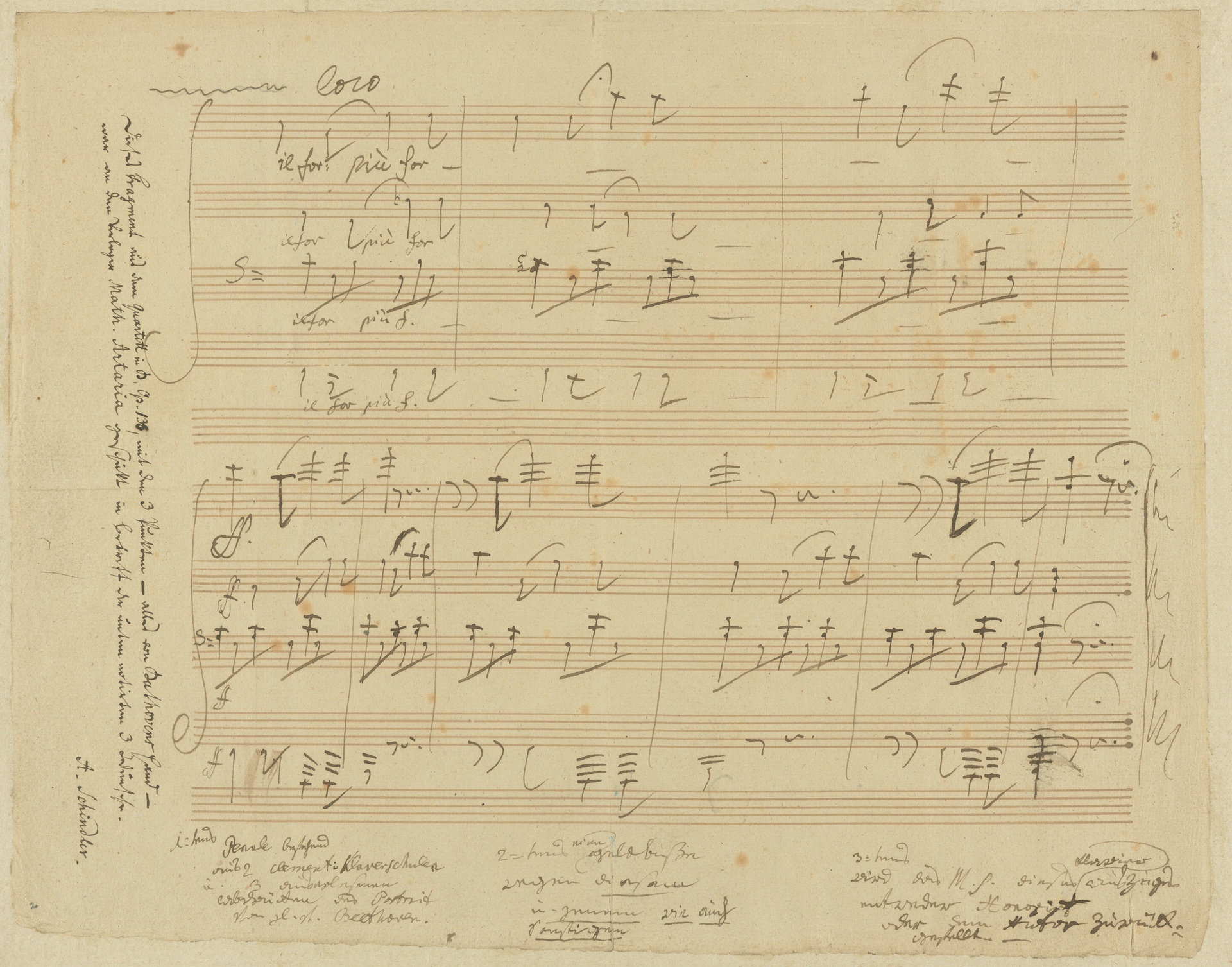 Das abgebildete Fragment trägt die letzten 17 Takte der Fuge für Streichquartett in B-Dur op. 133 in der Bearbeitung für Klavier zu 4 Händen op. 134 von Beethovens Hand. Die Idee, die Fuge für Streichquartett für Klavier zu übertragen, geht auf den Wiener Verleger Mathias Artaria zurück. Das B-Dur- Streichquartett wurde am 21. März 1826 uraufgeführt. Im Konversationsheft Nr. 108 vom April 1826 findet sich ein daran anknüpfendes Gespräch, das bei einem Besuch Beethovens in Artarias Kontor stattfand. Artaria fragt: "Es ist schon viele Nachfrage um die Fuge zu 4 Hände für Piano forte arrangirt[.] erlauben Sie mir, dass ich sie so herausgebe?" Beethoven antwortete mündlich wohl mit einer Gegenfrage nach den Modalitäten einer Ausgabe, denn Artarias folgender Eintrag lautet: "Partitur in Stimmen[.] die fuge à 4 Mains von Ihnen arrangirt aus einmahl heraus zu geben". Beethoven fand die Idee einer Bearbeitung zwar gut, lehnte es jedoch zunächst ab, diese selbst vorzunehmen. Mit der vierhändigen Klavierfassung wurde daher der Komponist und Pianist Anton Halm beauftragt, den Beethoven seit ungefähr 1815 kannte. Halm besuchte Beethoven am 16. April 1826 und führte mit ihm ein längeres Gespräch über die Bearbeitung, das Ergebnis sandte er dem Komponisten am 24. April zu. Beethoven war jedoch alles andere als zufrieden und entschloß sich nach längerem Zögern im August doch zu einer eigenen Fassung, die gleichzeitig mit Partitur und Stimmen im Mai 1827 bei Artaria erschien.