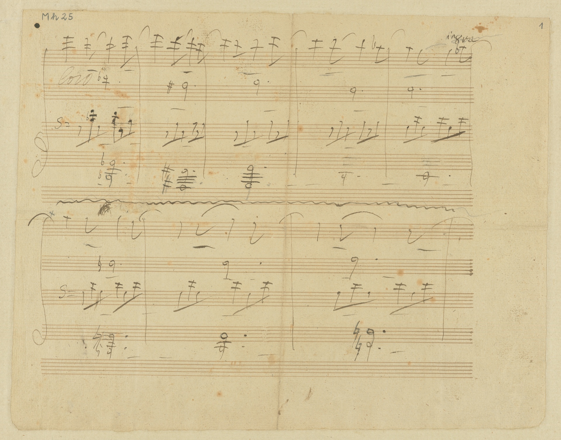 Erst 2005 tauchte das vollständige Autograph der Fuge wieder auf, nachdem es über 100 Jahre verschollen war. Nachdem Mh 25 keine Heftlöcher aufweist, kann man davon ausgehen, dass es sich nicht um eine erste Niederschrift handelt, die Beethoven aus der vollständigen Partitur entfernte. Inhaltlich unterscheidet sich der Notentext auf unserem Blatt nicht vom Schluss im Autograph. Es ist nicht ganz klar, warum Beethoven nochmals die letzten Takte separat notierte. Unten auf der Rückseite des Blattes finden sich handschriftlich drei Punkte, mit denen Beethoven Artaria einige scherzhafte Mitteilungen macht: "1-tens Penale bestehend aus 2 Clementi Klav[i]erschulen u. 3 auserlesenen Abdrücken des Portrait von L. v. Beethoven." Mit dem "Penale" (Strafe) spielt der Komponist auf den gescheiterten Verkauf von op. 131 an den Verleger an, für den Beethoven als Gegenleistung Clementis Klavierschule und sein Portrait, die beide in Artarias Musikalienhandlung verlegt wurden, erhalten wollte. Die beiden weiteren Punkte sind "2-tens eine Geldbuße wegen diesem u. jenem wie auch Sonstigem" und "3-tens wird das M.[anu]S.[kript] dieses Klawier Auszuges entweder Honorirt oder dem Autor zurückgestellt" dieser Bitte kam Artaria nach, denn in seinem Spesenbuch vermerkte er am 5.9.1826: "zahle an Beethoven für den Klavierauszug der Fuge 12 # in Gold à 4 f. 47". (J.R.)