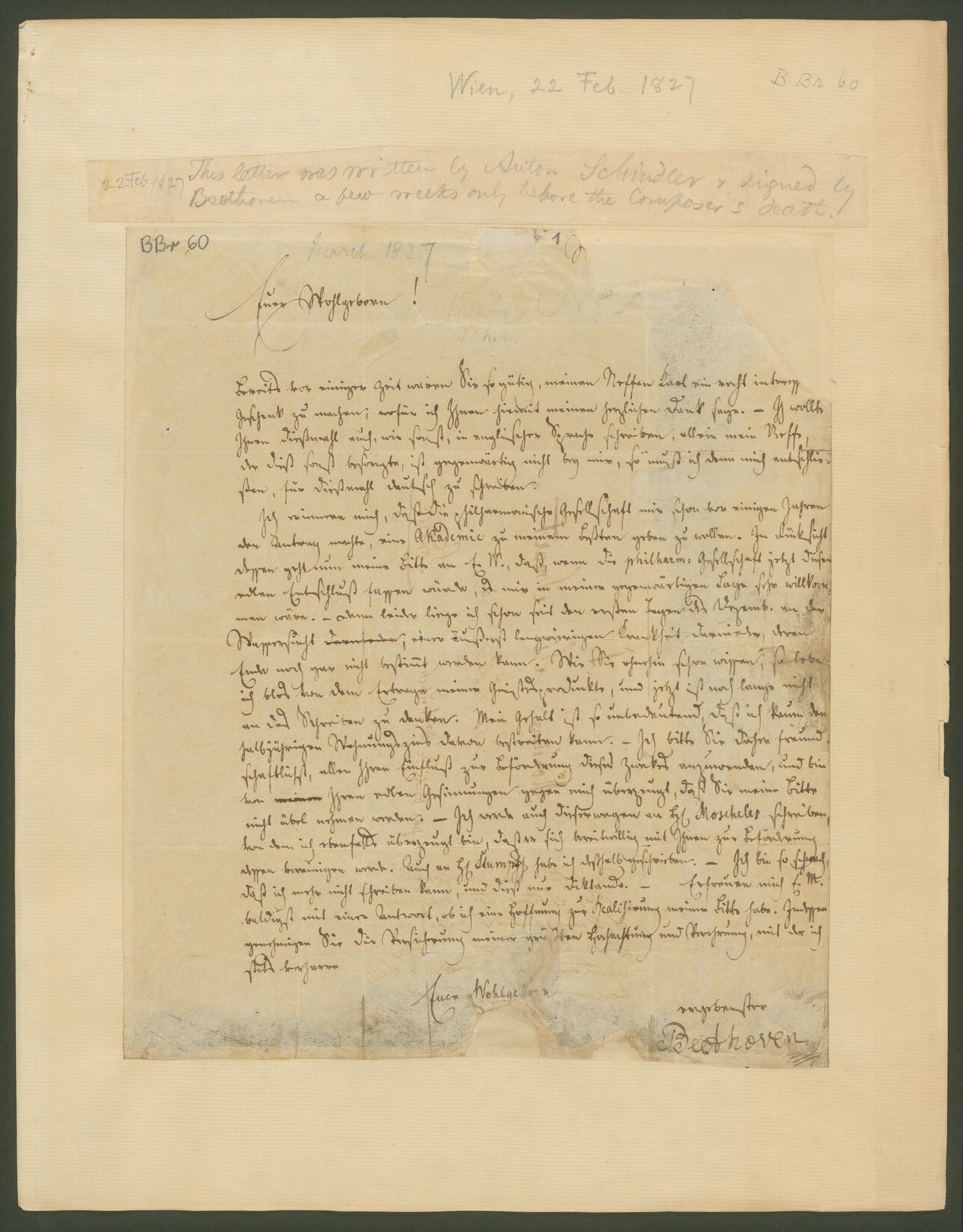 Beethoven fügt hinzu, er habe sich mit derselben Bitte auch an Moscheles (W 27, BGA 2260) und Stumpff gewandt. Im Februar 1827 war Beethoven bereits todkrank. Er ist schon so schwach, dass er den Brief nur noch diktieren kann, lediglich die Unterschrift ist von seiner Hand. (J.R.)