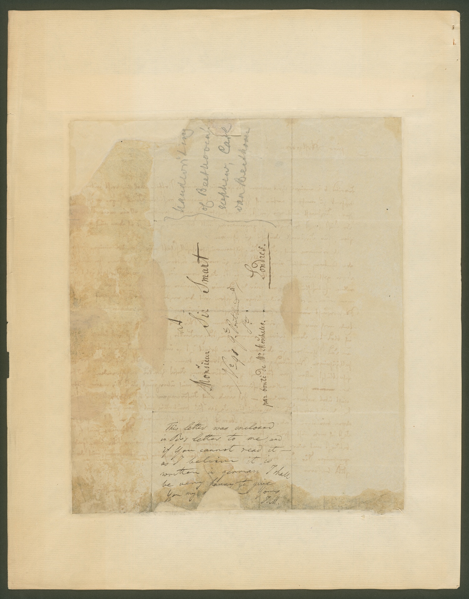 Beethoven richtet sich mit der Bitte um finanzielle Unterstützung an den musikalischen Leiter der Philharmonischen Gesellschaft in London, George Smart. Die Gesellschaft hatte bereits mehrfach (zum ersten Mal 1816) mit ihm wegen einer Akademie korrespondiert. Nun sieht sich Beethoven aus gesundheitlichen Gründen (er ist quasi arbeitsunfähig) veranlasst, um eine solche Akademie zu seinen Gunsten zu bitten.