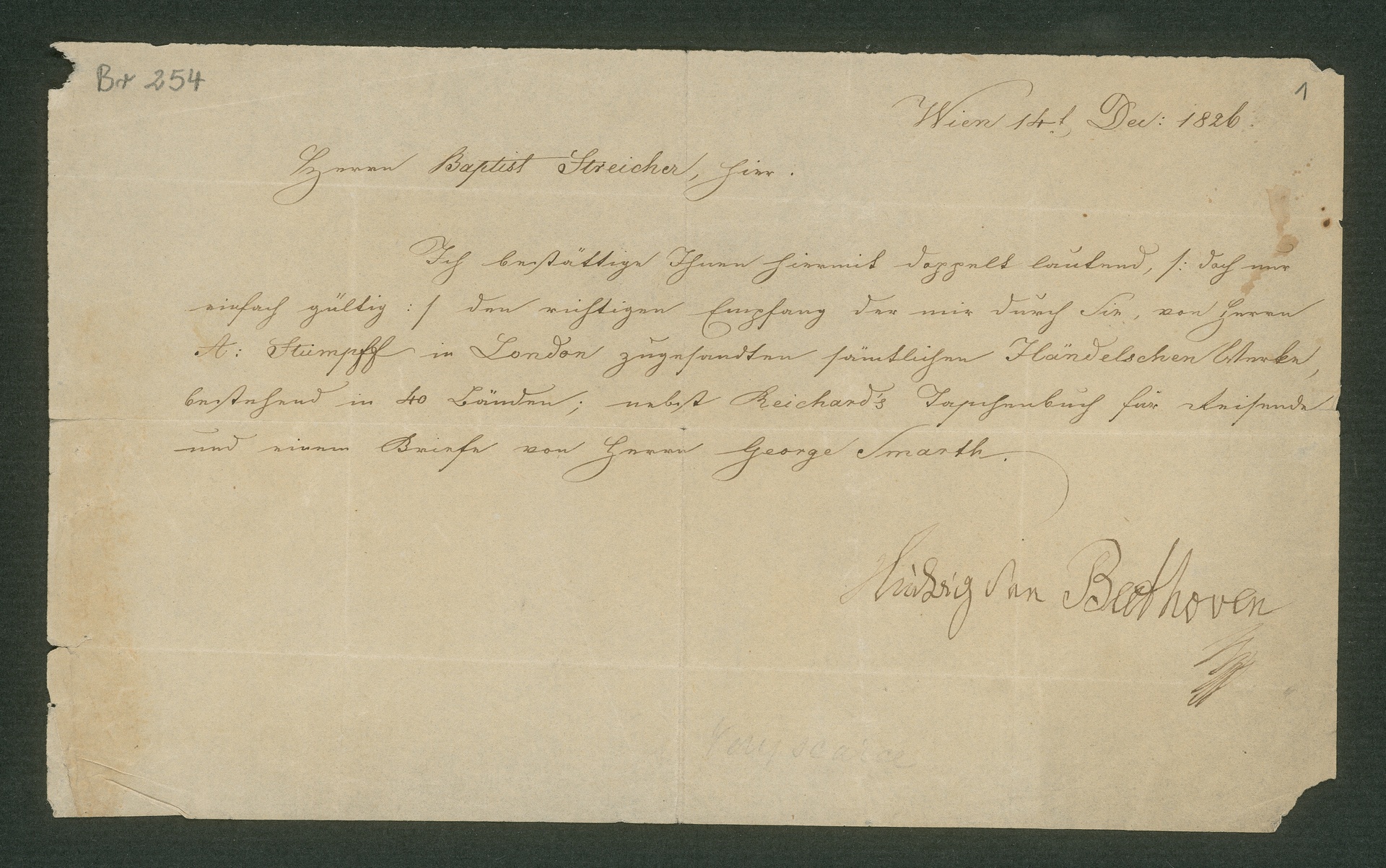 Ludwig van Beethoven, Empfangsbestätigung für Johann Baptist Streicher, Wien, 14. Dezember 1826