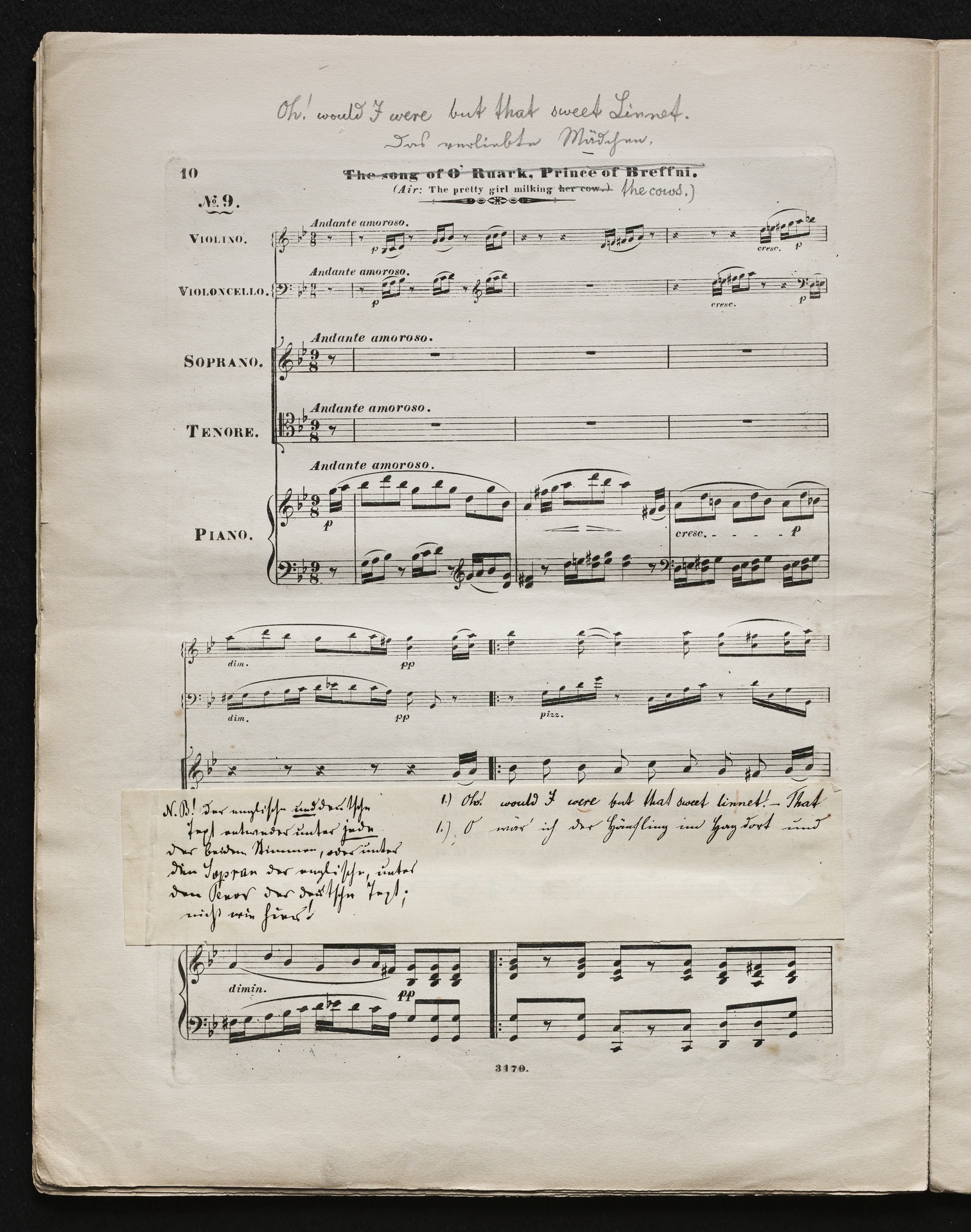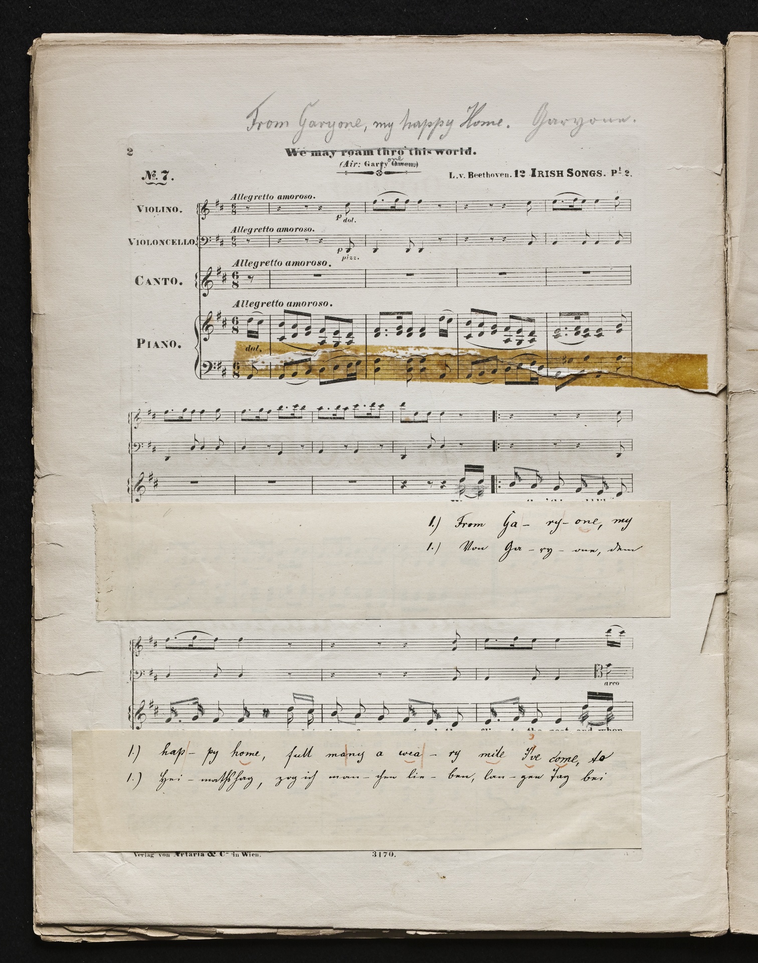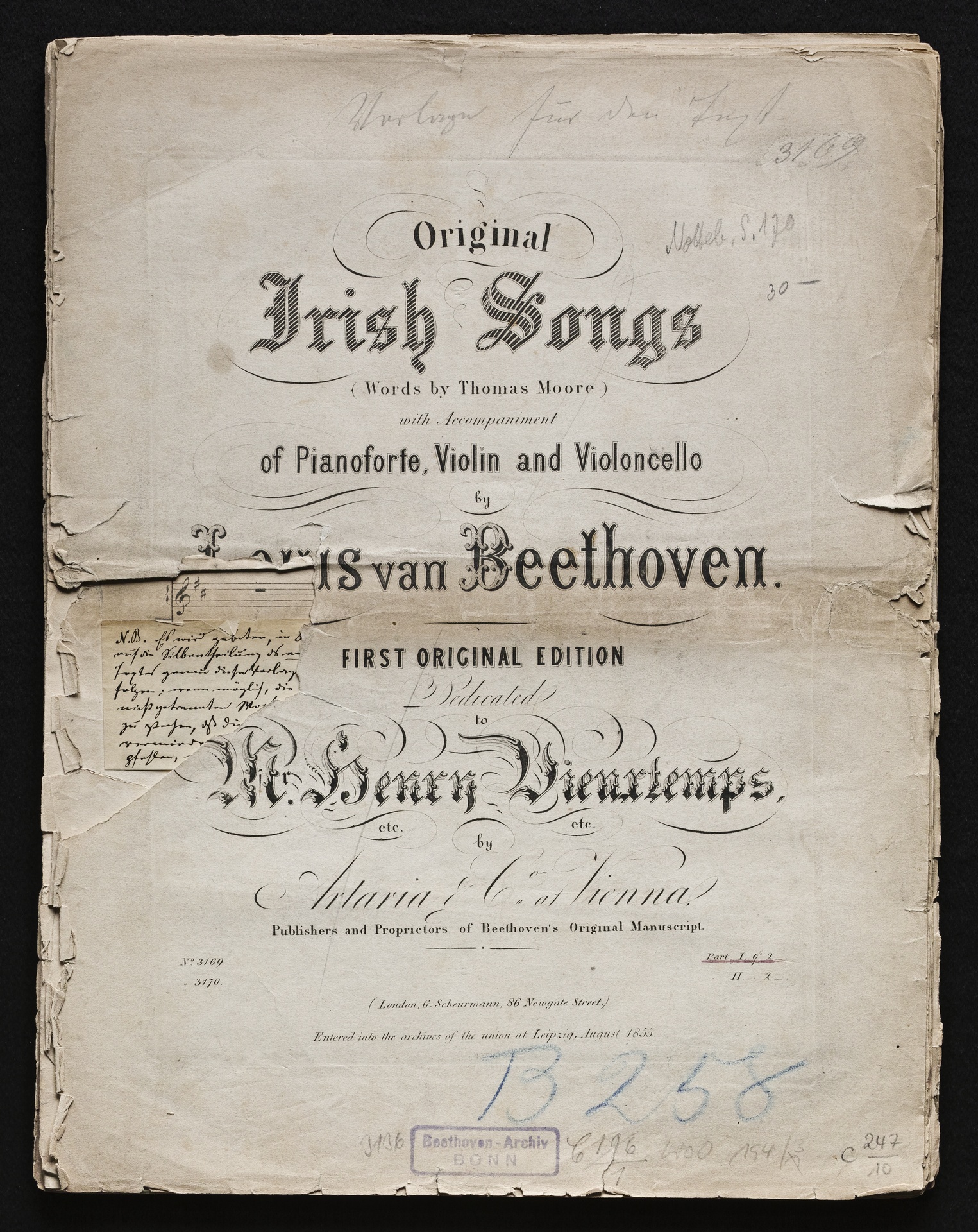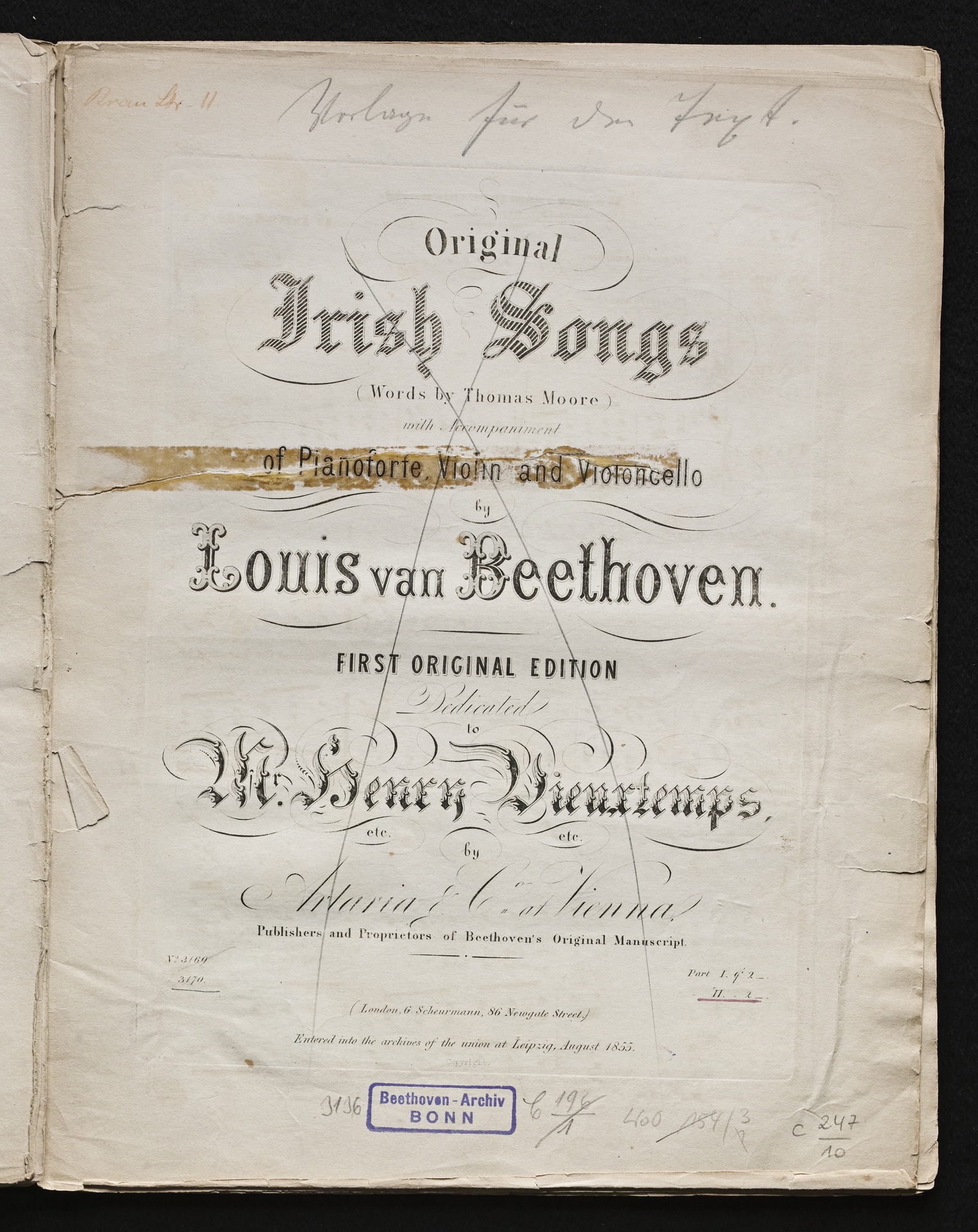 Ludwig van BeethovenThomas Moore, "Irische Lieder" für eine oder mehrere Singstimmen, Violine, Violoncello und Klavier aus WoO 152 und WoO 153, Klavierpartitur, Artaria, 3169-3170