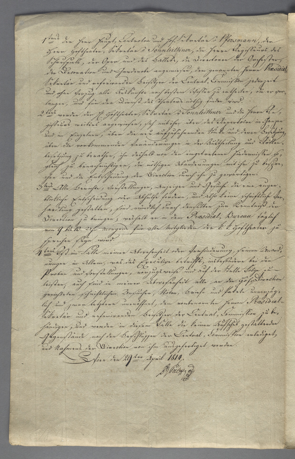 Ferdinand von Pálffy, Erlaß an die Mitglieder und Angestellten der k. k. Hoftheater bezüglich der Reorganisierung der Theater, mit beigefügtem "Circular", Wien, 29. April 1814